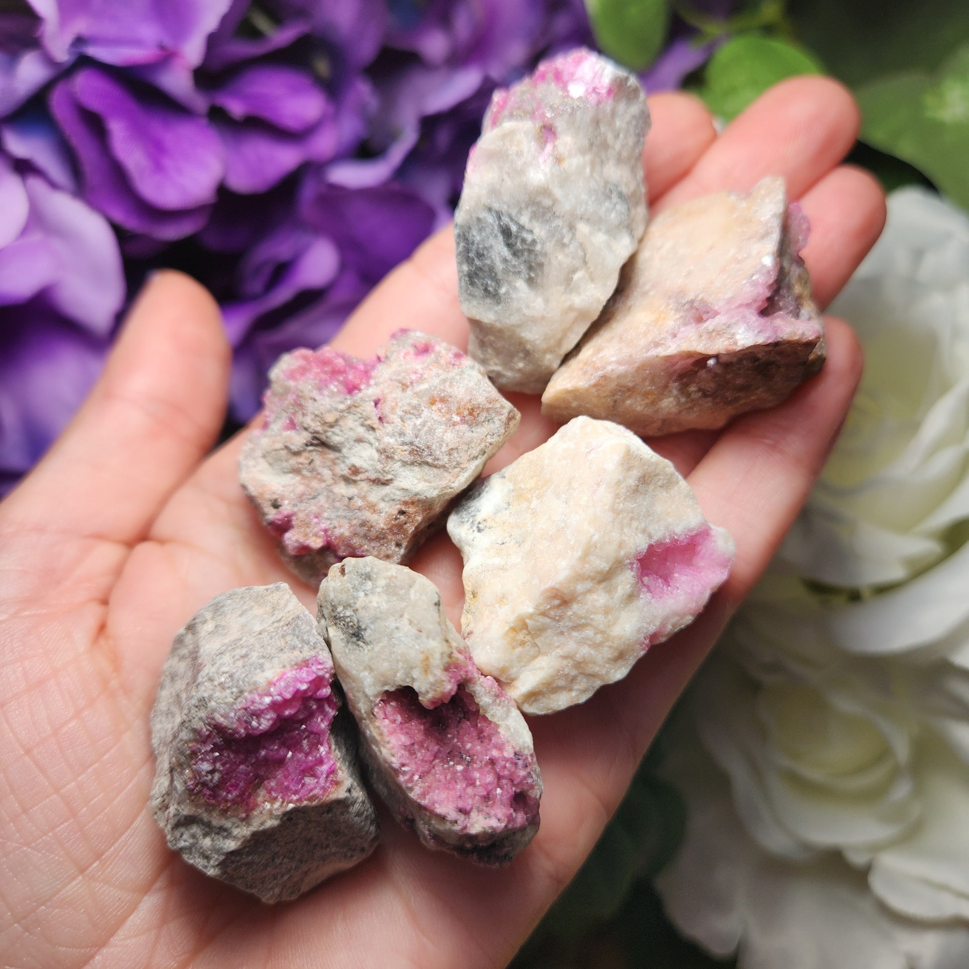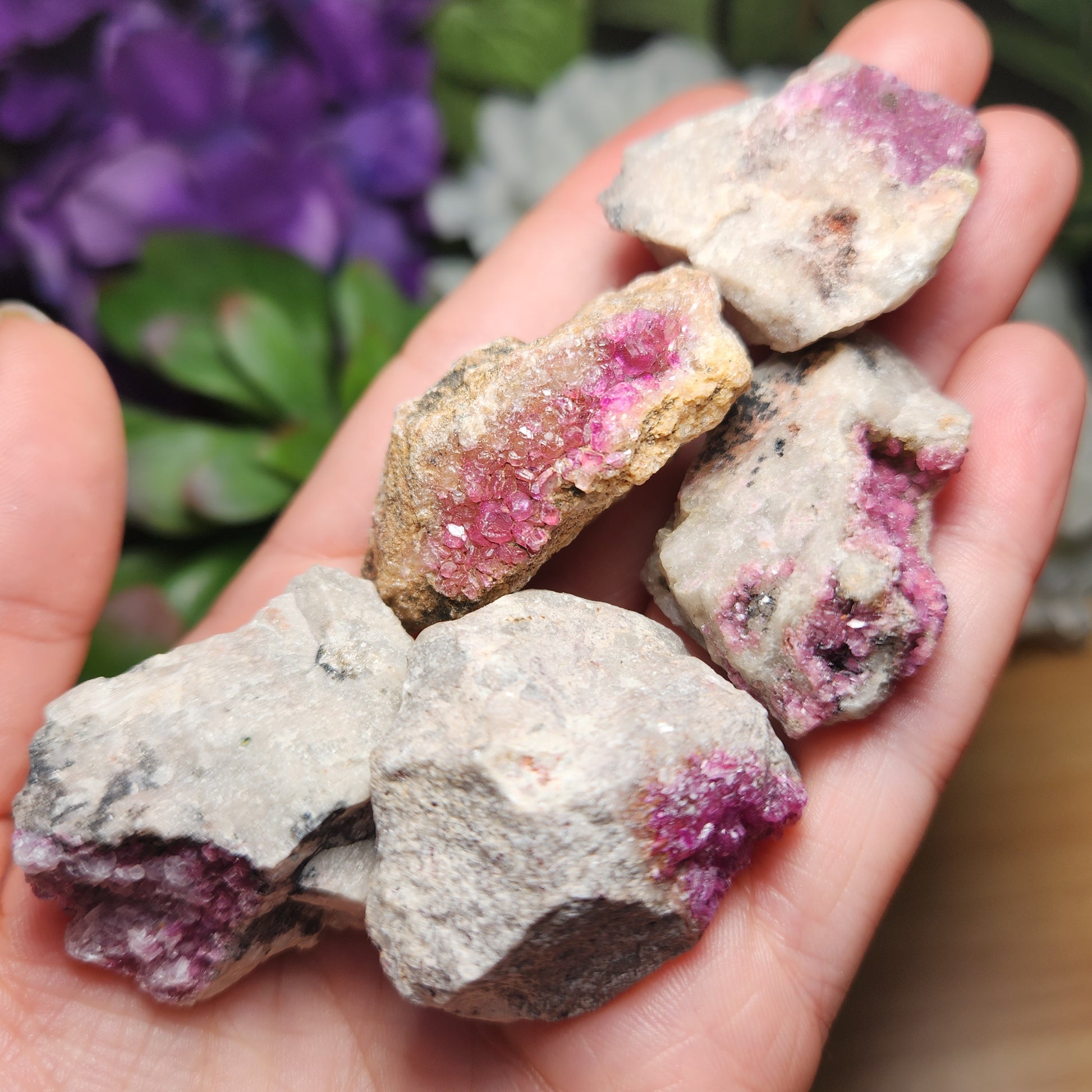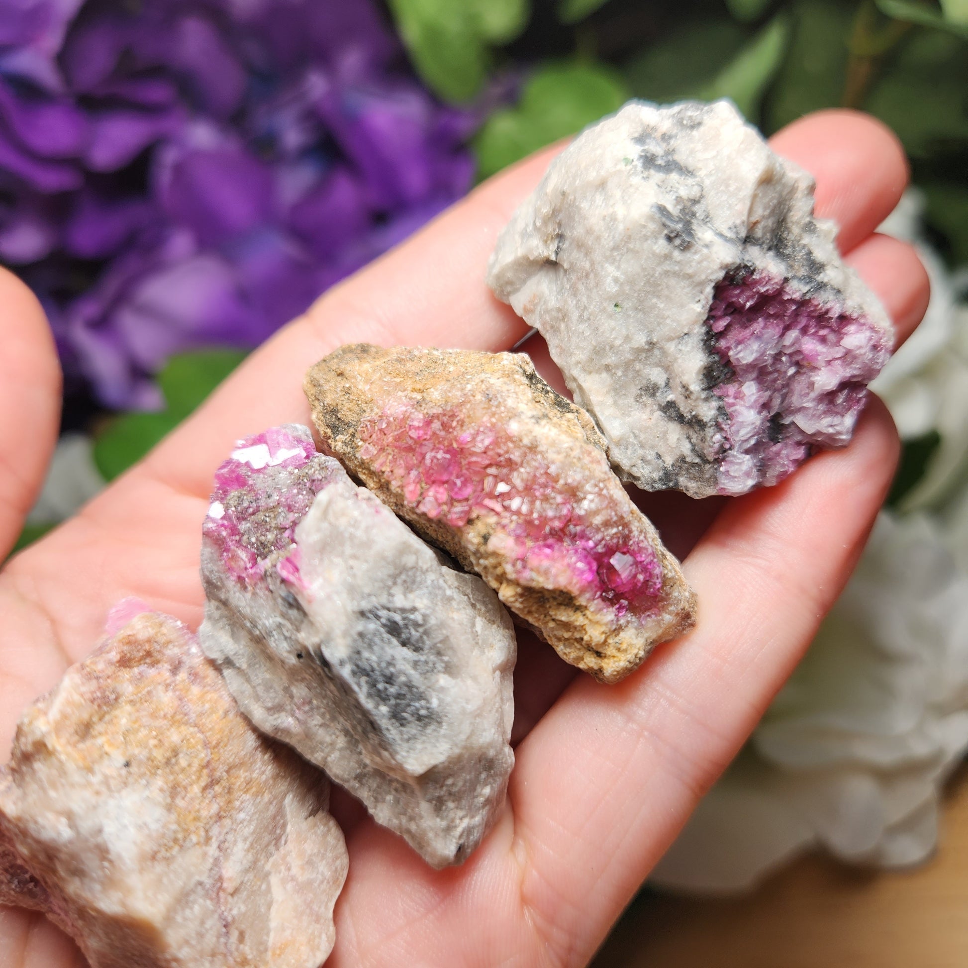 These sparkling Pink Cobalto Calcite crystal have a saturated coloring and sit within neutral colored matrixes. Each chunky specimen measures approximately 1 to 1.5 inches.