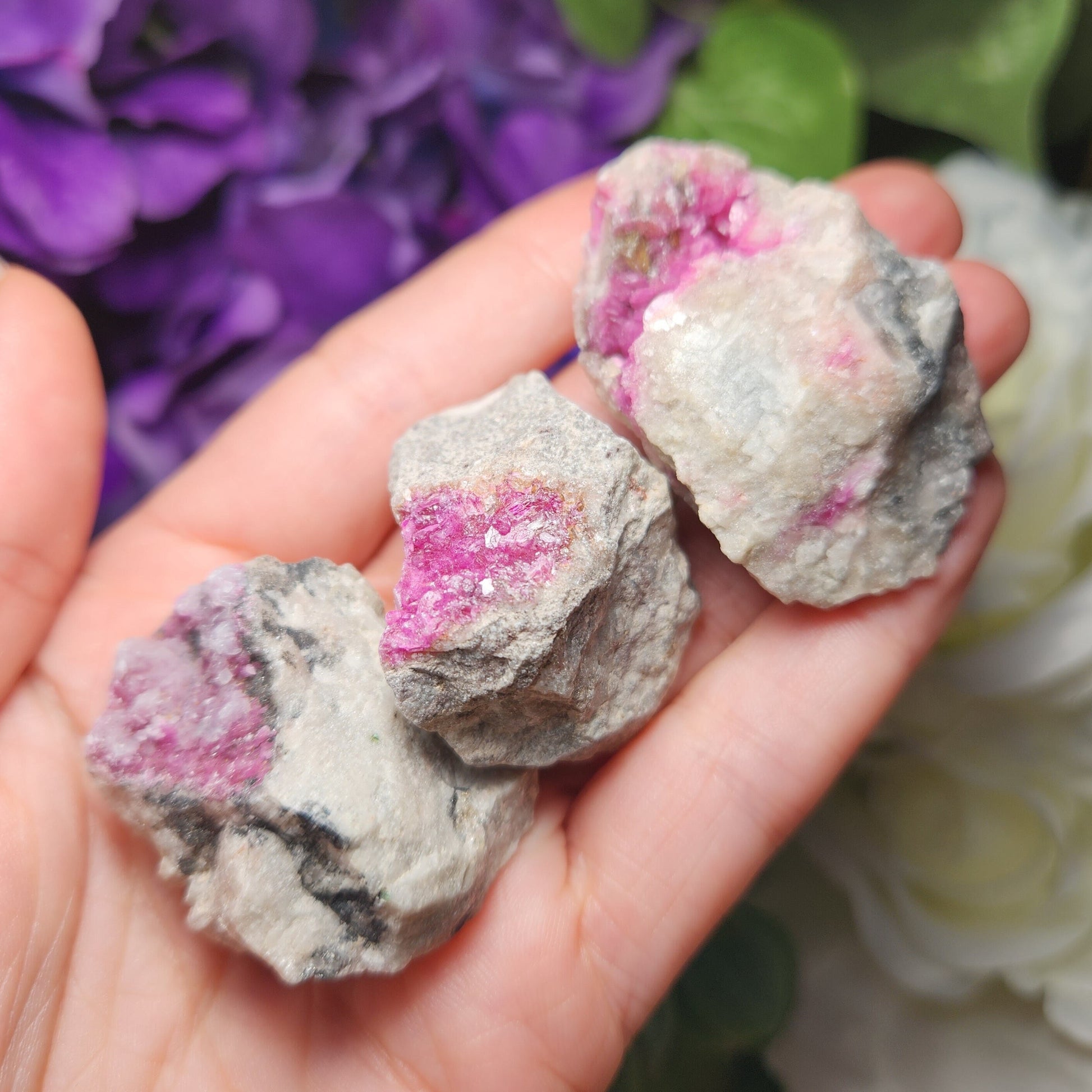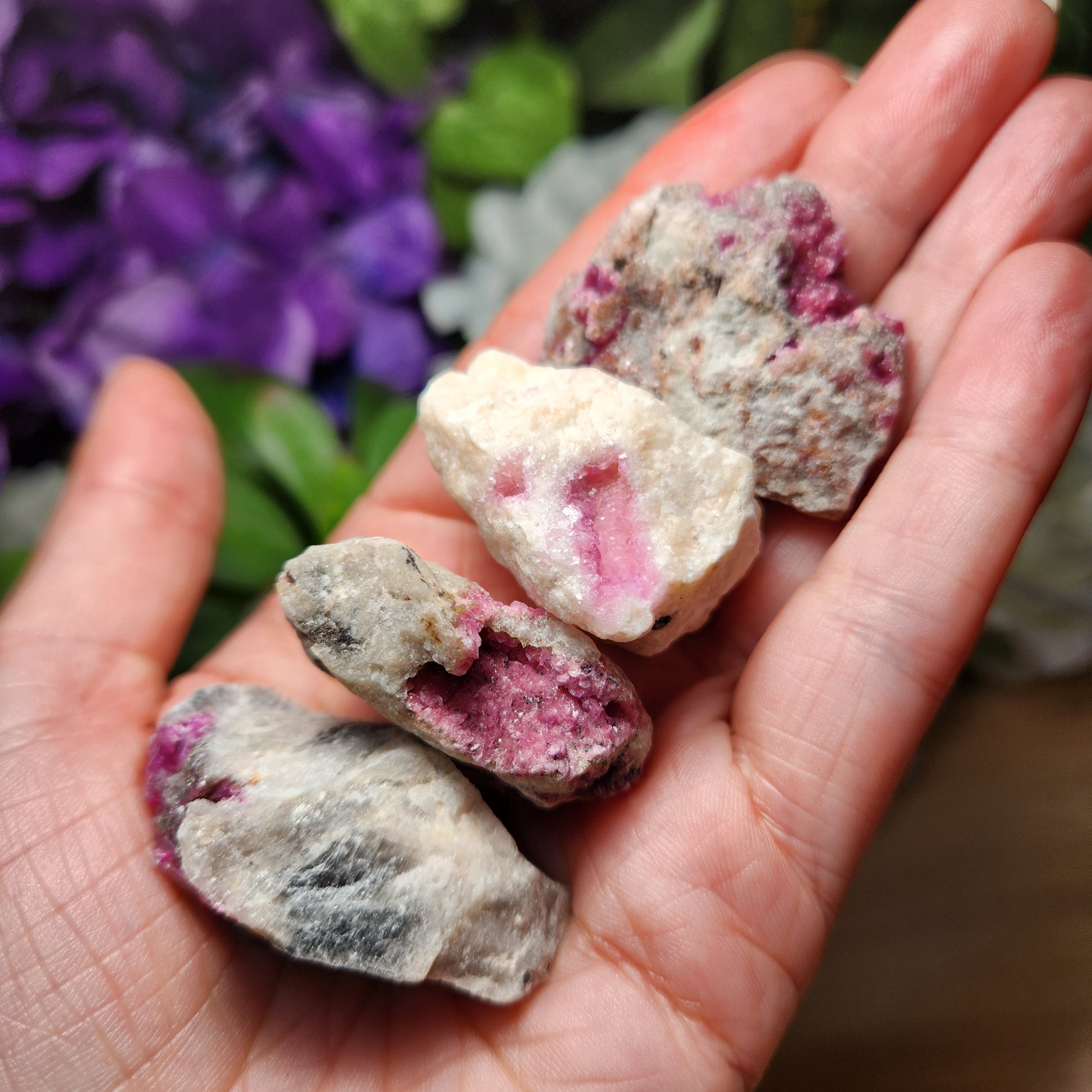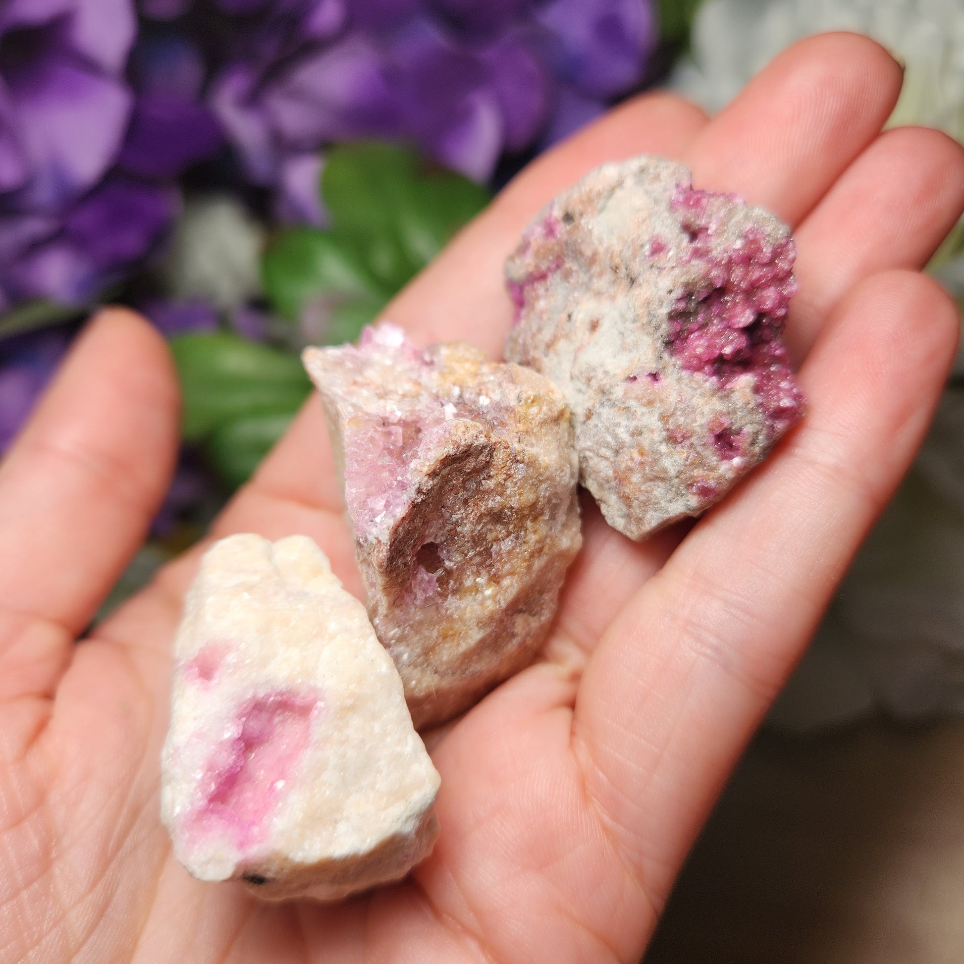 These sparkling Pink Cobalto Calcite crystal have a saturated coloring and sit within neutral colored matrixes. Each chunky specimen measures approximately 1 to 1.5 inches.