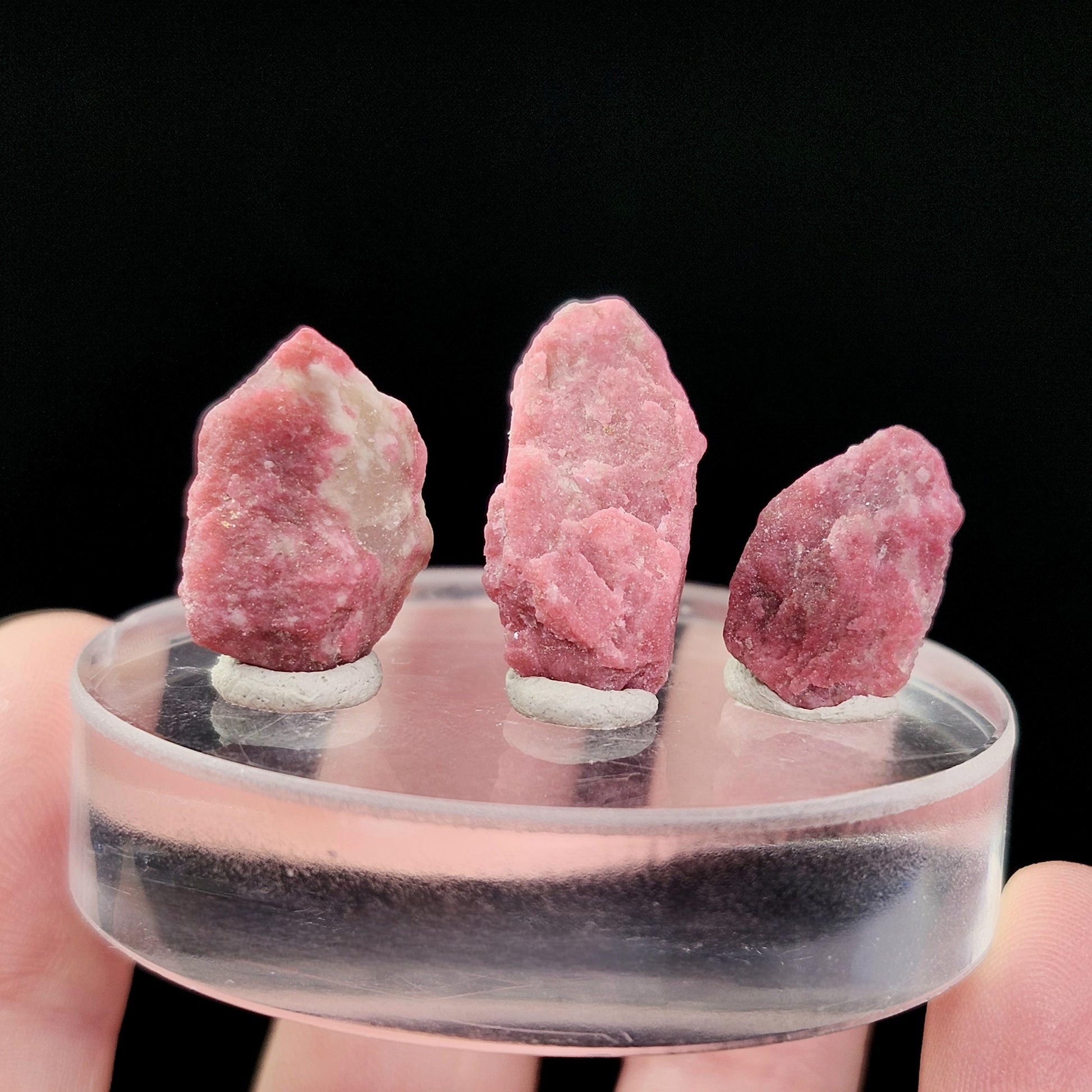 These Thulite crystals from Norway are in their raw form with freeform shapes. They exhibit a pale to saturated pink that may be paired with neutral-colored inclusions.