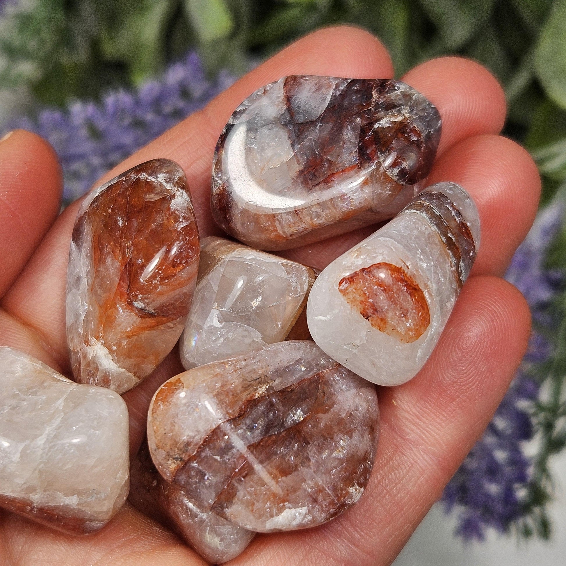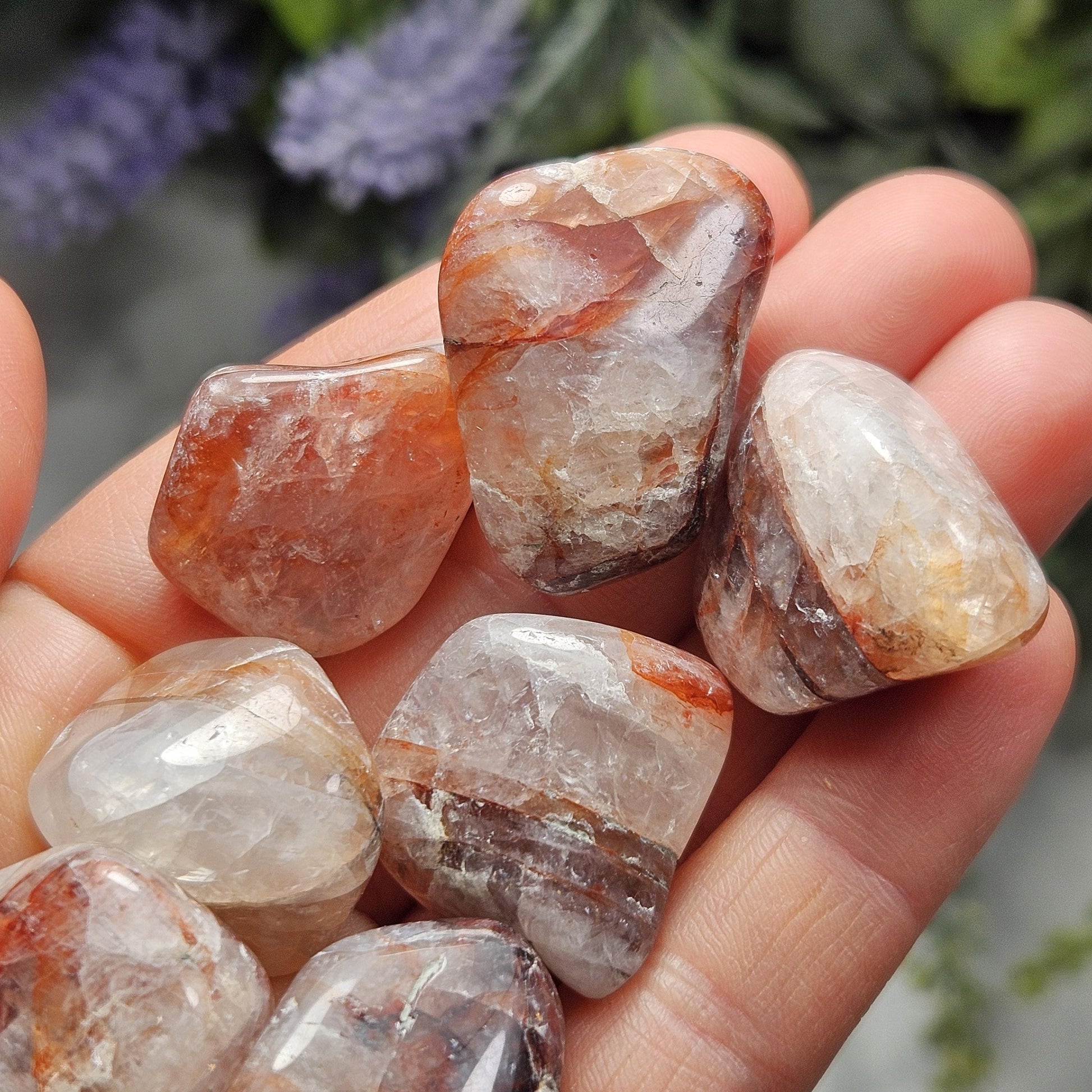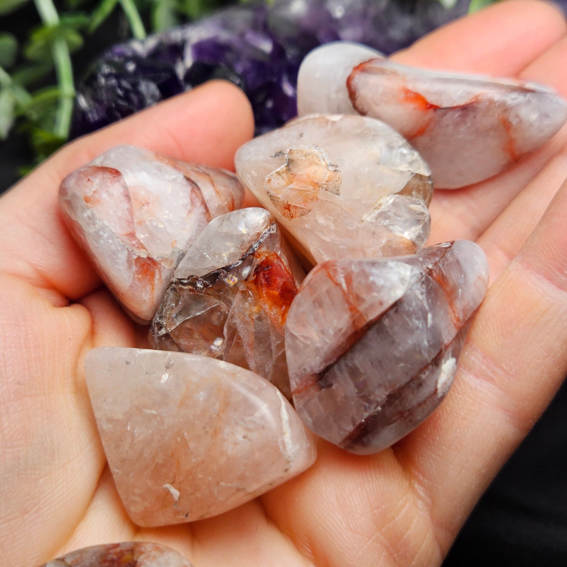 Each Fire Quartz Specimen has milky coloring and a range of saturation of dark crimson to red veining. Each specimen has a high polish and measures .75-1 inch.