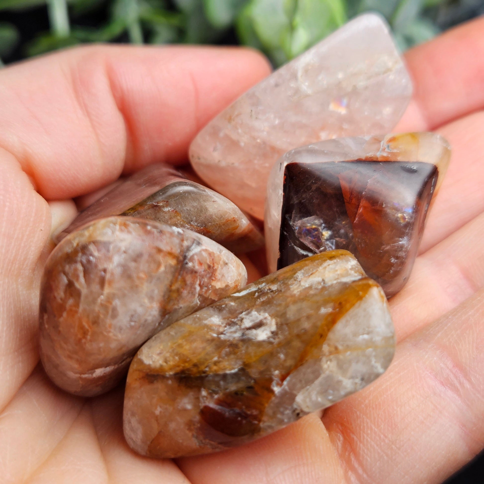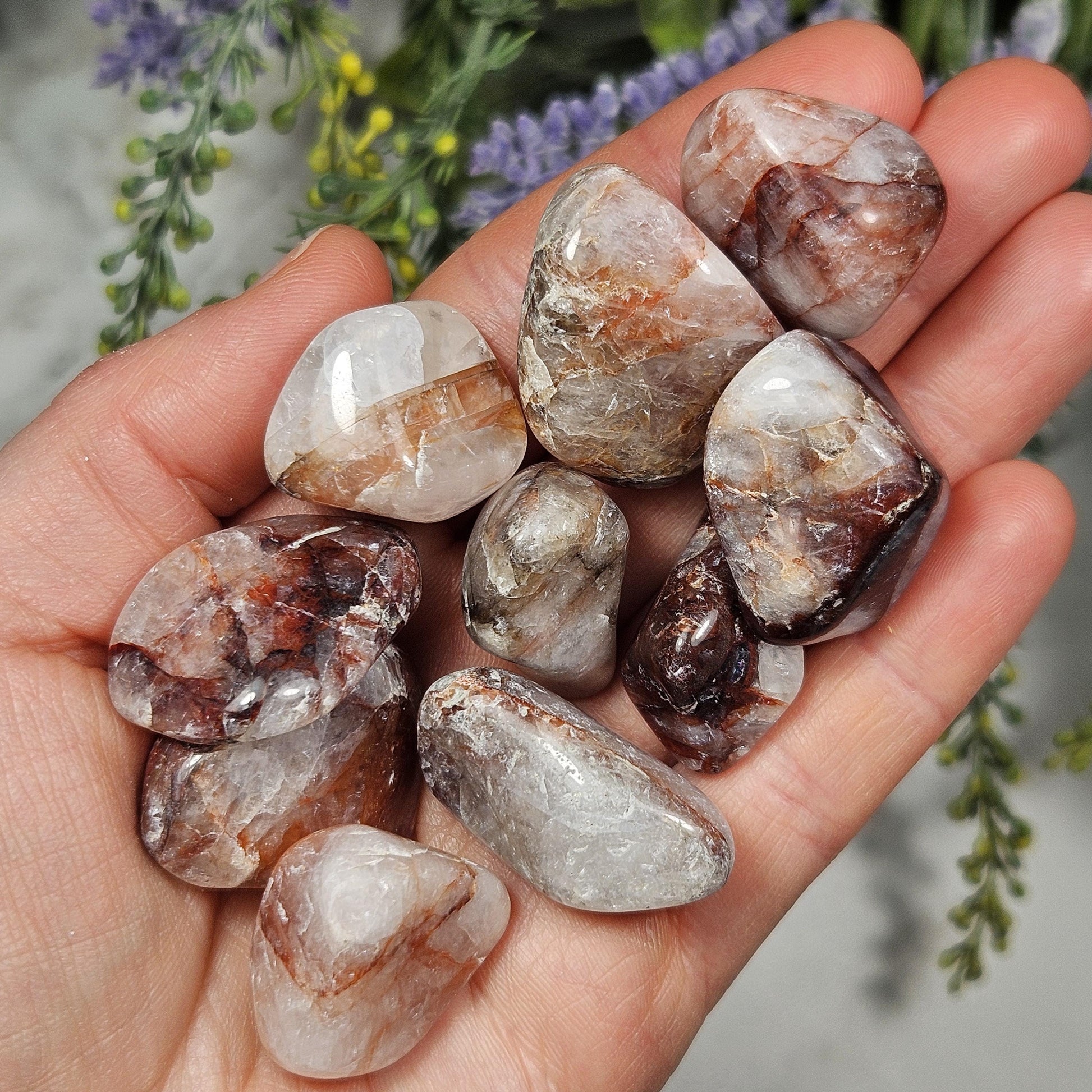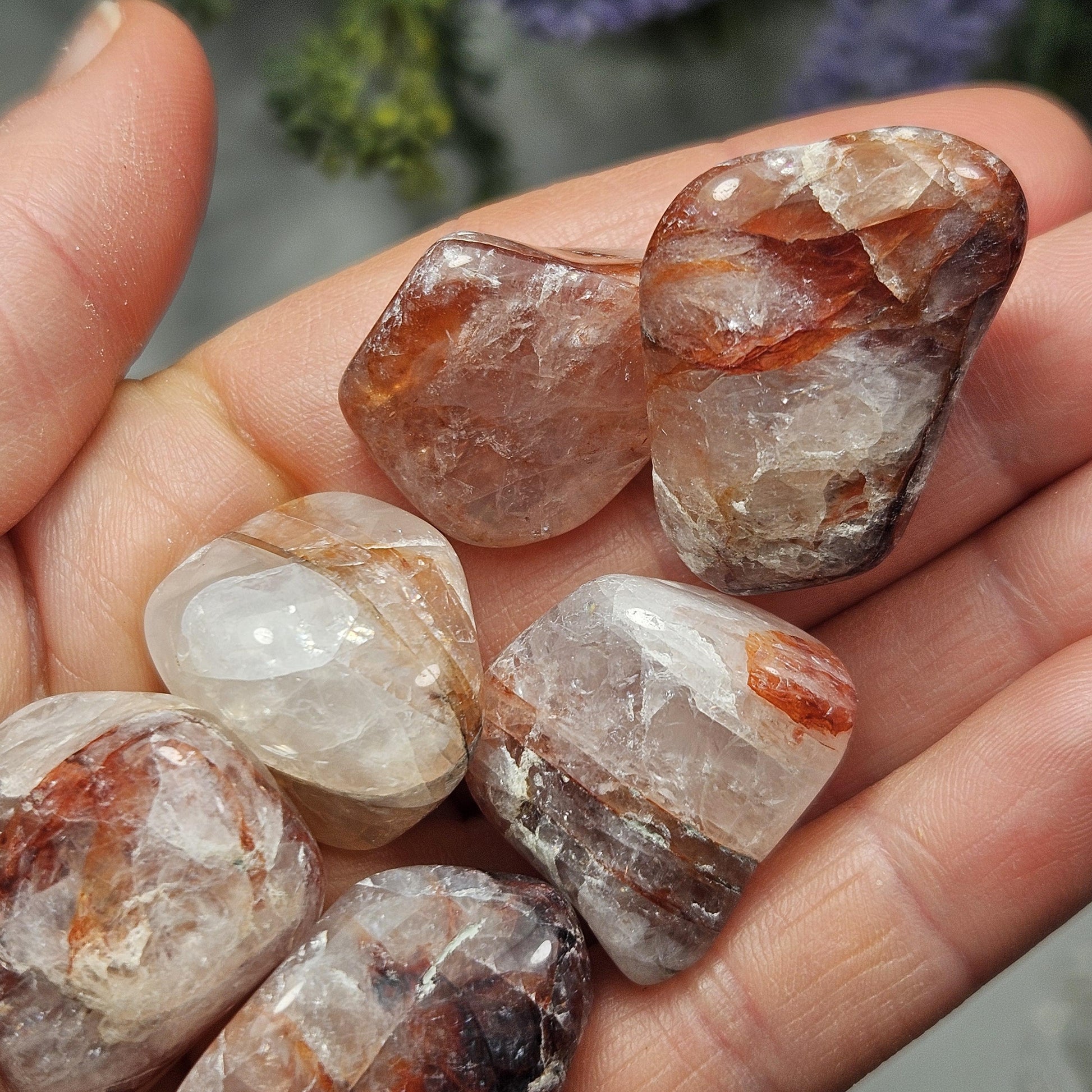 Each Fire Quartz Specimen has milky coloring and a range of saturation of dark crimson to red veining. Each specimen has a high polish and measures .75-1 inch.