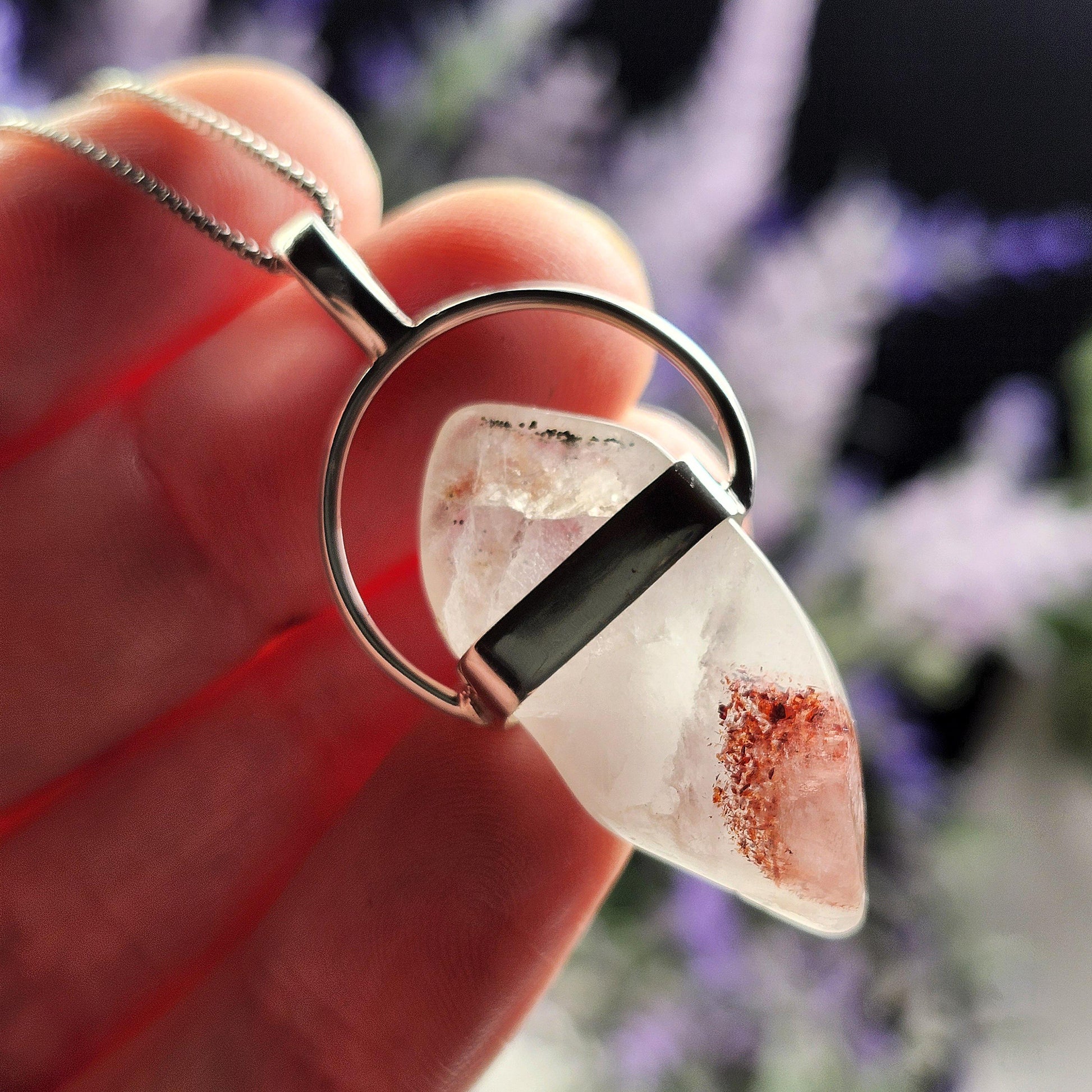 This Disco Fire Quartz crystal has a translucence that showcases the phantom created by its red Lepidocrocite and Hematite inclusions. This crystal has been custom created into a sturdy piece of jewelry using .925 Sterling Silver. This pendant measures approximately 42mm by 20mm. The silver chain used in the photos is to help envision how this pendant will look while adorned but is not included in the listing.