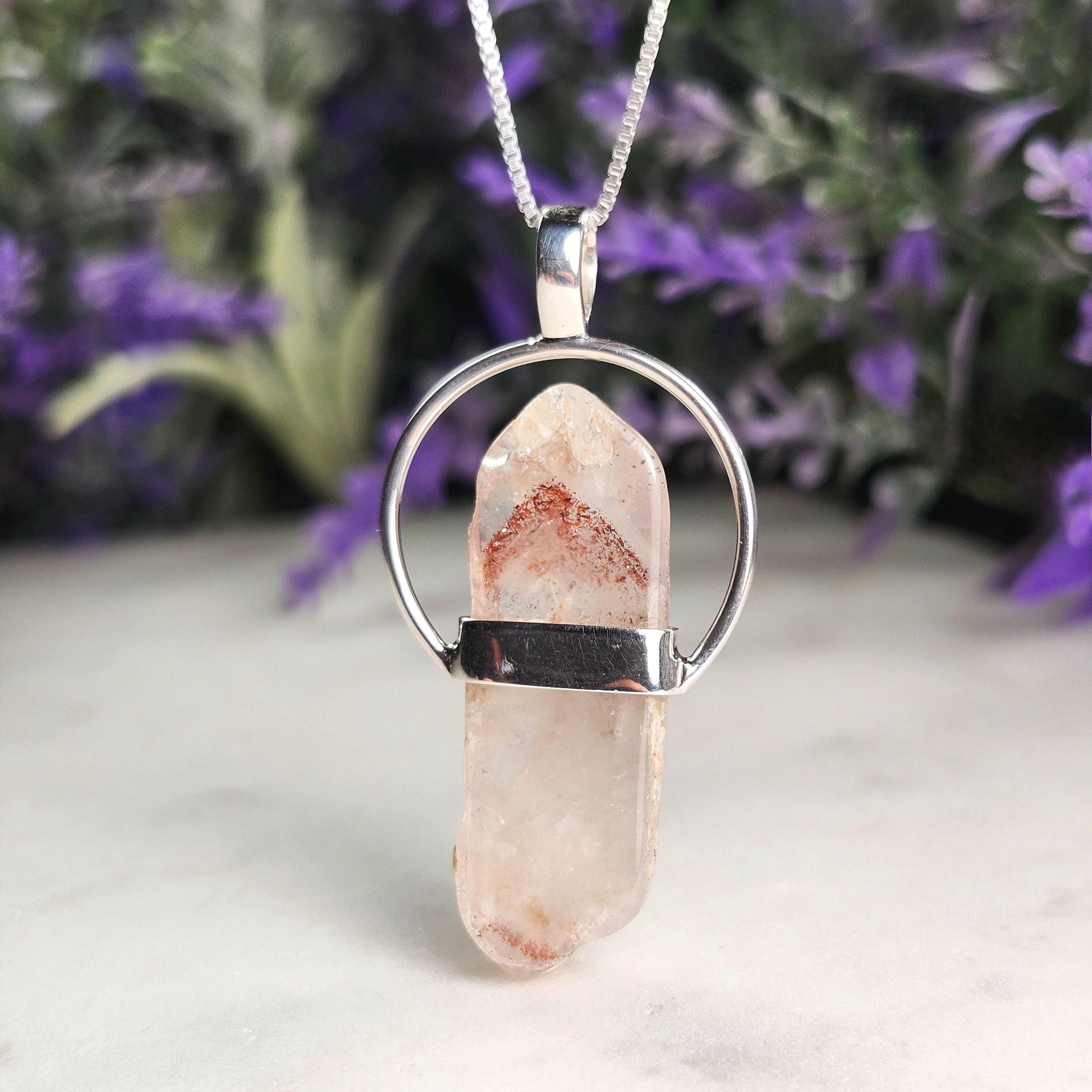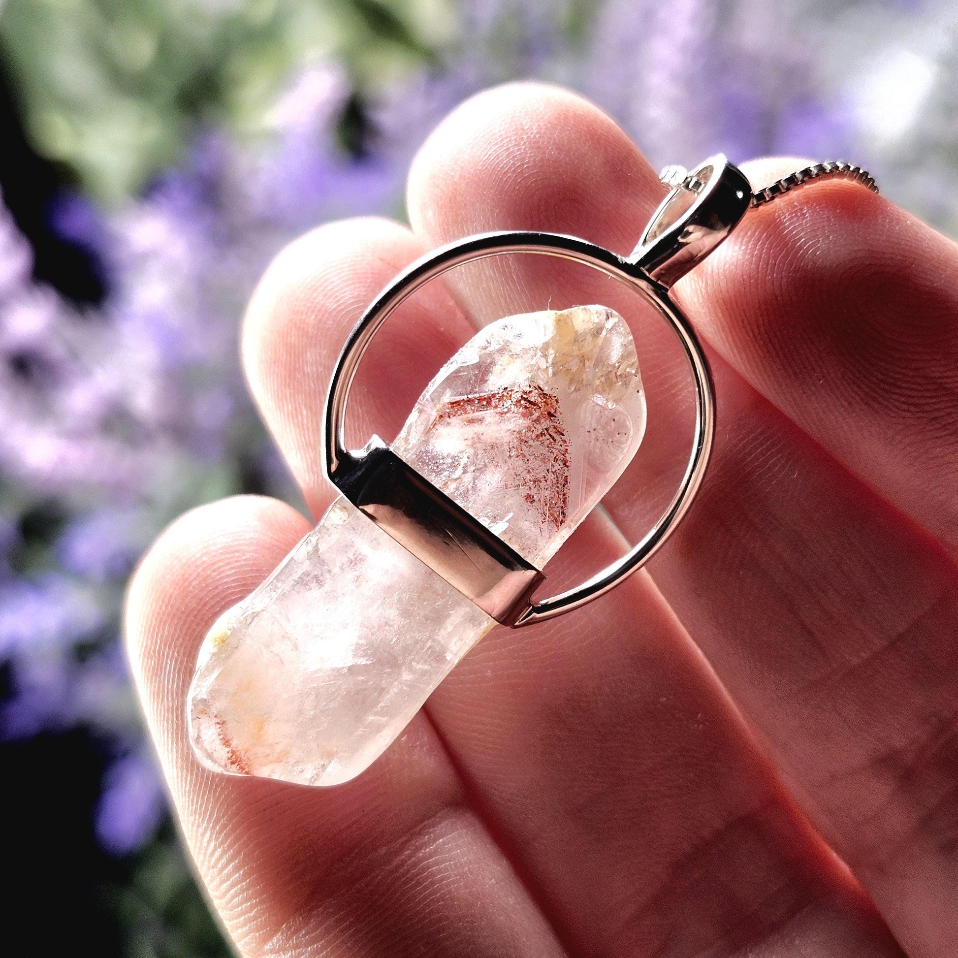 This Disco Fire Quartz crystal has a translucence that showcases the phantom created by its red Lepidocrocite and Hematite inclusions. This crystal has been custom created into a sturdy piece of jewelry using .925 Sterling Silver. This pendant measures approximately 43mm by 20mm. The silver chain used in the photos is to help envision how this pendant will look while adorned but is not included in the listing.