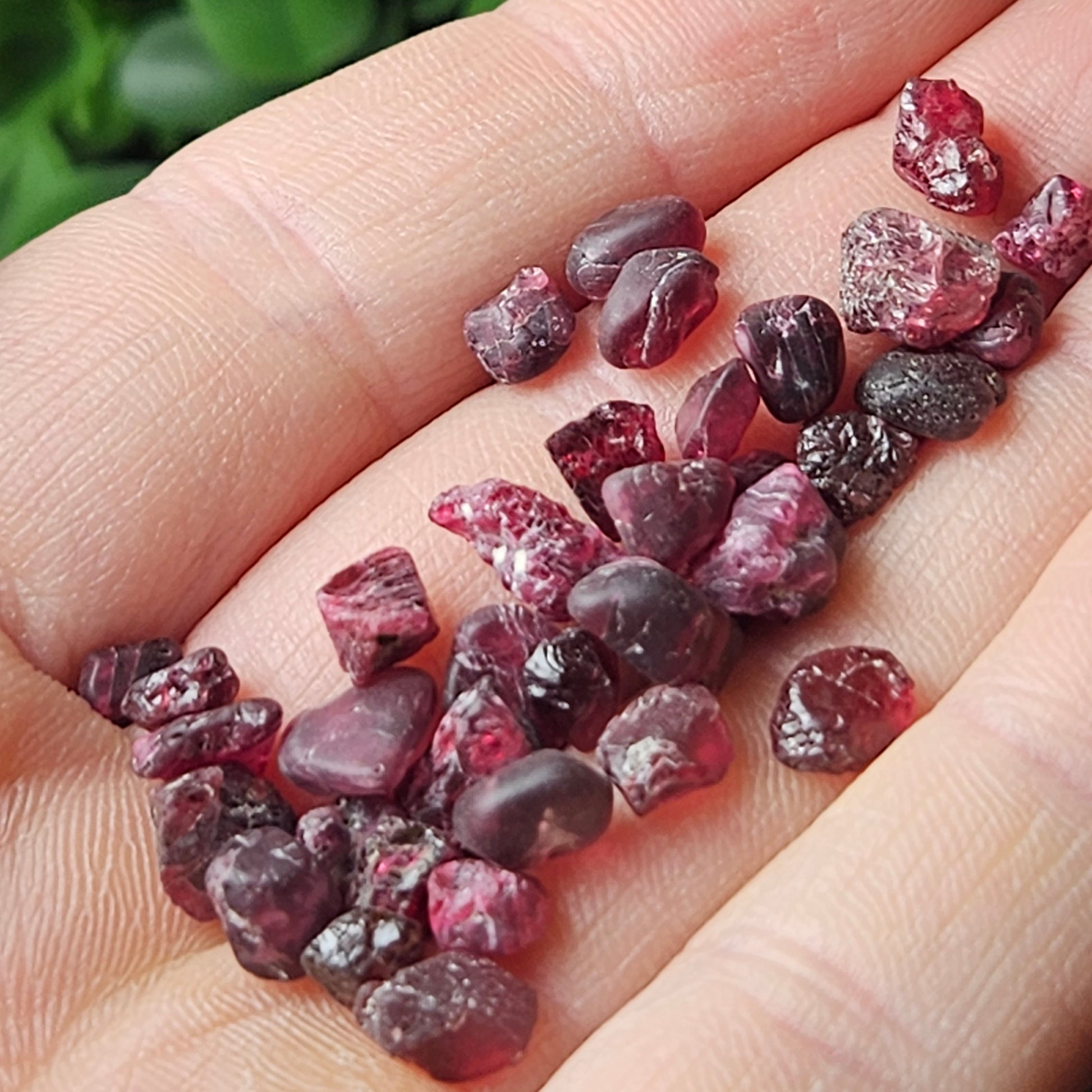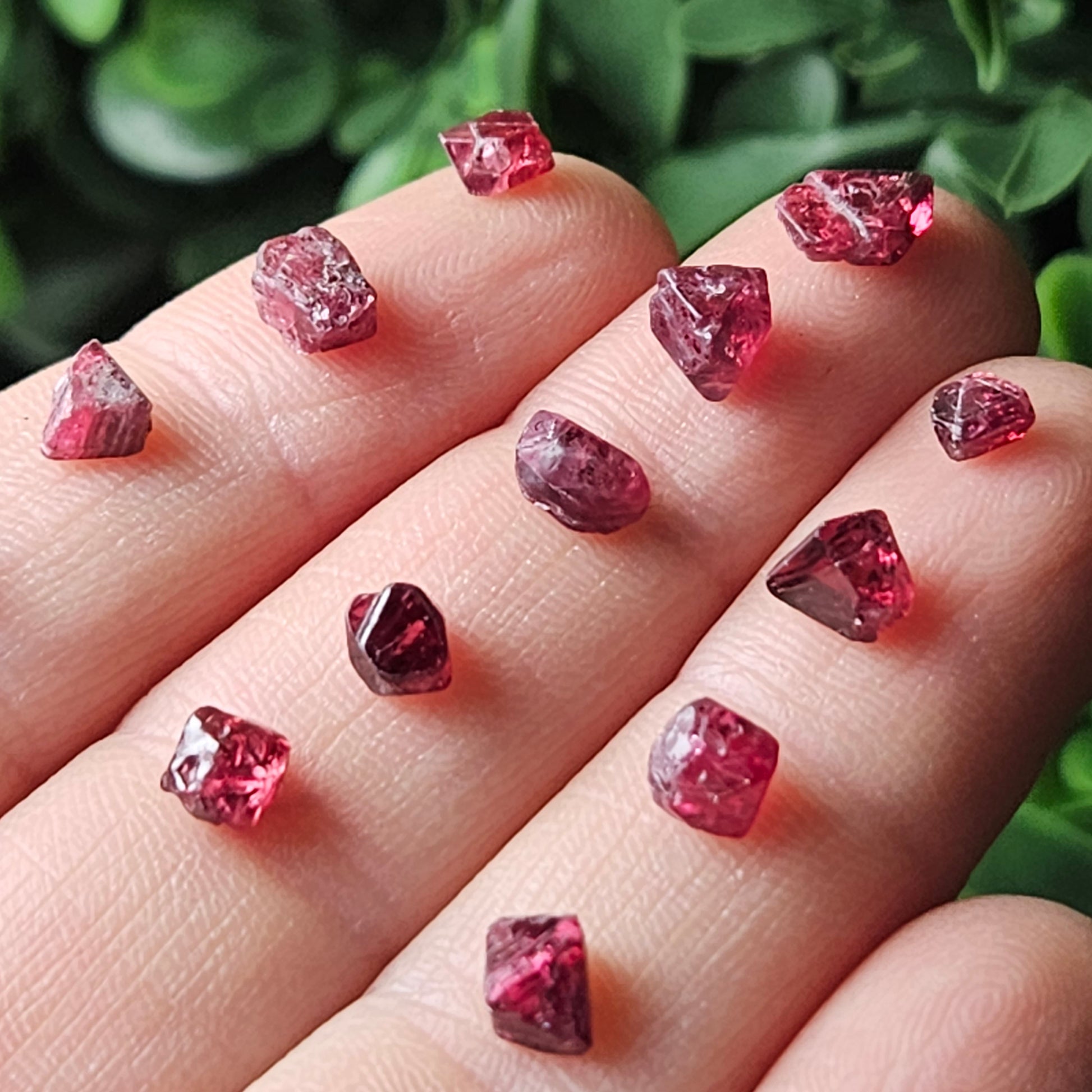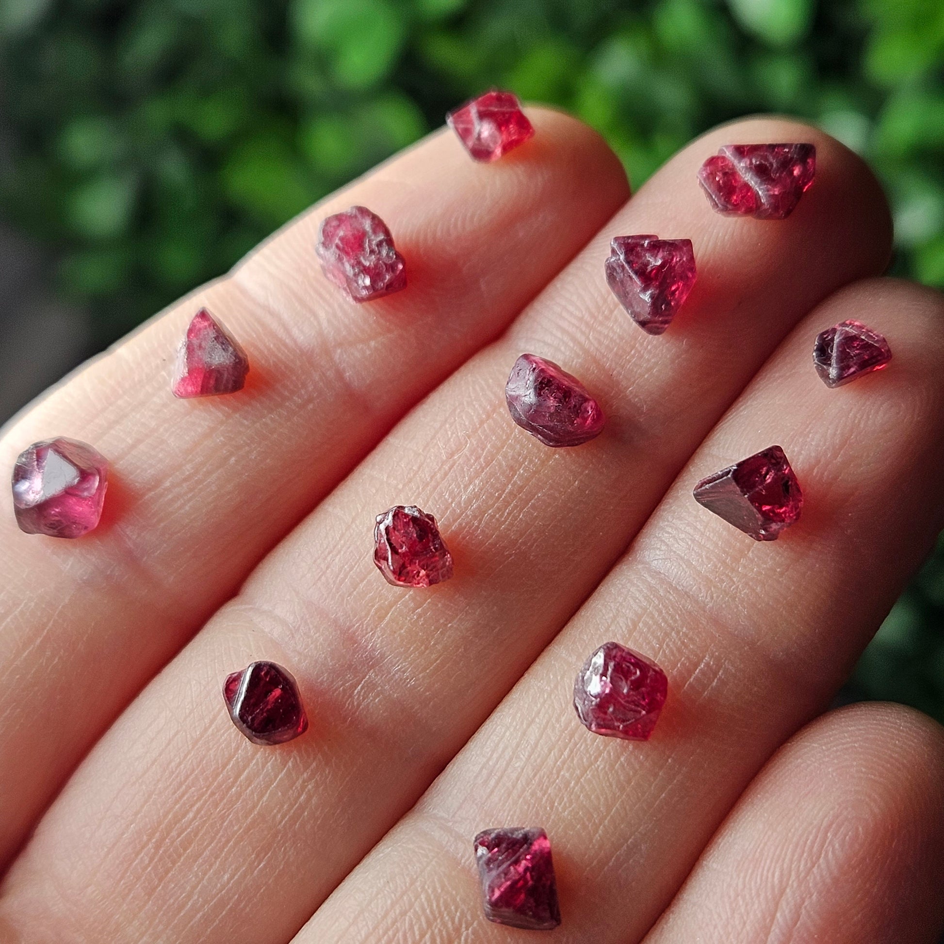 These Spinel crystals are raw and range in color from deep burgundy to blood red. These specimens each measure between 3mm and 5mm.