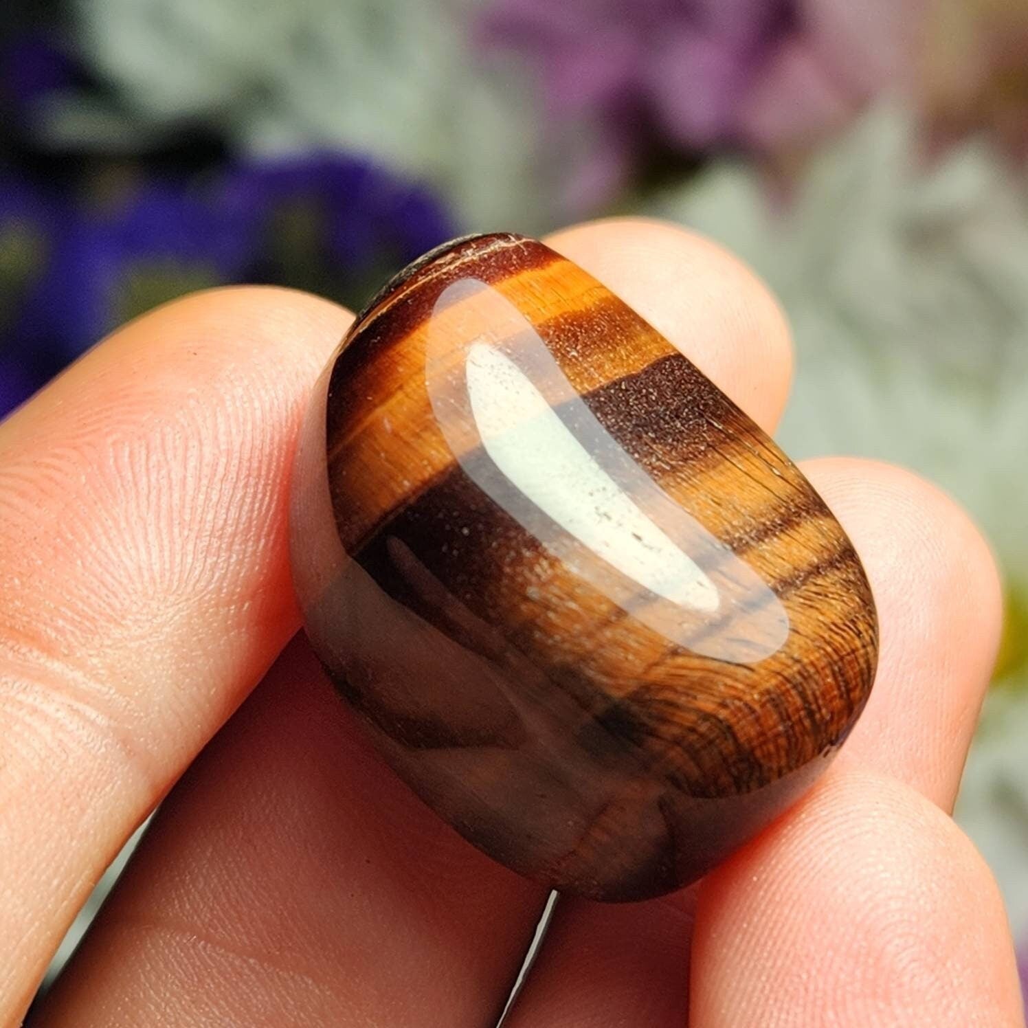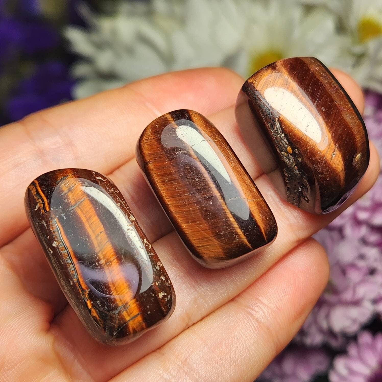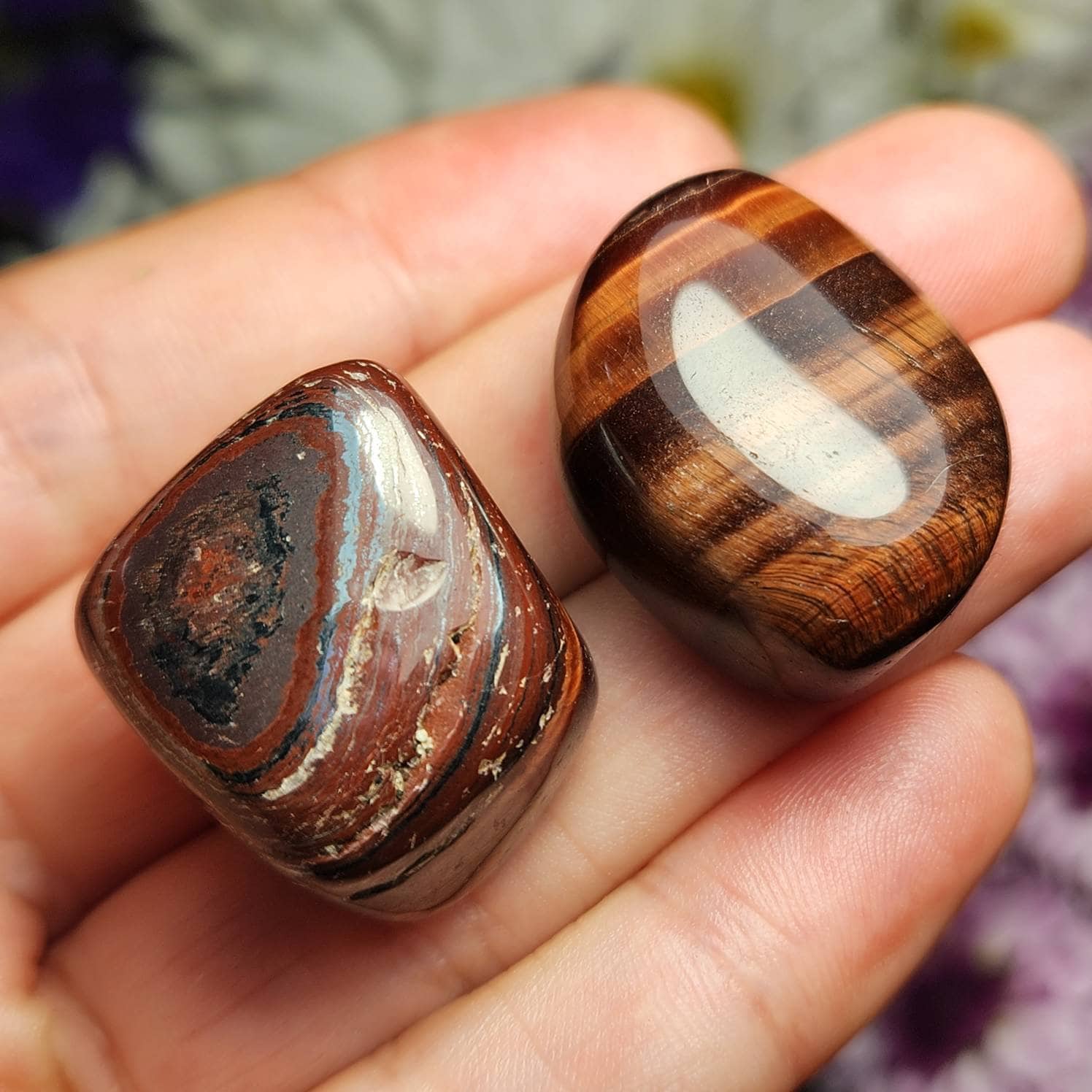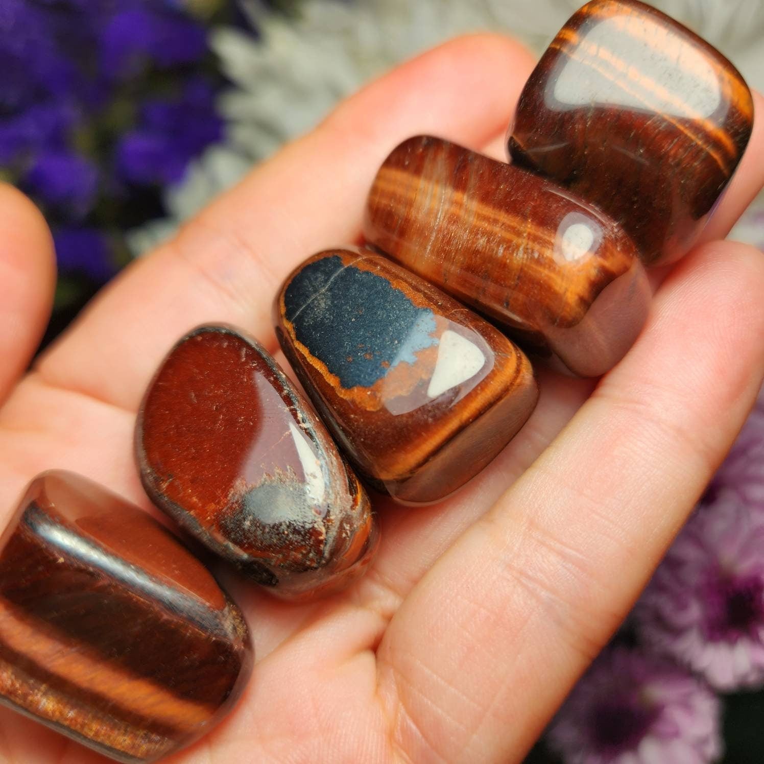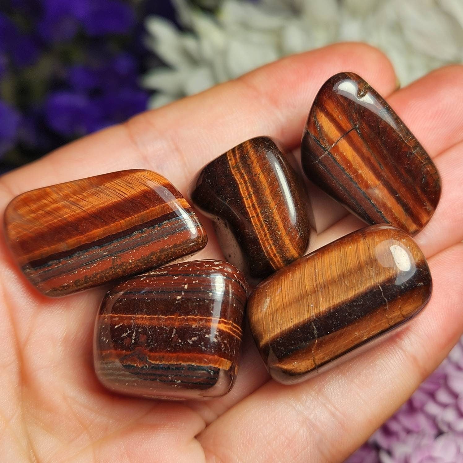 This tumbled Red Tigers Eye is a deep crimson and displays shining bronze chatoyancy. Each specimen measures approximately .75 inches.
