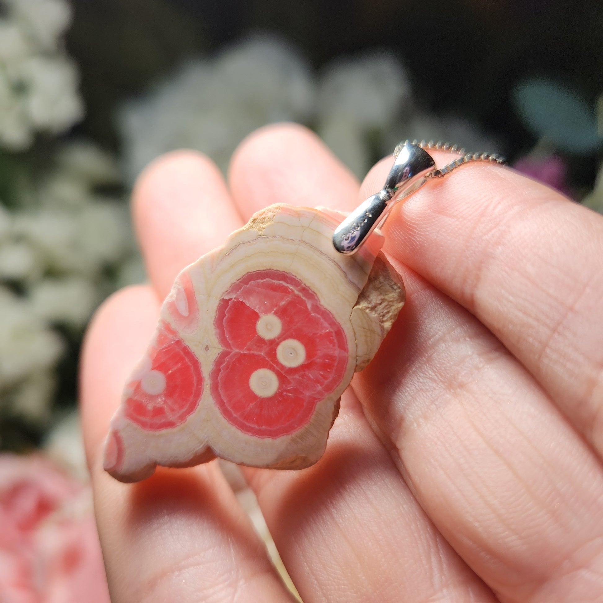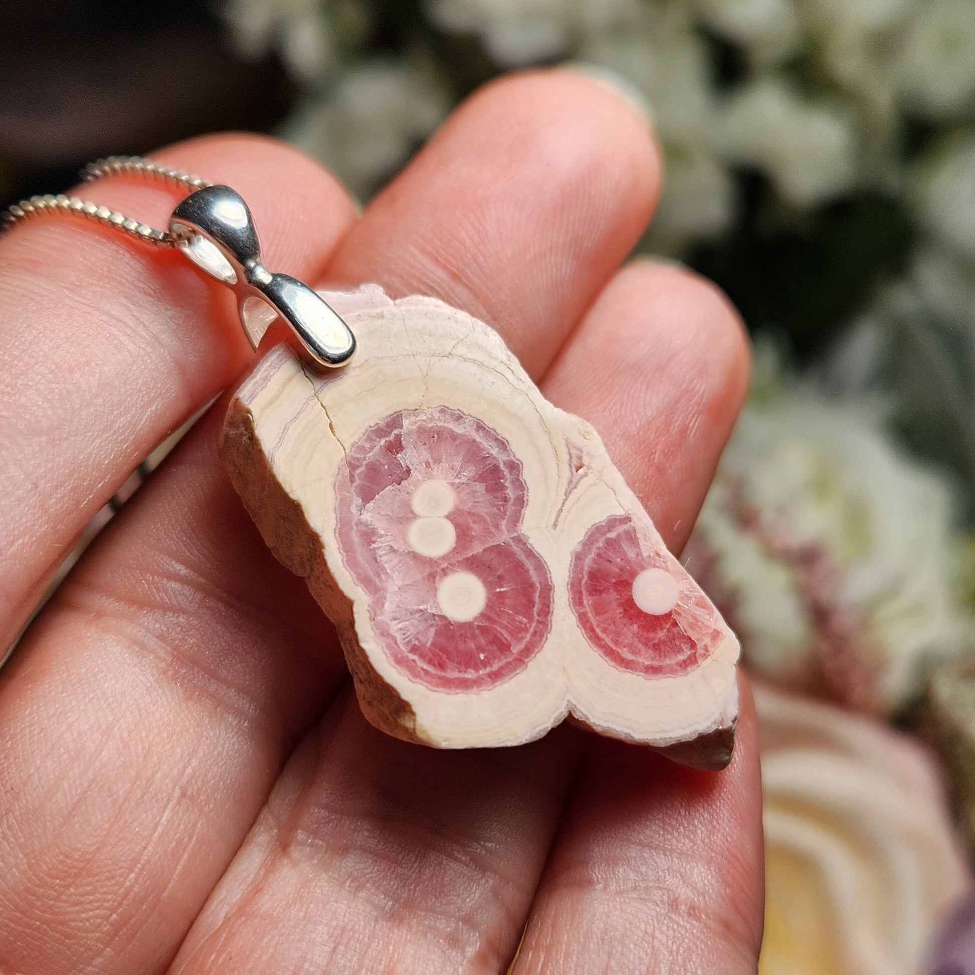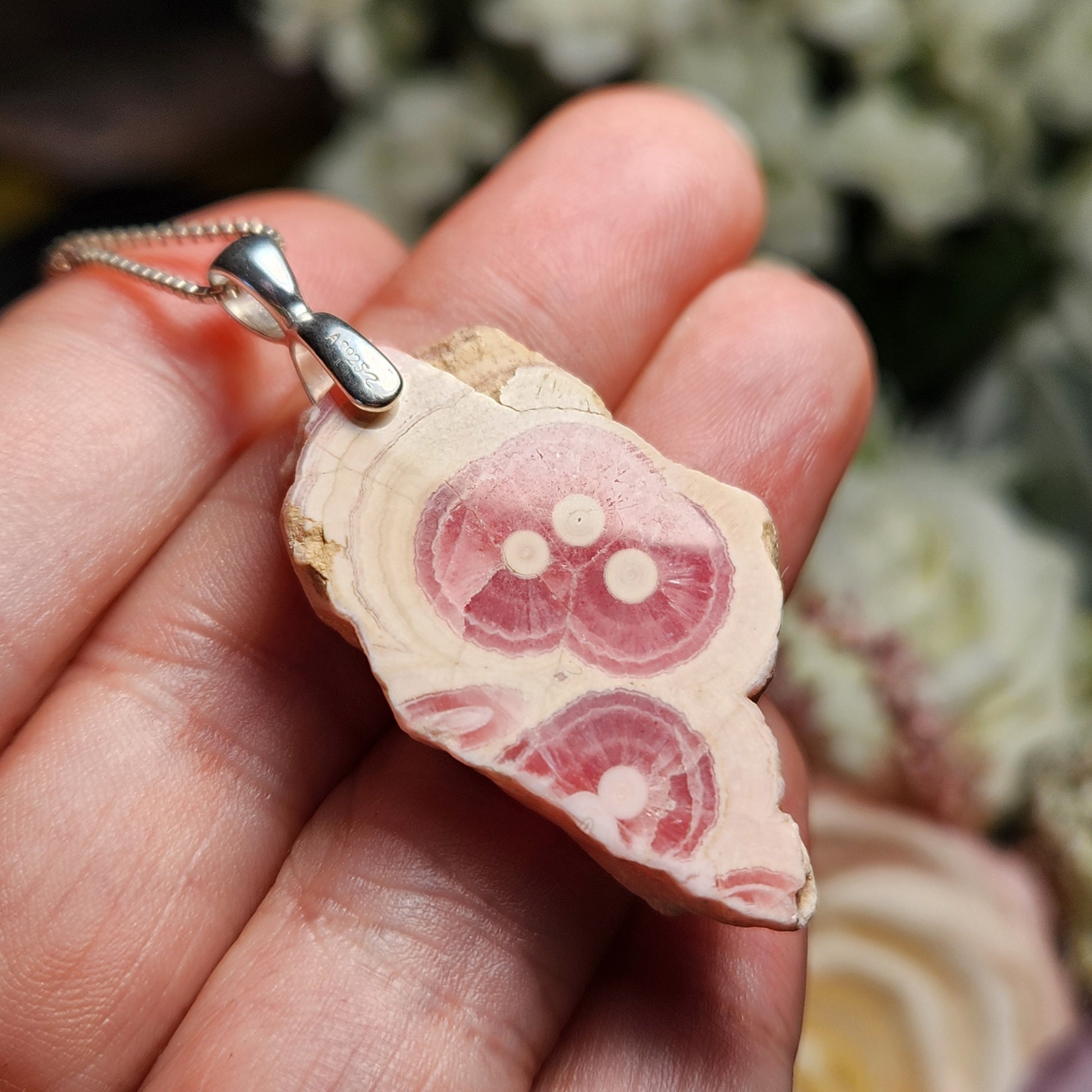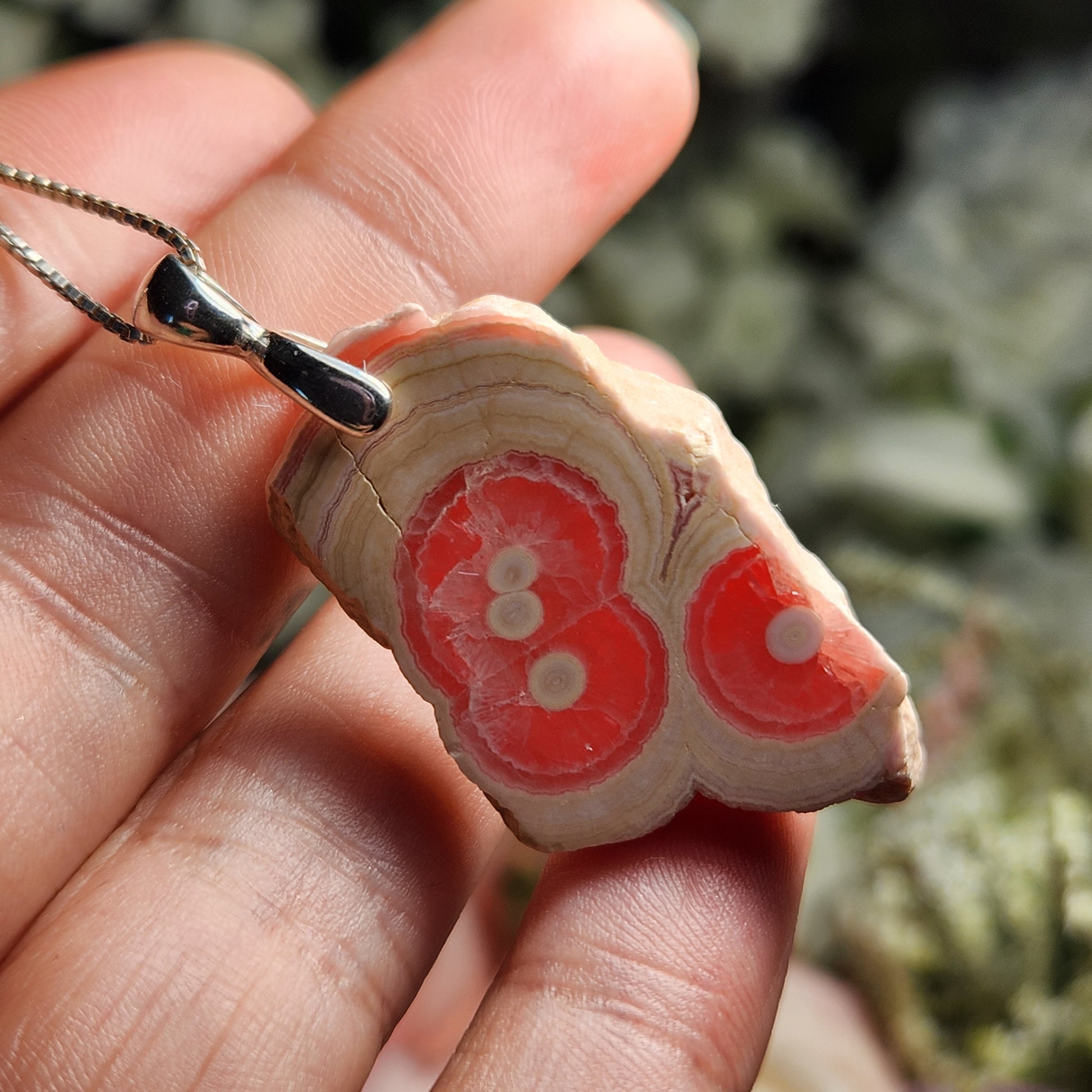 This gemmy Rhodochrosite slice displays a concentric pattern and reveals a translucence when held up to the light. This crystal has been handpicked and processed into an intentional piece of jewelry using .925 Sterling Silver. This pendant measures approximately 42mm by 18mm. The silver chain used in the photos is to help envision how this pendant will look while adorned but is not included in the listing.