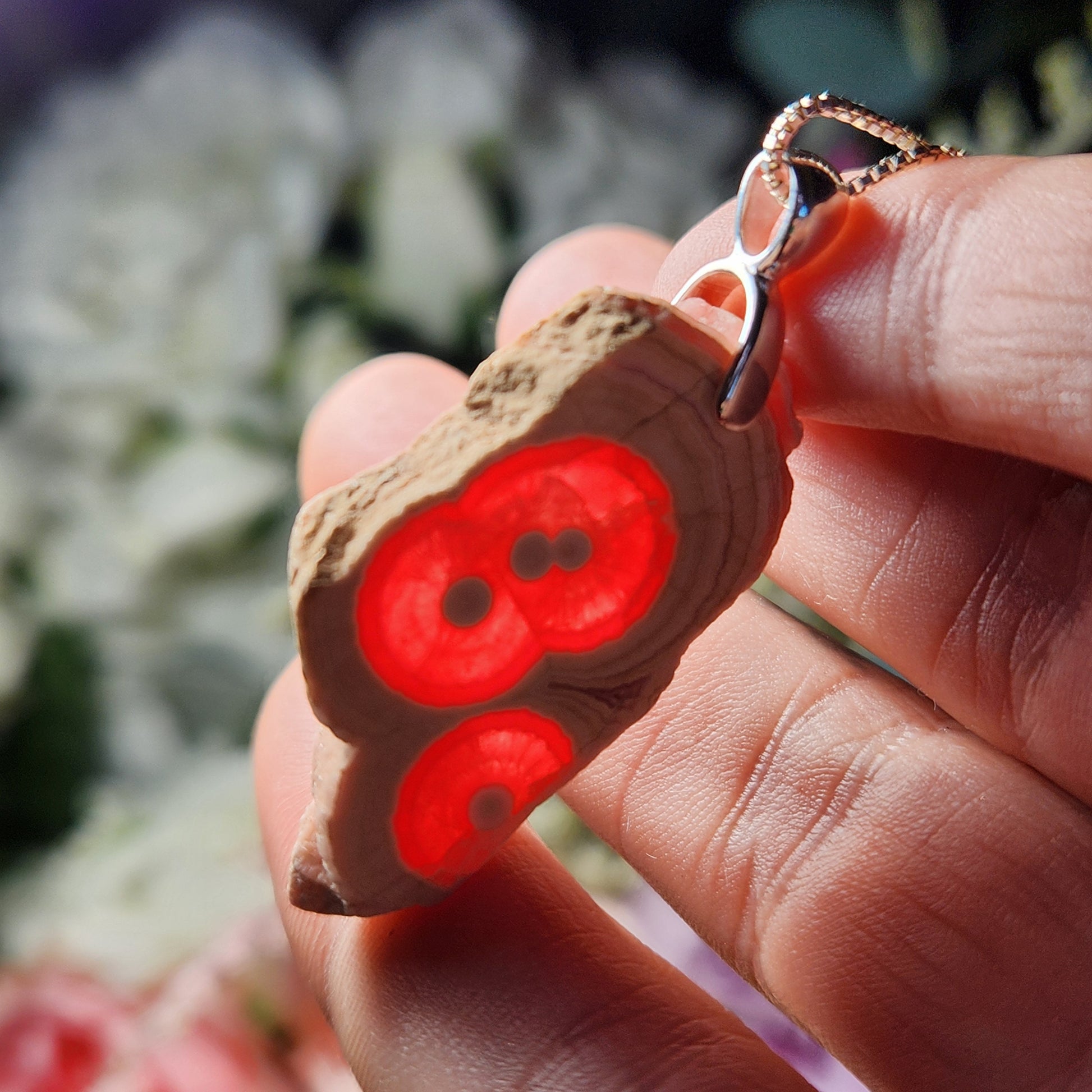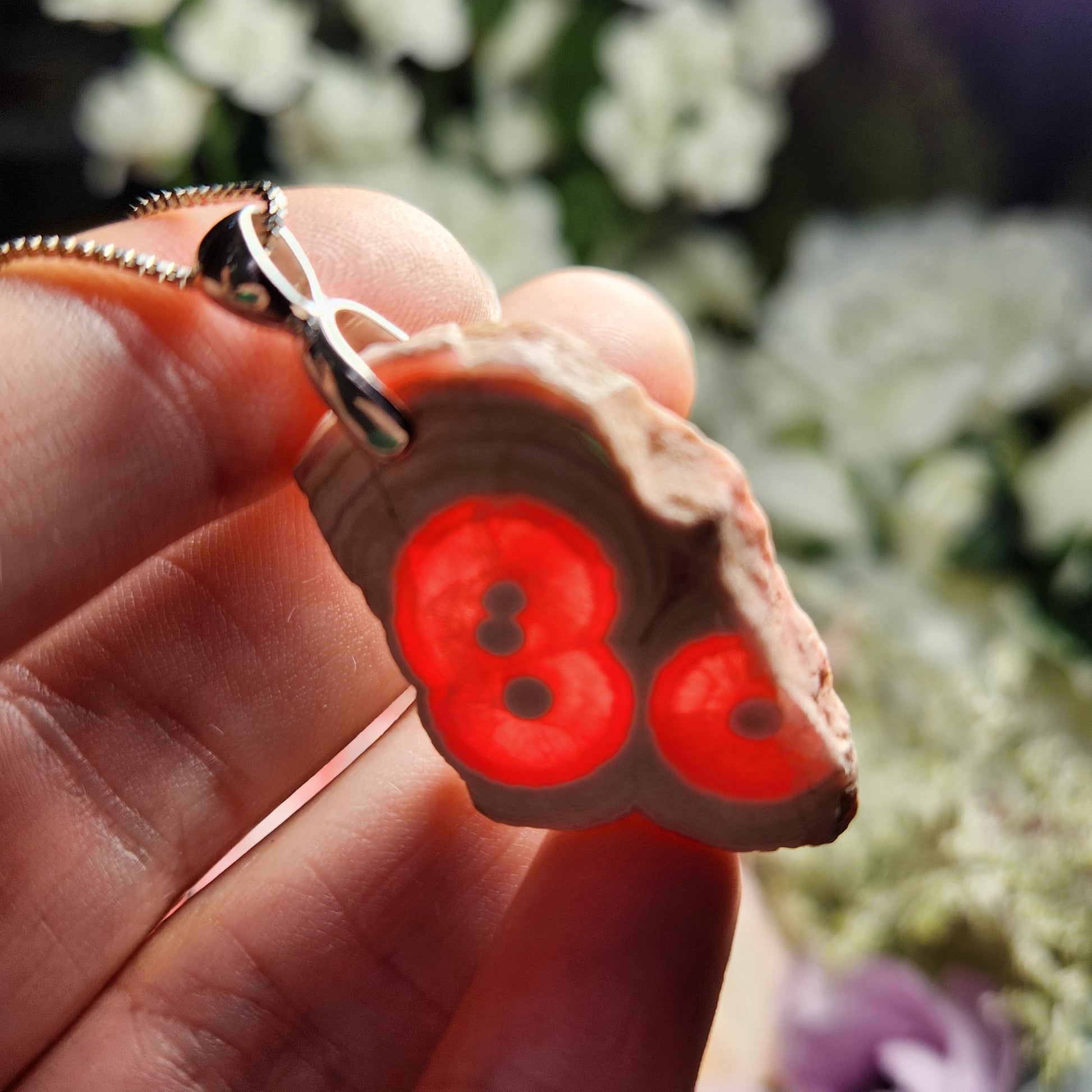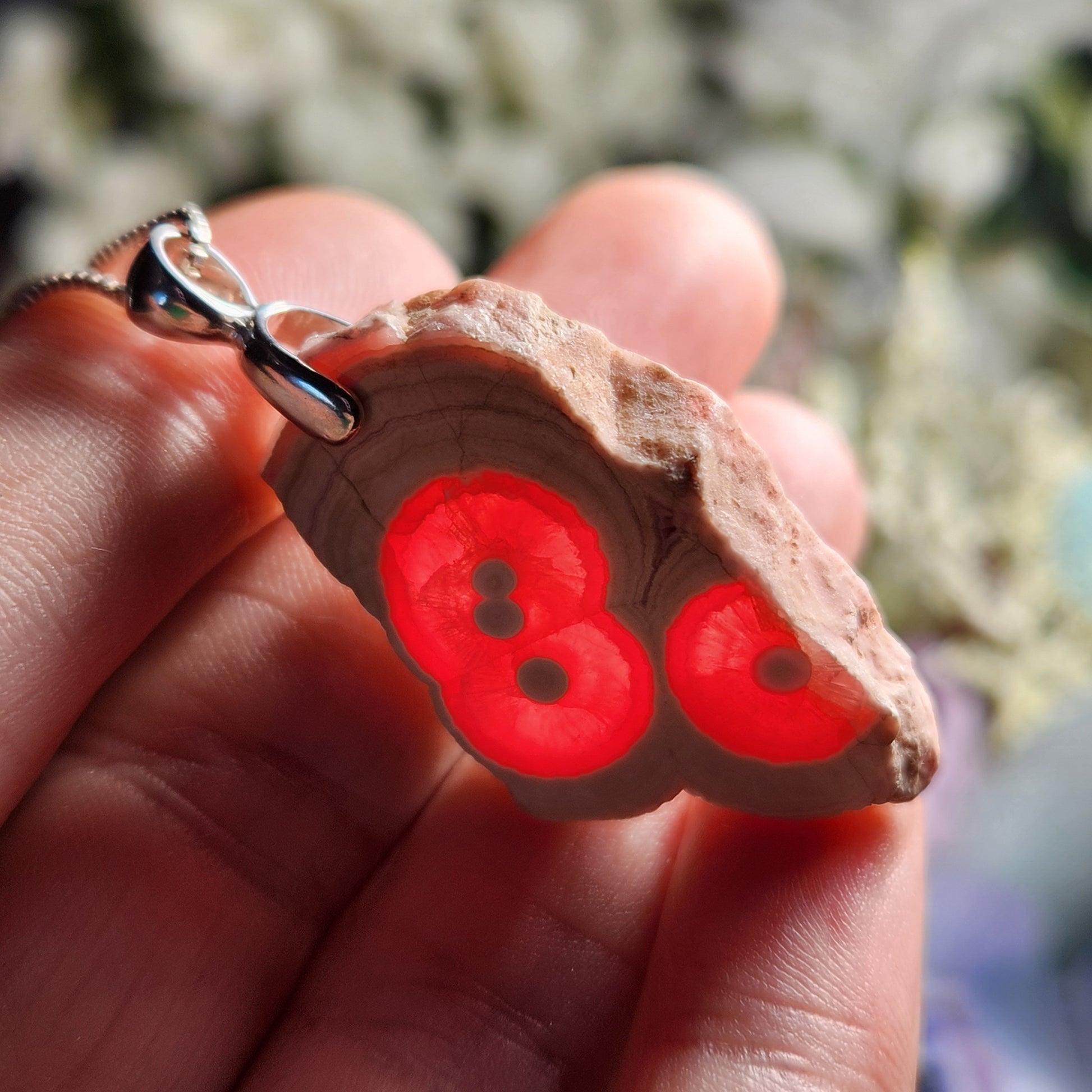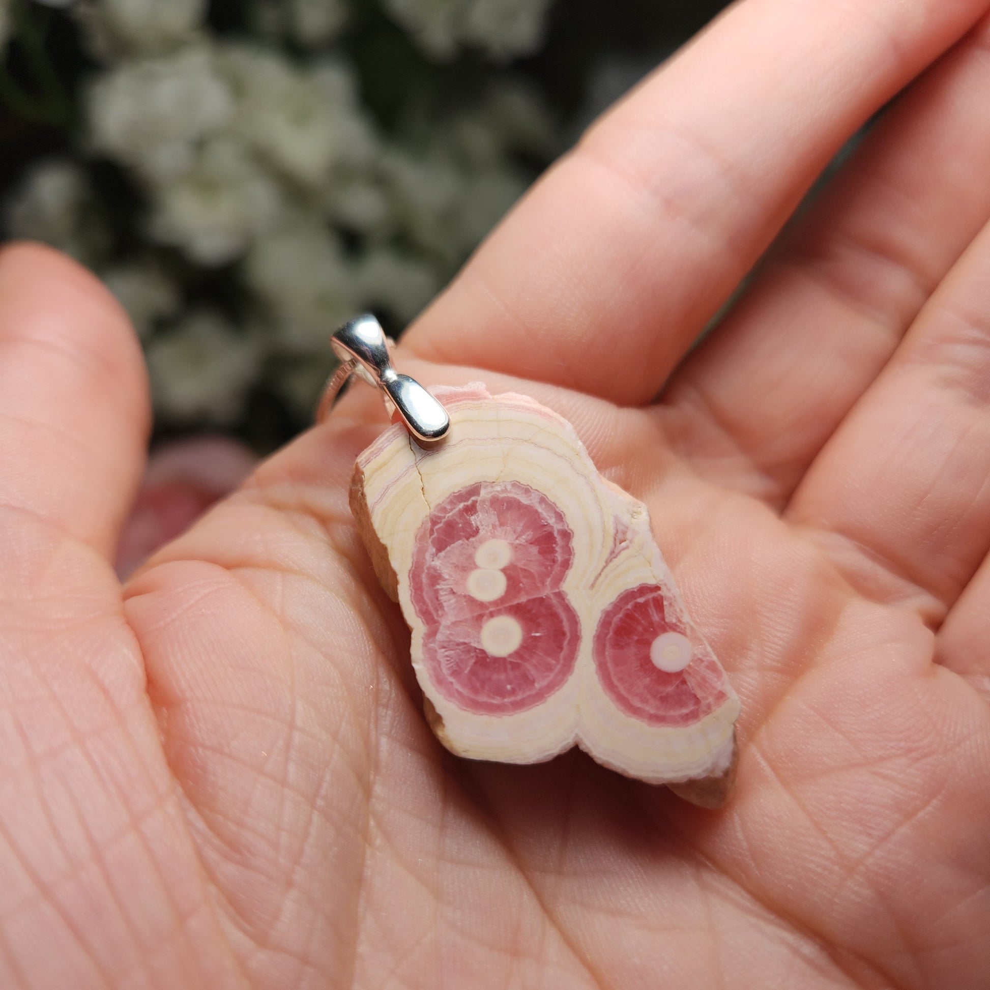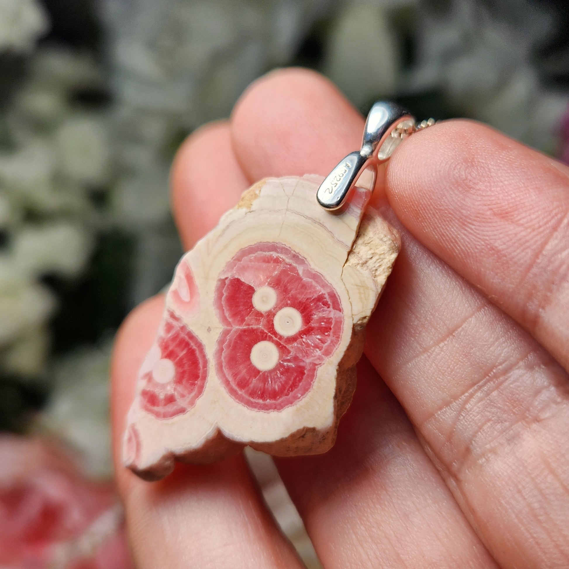 This gemmy Rhodochrosite slice displays a concentric pattern and reveals a translucence when held up to the light. This crystal has been handpicked and processed into an intentional piece of jewelry using .925 Sterling Silver. This pendant measures approximately 42mm by 18mm. The silver chain used in the photos is to help envision how this pendant will look while adorned but is not included in the listing.
