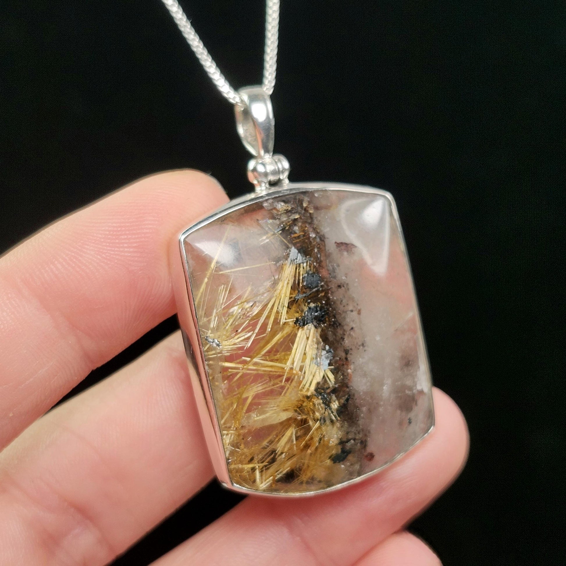 This Brazilian gemstone has been cut and highly polished to showcase the golden Rutile and silver Hematite inclusions within. Displaying striking duality, this high-quality crystal features one side of cloudy Quartz alongside one side of clear Quartz that has striking golden Rutile. In the middle of these two sides inlays a vertical line of silver Hematite speckles. This crystal has been custom created into a sturdy piece of jewelry using .925 Sterling Silver. This pendant measures approximately 46mm by 27mm. The silver chain used in the photos is to help envision how this pendant will look while adorned but is not included in the listing.
