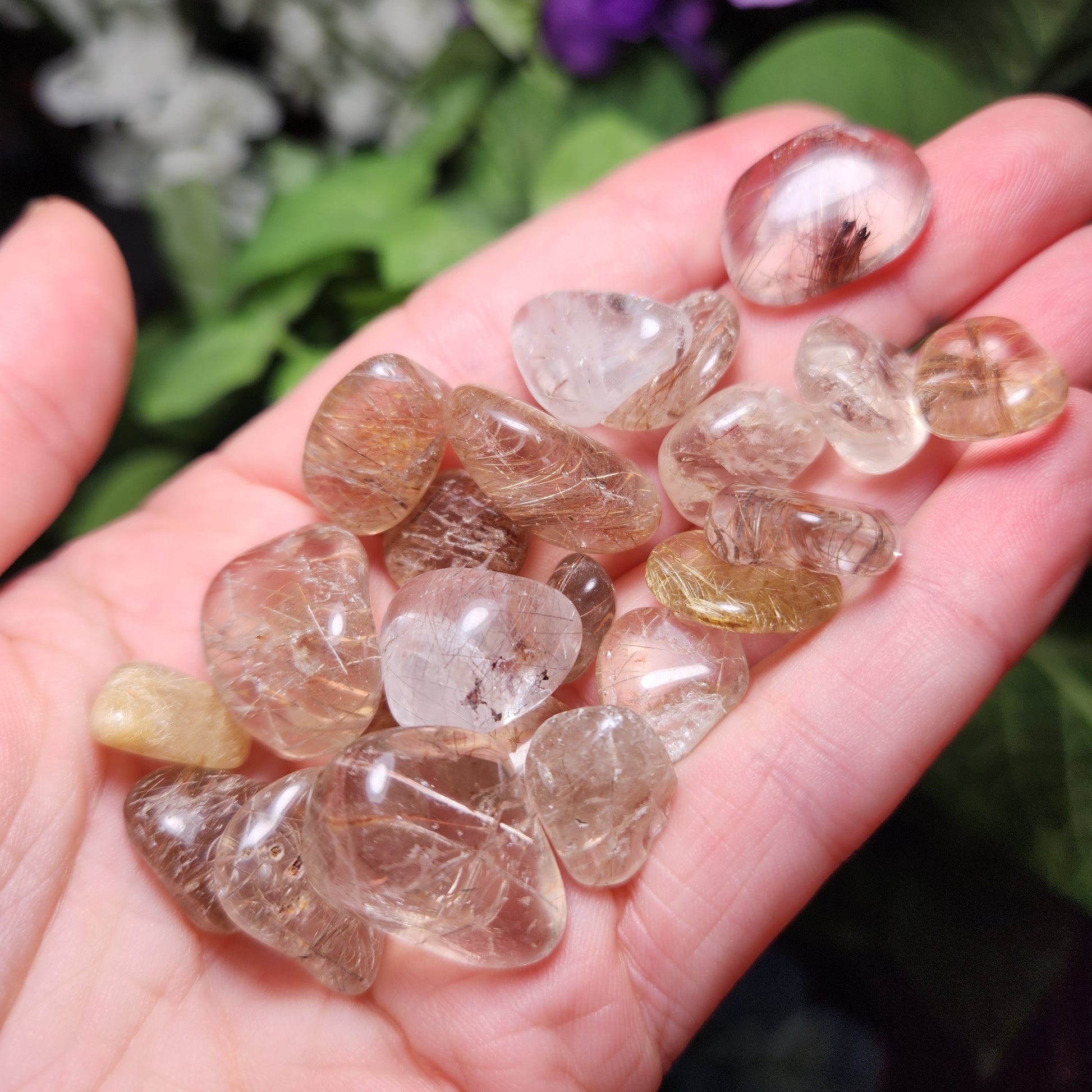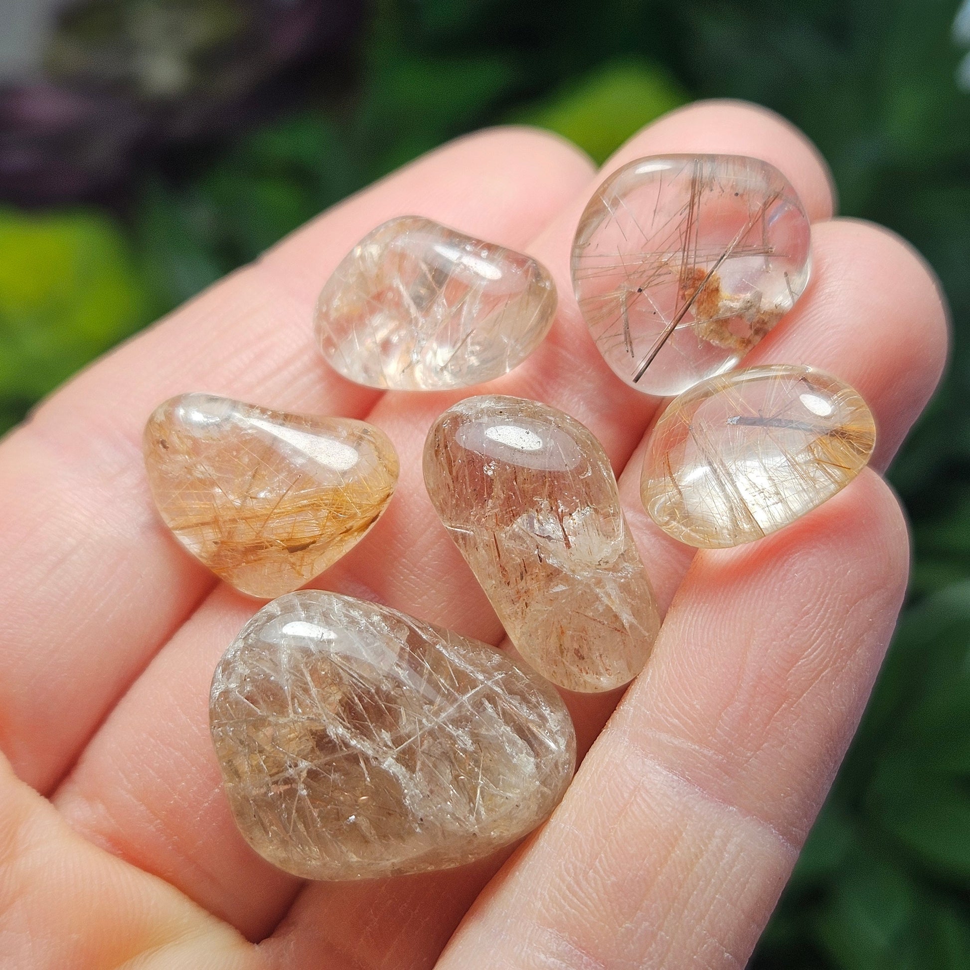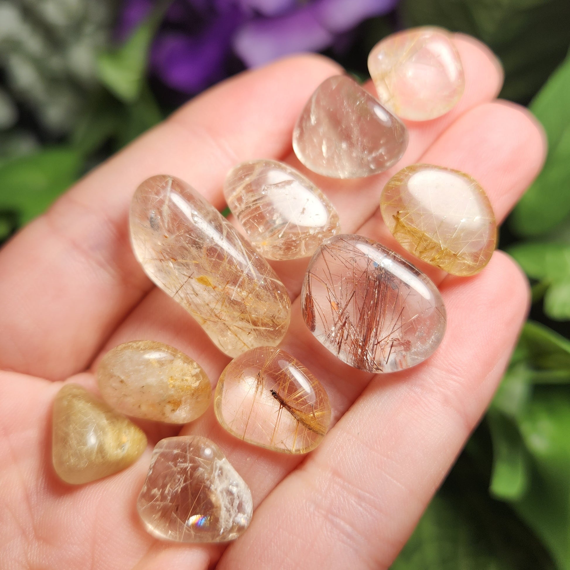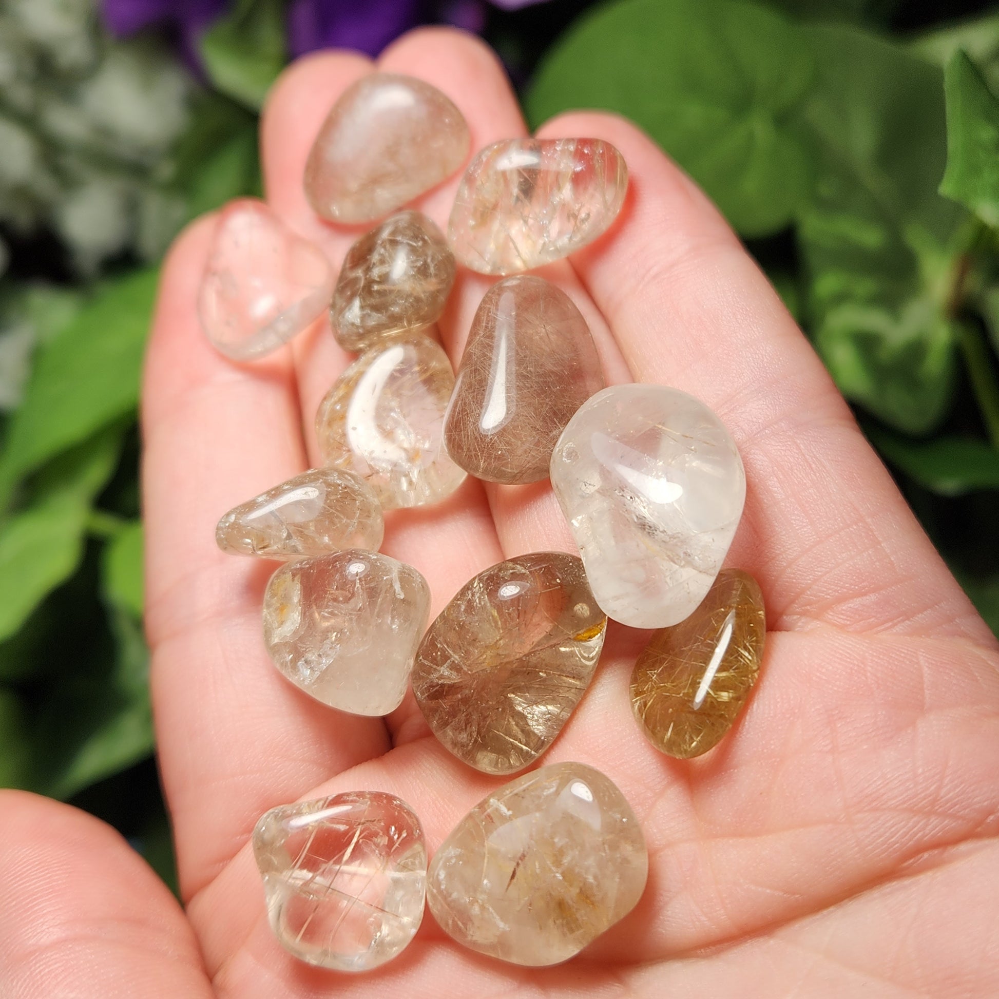 These Quartz crystals showcase inclusions of Rutile needles. These inclusions range from sparse to saturated throughout the stones. They have a variety of freeform shapes and have been tumbled to a high polish. Each specimen measures approximately 12mm and up.