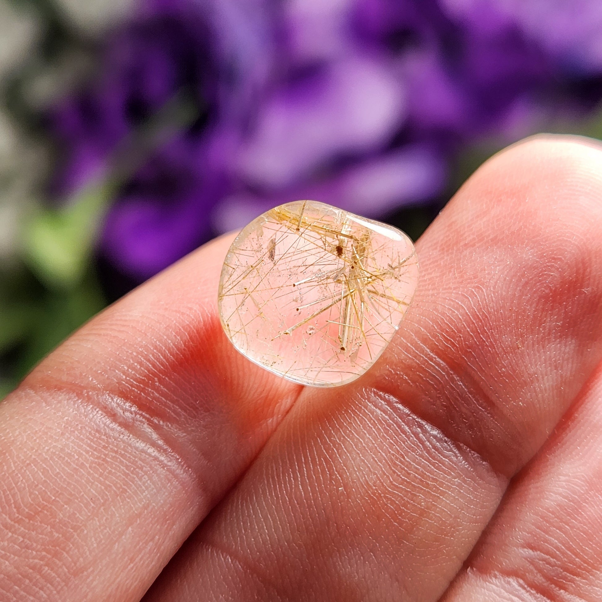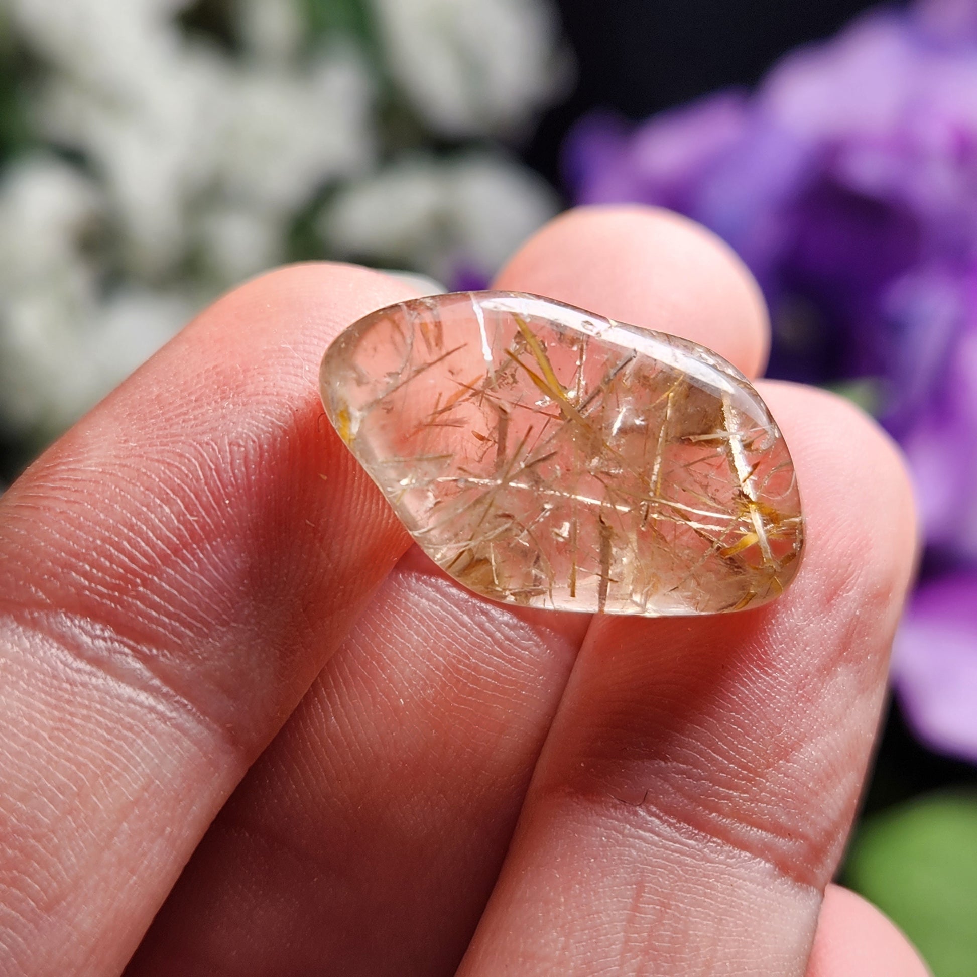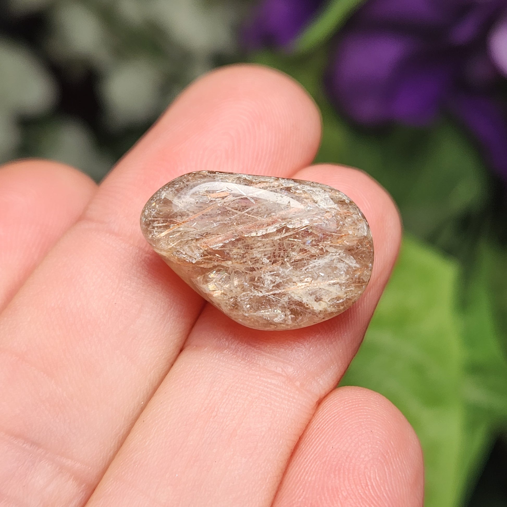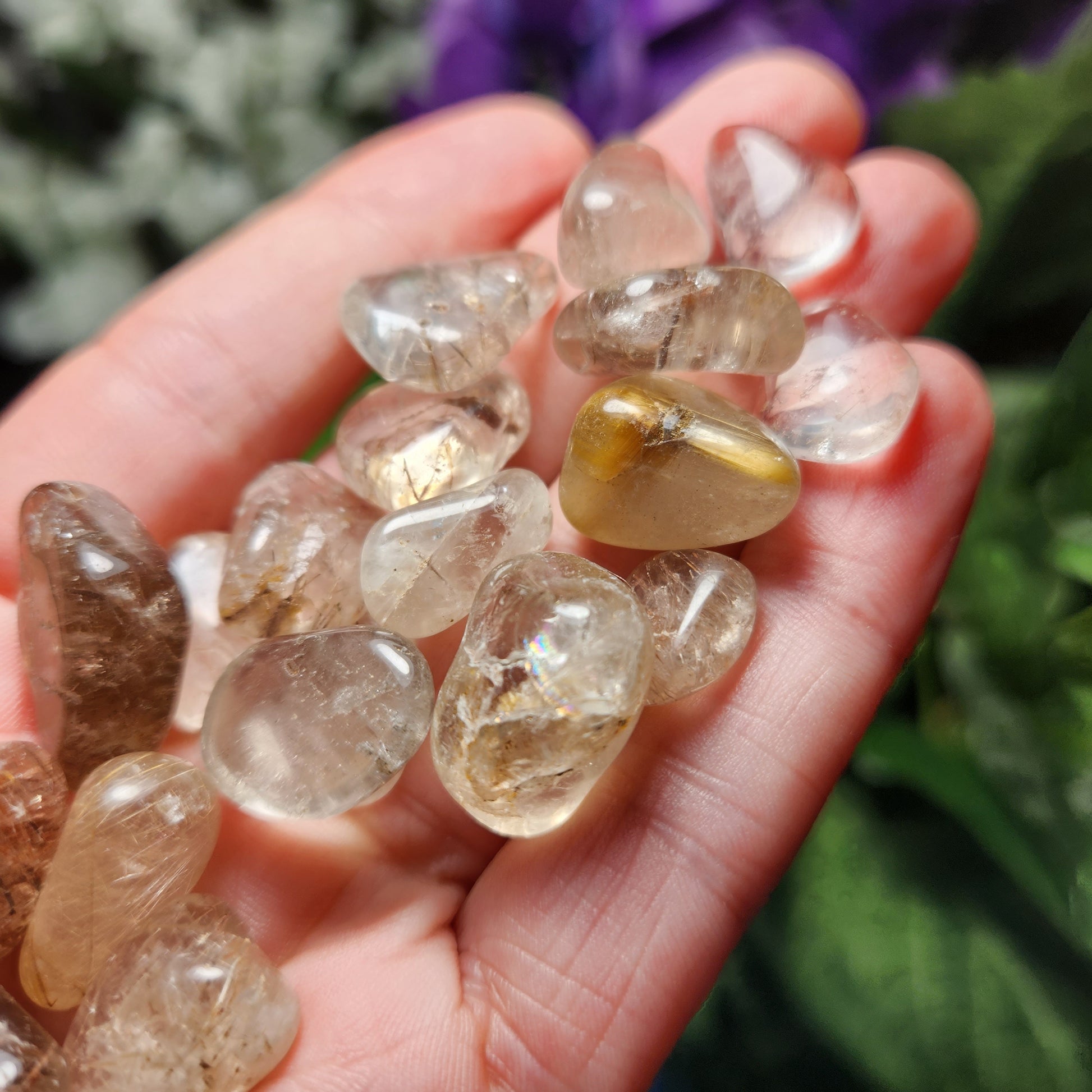 These Quartz crystals showcase inclusions of Rutile needles. These inclusions range from sparse to saturated throughout the stones. They have a variety of freeform shapes and have been tumbled to a high polish. Each specimen measures approximately 12mm and up.