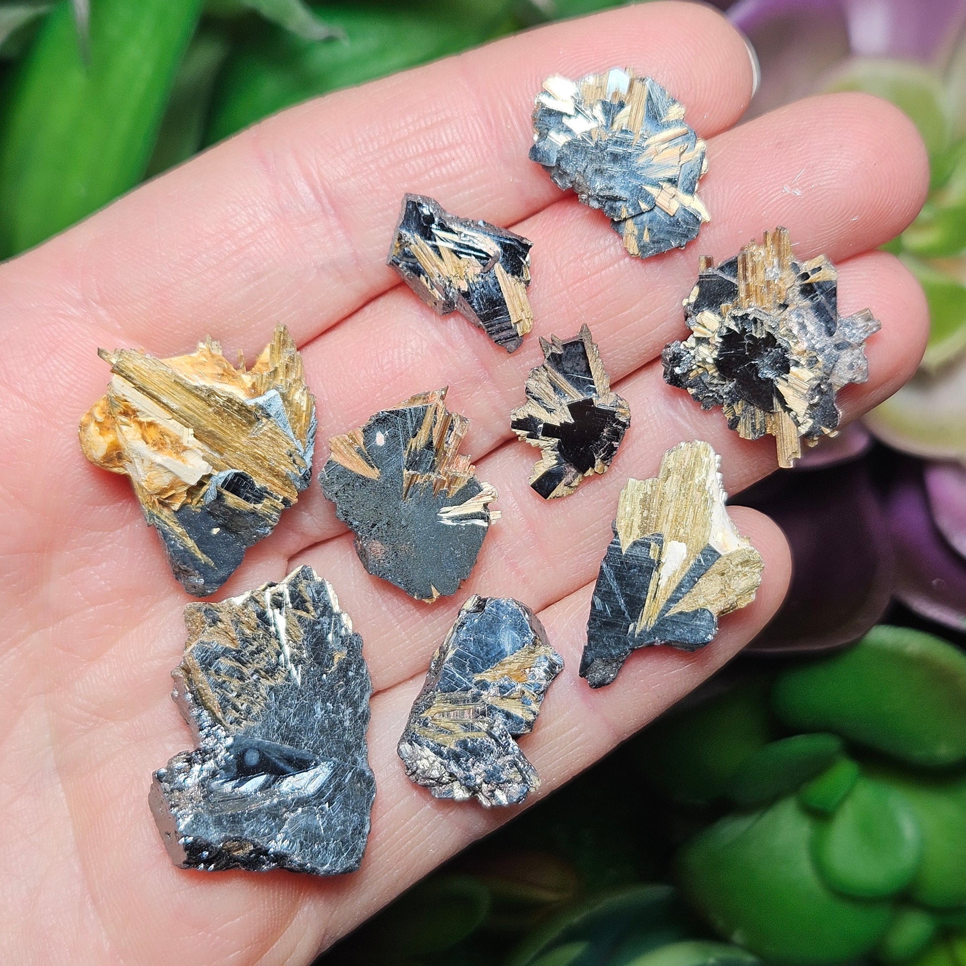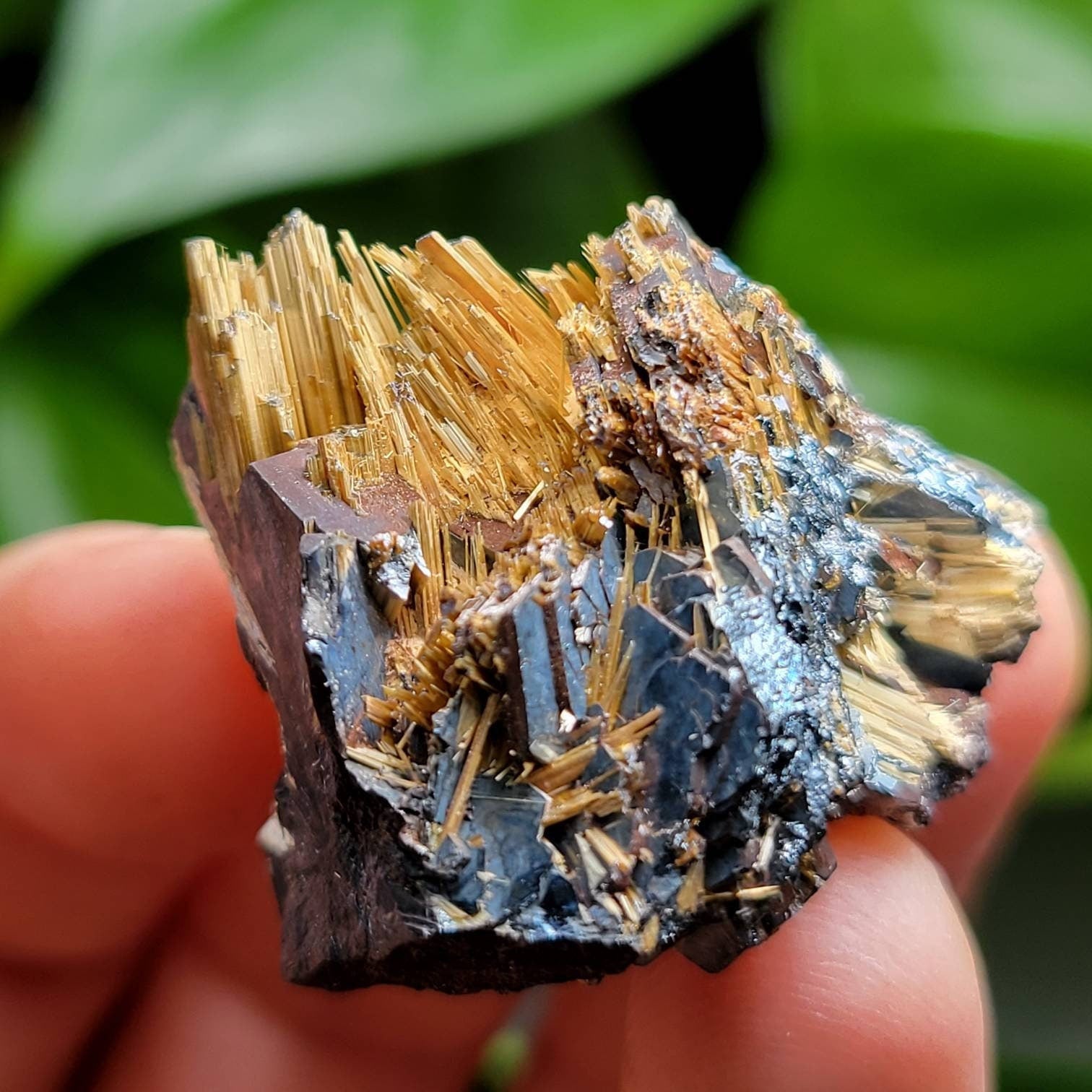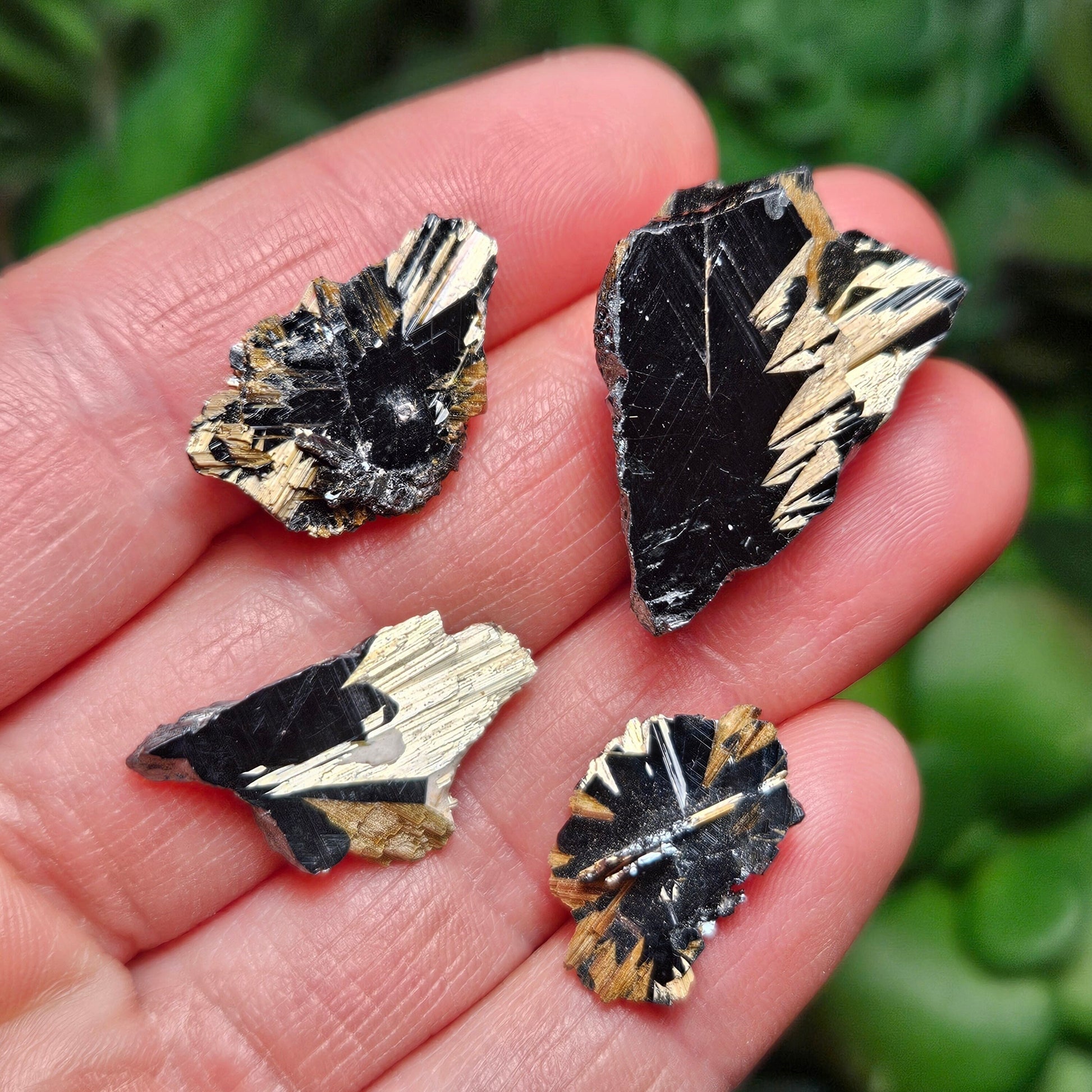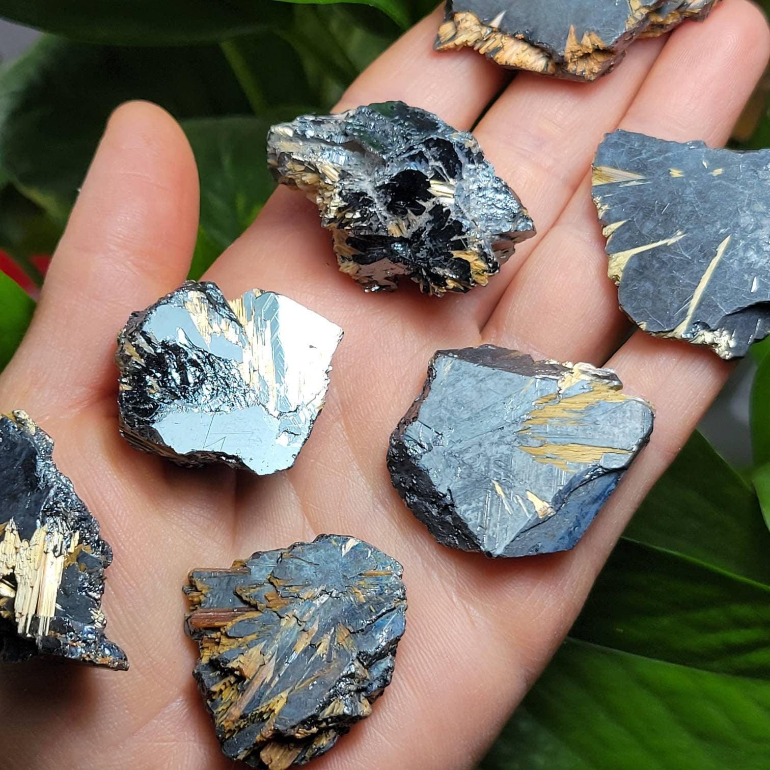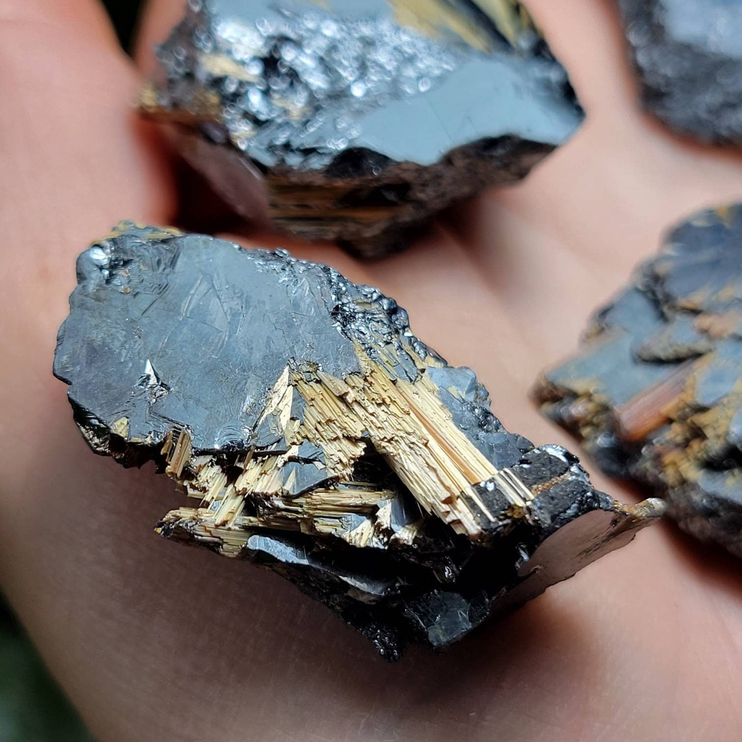 These Star Rutile in Hematite crystals are some of the best quality available on the market and come from Brazil. These specimens have a juxtaposition of naturally polished black hematite with striated layers of golden sprays of rutile. Every one of these pieces are unique, all including both black Hematite and golden sprays of Rutile crystal. The Hematite crystal blades are solid and sturdy, but the small blades of Rutile crystal are softer and should be treated with care for longevity. Each unique piece includes one or more golden Rutile sprays through natural black Hematite.