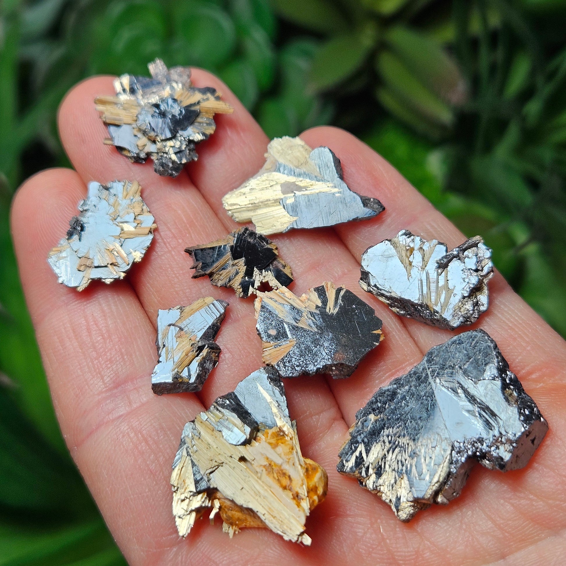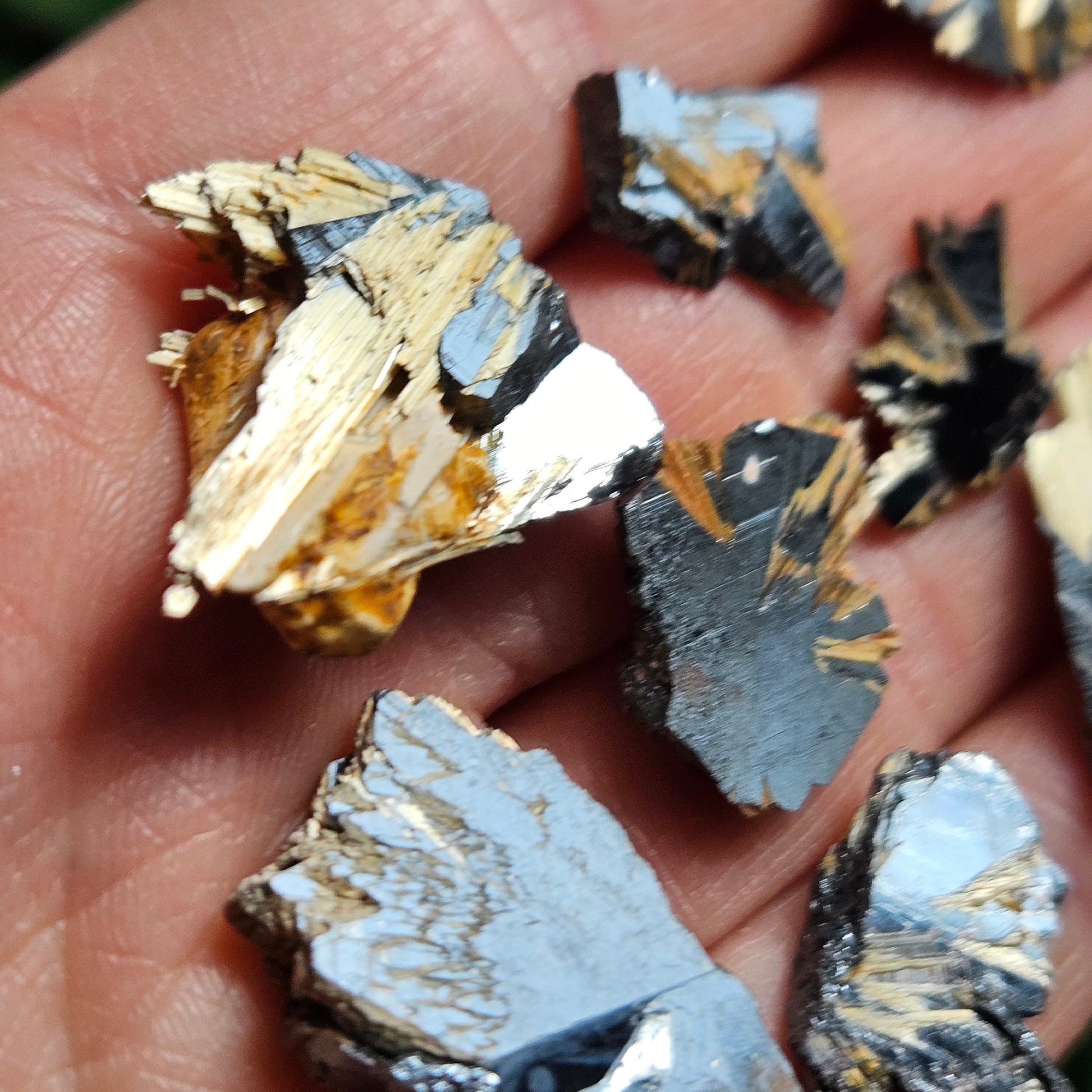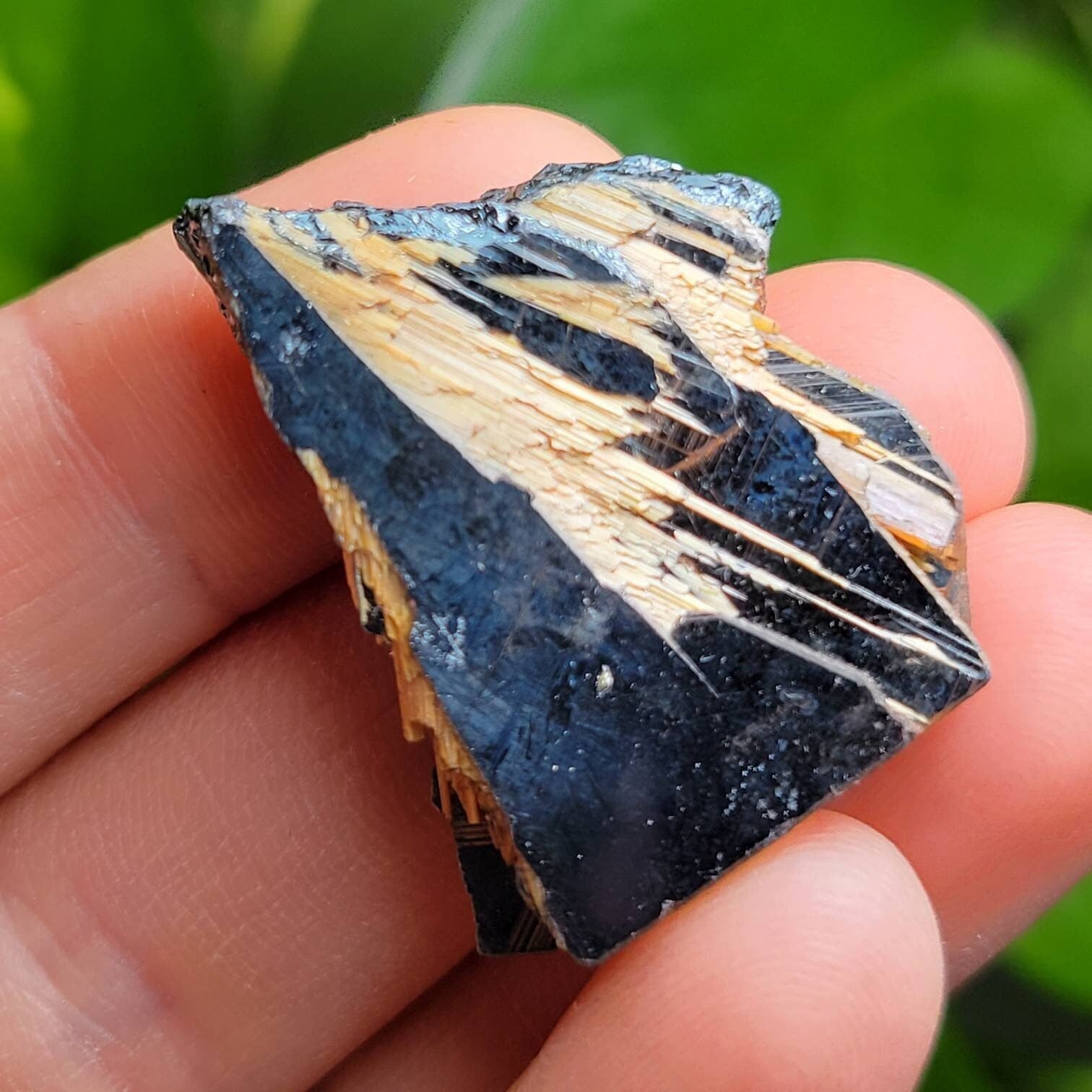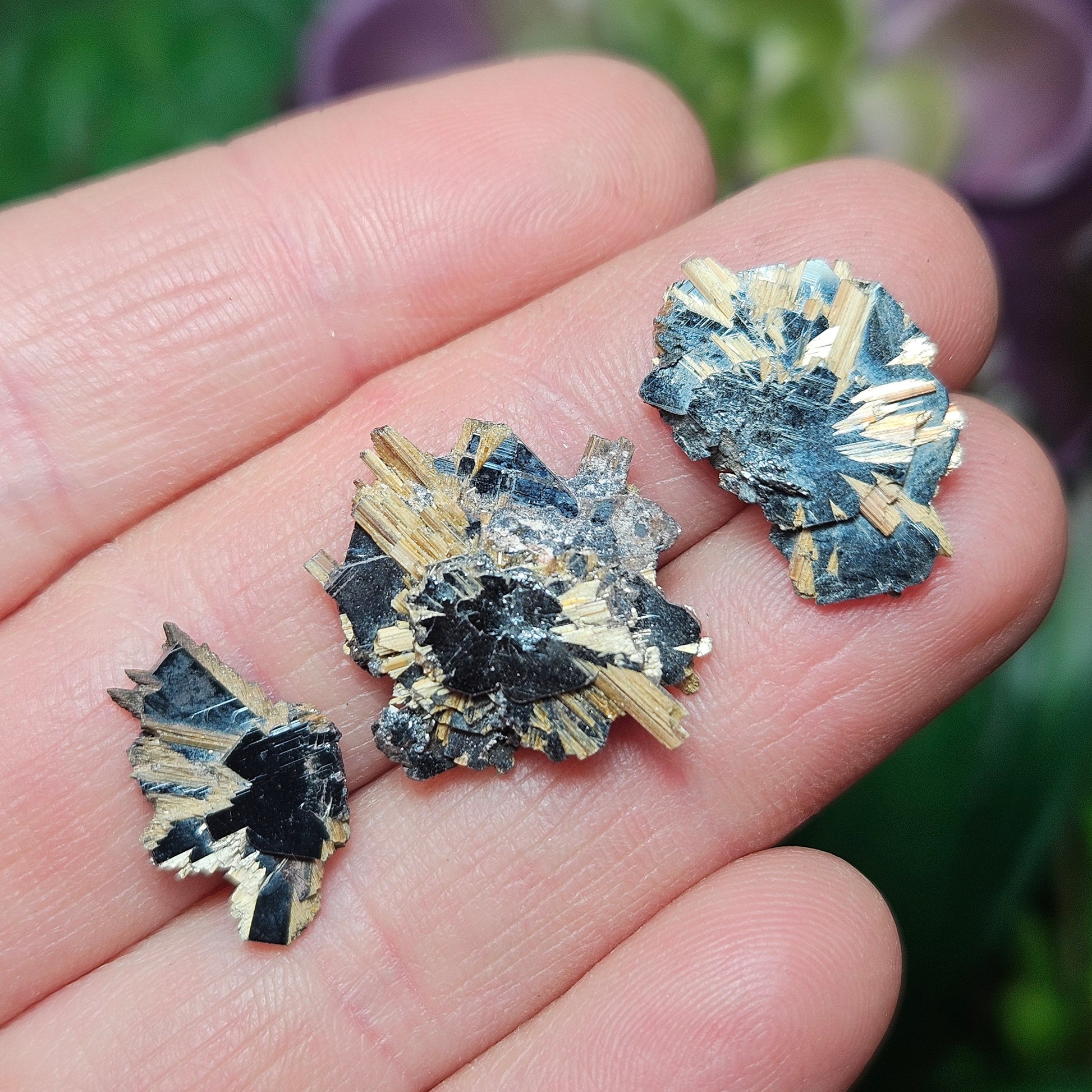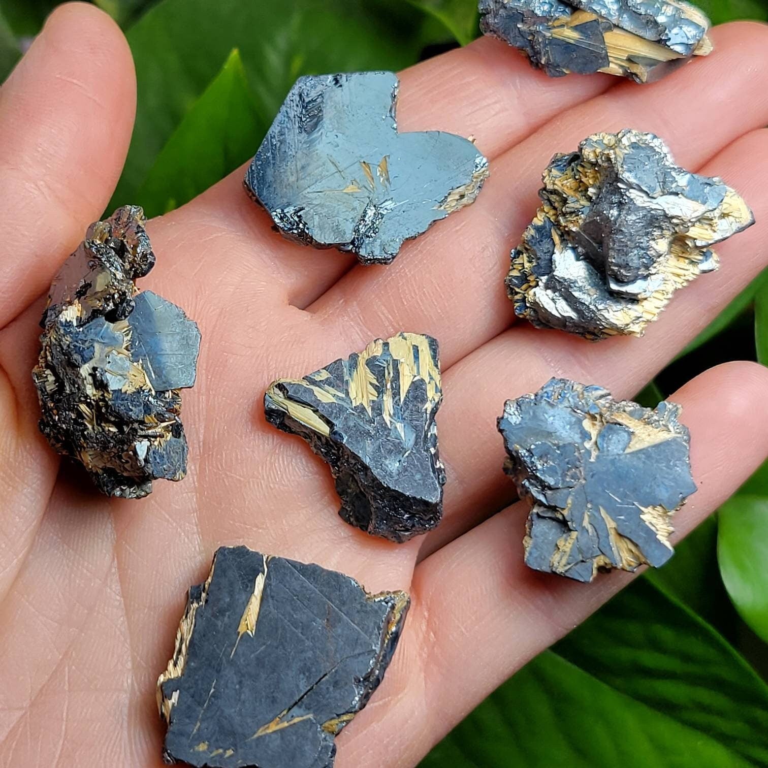 These Star Rutile in Hematite crystals are some of the best quality available on the market and come from Brazil. These specimens have a juxtaposition of naturally polished black hematite with striated layers of golden sprays of rutile. Every one of these pieces are unique, all including both black Hematite and golden sprays of Rutile crystal. The Hematite crystal blades are solid and sturdy, but the small blades of Rutile crystal are softer and should be treated with care for longevity. Each unique piece includes one or more golden Rutile sprays through natural black Hematite.