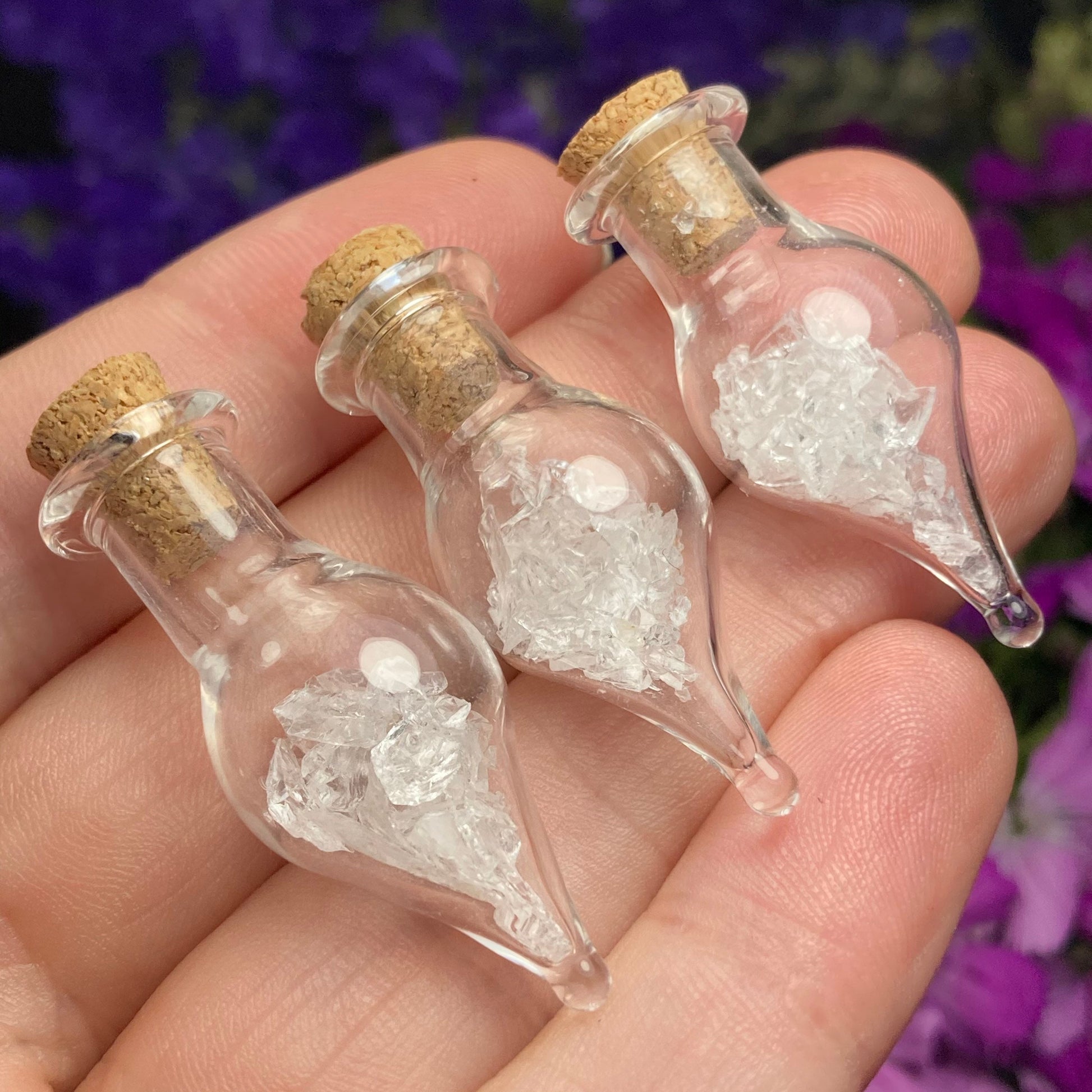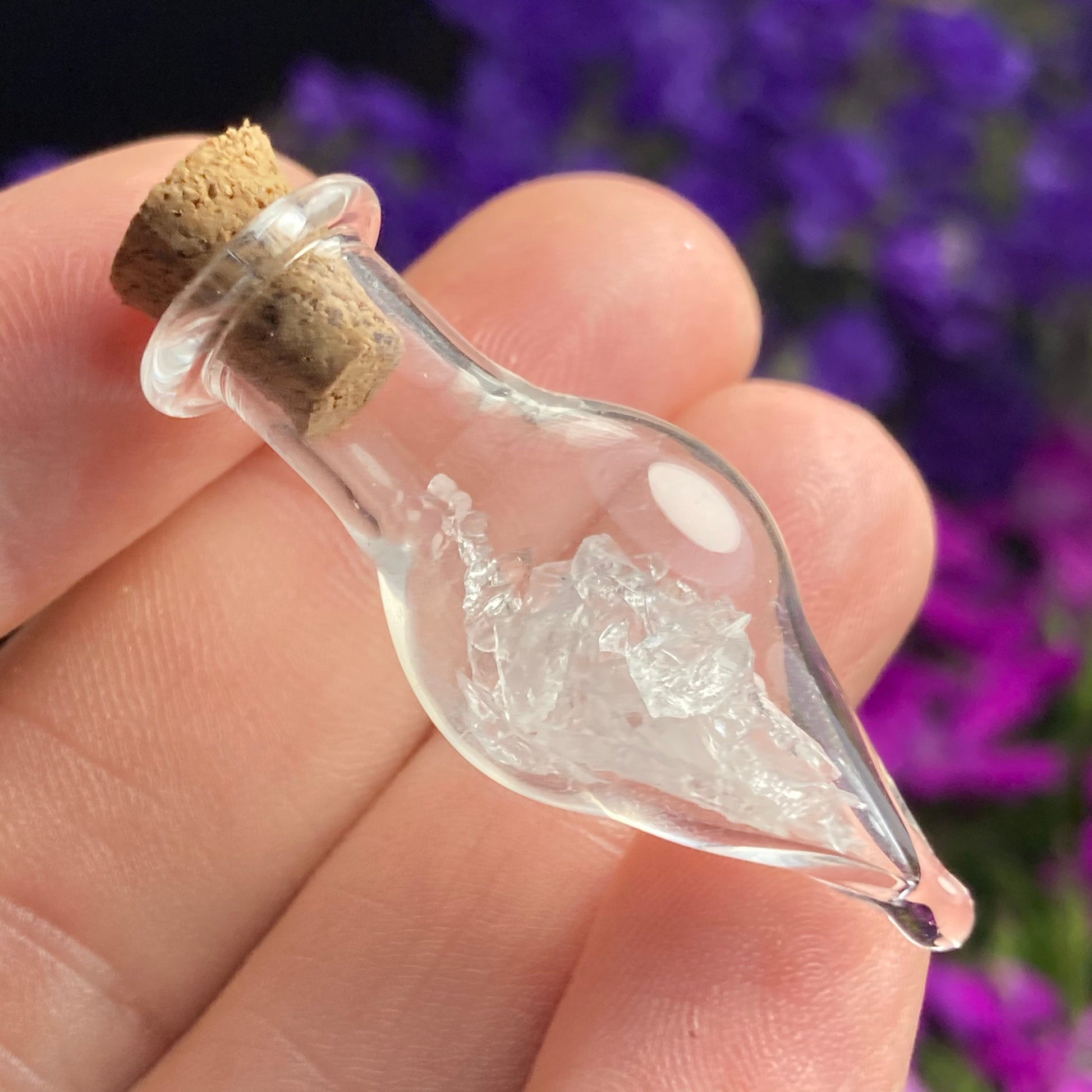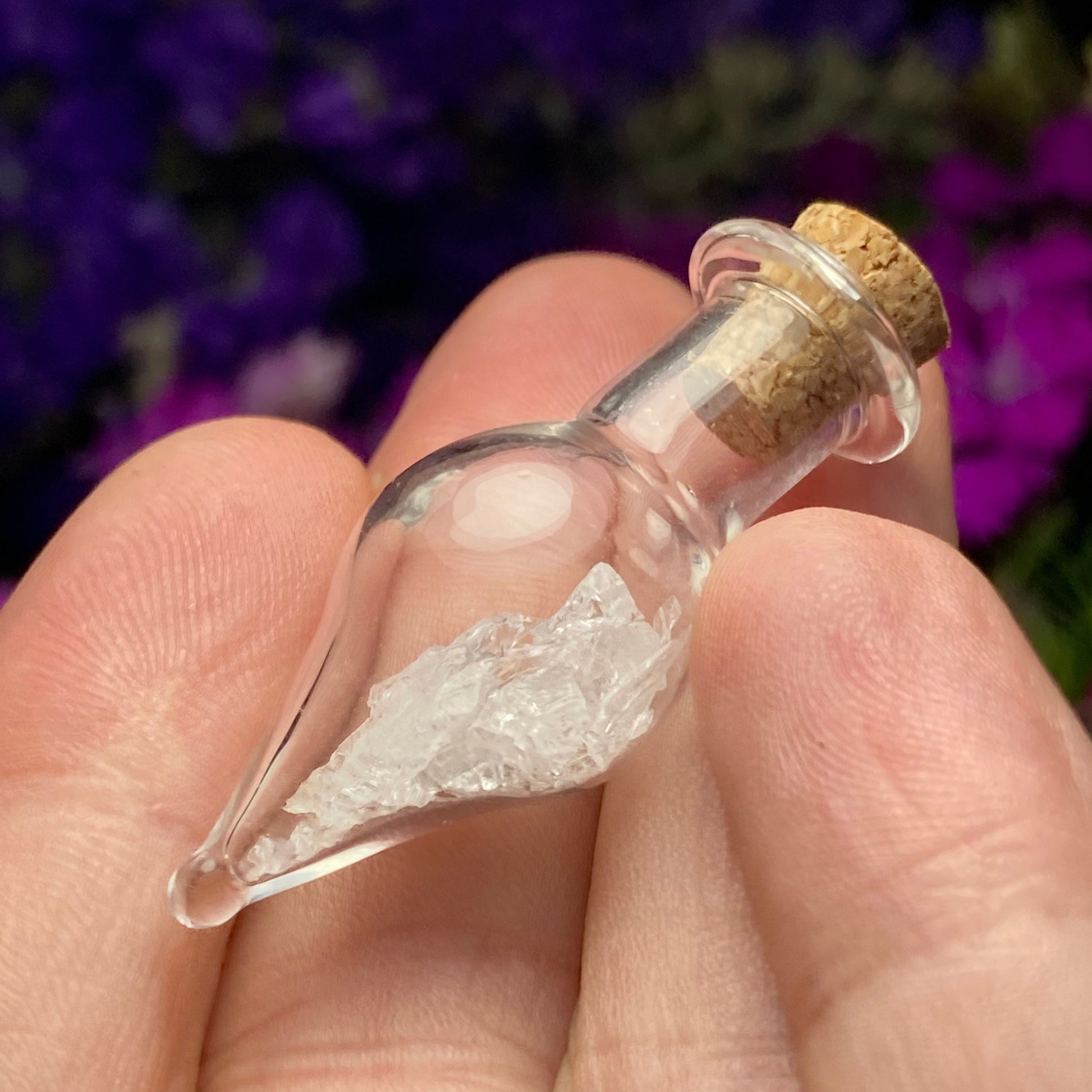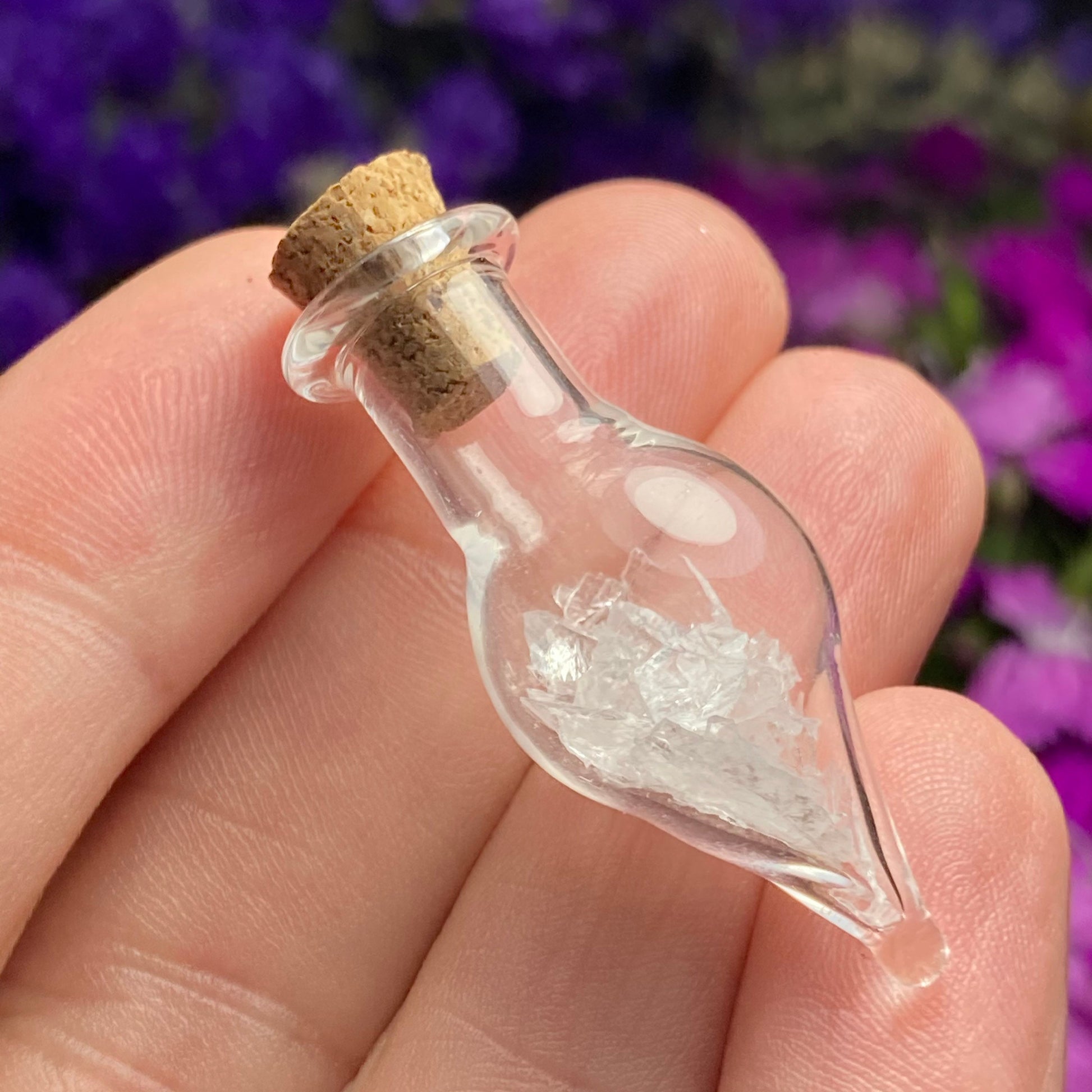 This listing is for ONE (1) Glass Jar with Satyaloka Quartz Chips. These authentic Satyaloka Quartz crystal chips are set into a glass jar and secured with a cork top. The teardrop shaped jars are made of blown glass with a small cork that can be removed to have access to the chips. Each jar measures approximately 30mm by 15mm. *The glass jars are fragile and should be handled with care!