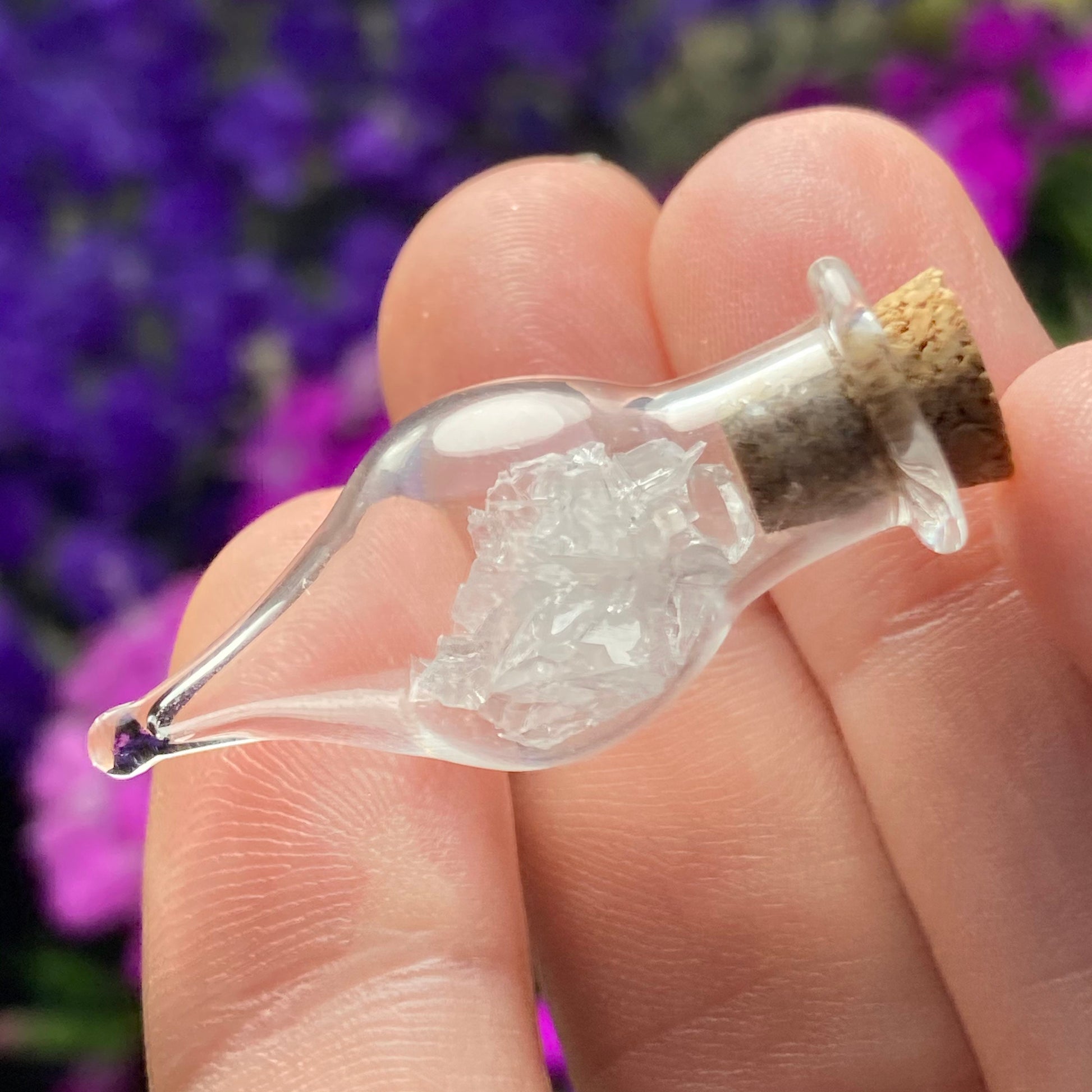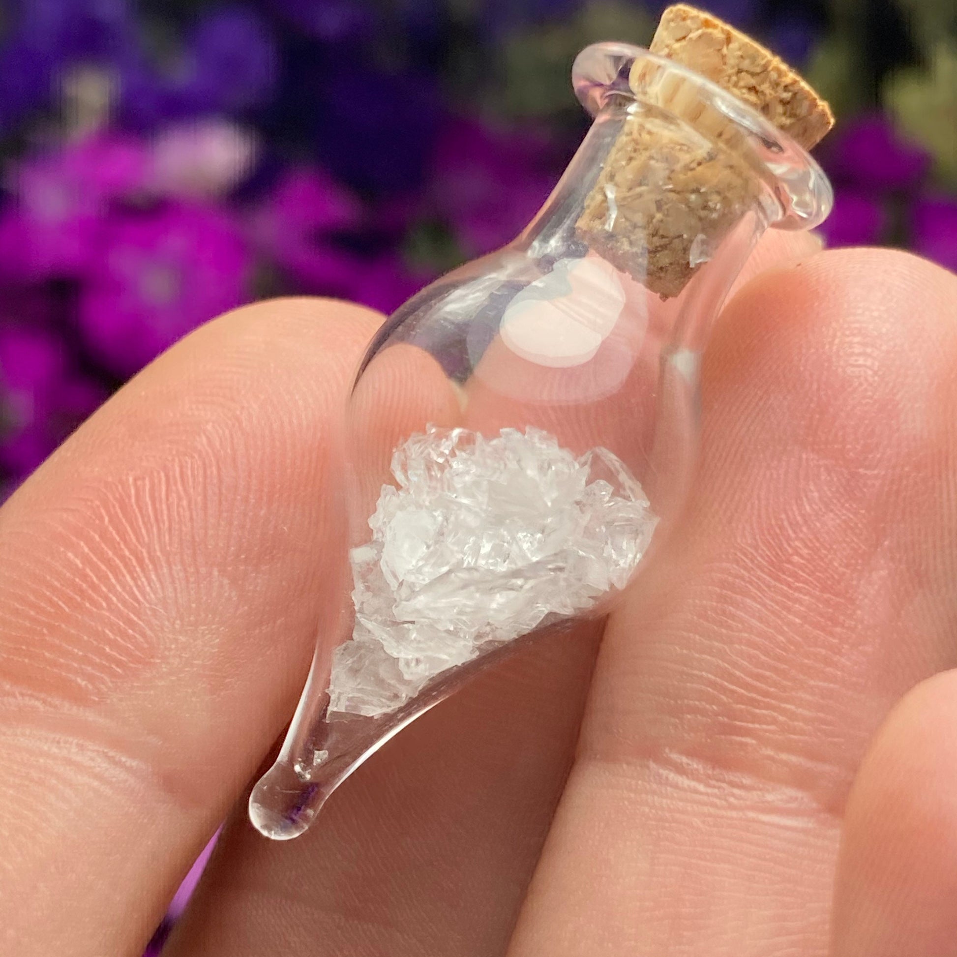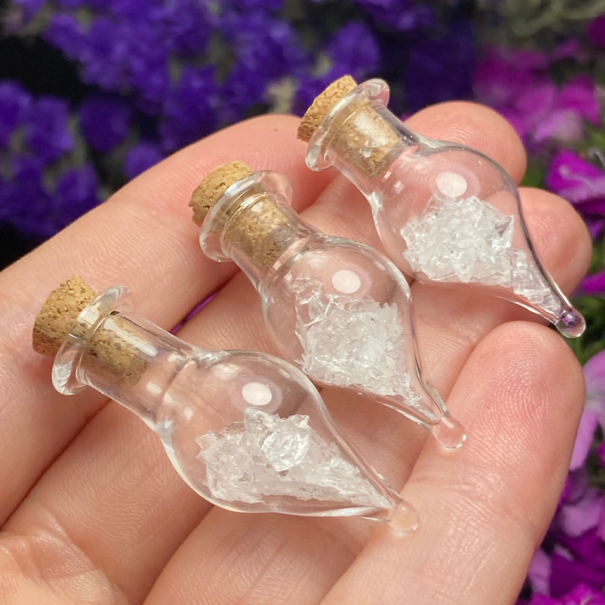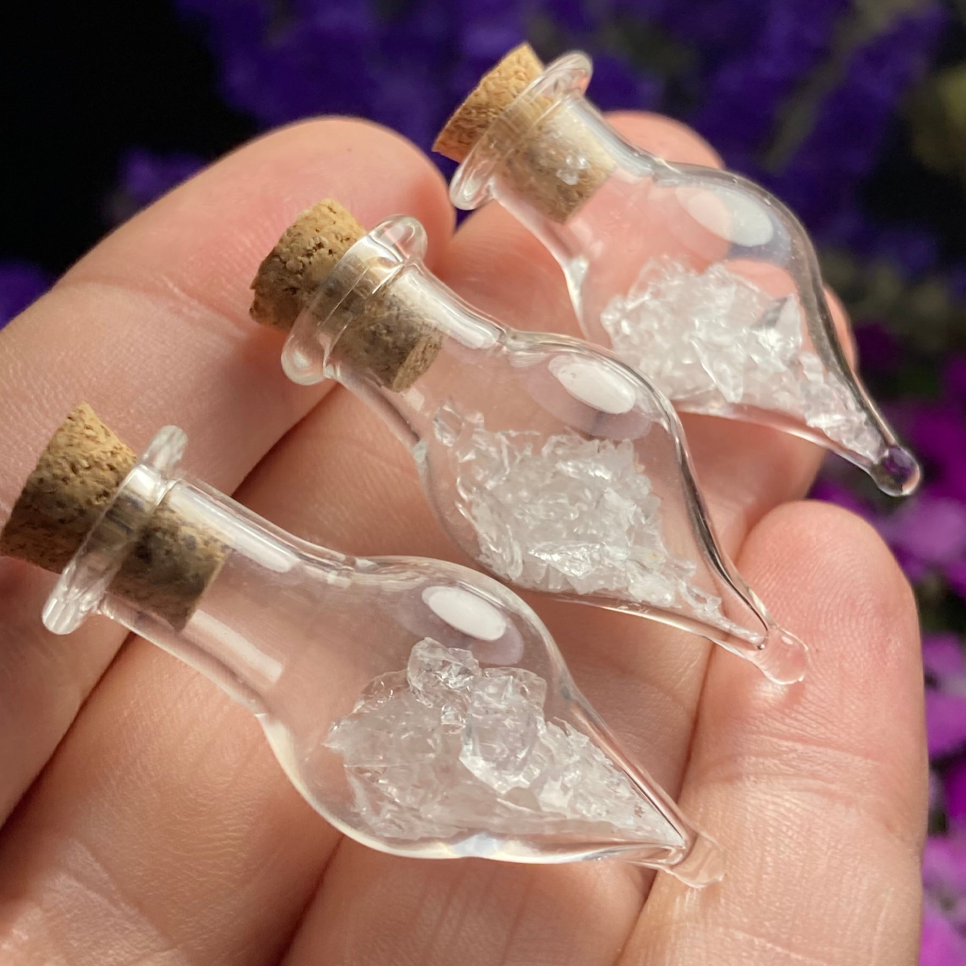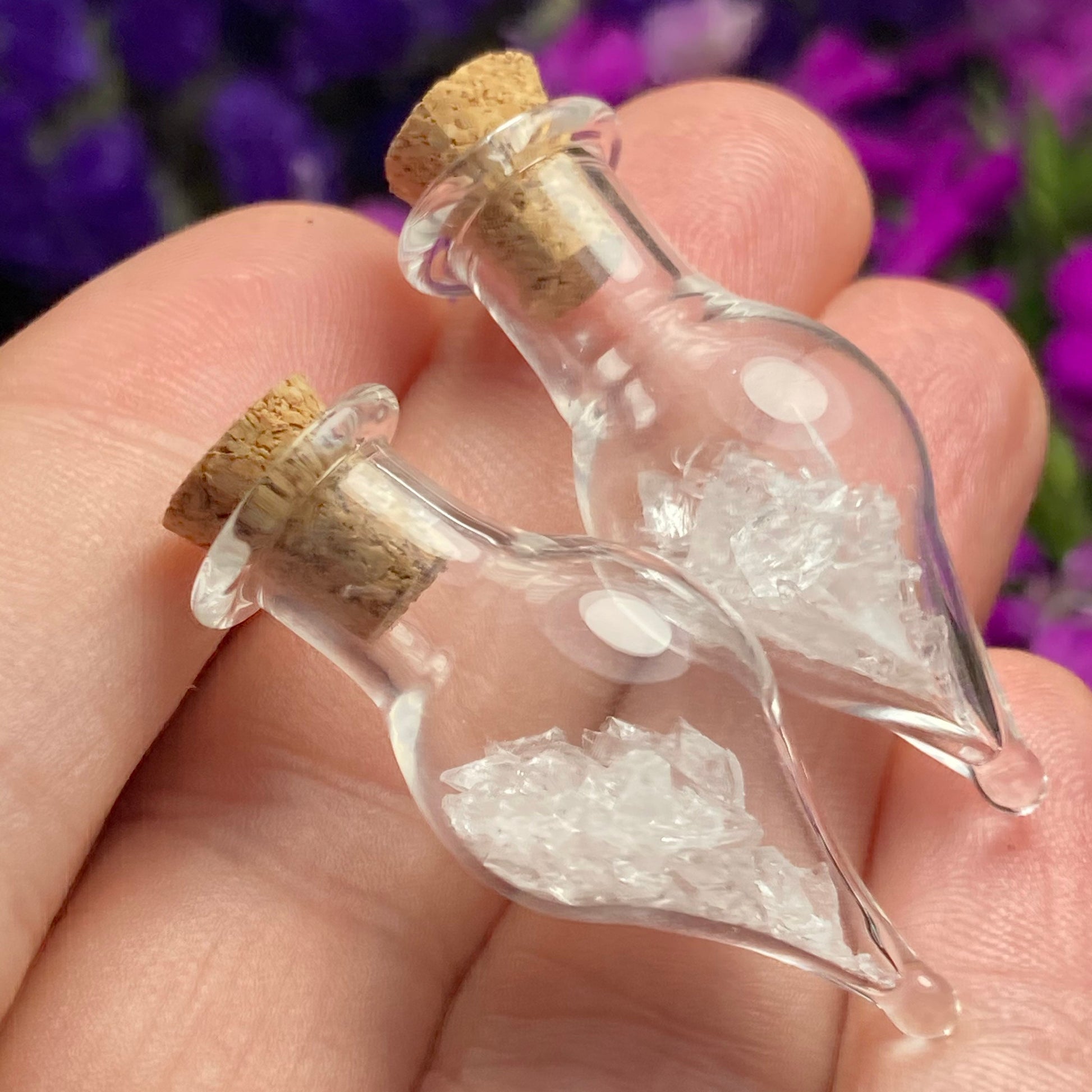 This listing is for ONE (1) Glass Jar with Satyaloka Quartz Chips. These authentic Satyaloka Quartz crystal chips are set into a glass jar and secured with a cork top. The teardrop shaped jars are made of blown glass with a small cork that can be removed to have access to the chips. Each jar measures approximately 30mm by 15mm. *The glass jars are fragile and should be handled with care!