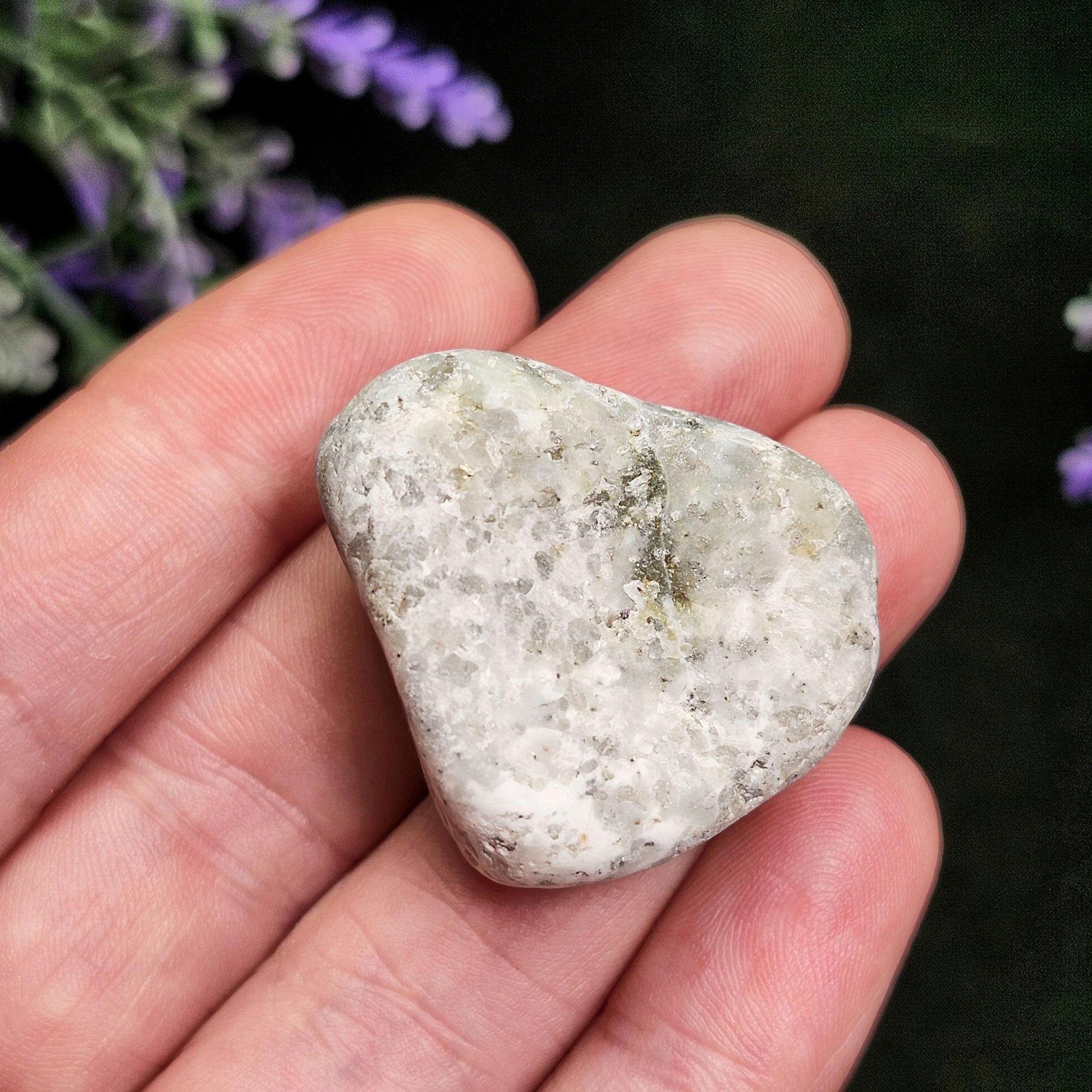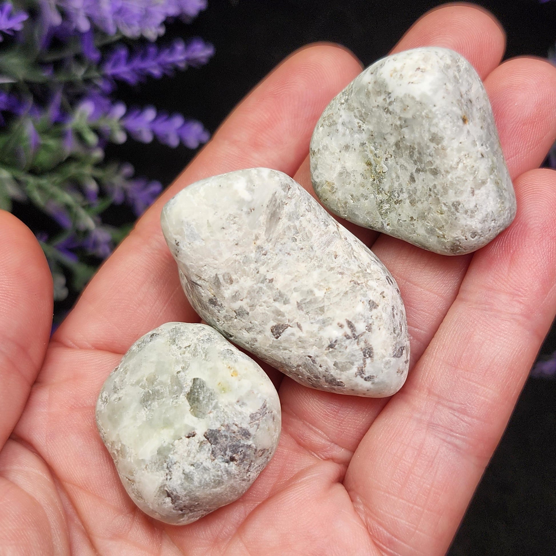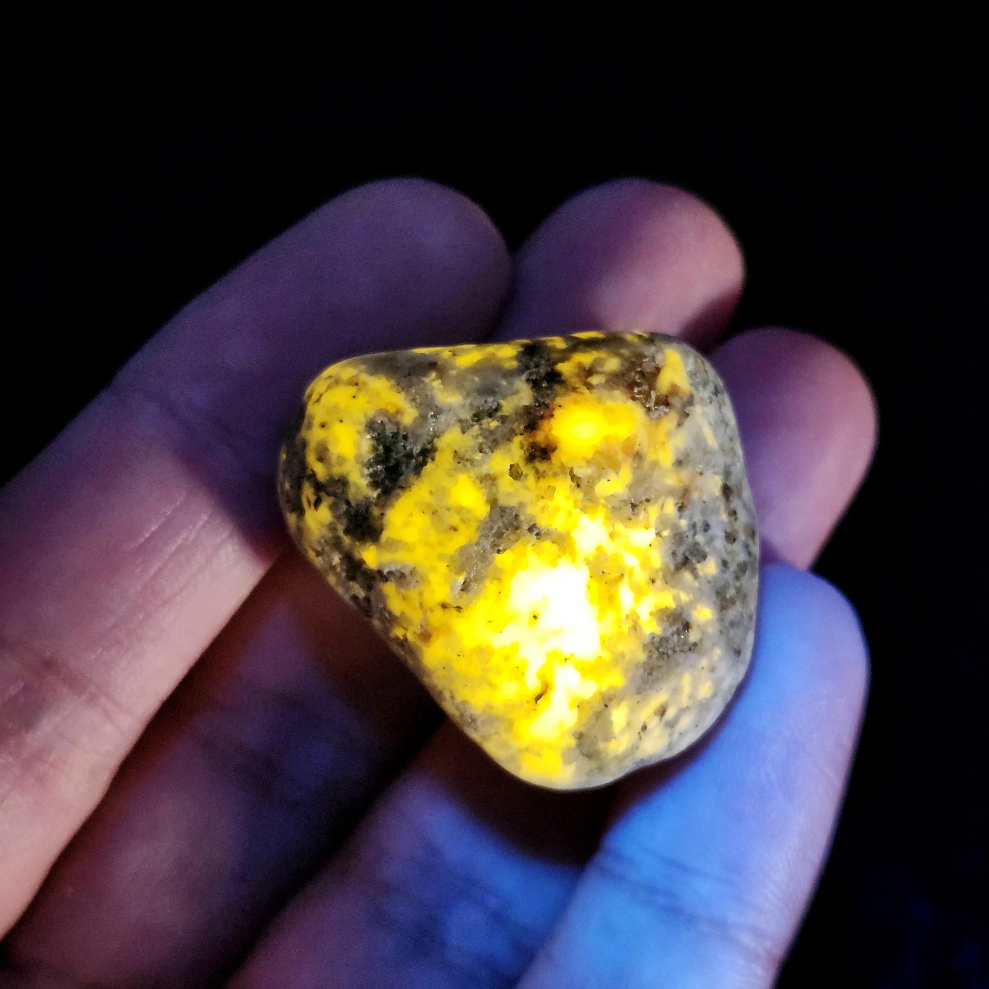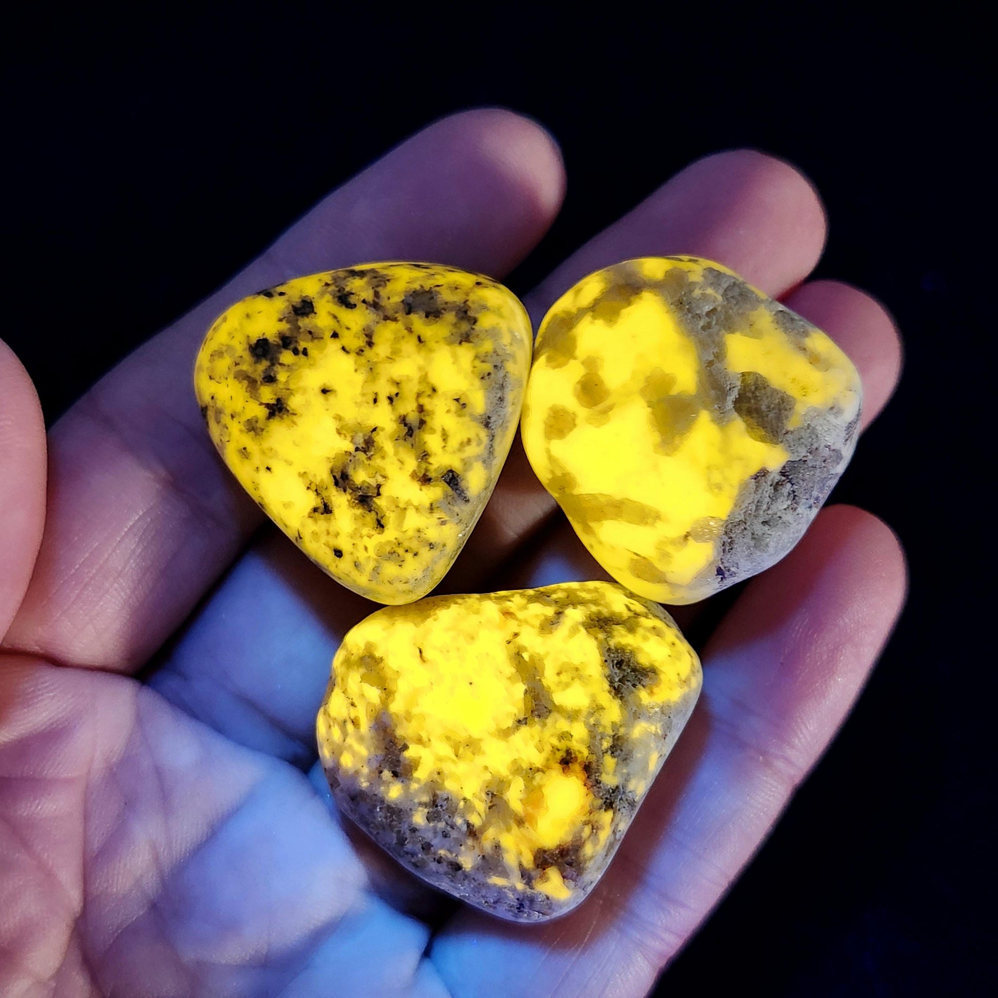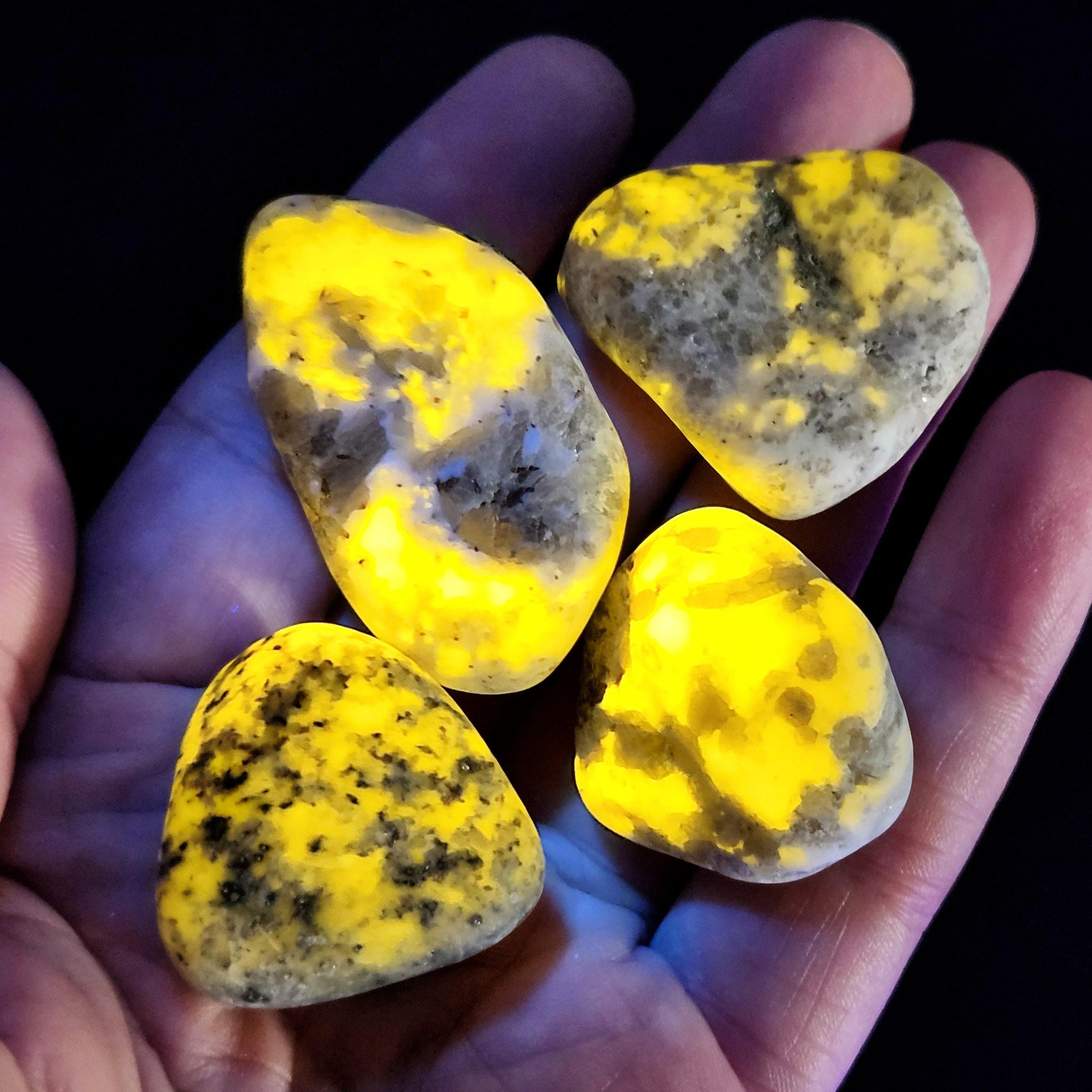 These Norwegian Scapolite specimens have freeform shapes that have been tumbled to a smooth polish. They showcase a range of grey tones in normal lighting and glow with a colorful, saturated brilliance when under a black light - a rare quality in the mineral kingdom! With bright yellow hues, these Scandinavian crystals have a strong UV reactivity. Each specimen weighs between 20 grams and 30 grams.