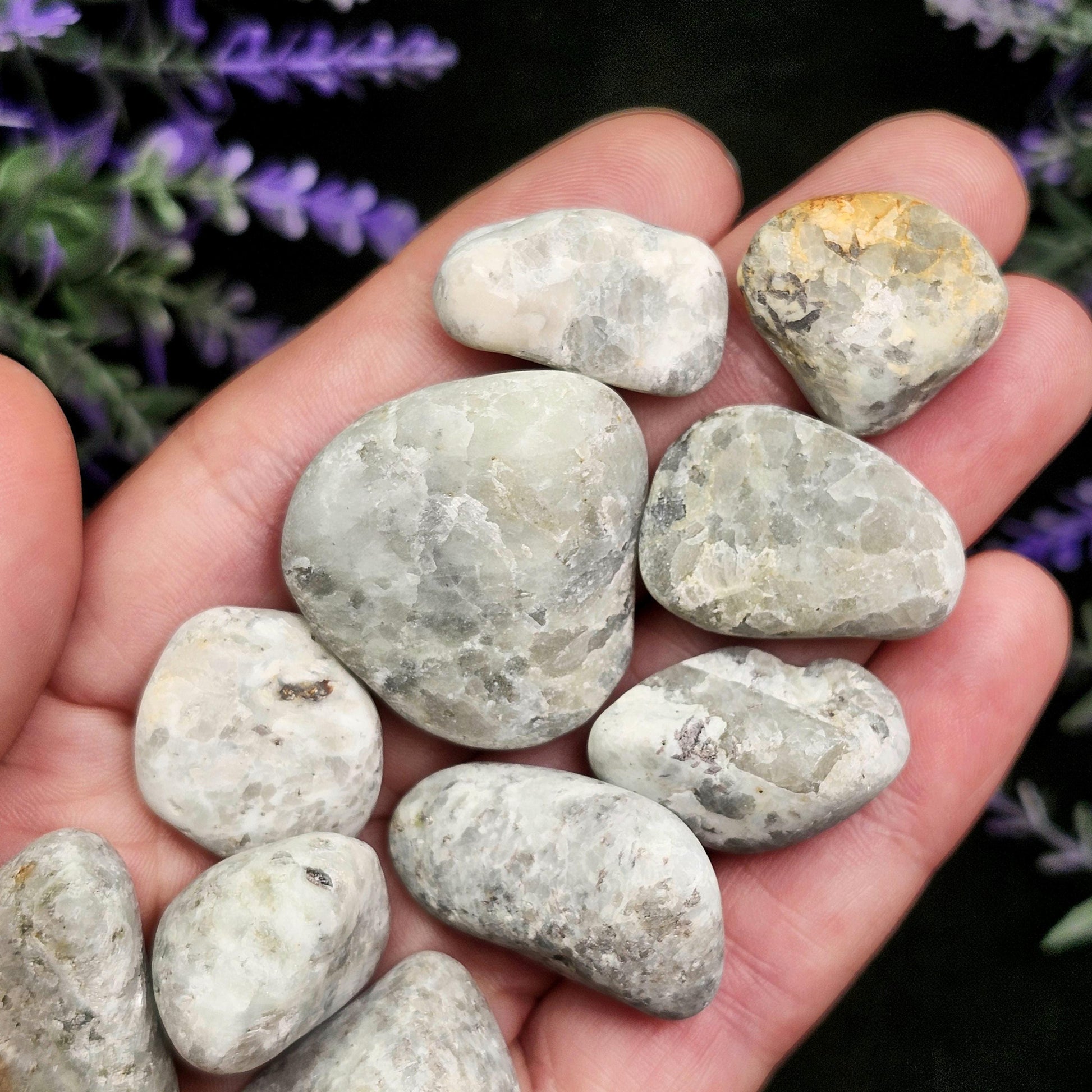 These Norwegian Scapolite specimens have freeform shapes that have been tumbled to a smooth polish. They showcase a range of grey tones in normal lighting and glow with a colorful, saturated brilliance when under a black light - a rare quality in the mineral kingdom! With bright yellow hues, these Scandinavian crystals have a strong UV reactivity.
