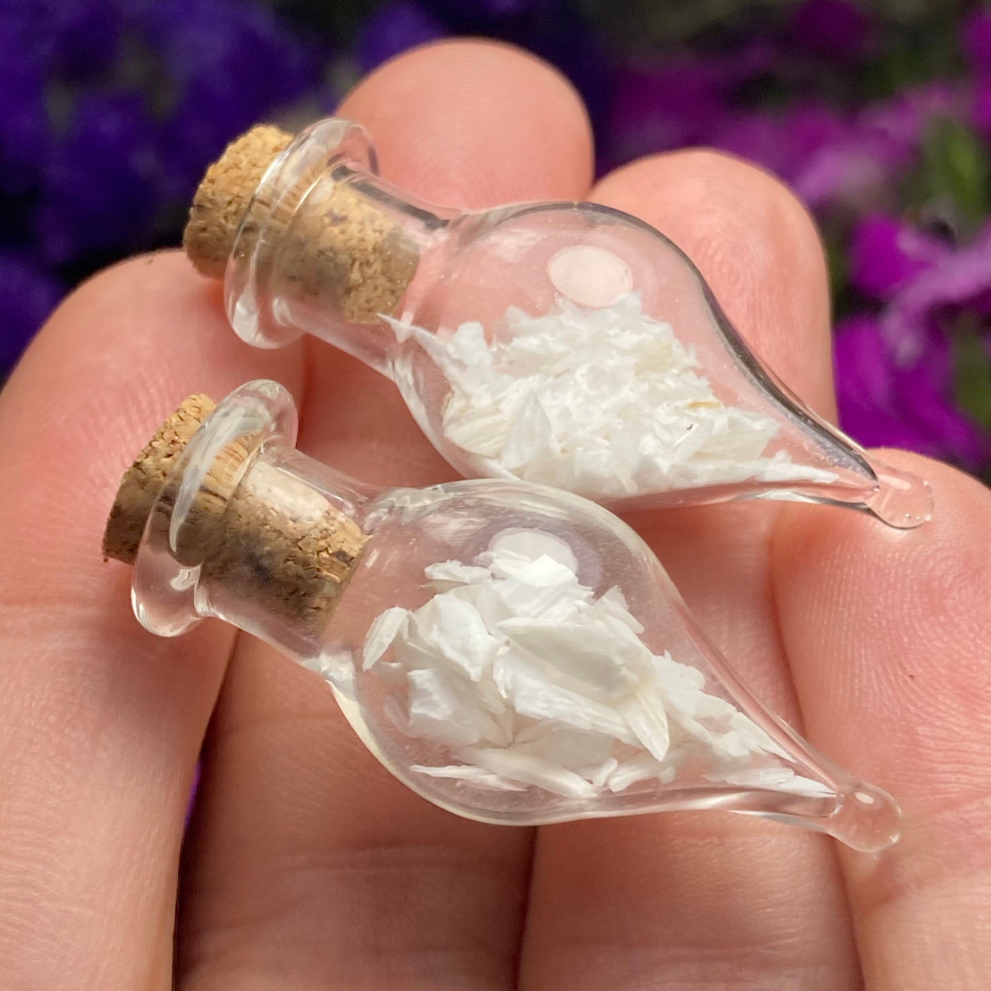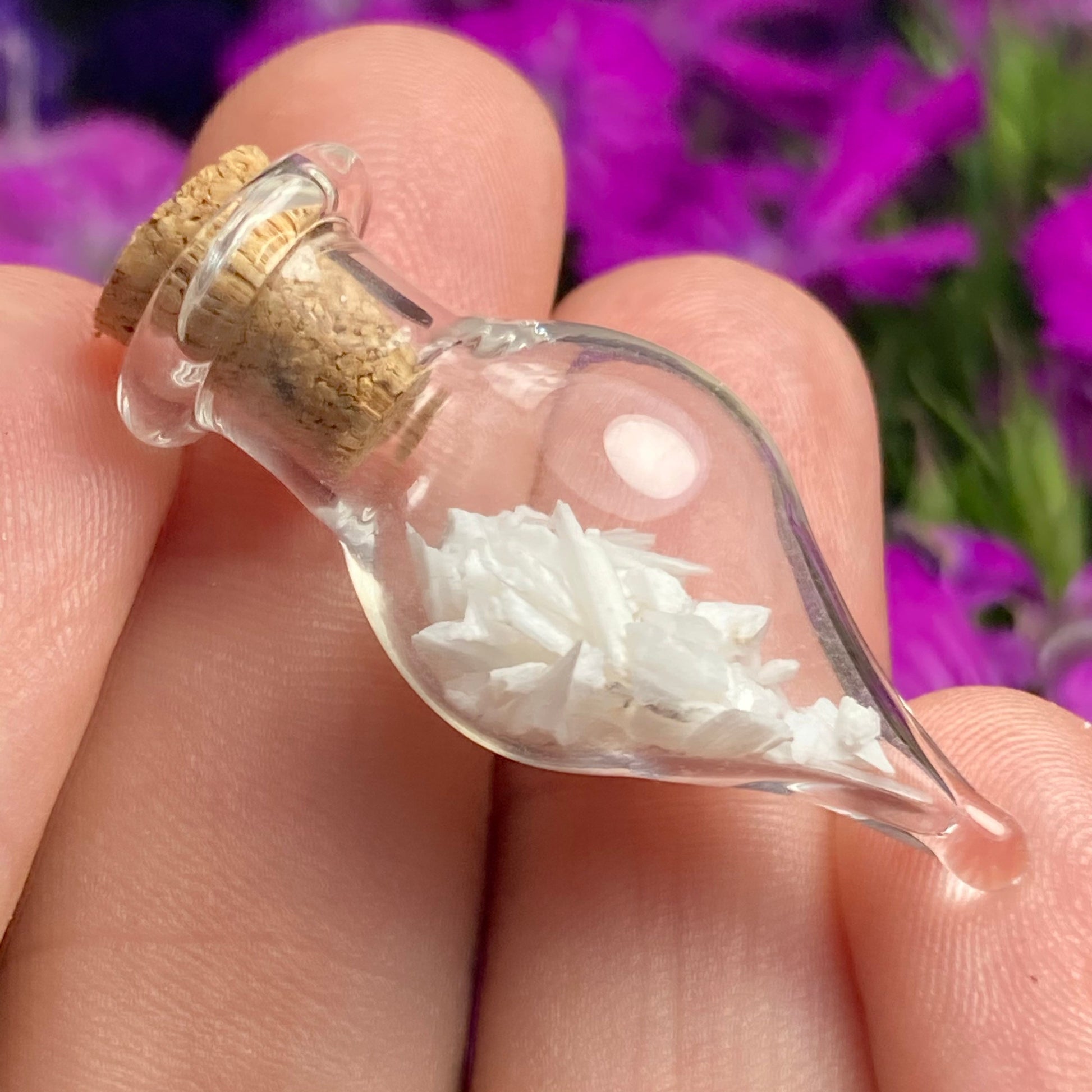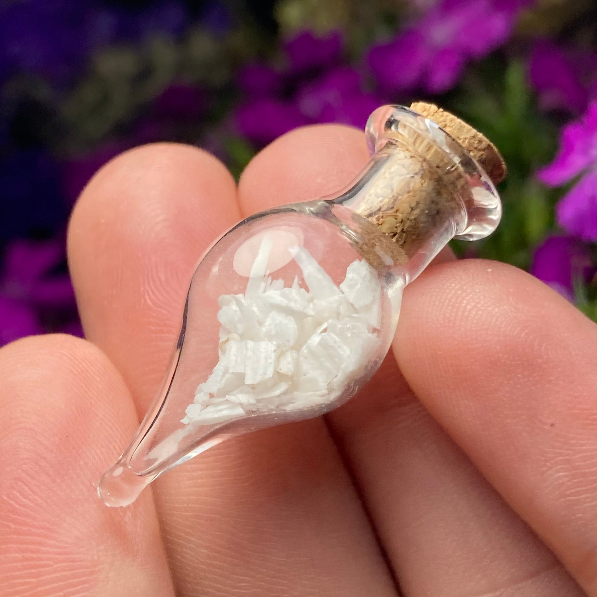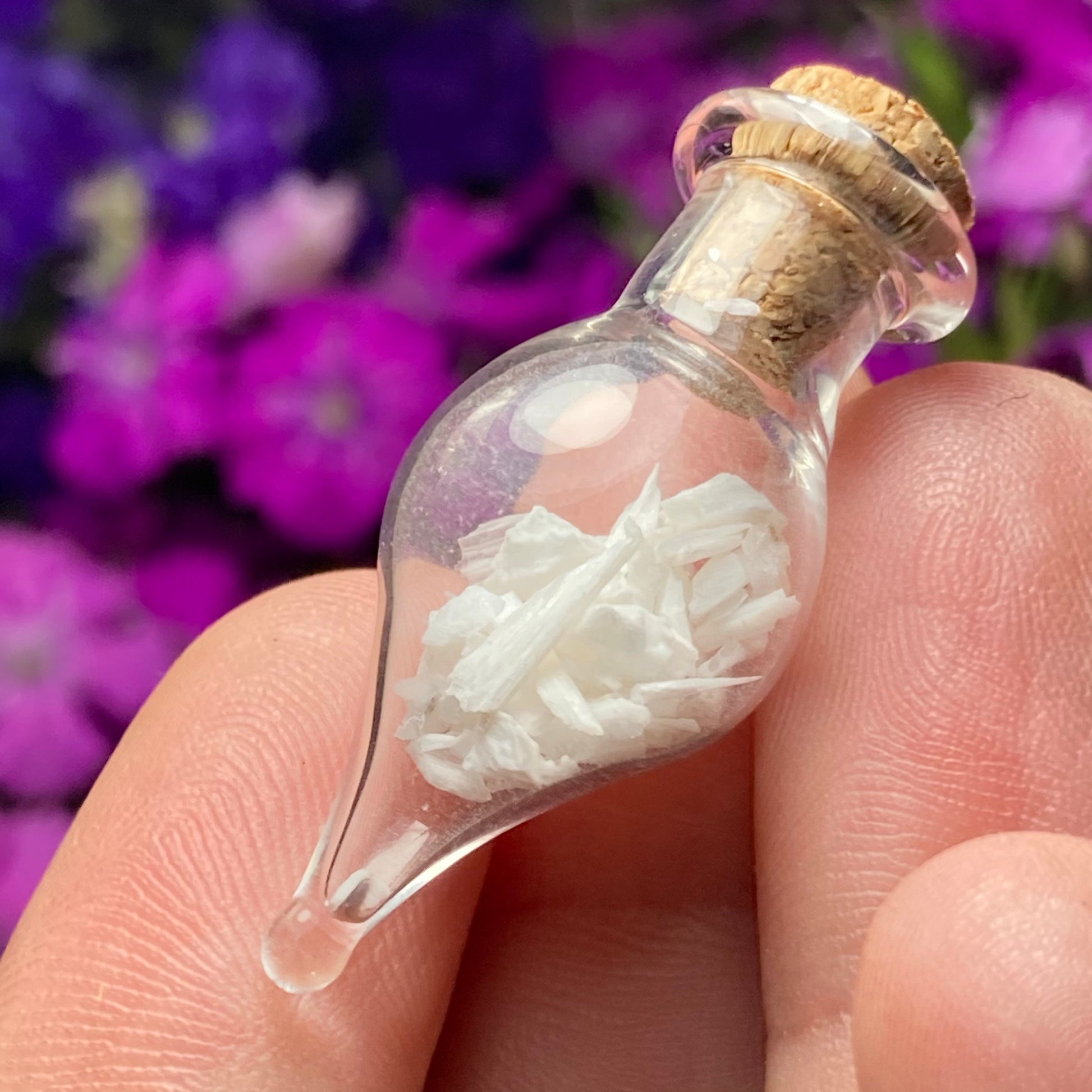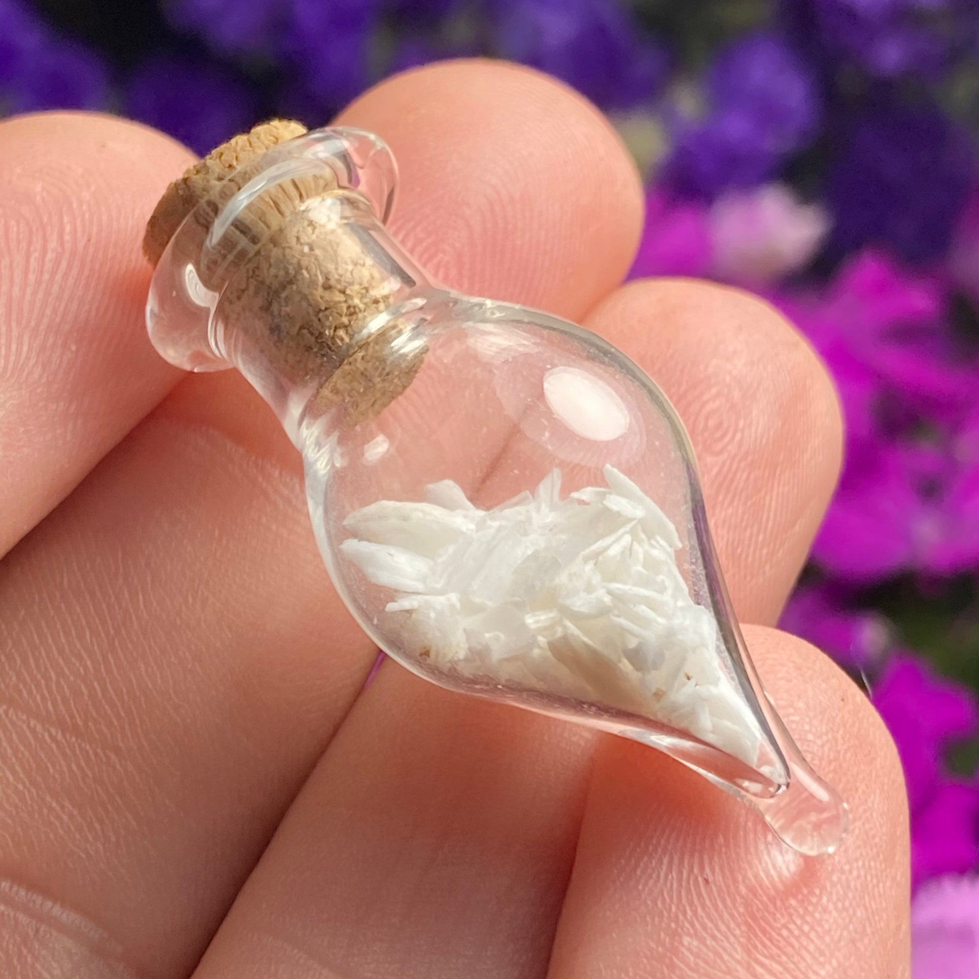 This listing is for ONE (1) Glass Jar with Scolecite Chips. These authentic Scolecite crystal chips are set into a glass jar and secured with a cork top. The teardrop shaped jars are made of blown glass with a small cork that can be removed to have access to the chips. Each jar measures approximately 30mm by 15mm. *The glass jars are fragile and should be handled with care!