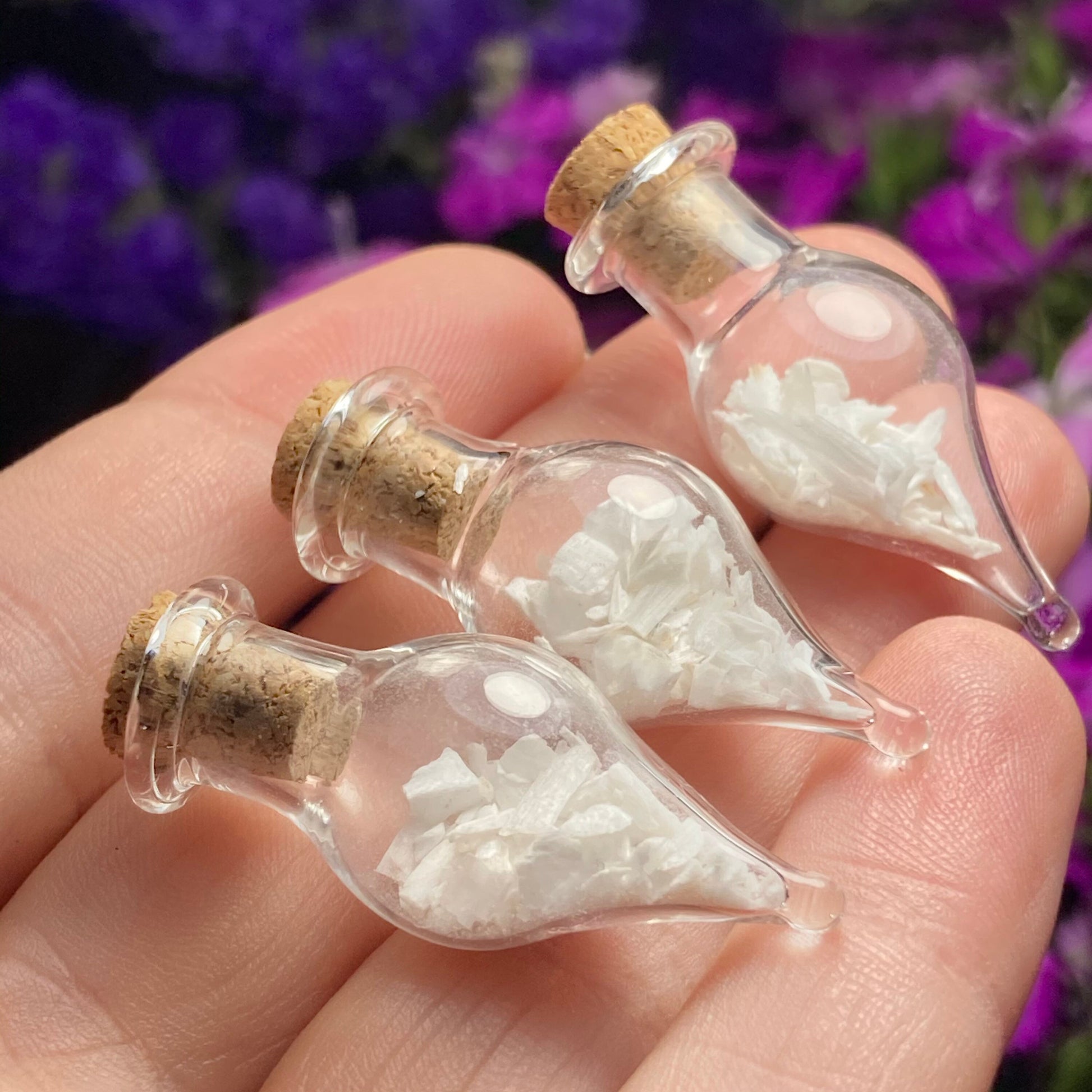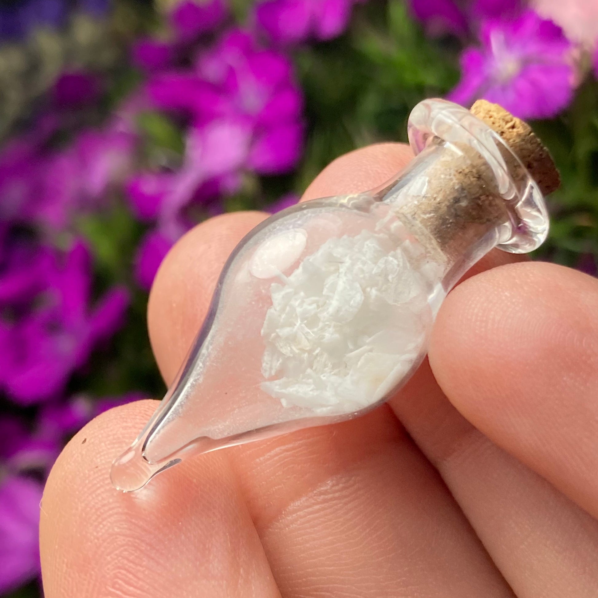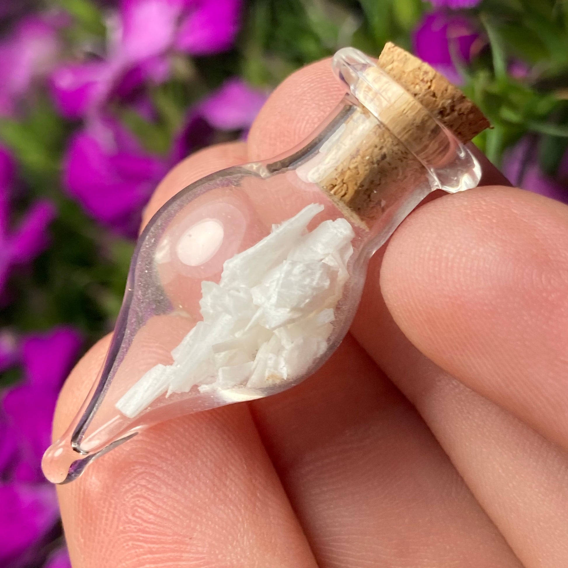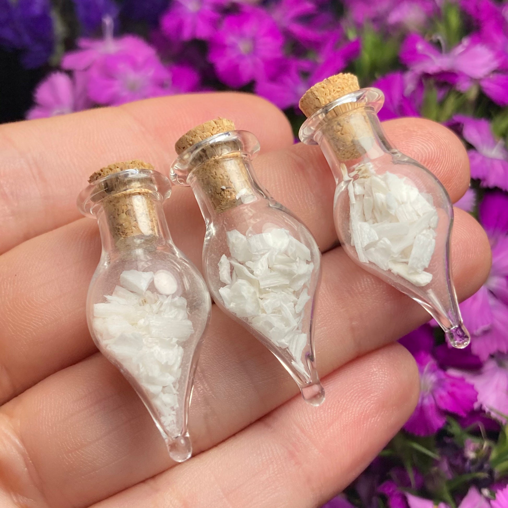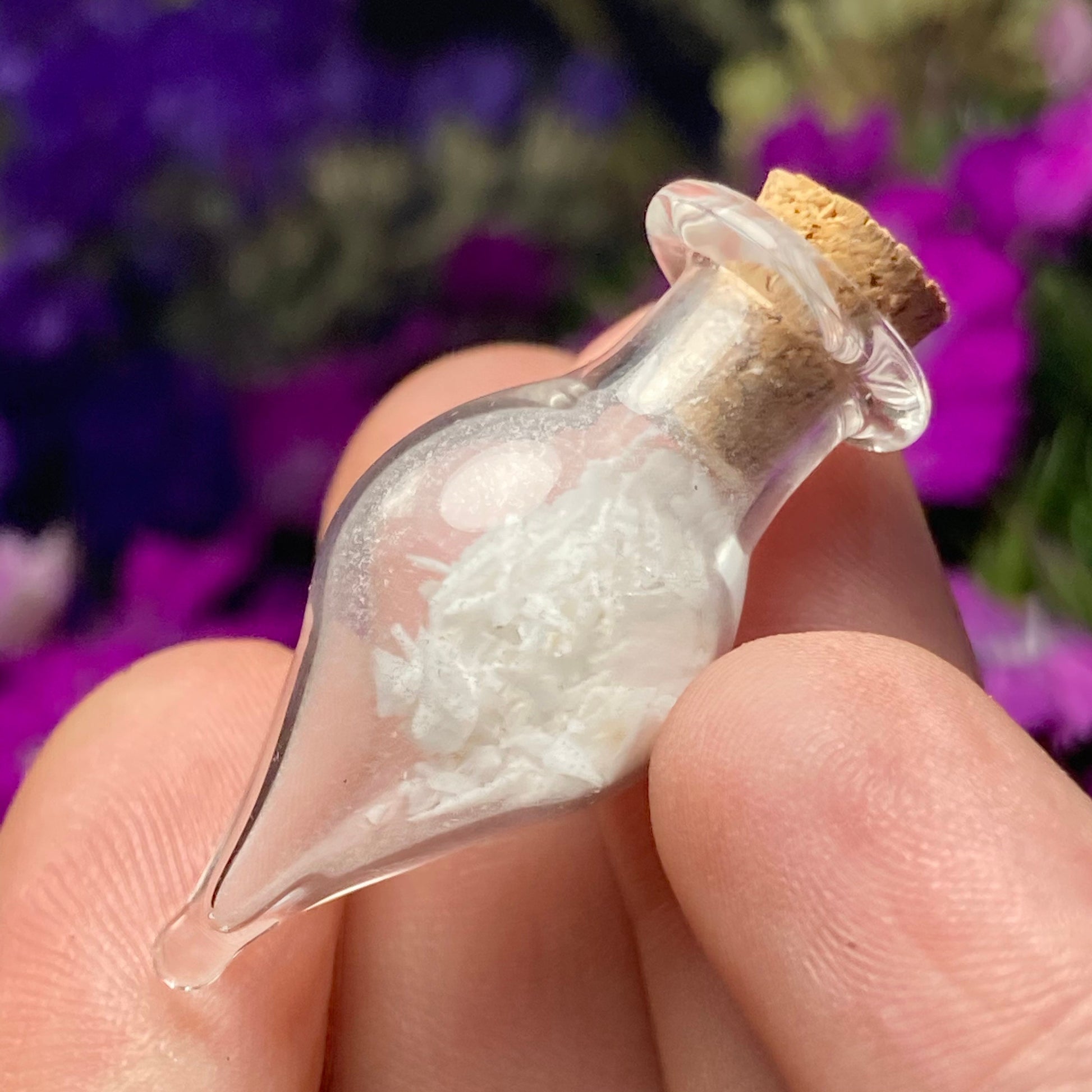 This listing is for ONE (1) Glass Jar with Scolecite Chips. These authentic Scolecite crystal chips are set into a glass jar and secured with a cork top. The teardrop shaped jars are made of blown glass with a small cork that can be removed to have access to the chips. Each jar measures approximately 30mm by 15mm. *The glass jars are fragile and should be handled with care!