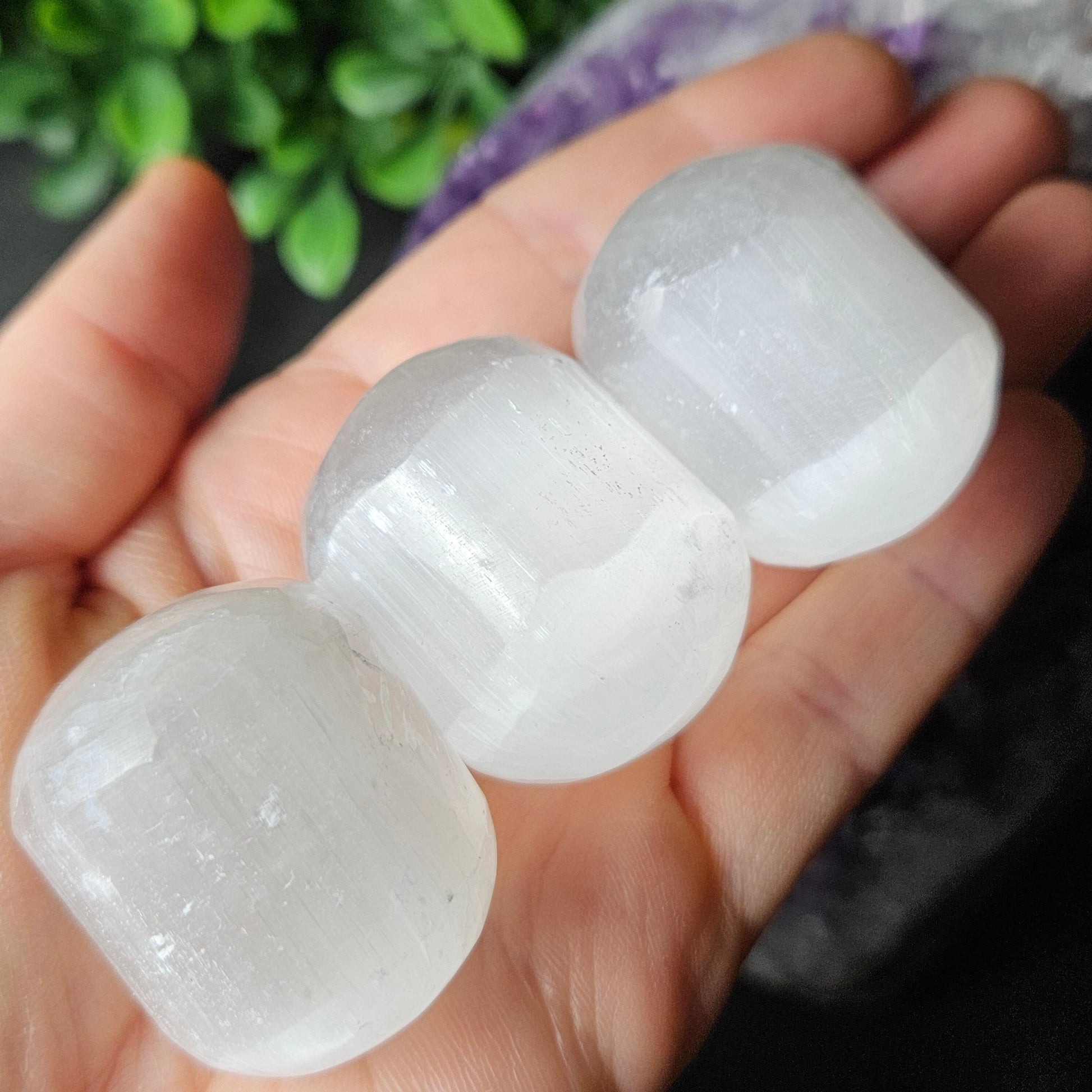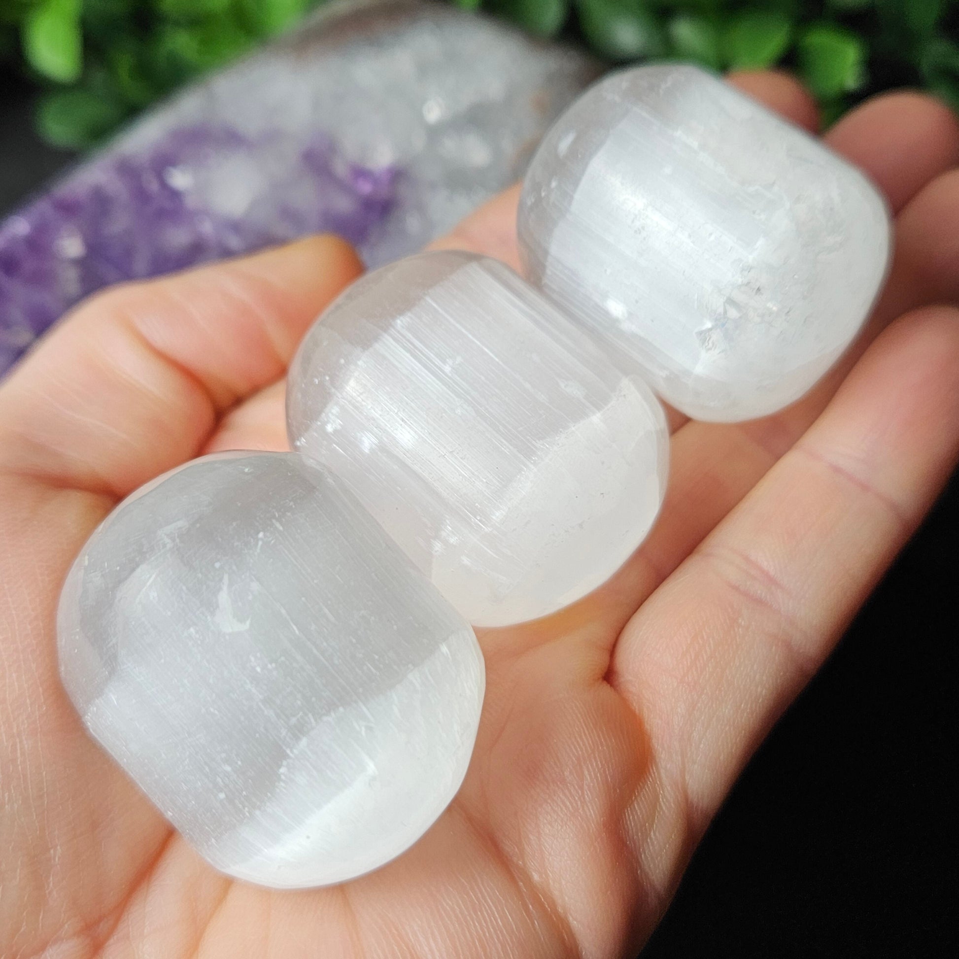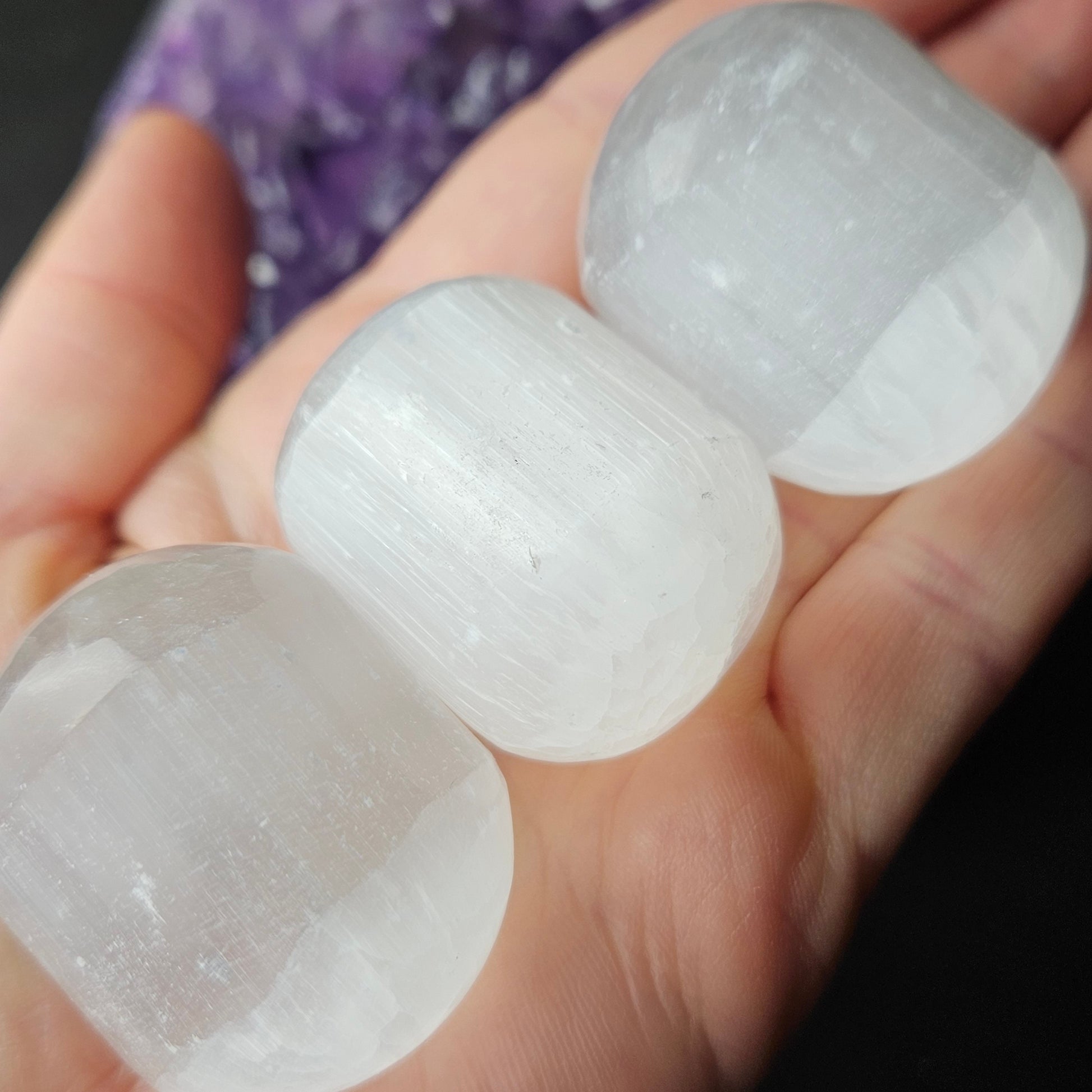 These Selenite crystals have been tumbled to a light polish. They have visible striations and absolutely glow with a bright white translucence. Selenite is a soft stone and can be expected to have small nicks and abrasions due to its fragile nature. Each specimen measures approximately 25mm and up.