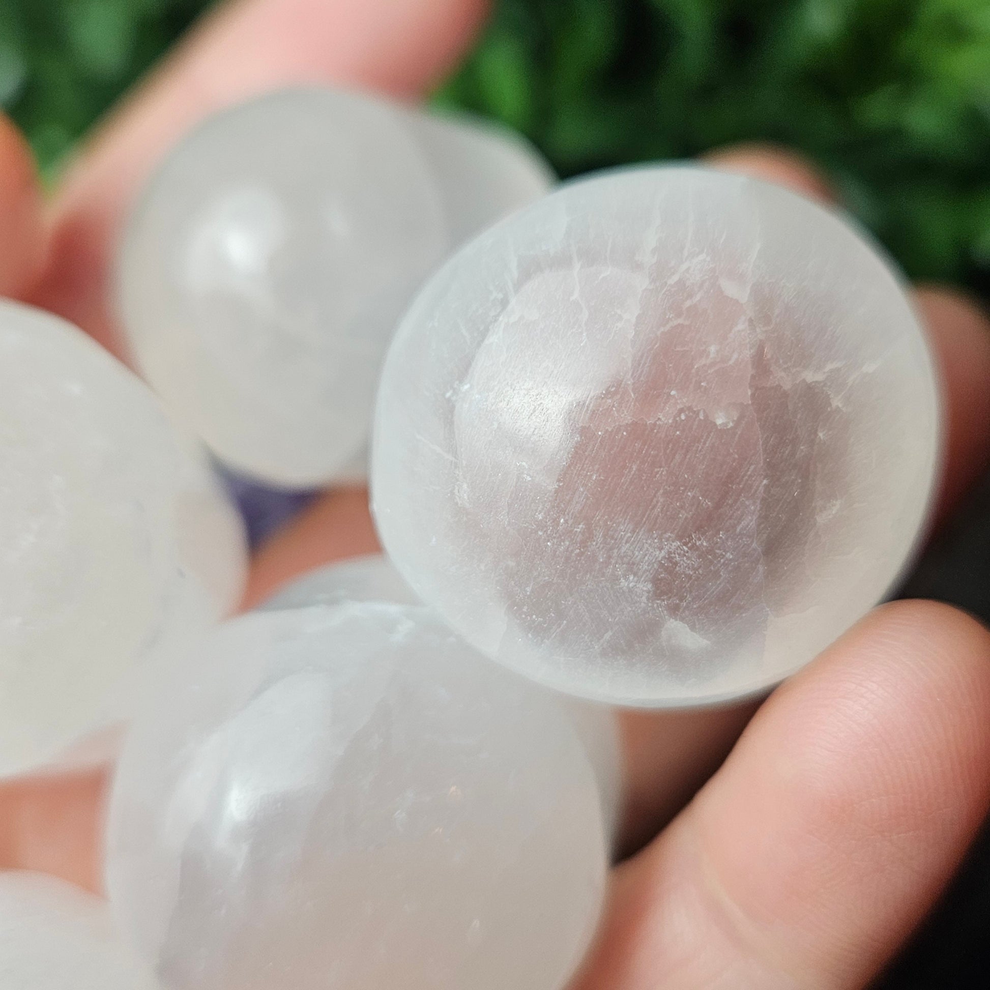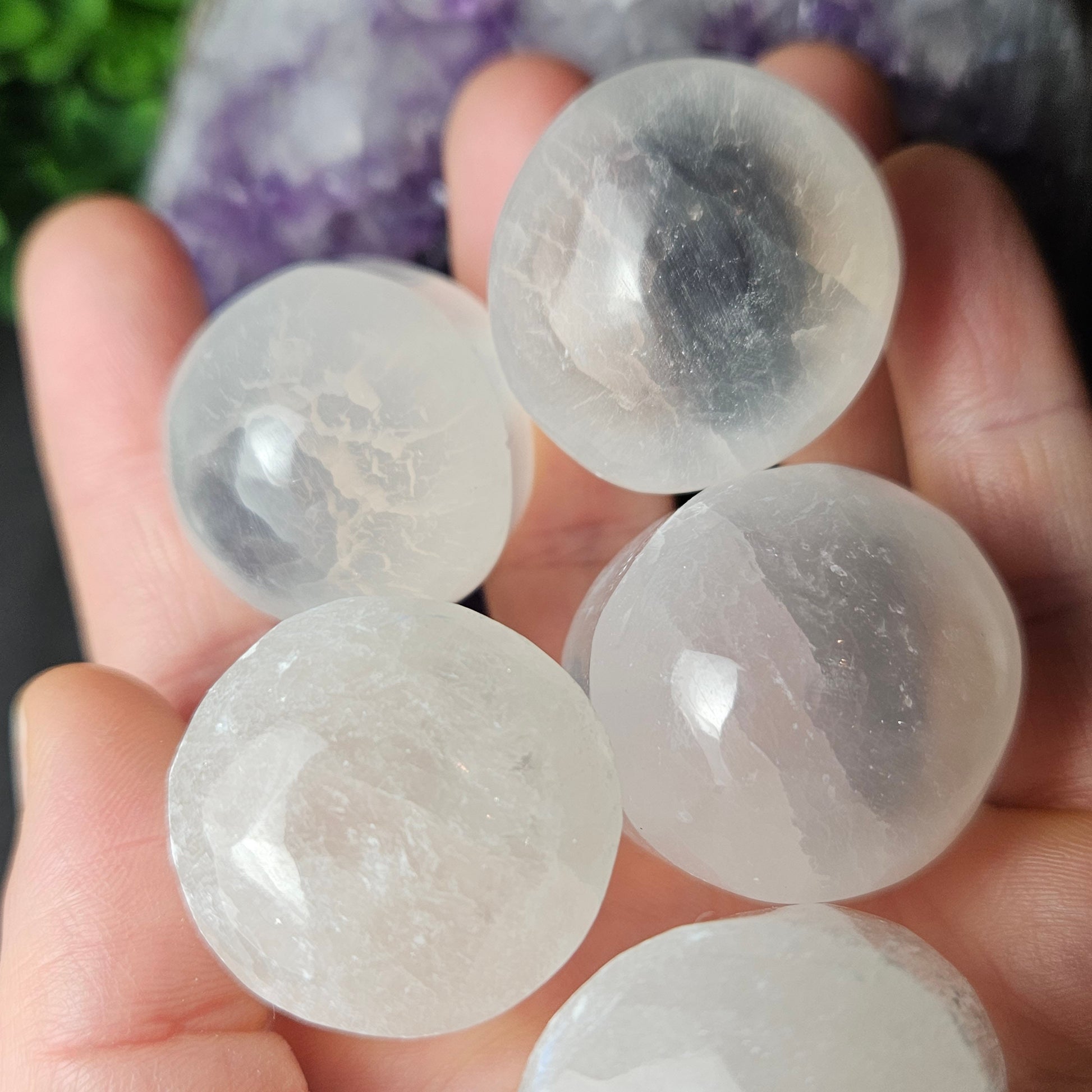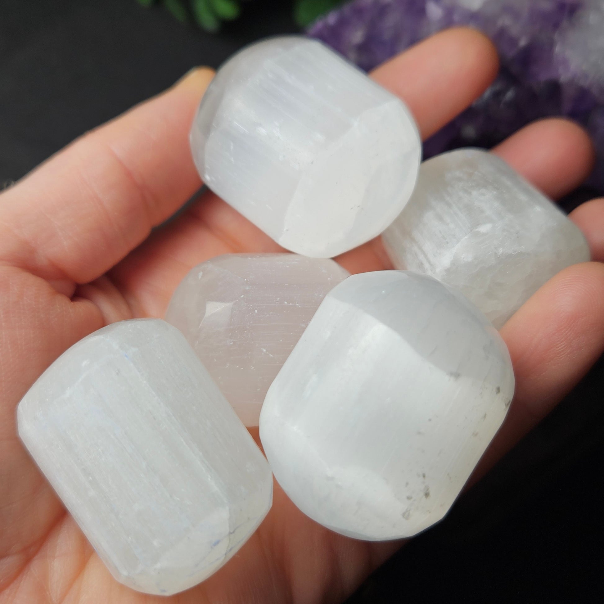 These Selenite crystals have been tumbled to a light polish. They have visible striations and absolutely glow with a bright white translucence. Selenite is a soft stone and can be expected to have small nicks and abrasions due to its fragile nature. Each specimen measures approximately 25mm and up.