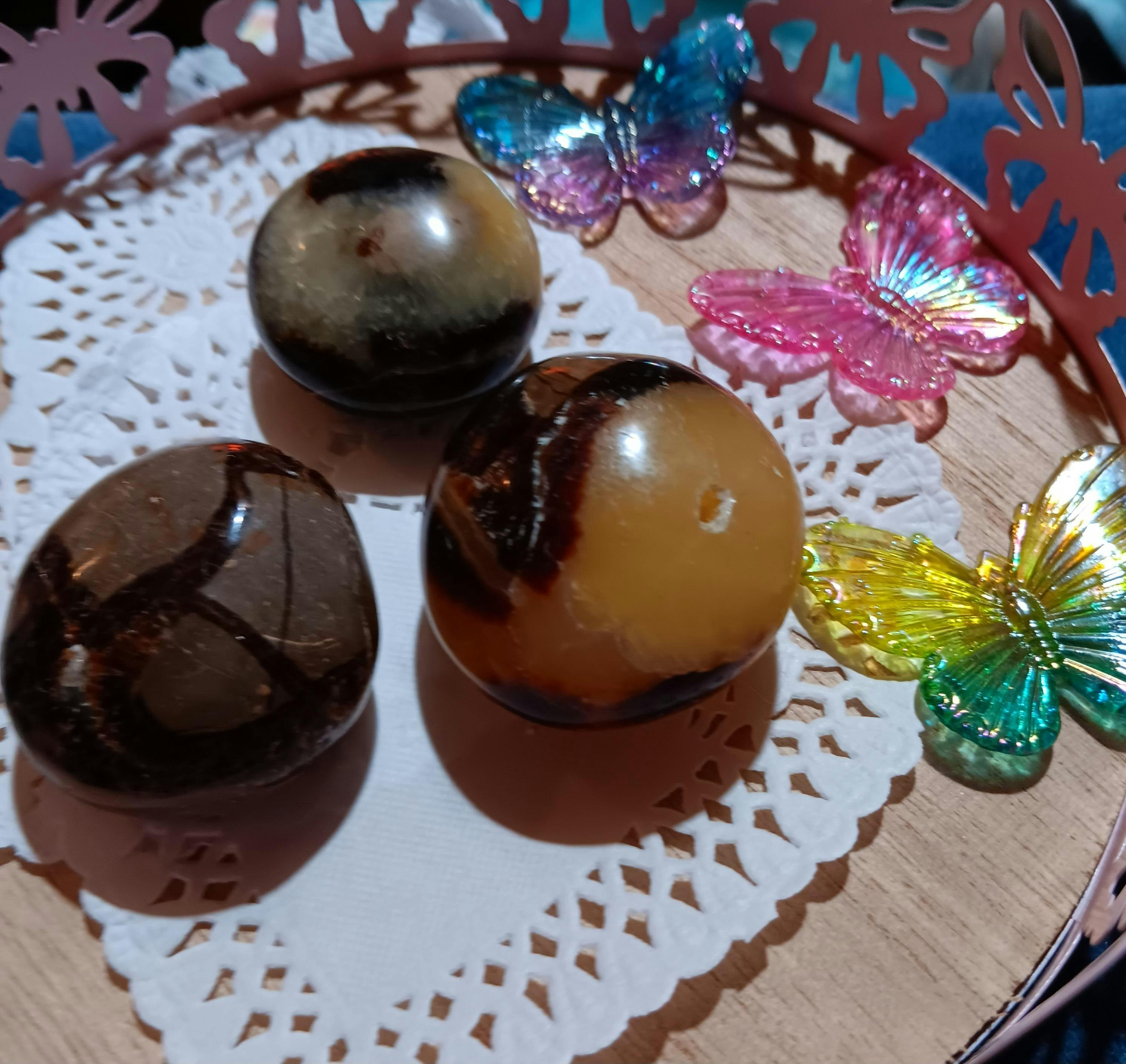 Septarian stone is a blend of yellow calcite, brown aragonite, and limestone that were formed together, with volcanic eruptions that attracted tiny organic sea life to the stone and compressed into nodules. These are sometimes called Thunder Eggs or Dragon Stones. They have a spiritual energy about them, that brings joy and confidence and can often be used for the awakening of kundalini energy. The shapes that are often seen in the nodules of these spiritual stones are 7 pointed.