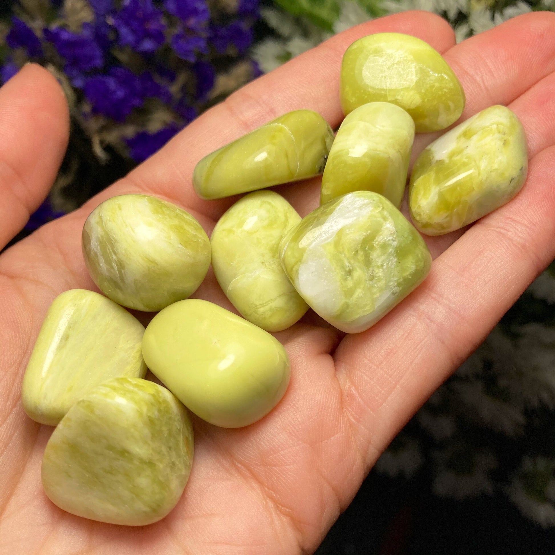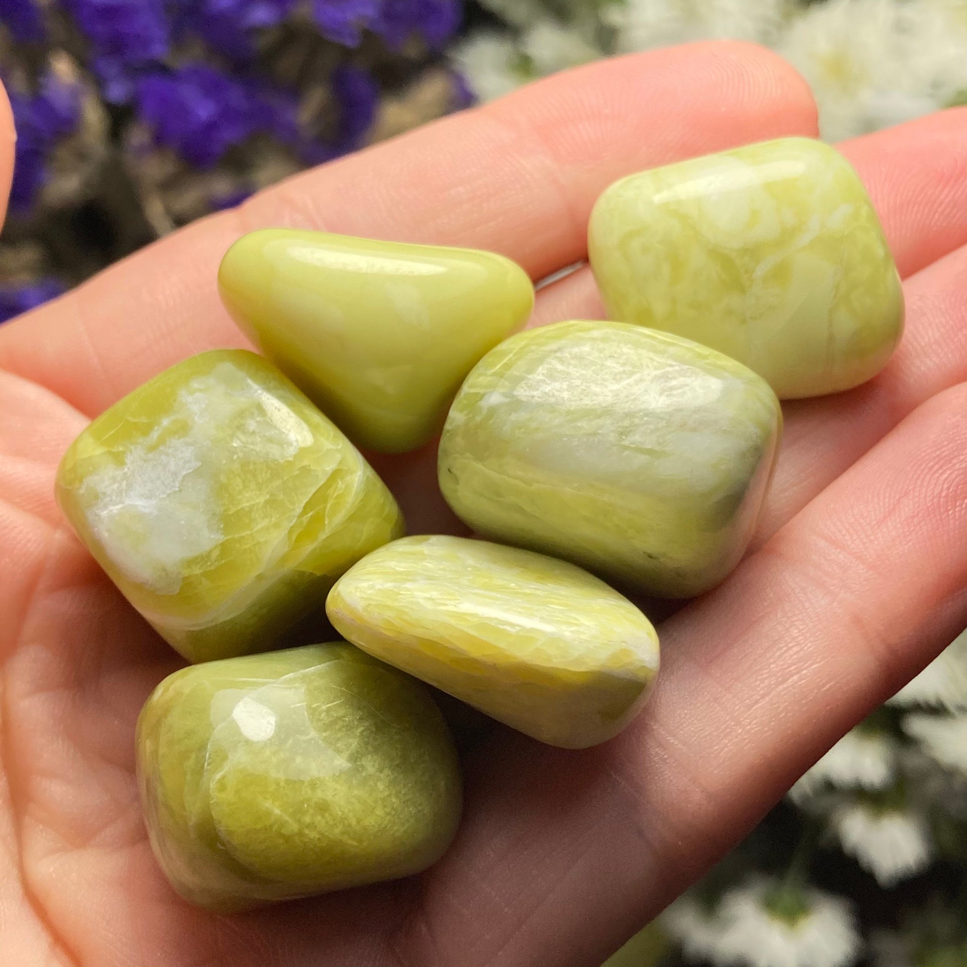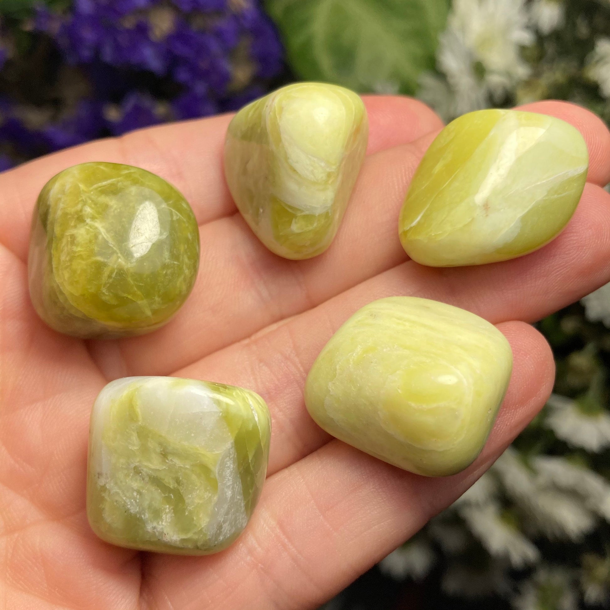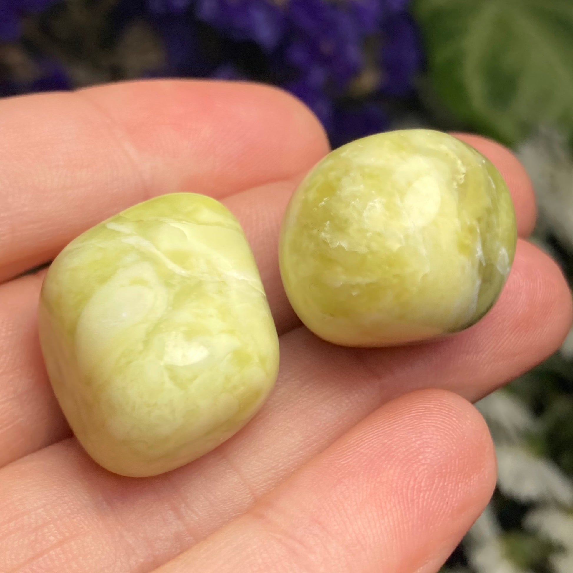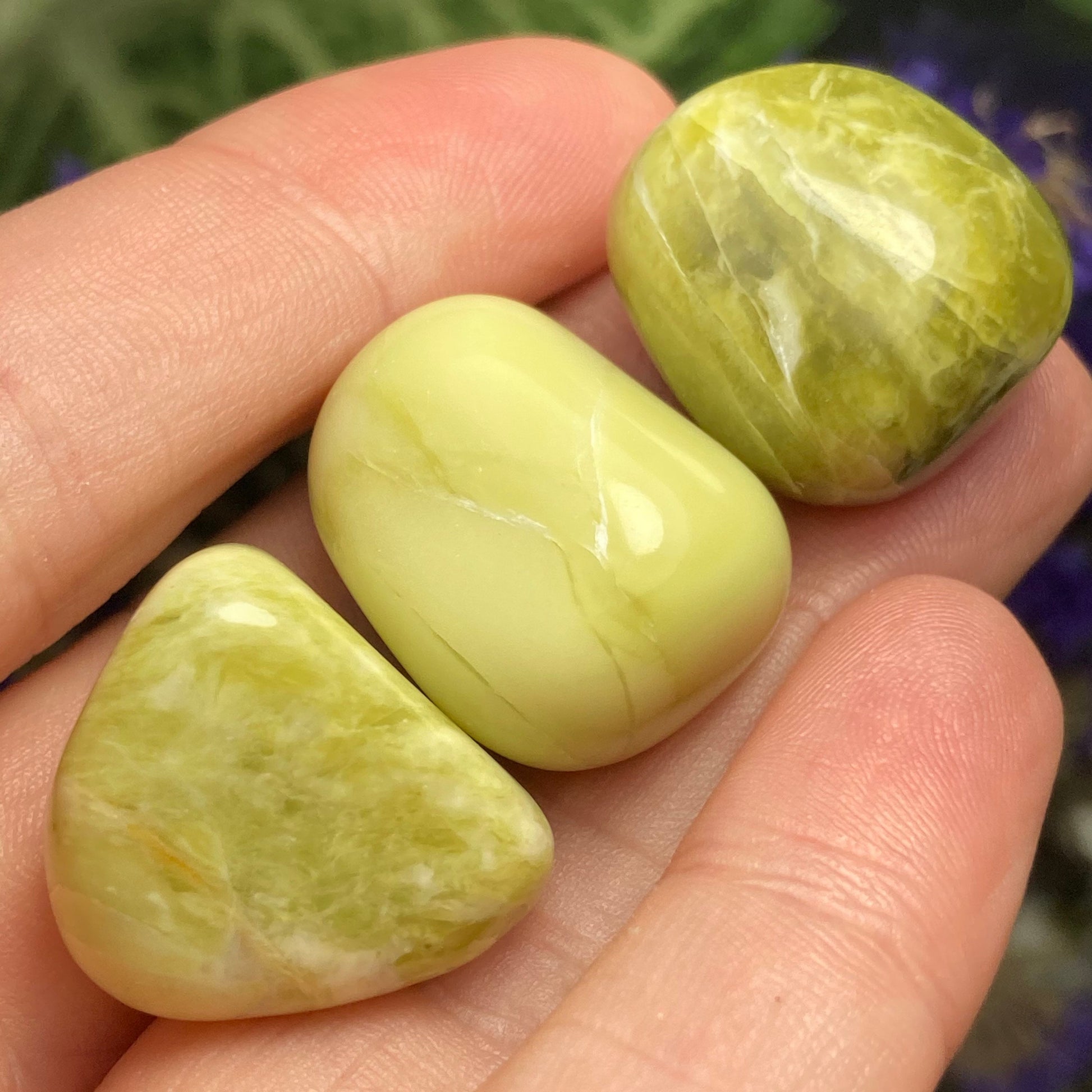 These Serpentine crystals have been tumbled to a high polish. They exhibit a range of shades of green, from chartreuse to apple green.