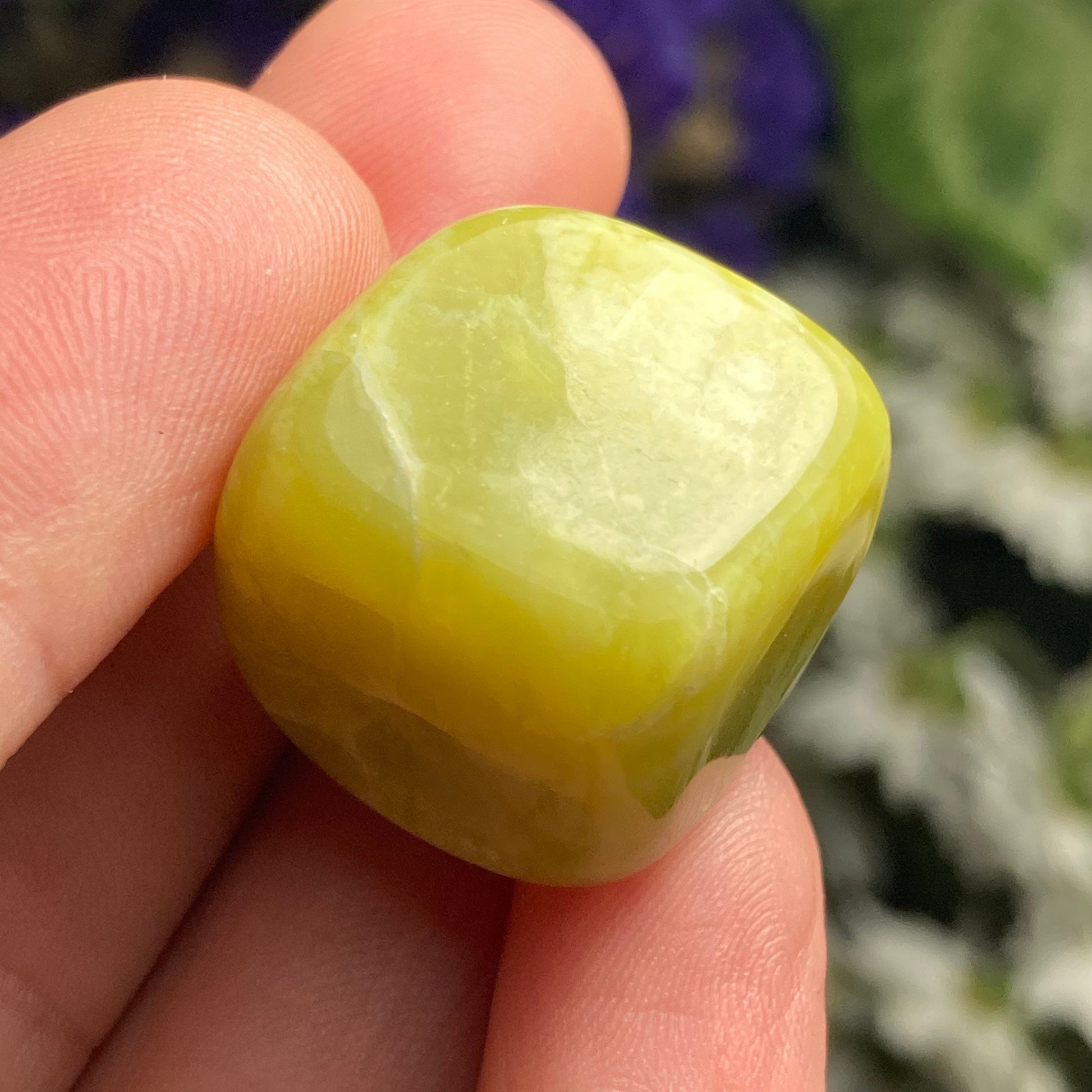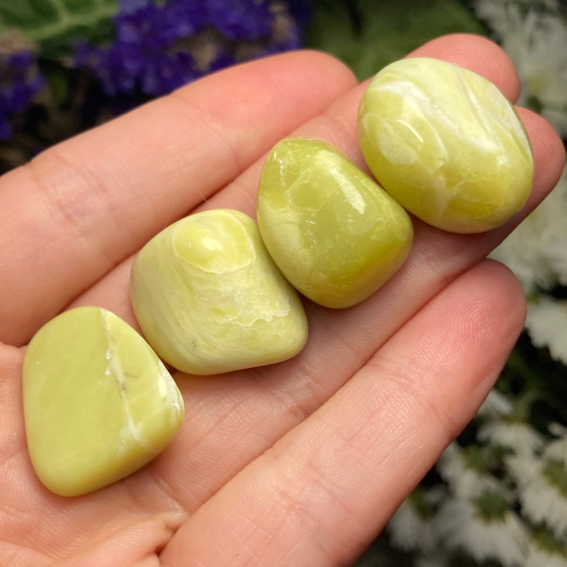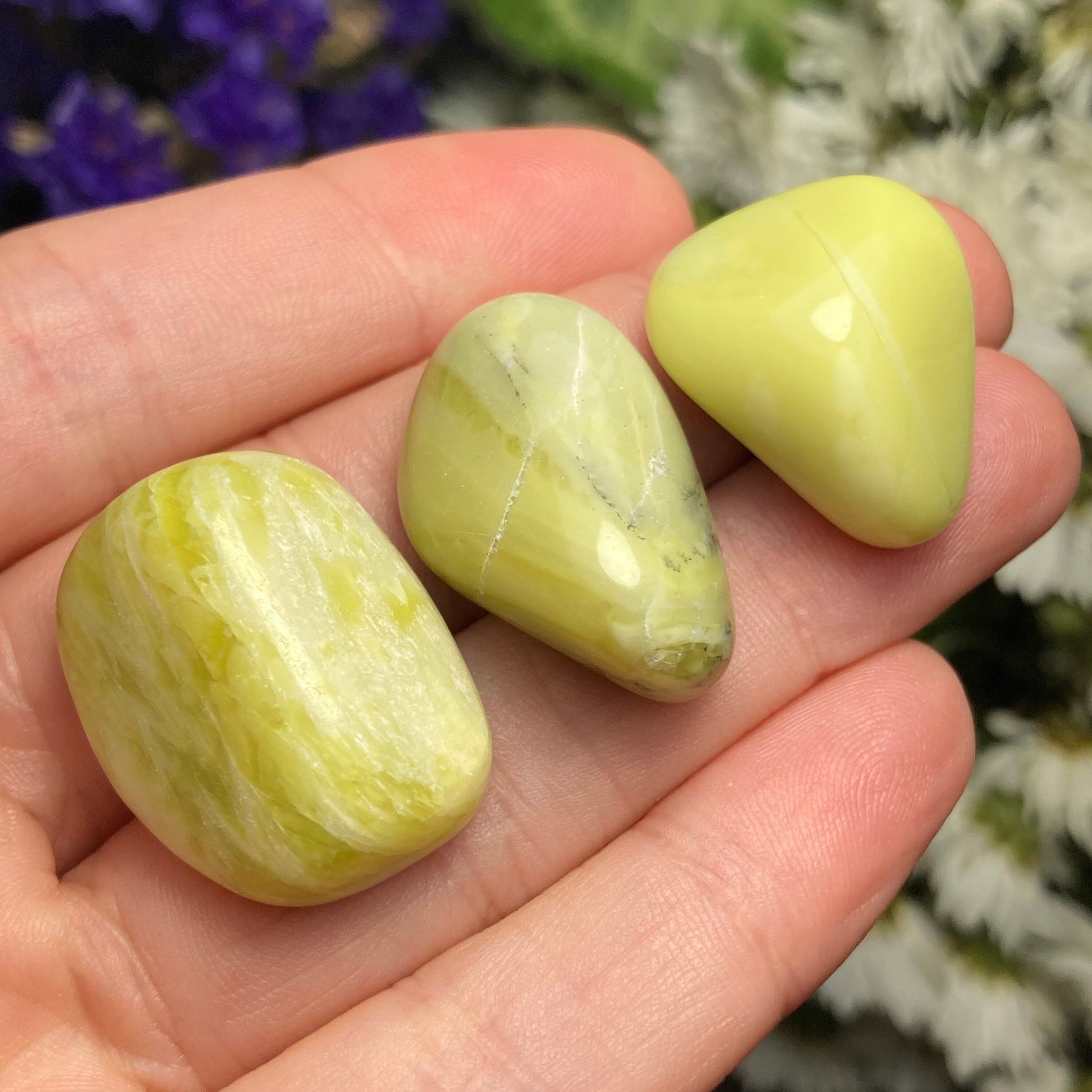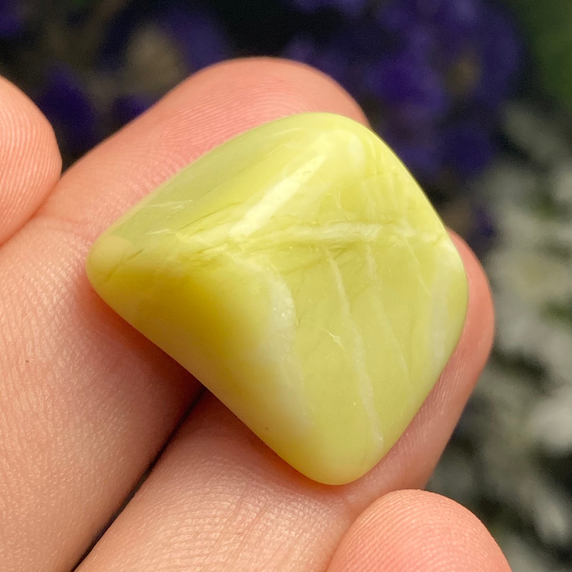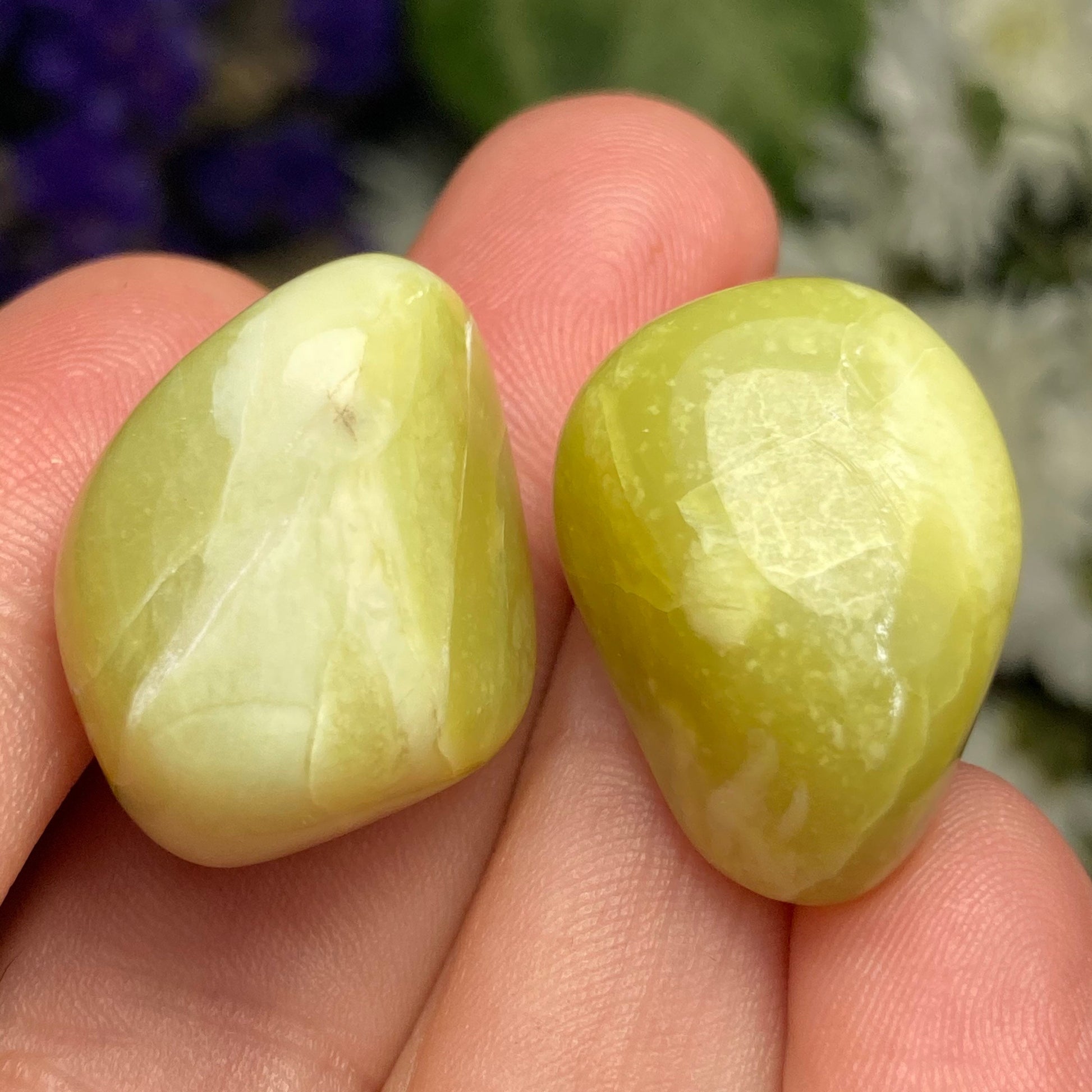 These Serpentine crystals have been tumbled to a high polish. They exhibit a range of shades of green, from chartreuse to apple green.