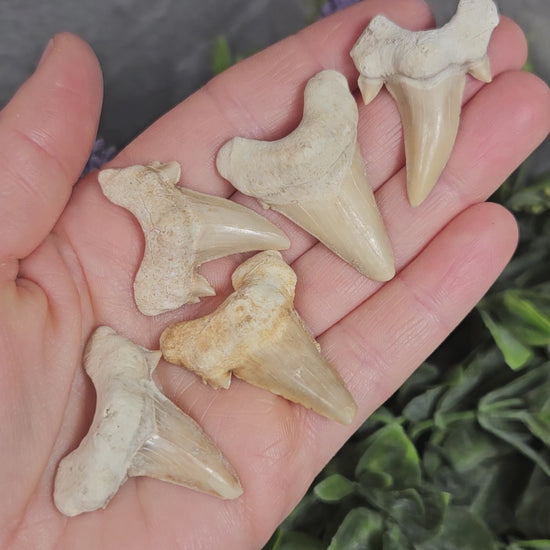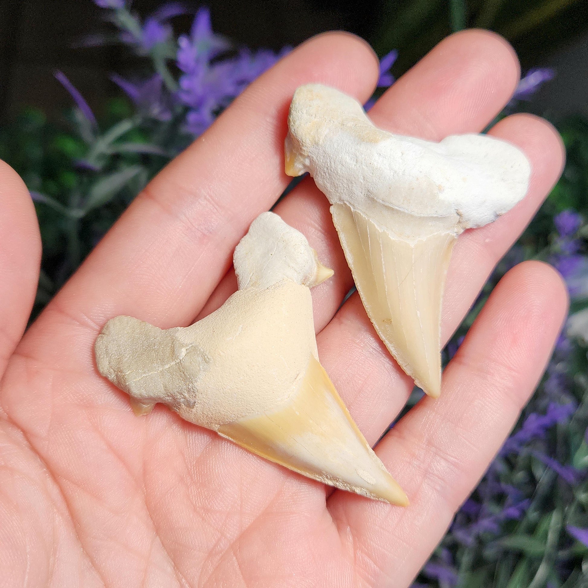 These shark tooth fragments have been naturally shed and fossilized over time. Some fossil shark teeth may have minor repairs or restorations, often done to complete the natural shape after excavation. This is common in the fossil trade and helps preserve the integrity of the specimen.