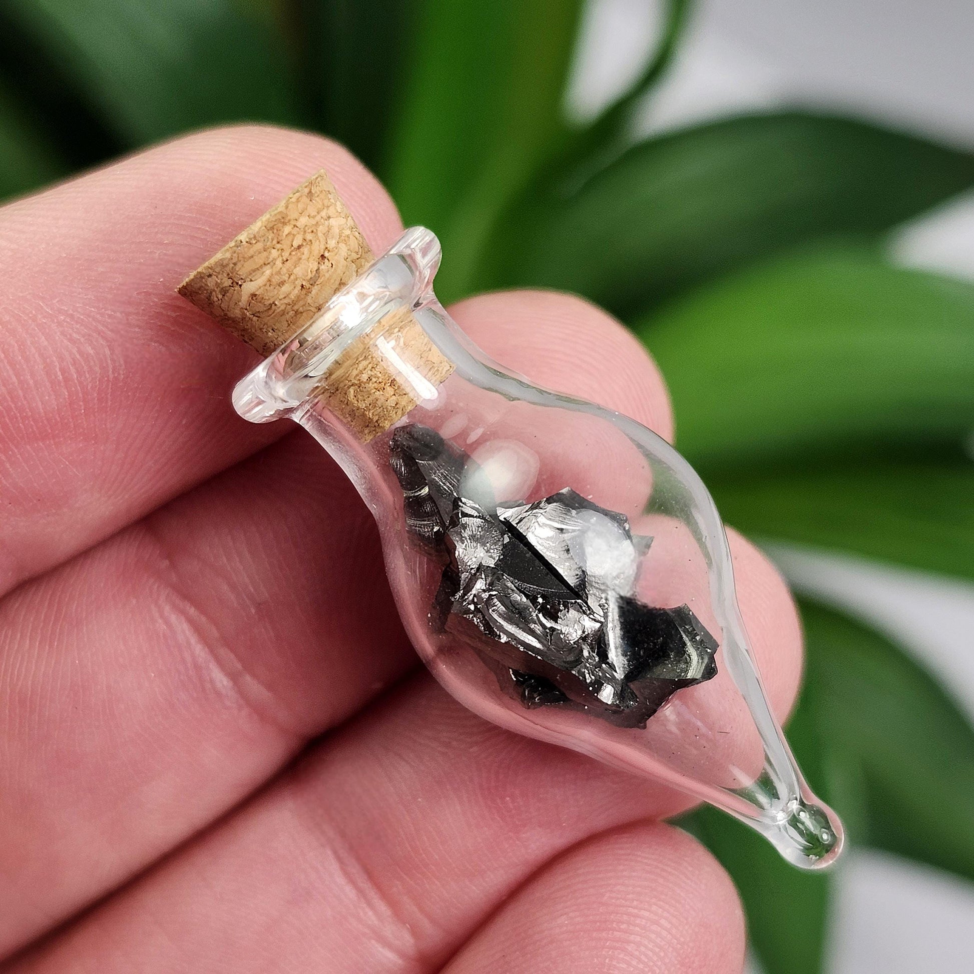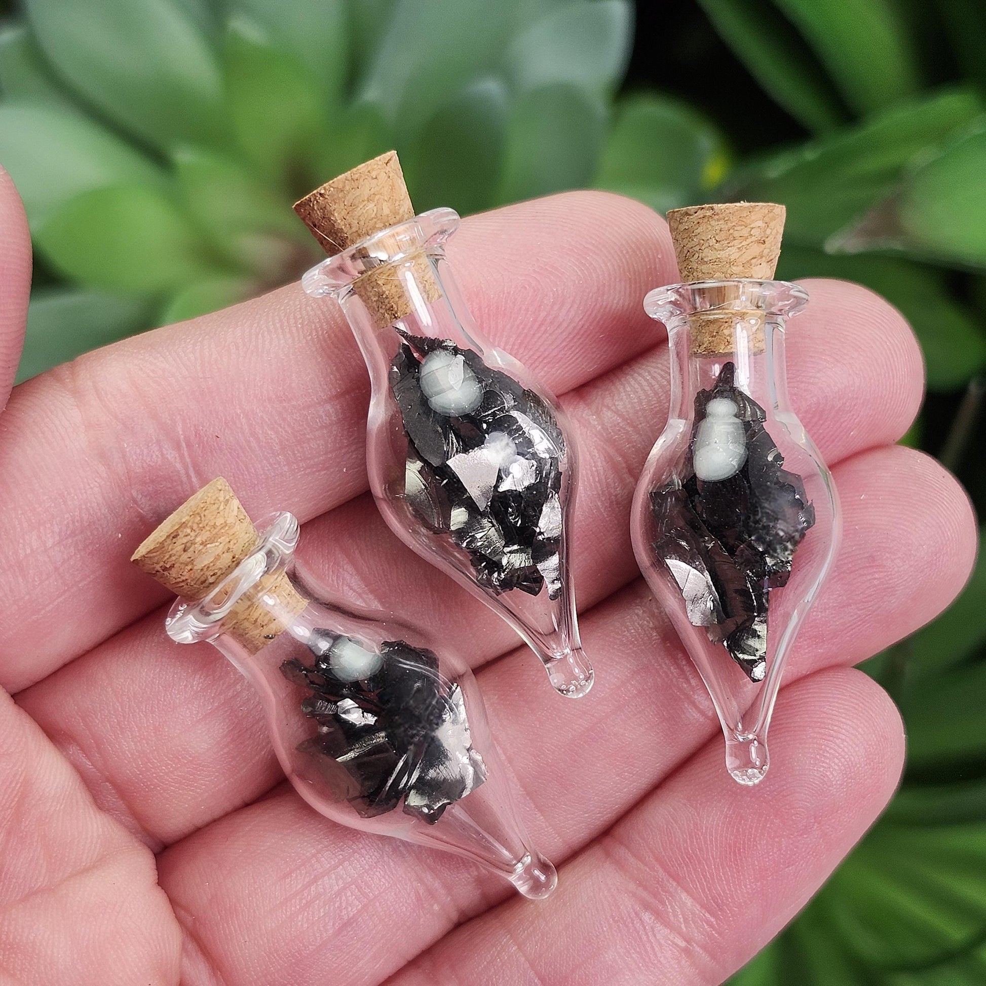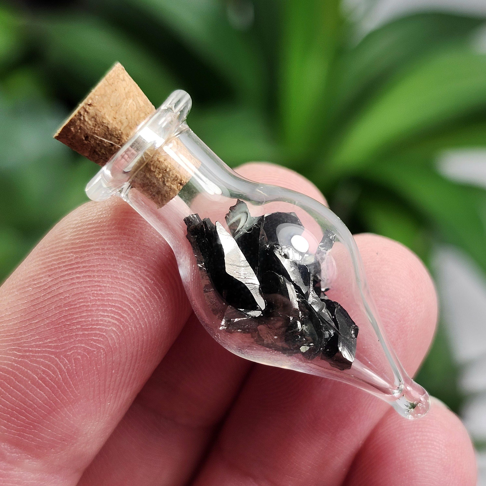 This listing is for ONE (1) Glass Jar with Shungite chips. These authentic Shungite crystals are set into a glass jar and secured with a cork top. The teardrop shaped jars are made of blown glass with a small cork that can be removed to have access to the chips. Each jar measures approximately 30mm by 15mm. *The glass jars are fragile and should be handled with care!