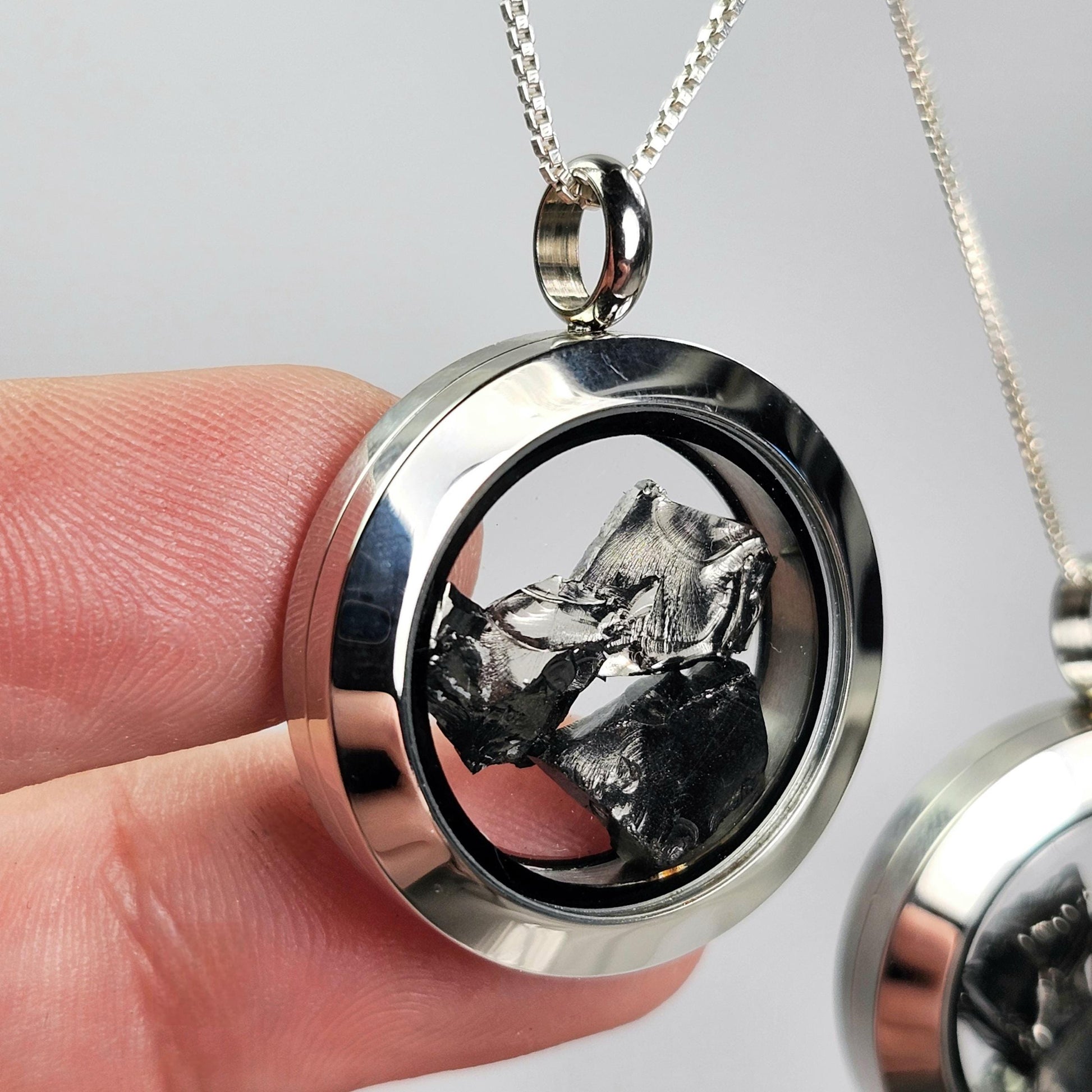 Shungite is an amazing, 2-billion-year-old material that is over 98% pure carbon and has been revered since ancient times. These Shungite specimens have a striking sheen and a silver coloring. These stones are gently nestled inside of a high-quality, stainless-steel locket. These lockets are assembled with two pieces that connect with a threaded screw attachment. We recommend securing the attachments with a dab of epoxy for a more permanent option. Each pendant measures approximately 32mm by 25mm. The silver chain used in the photos is to help envision how this pendant will look while adorned but is not included in the listing - feel free to leave a note for us to include a complimentary cord!