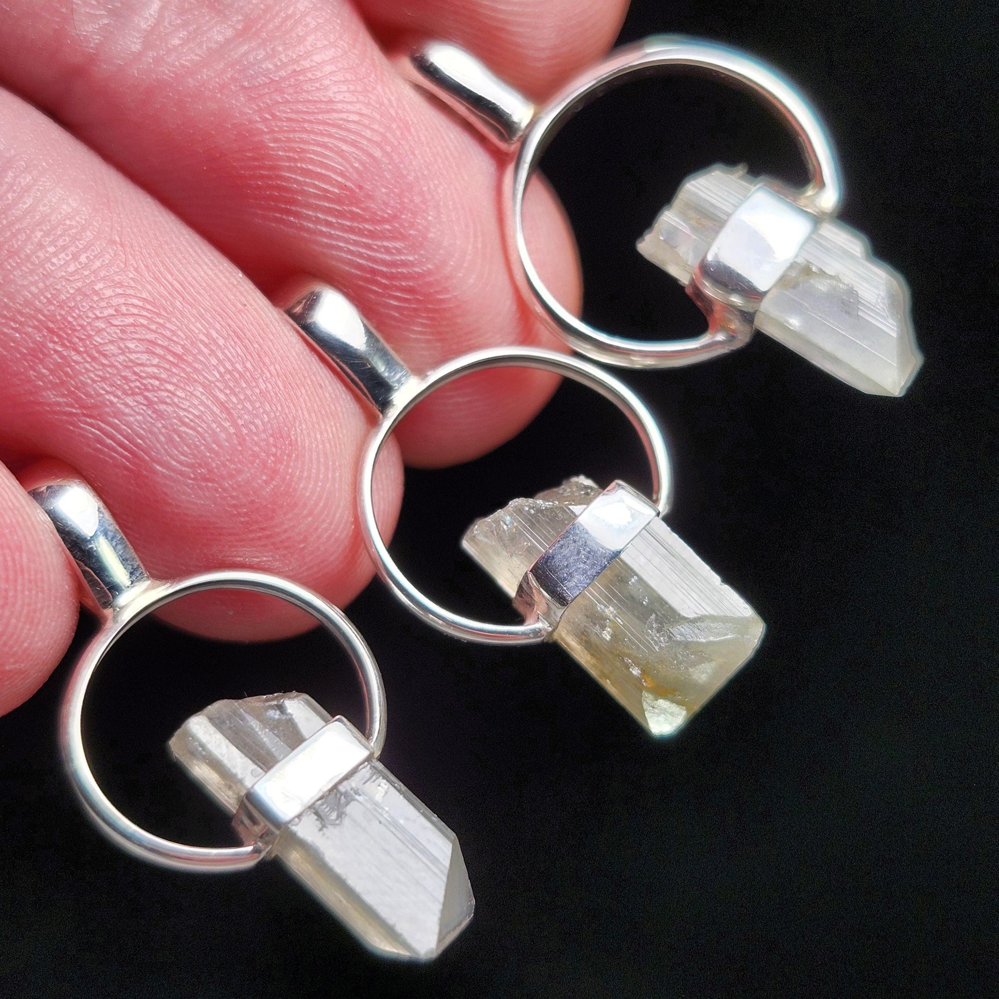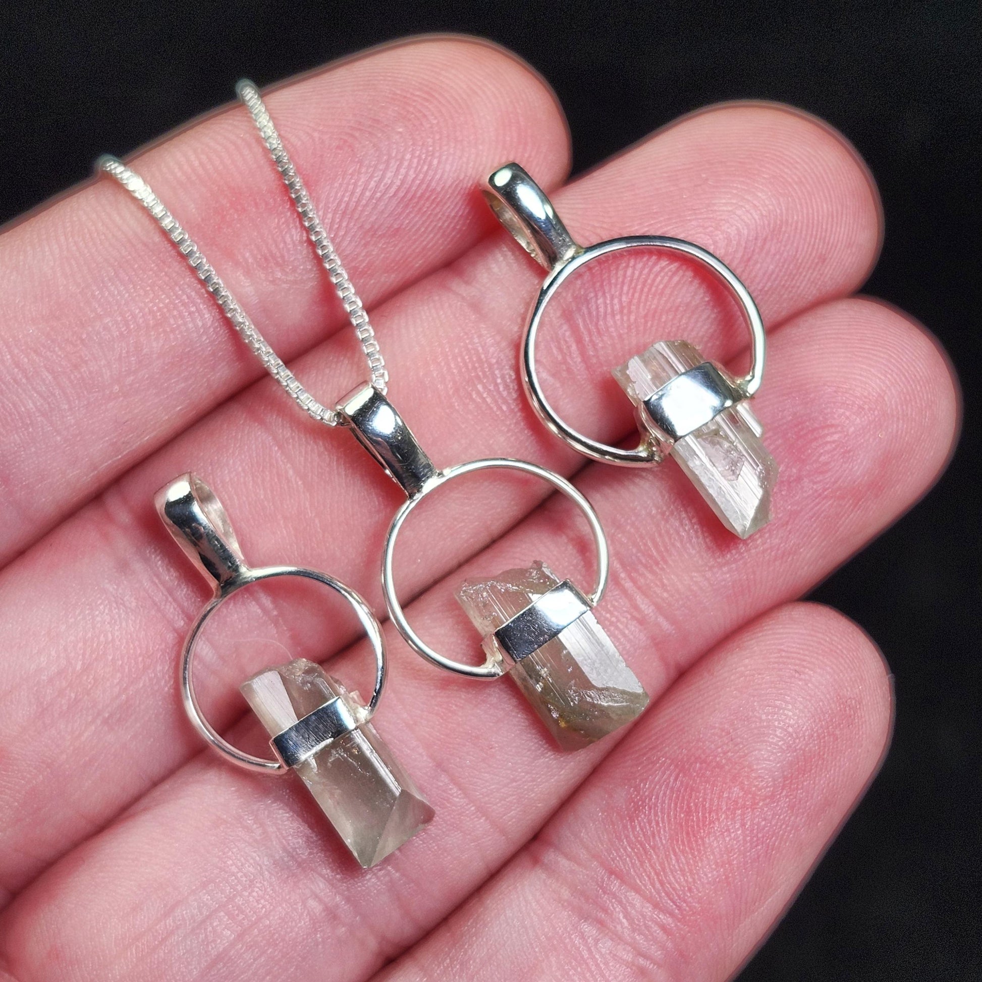 These Siberian Danburite's come from Dalnegorski, which is well known for its UFO crash in the mountains in 1986. A rare find indeed, we often find Danburite from Brazil, but these darker grey crystals have a distinctly different energy and are a score for the collector of rare high vibrations. These terminated crystals have a range of shades of grey and have a high natural sheen. Each crystal has been custom created into a sturdy piece of jewelry using .925 Sterling Silver. Each pendant measures approximately 22mm by 10mm - these measurements are meant to give a general idea of size; the actual dimensions of the pendant you receive may vary slightly. The silver chain used in the photos is to help envision how this pendant will look while adorned but is not included in the listing.