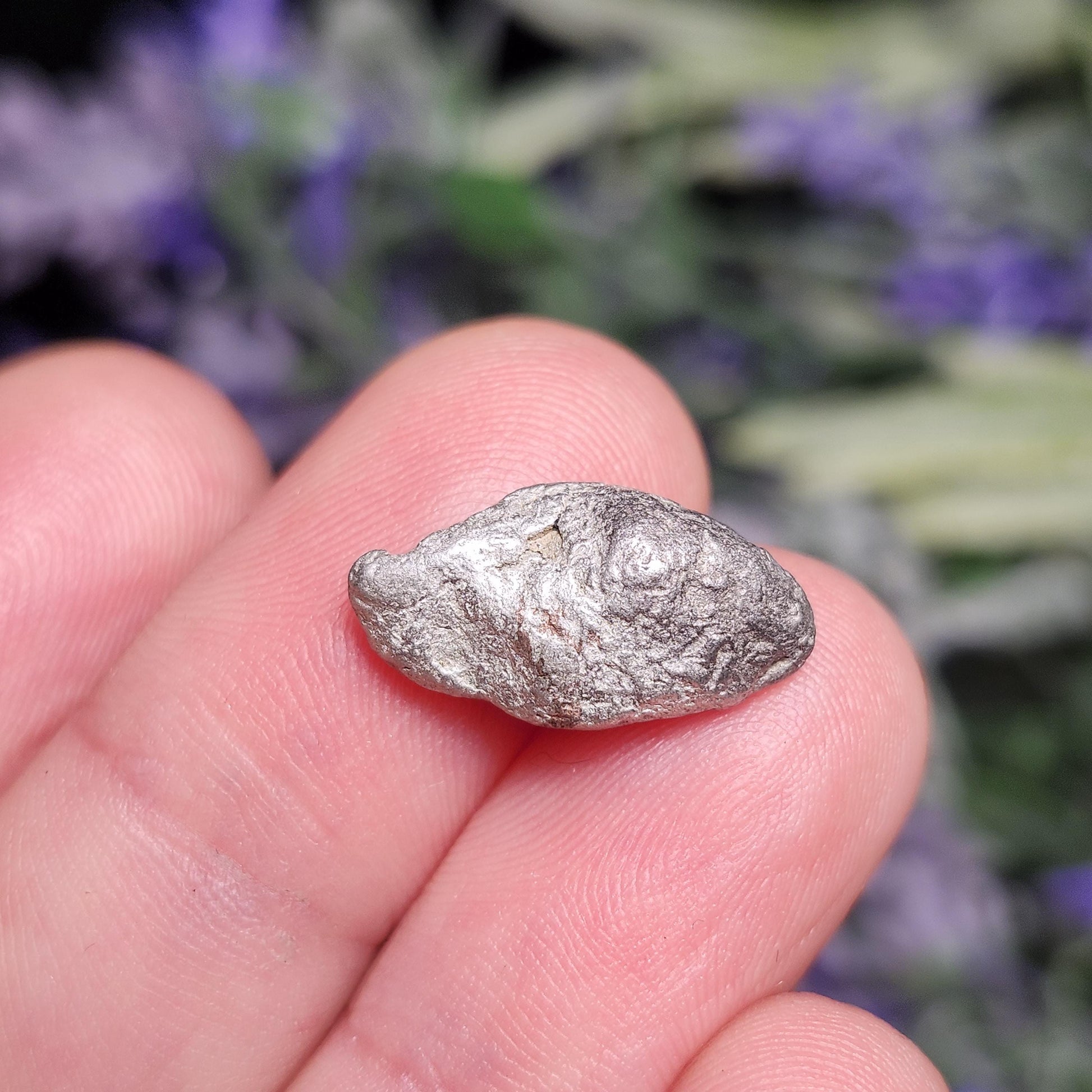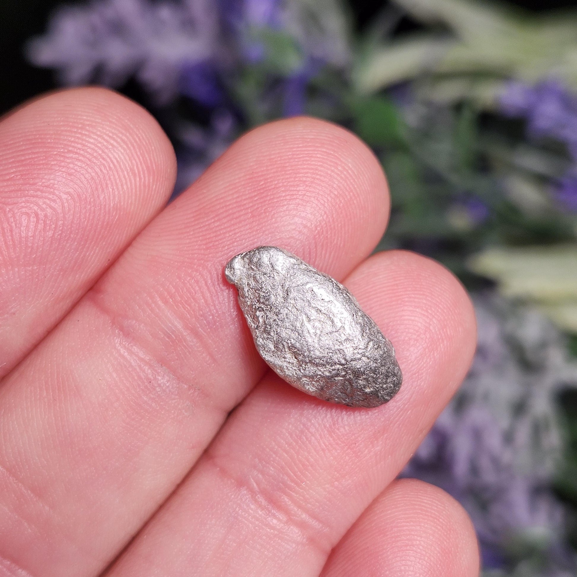 This native Silver and Copper nugget from Michigan is in its raw, natural form with a freeform shape and a metallic shine. It is primarily silver with hints of copper speckled throughout. This specimen measures approximately 16mm by 7mm and weighs 4.1 grams.