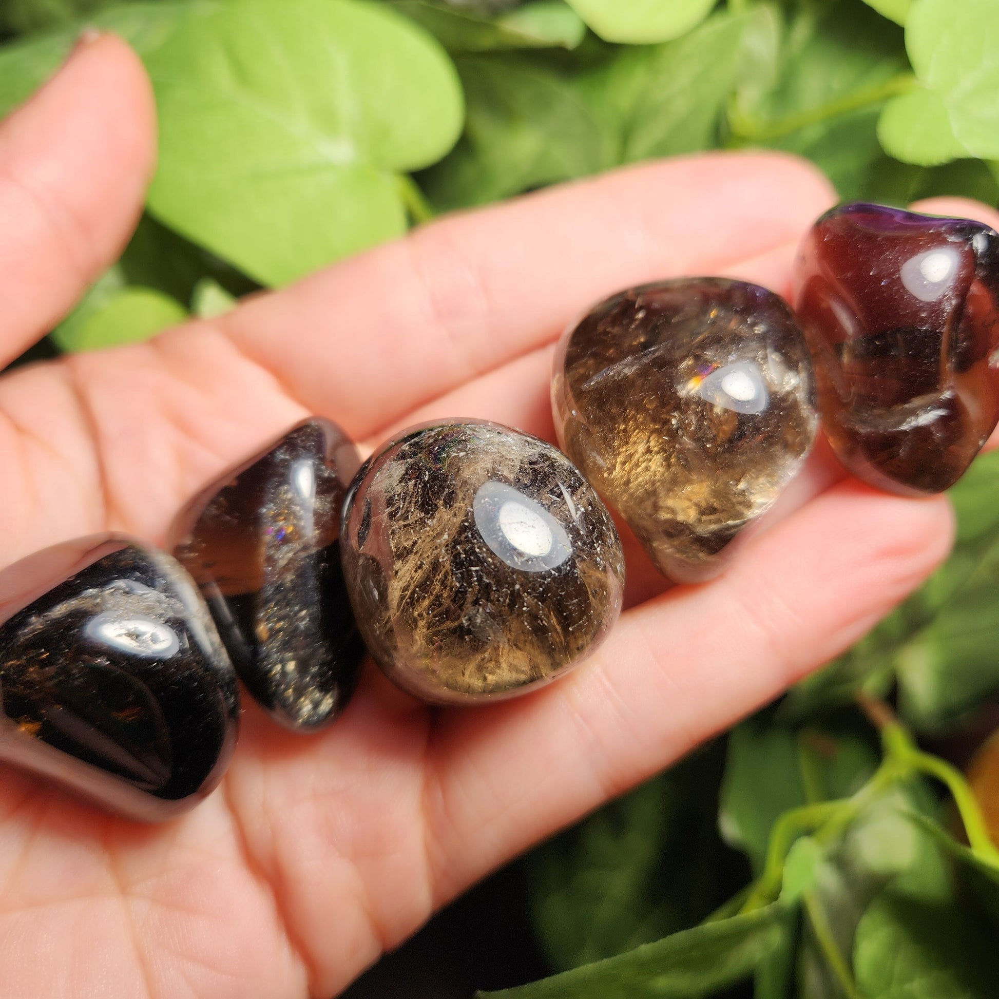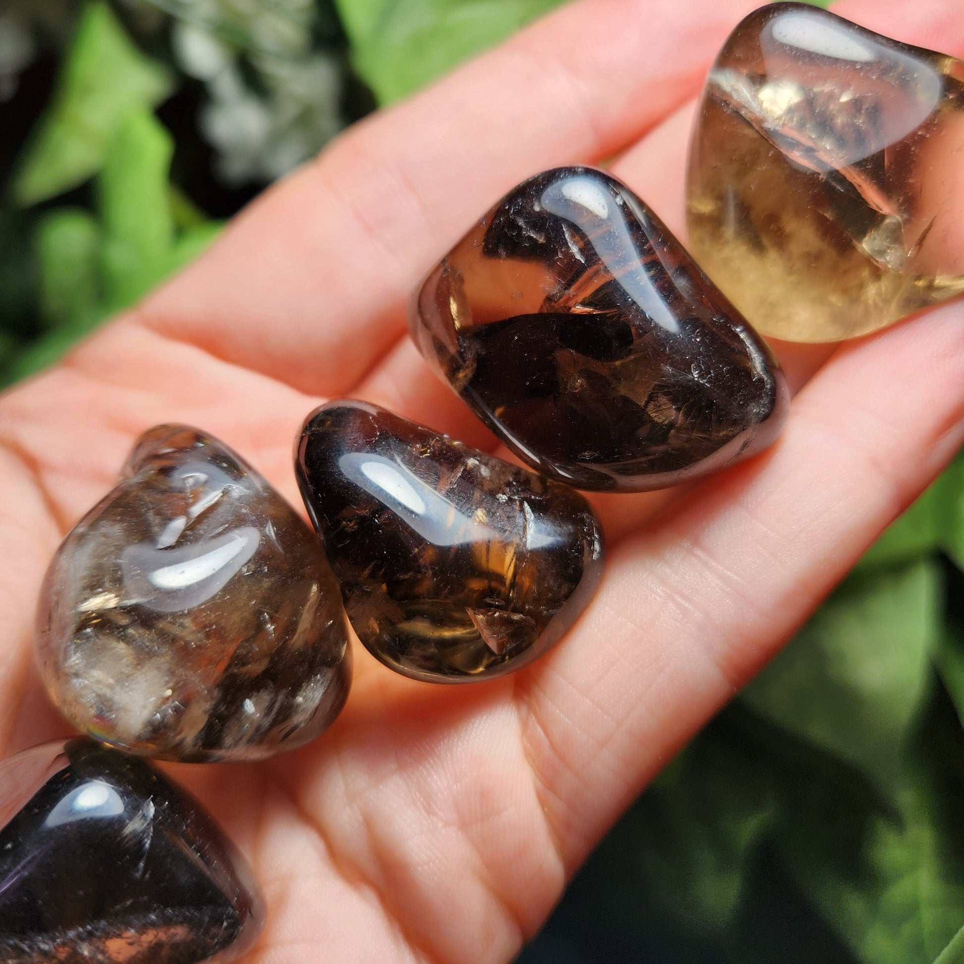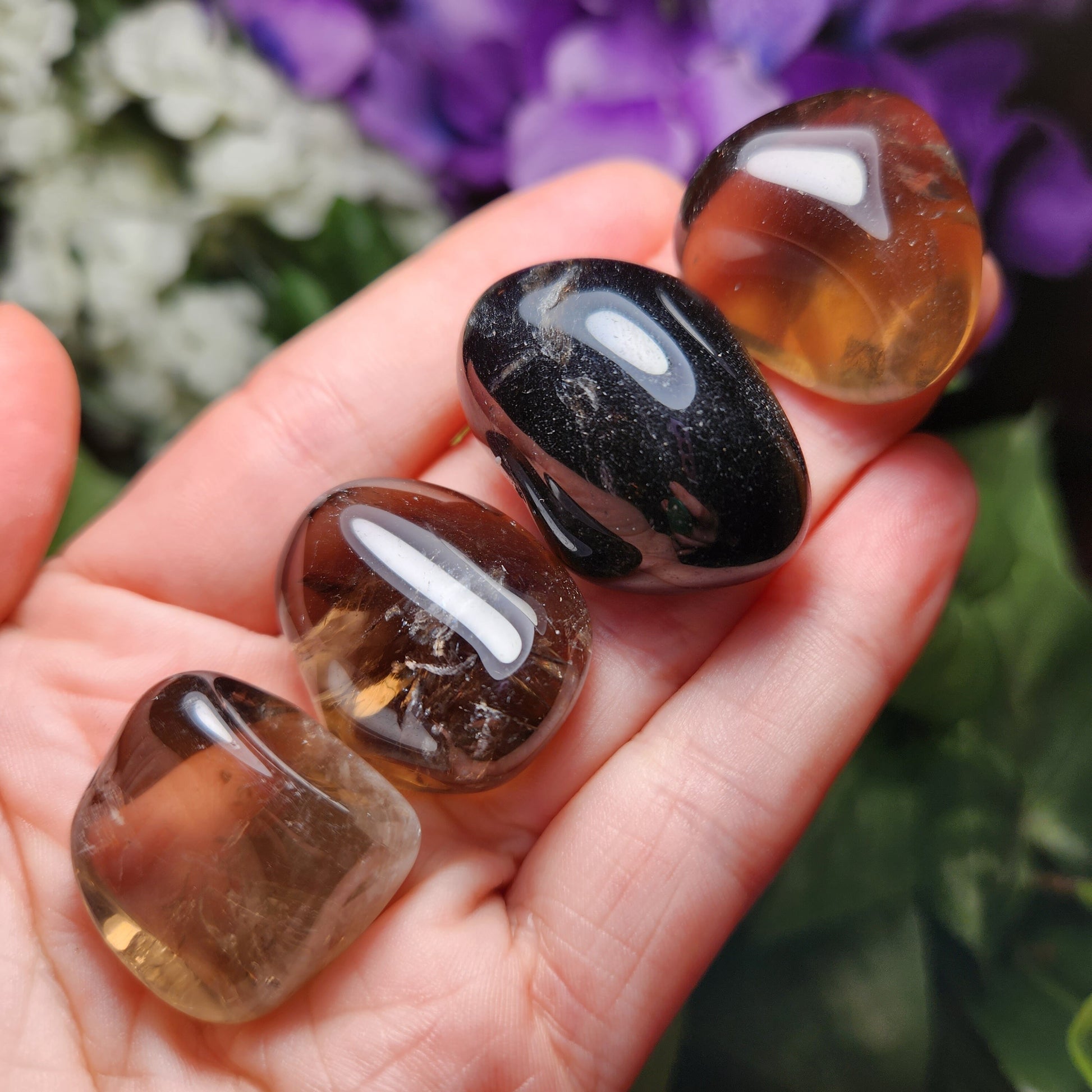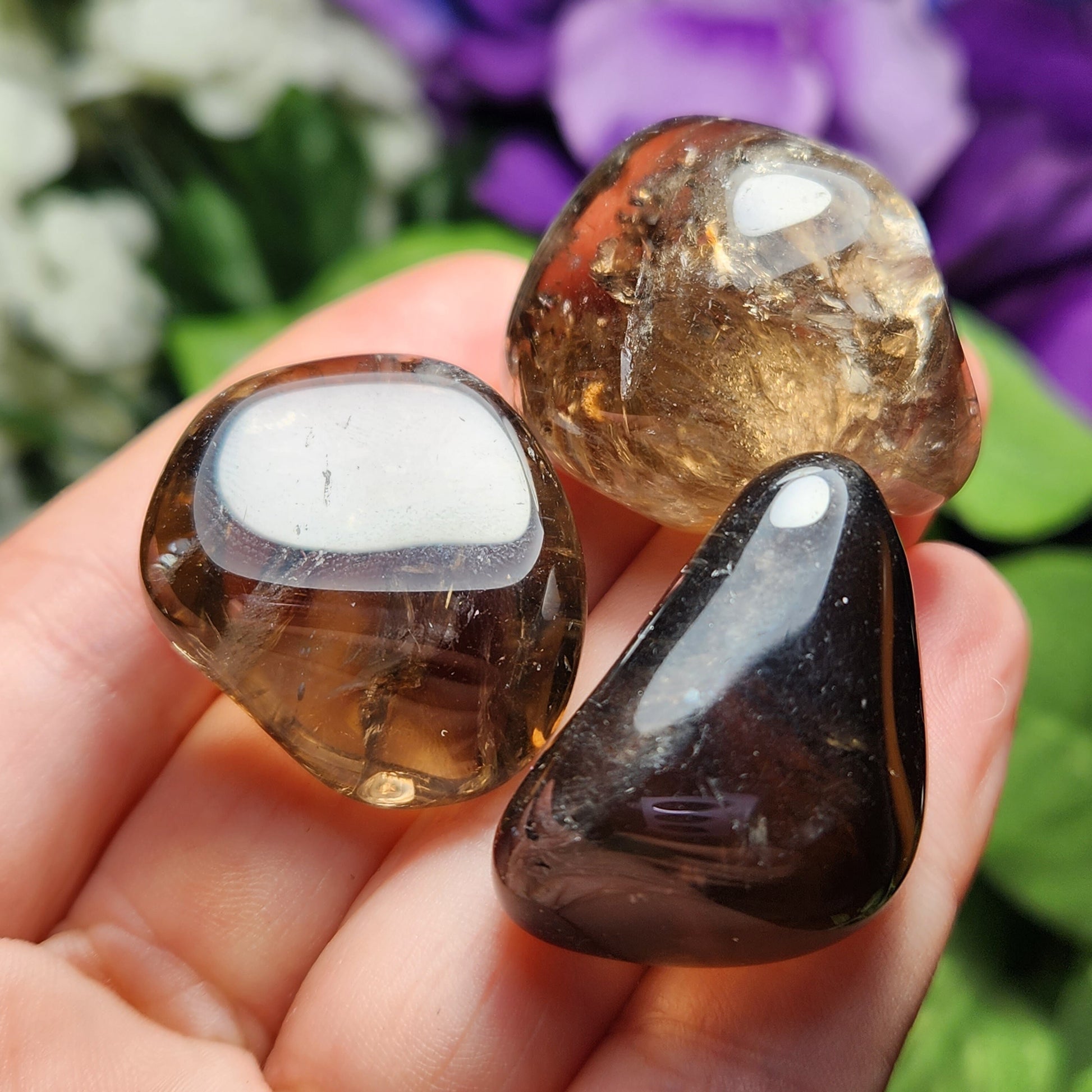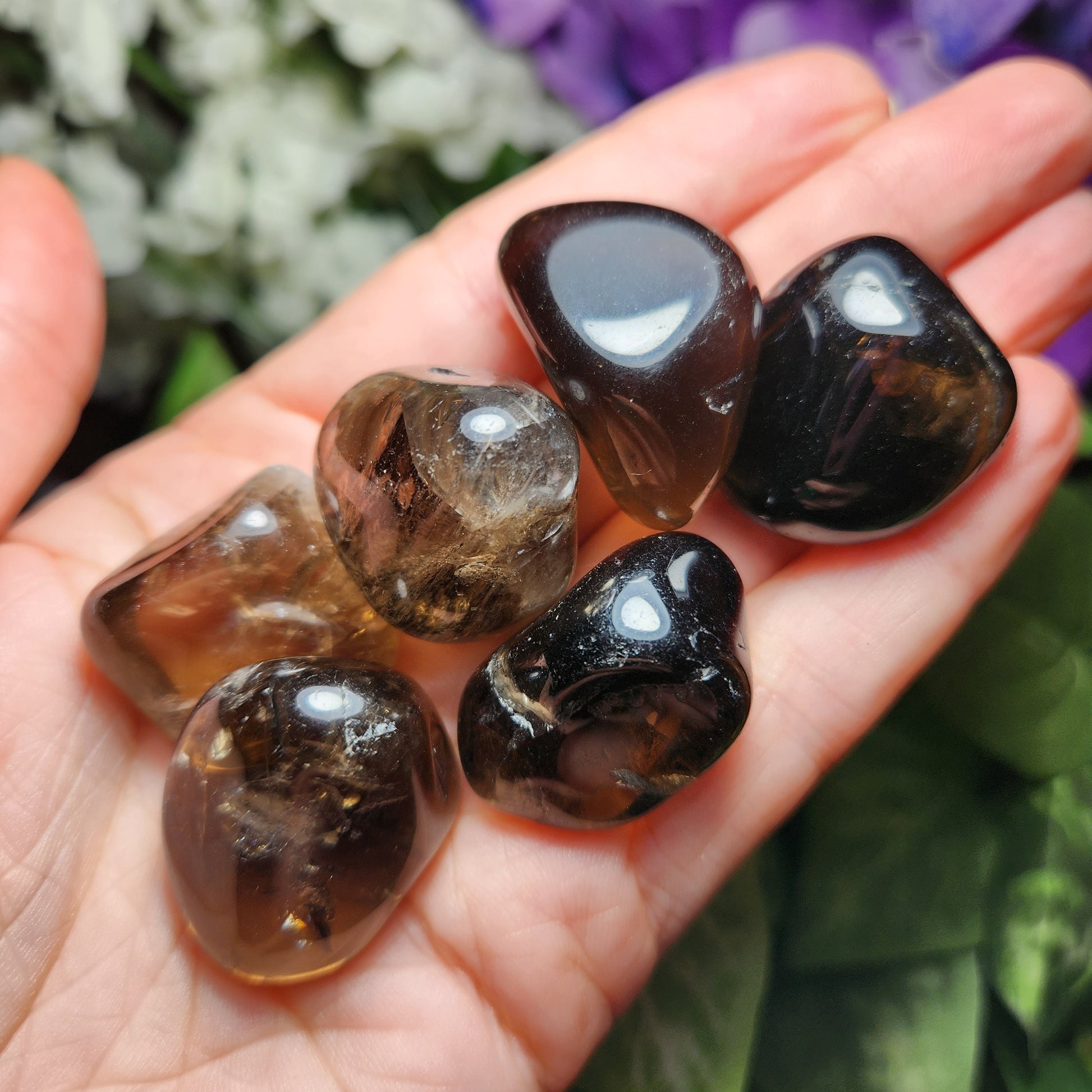 These Smoky Quartz crystals have rounded, freeform shapes and have been tumbled to a high polish. They exhibit a smoky grey-brown coloring and have a glowing translucence. These tumbled stones are each unique and may contain small rainbow inclusions.