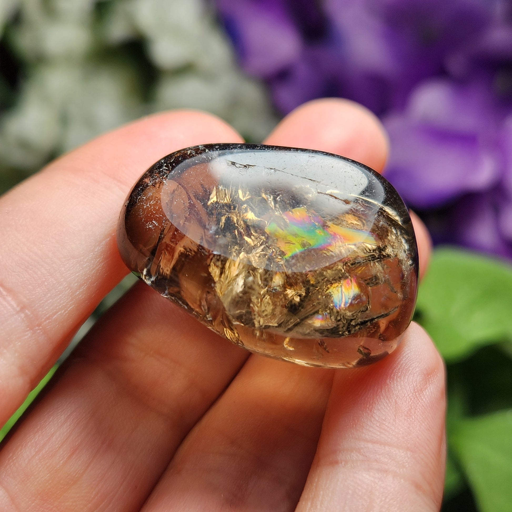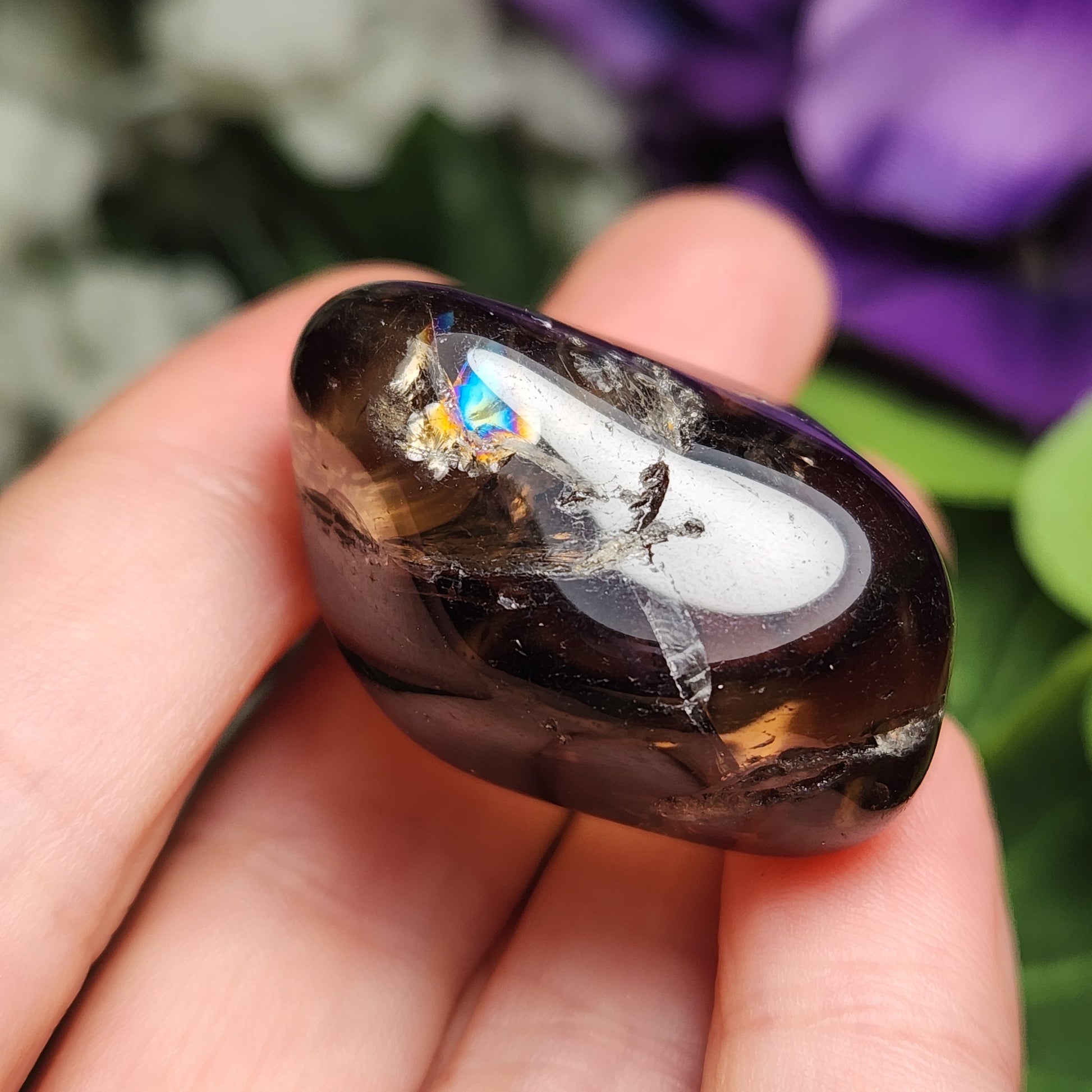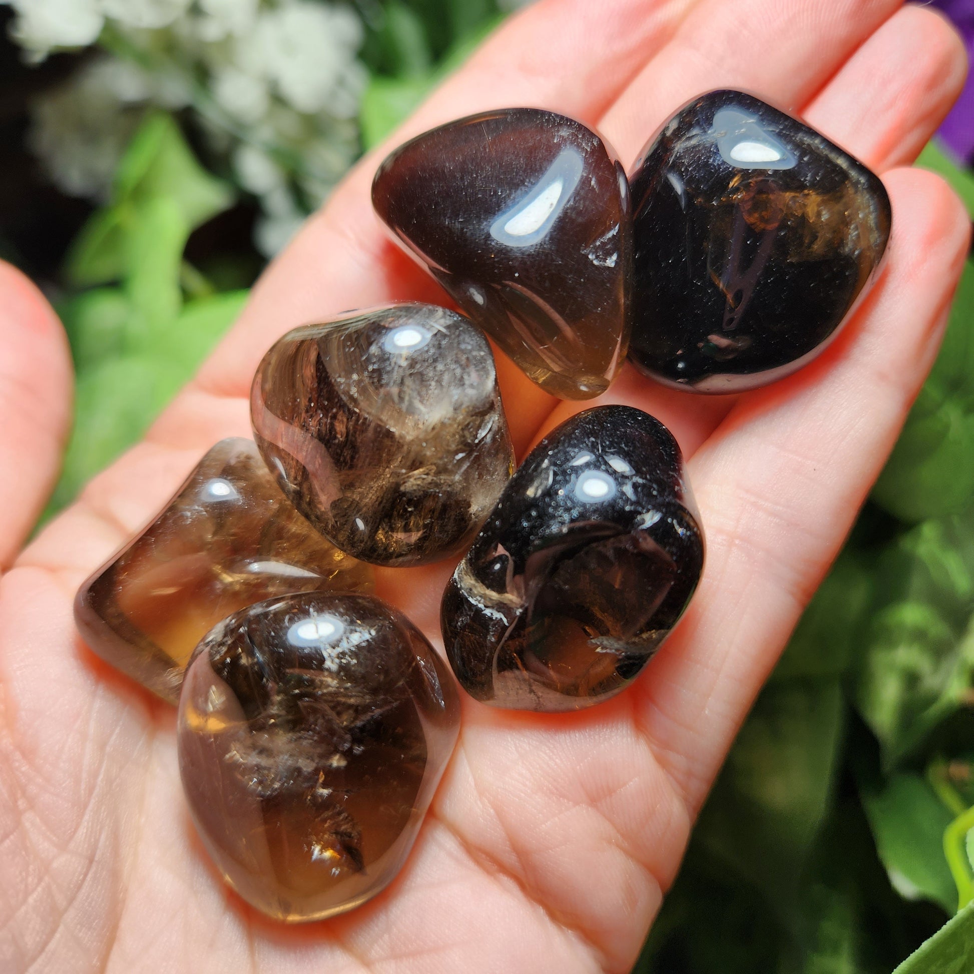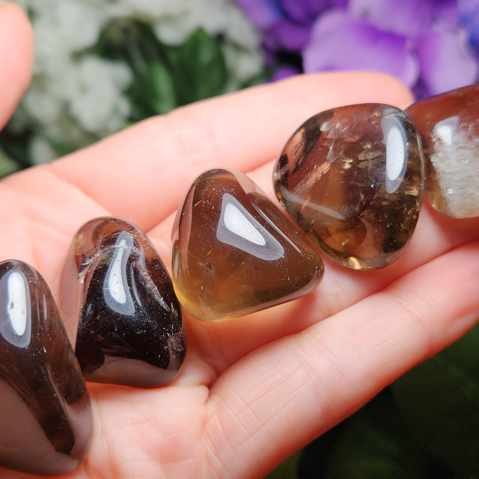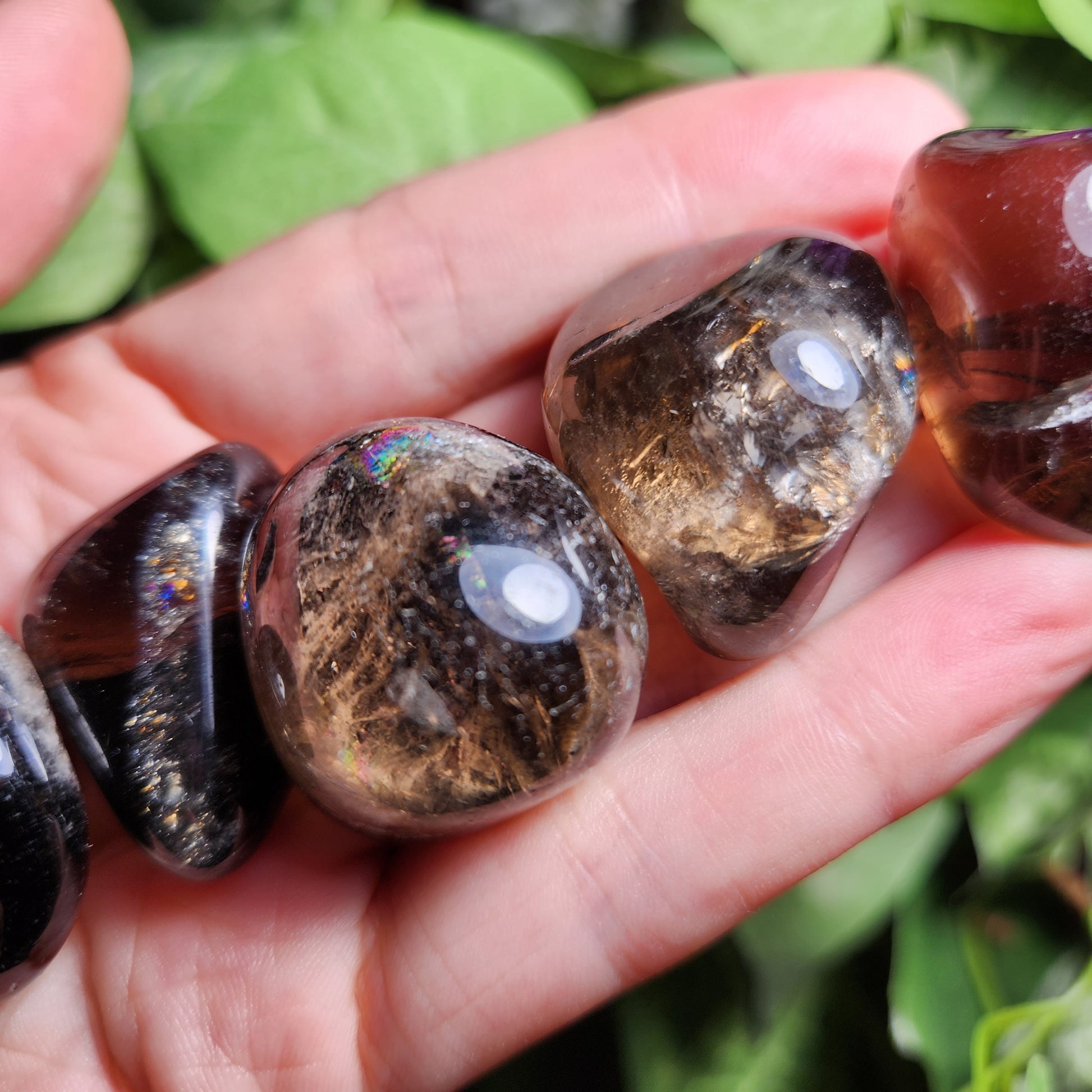 These Smoky Quartz crystals have rounded, freeform shapes and have been tumbled to a high polish. They exhibit a smoky grey-brown coloring and have a glowing translucence. These tumbled stones are each unique and may contain small rainbow inclusions.