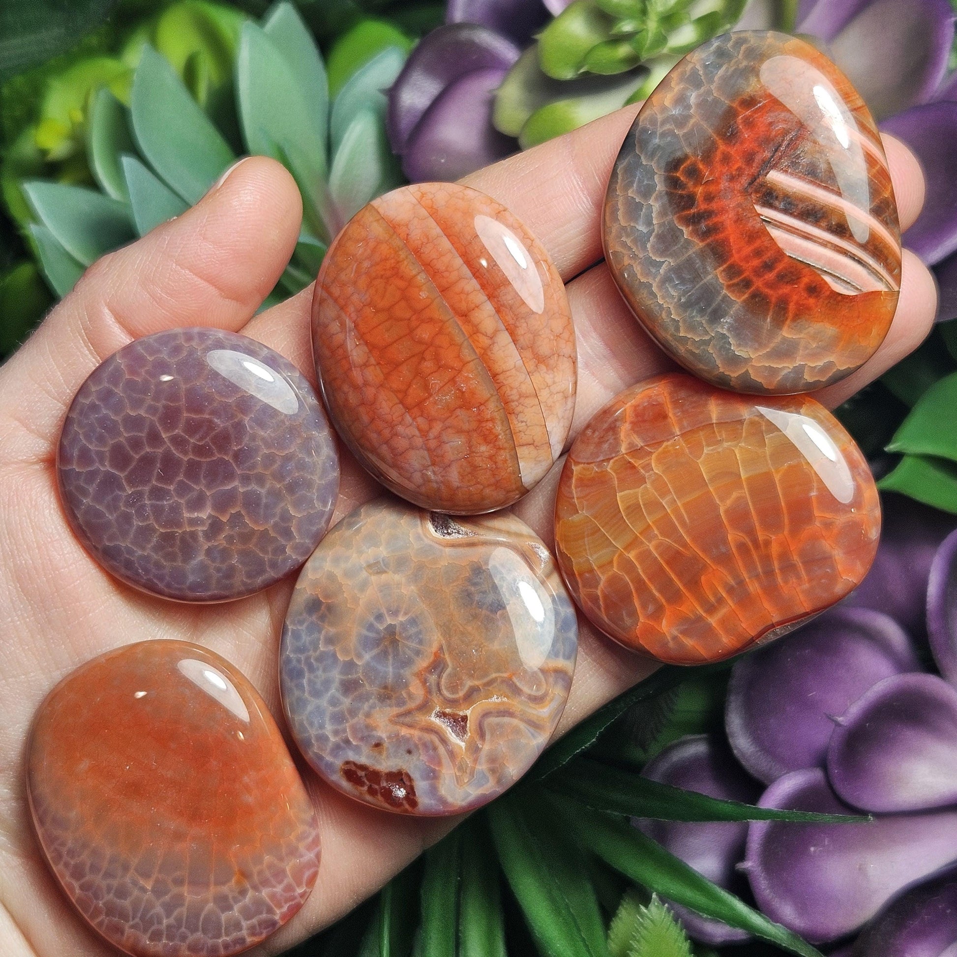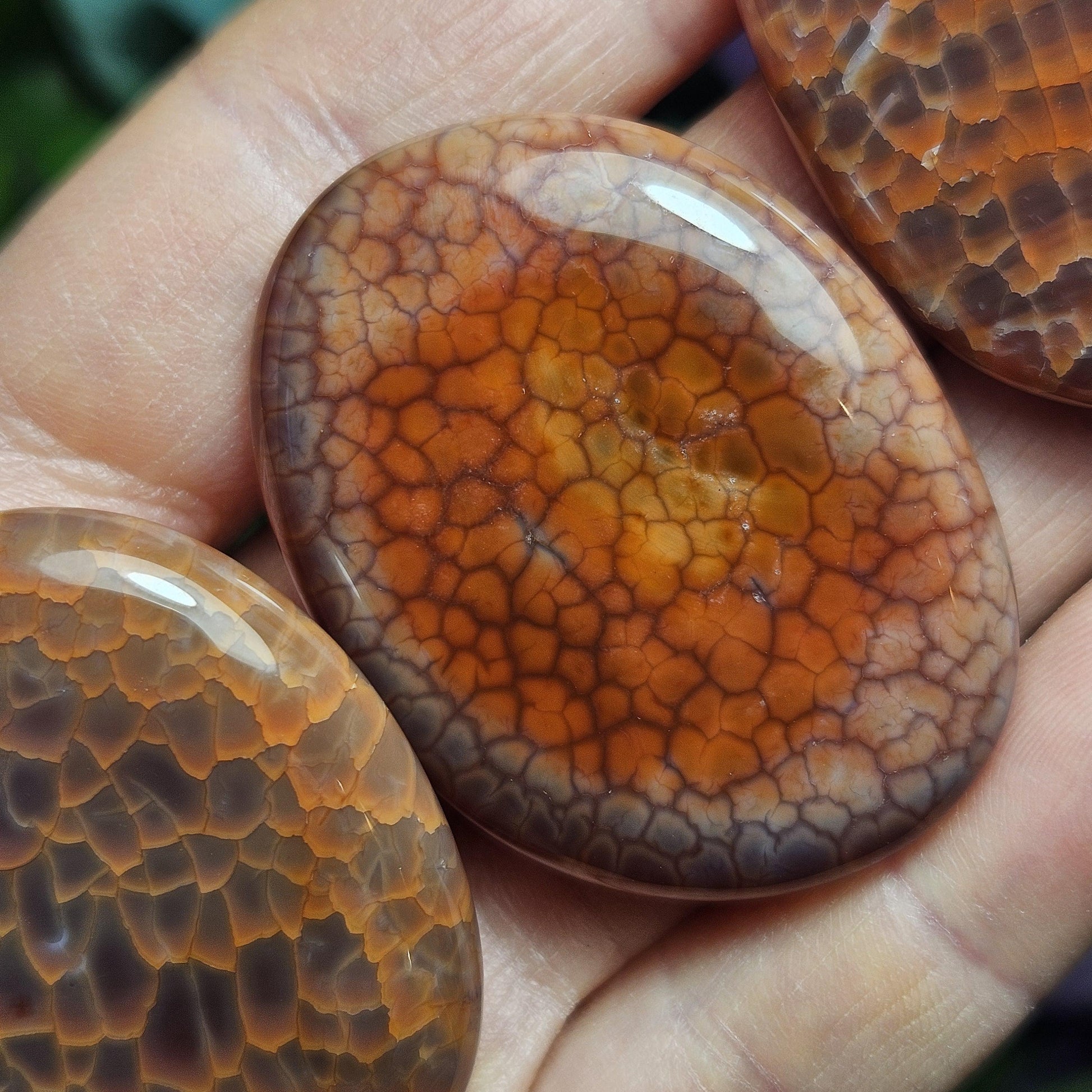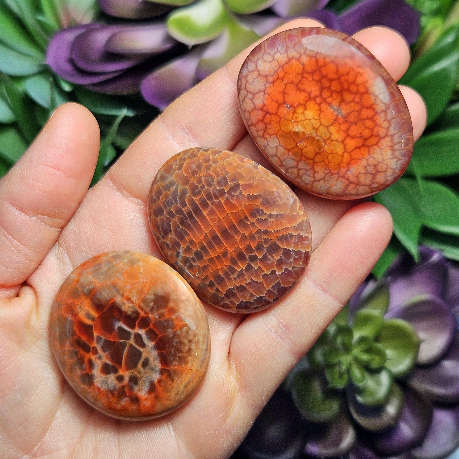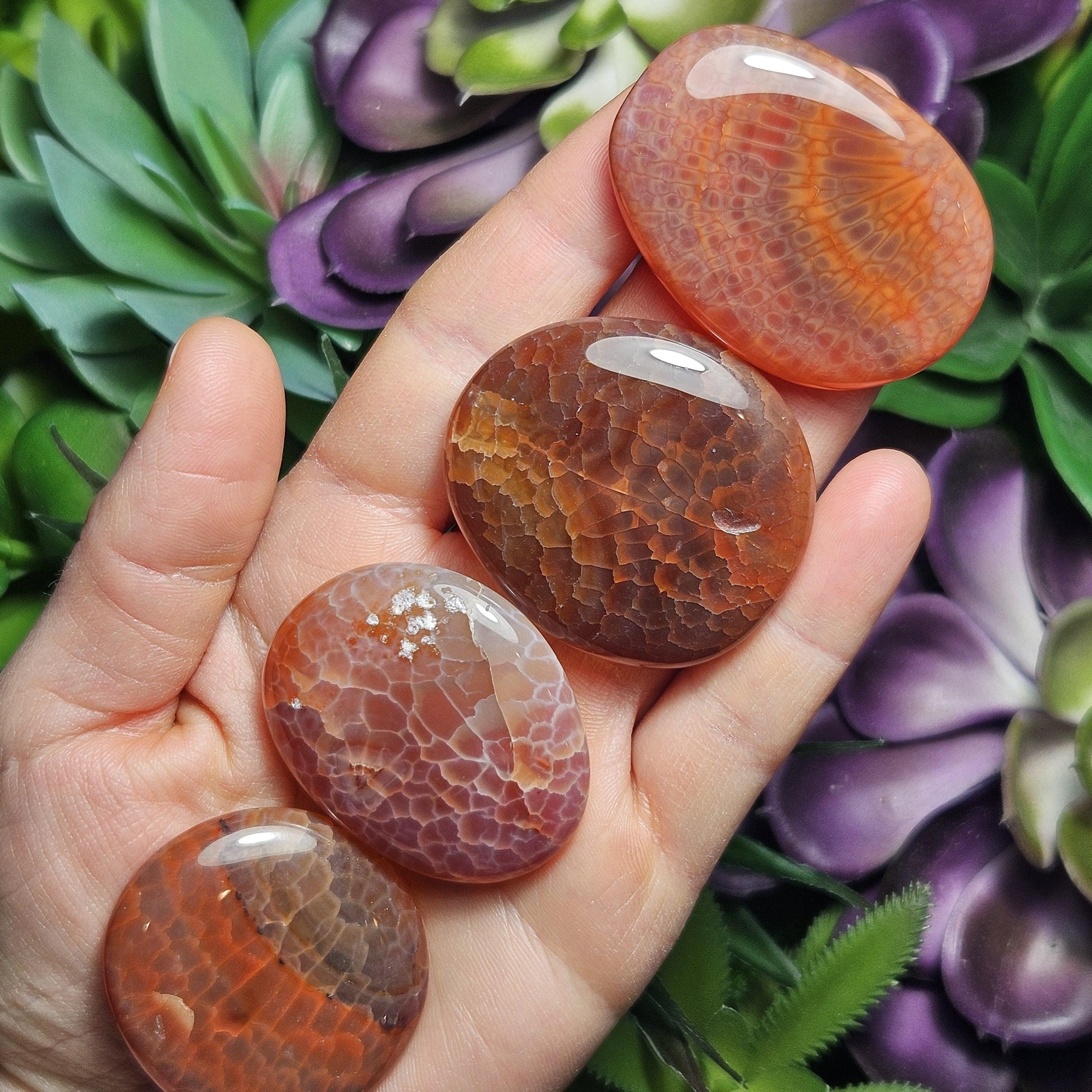 These Snakeskin Agate Carnelian crystals have freeform, palm sized flat shapes and have been polished to a high sheen. Their glowing translucence shows off the unique markings that this material is known for. These specimens exhibit an array of orange stones, from golden to rust colored hues. Each unique specimen measures approximately 1.25 inches to 1.5 inches in size.