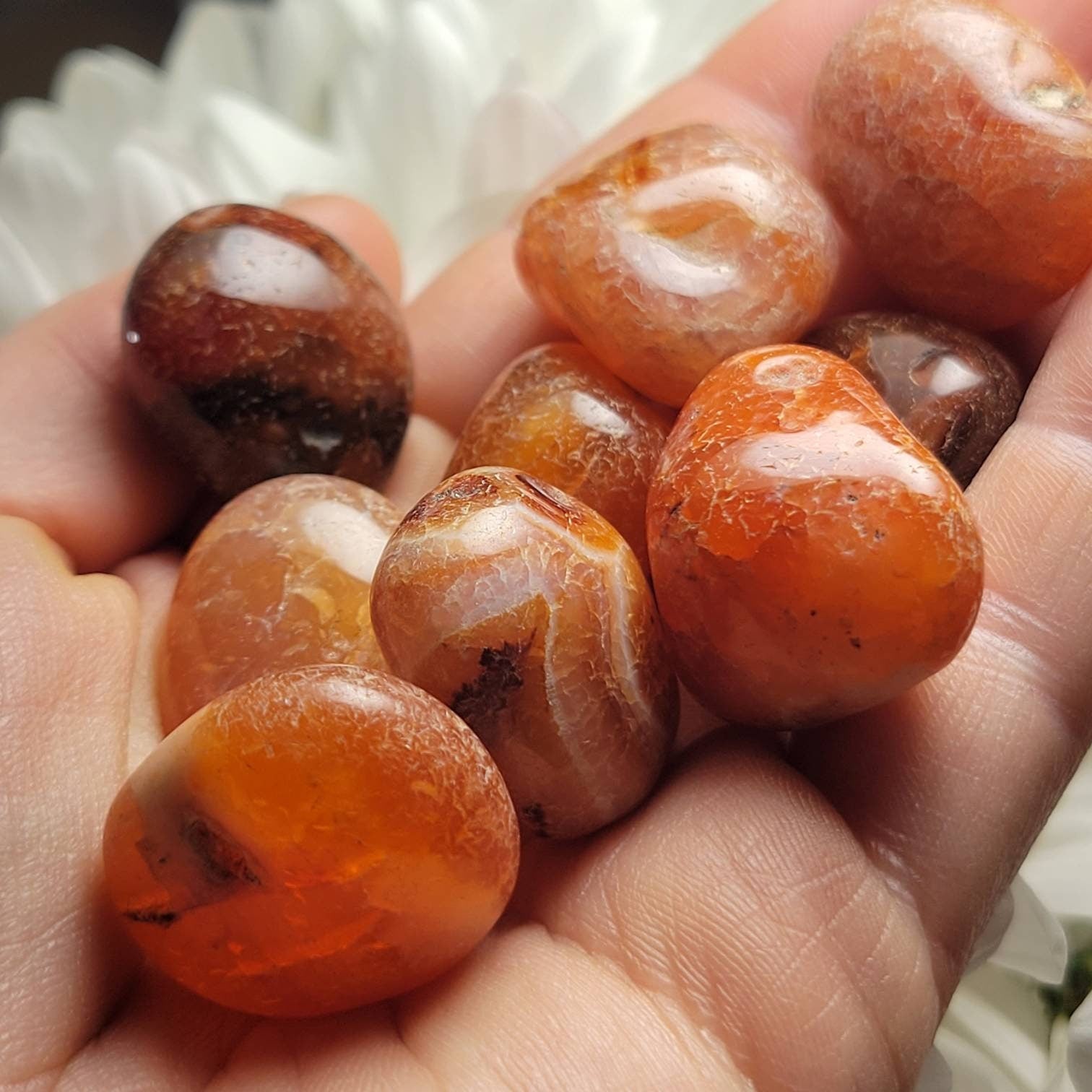 These Snakeskin Carnelian crystals are freeform shapes and have been tumbled to a high sheen. Their glowing translucence shows off the unique markings that this material is known for. Each specimen measures 3/4 of an inch and up.