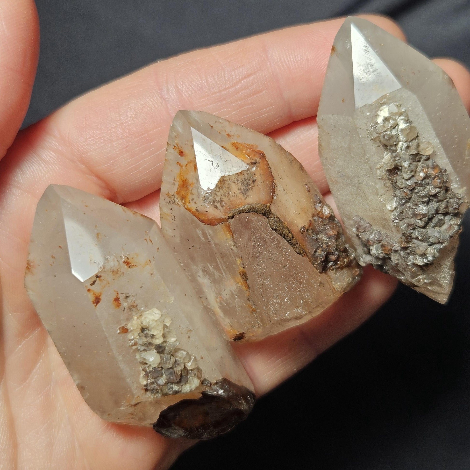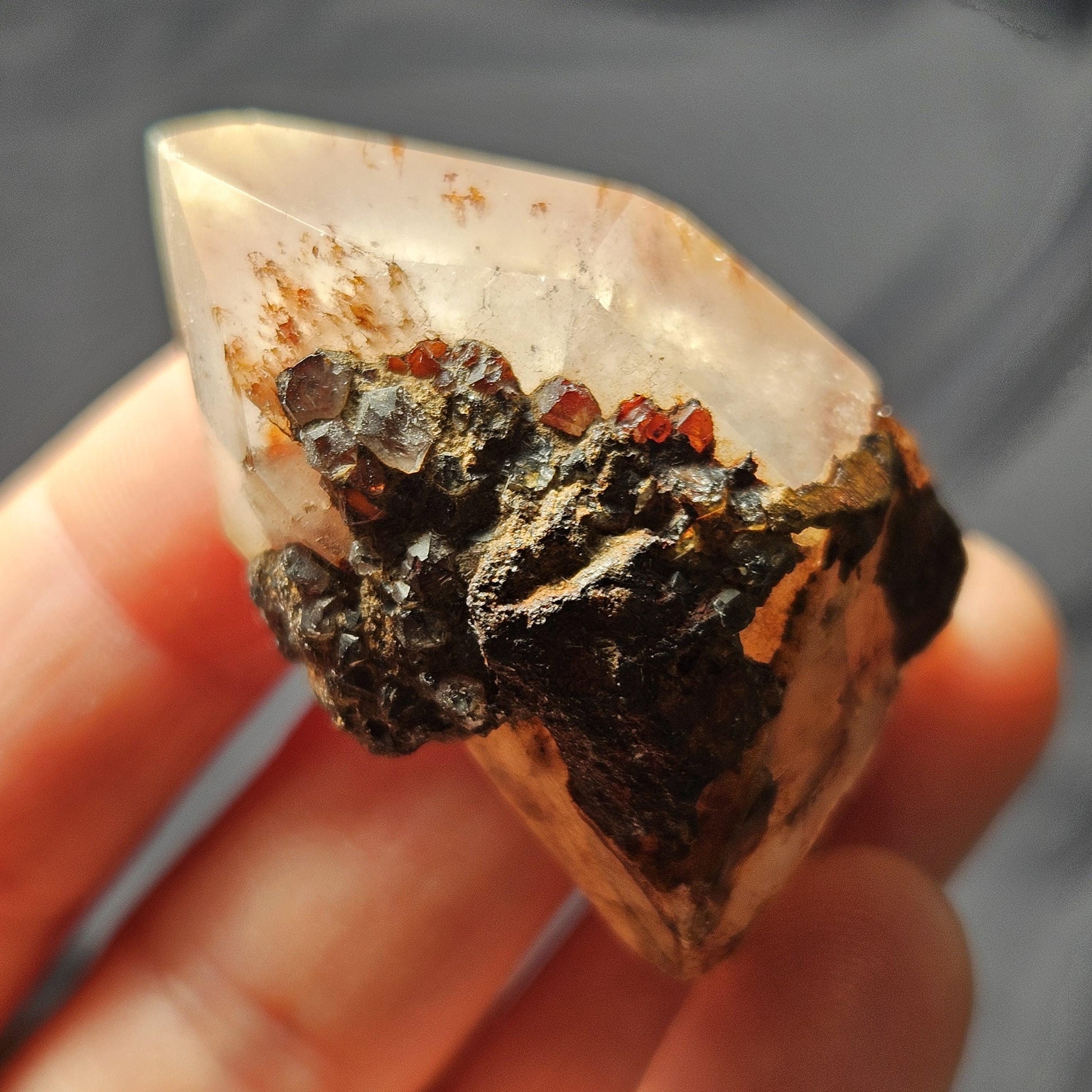 These Lemurian Quartz crystals are from a rare find in 2023 from the Cristalina region of Brazil. They display a range of maroon to umber colored Hematite in terminated quartz drusy along the surface. Each terminated crystal is meticulously polished on the primary facets and retains its raw natural effect on the unique drusy coating.