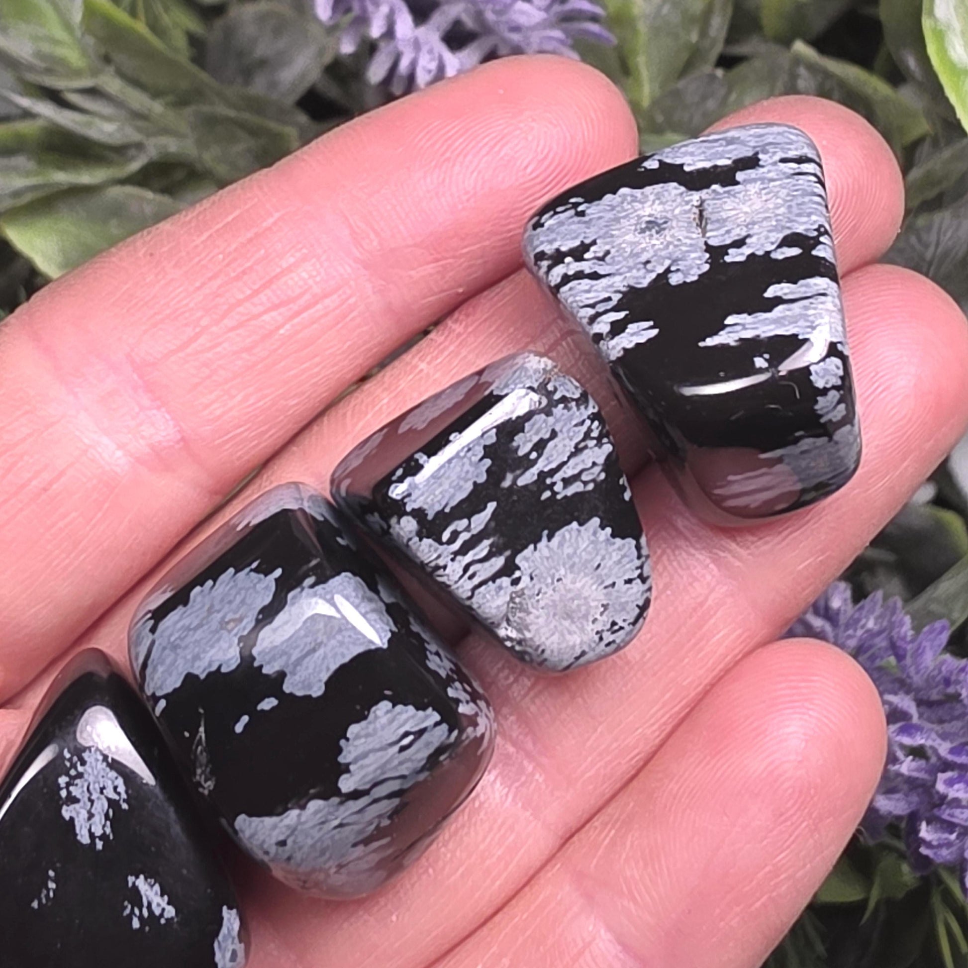 These Snowflake Obsidian crystals have freeform shapes and have been tumbled to a high polish. They each exhibit a unique pattern, classic to this material. Each specimen measures approximately between 15 to 20 millimeters.