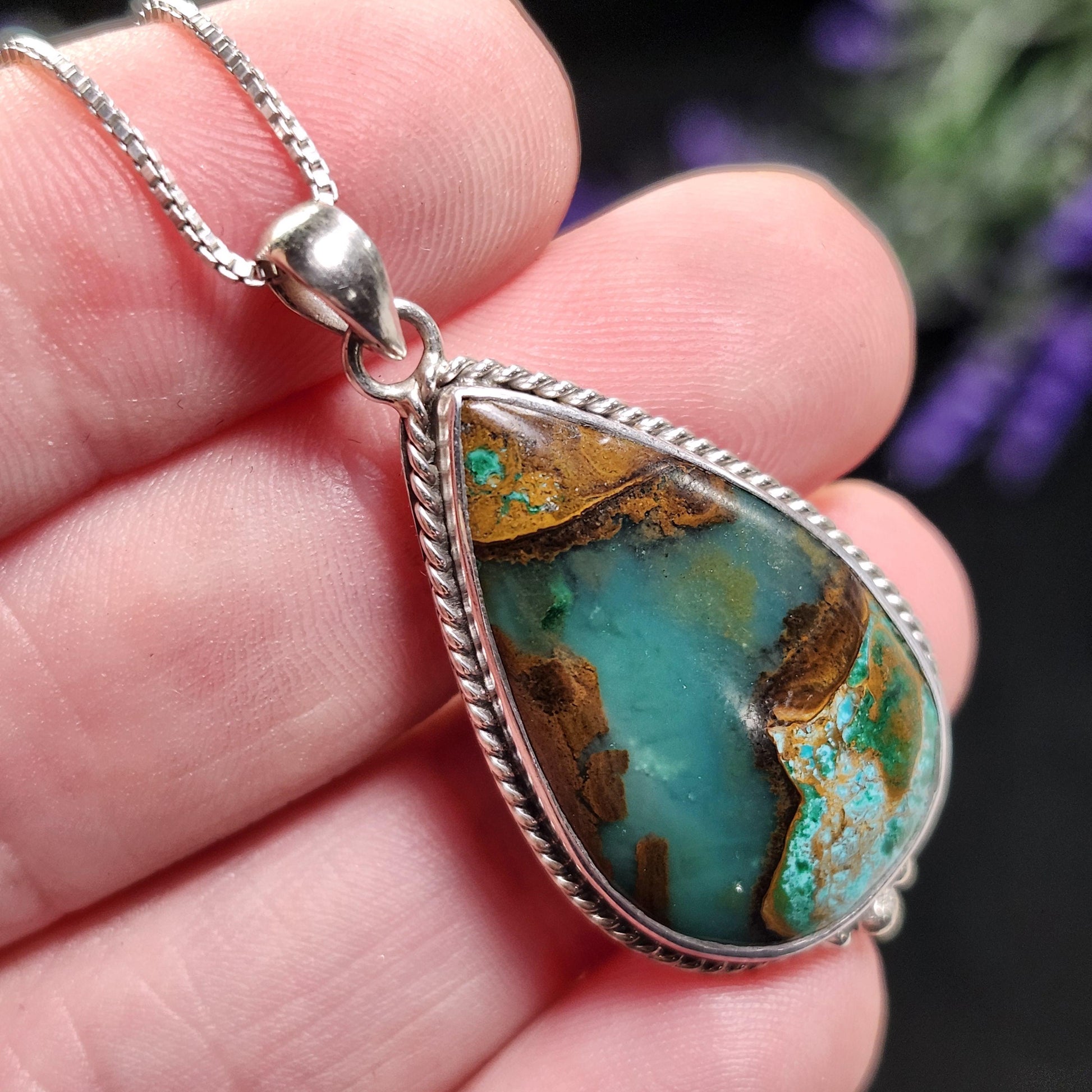 Sonora Sunset, also known as Sonora Sunrise, is a striking natural copper ore composed primarily of Chrysocolla, Cuprite, and Tenorite. This vivid stone was first discovered in the Milpillas Mine in Sonora, Mexico, from which it takes its name, and is known for its dramatic colors and picturesque landscape patterns. This cabochon is a perfect example of this material, with bright teal in juxtaposition with warm brown. This crystal has been custom created into a sturdy piece of jewelry using .925 Sterling Silver. This pendant measures approximately 38mm by 18mm. The silver chain used in the photos is to help envision how this pendant will look while adorned but is not included in the listing.