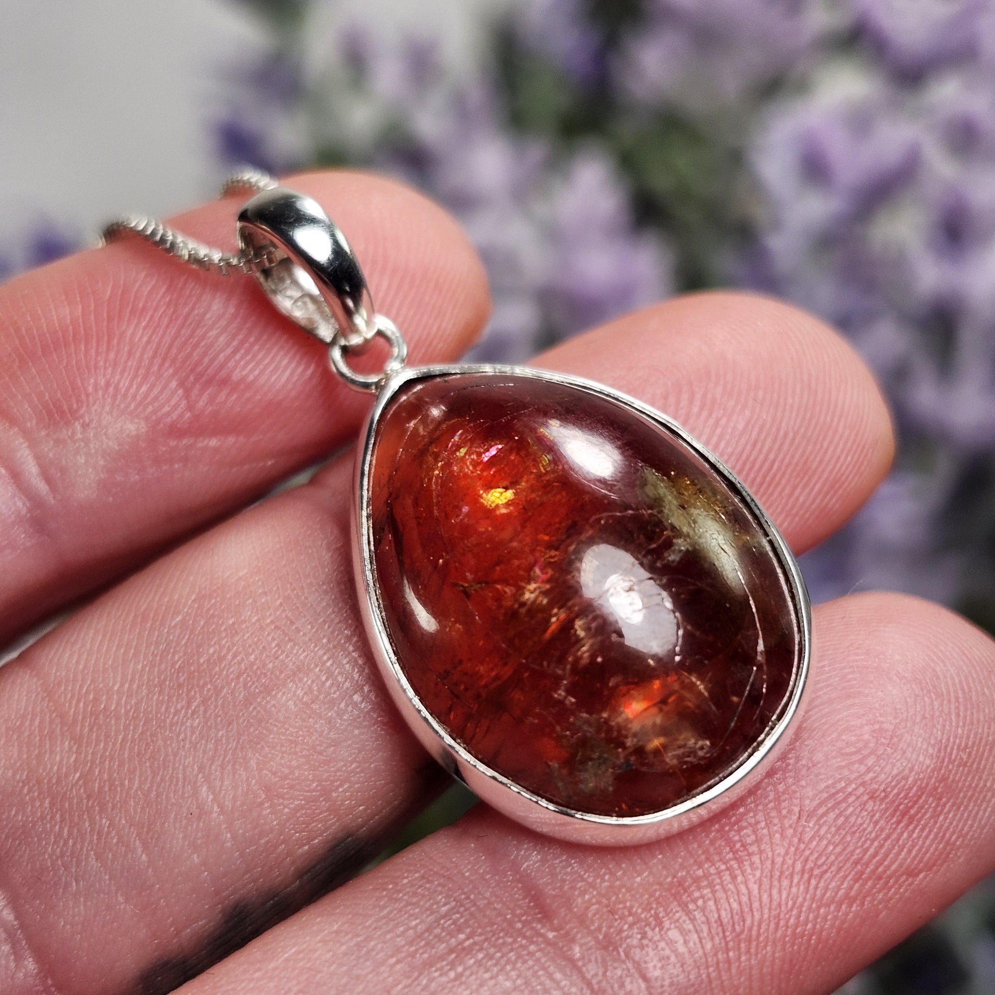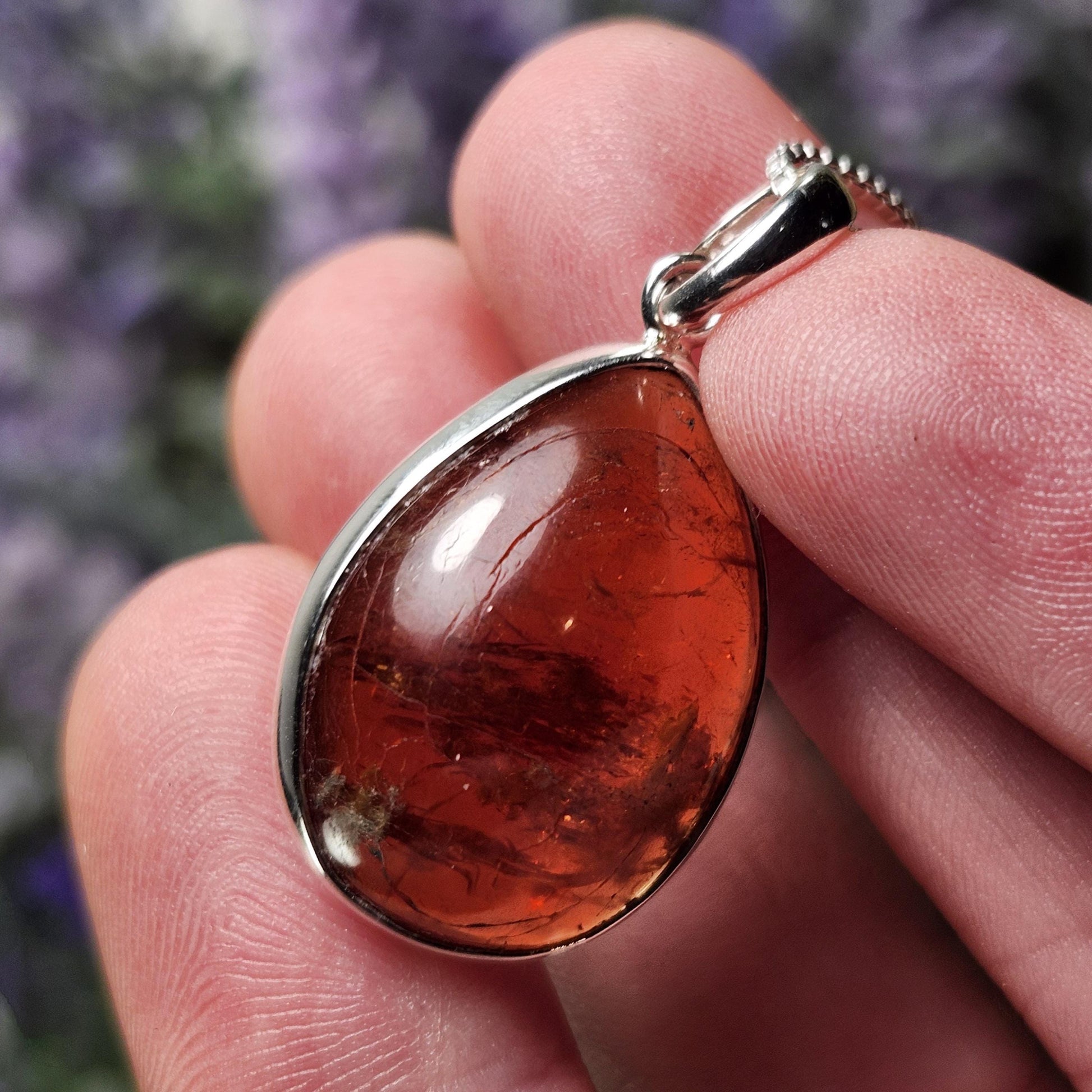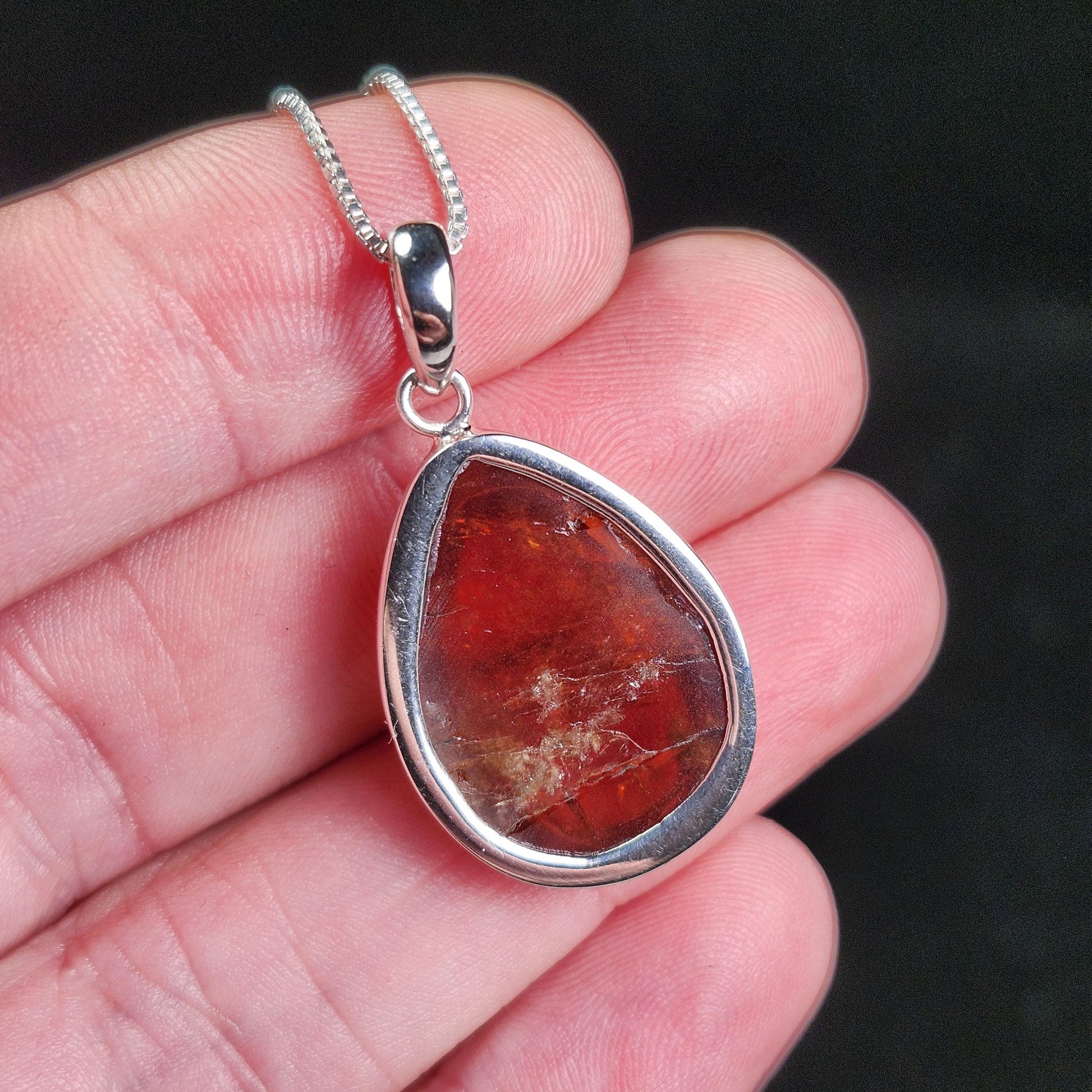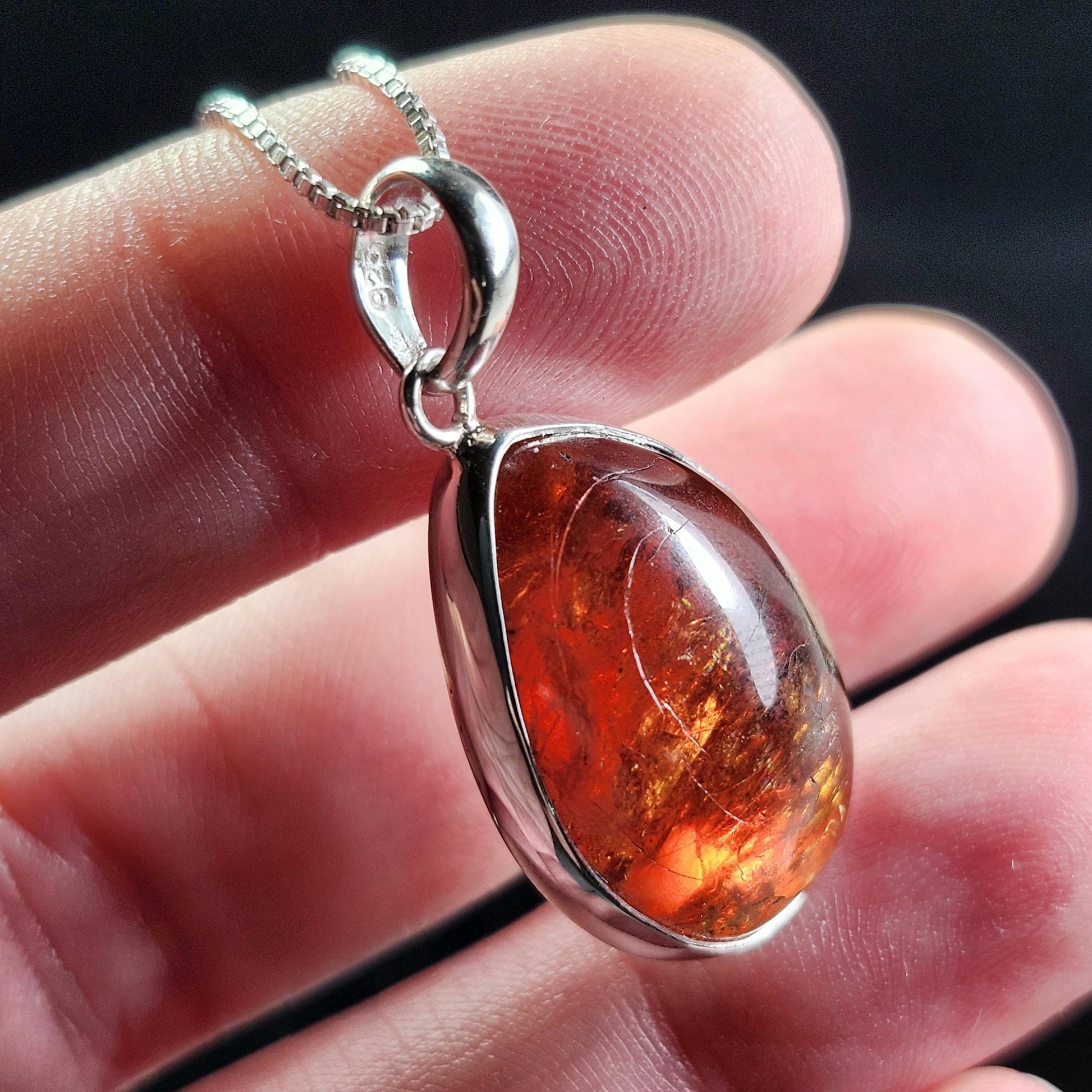 This Garnet crystal has a deep orange translucence and has been polished to a high sheen. This crystal has been custom created into a sturdy piece of jewelry using .925 Sterling Silver. This pendant measures approximately 30mm by 17mm. The silver chain used in the photos is to help envision how this pendant will look while adorned but is not included in the listing.