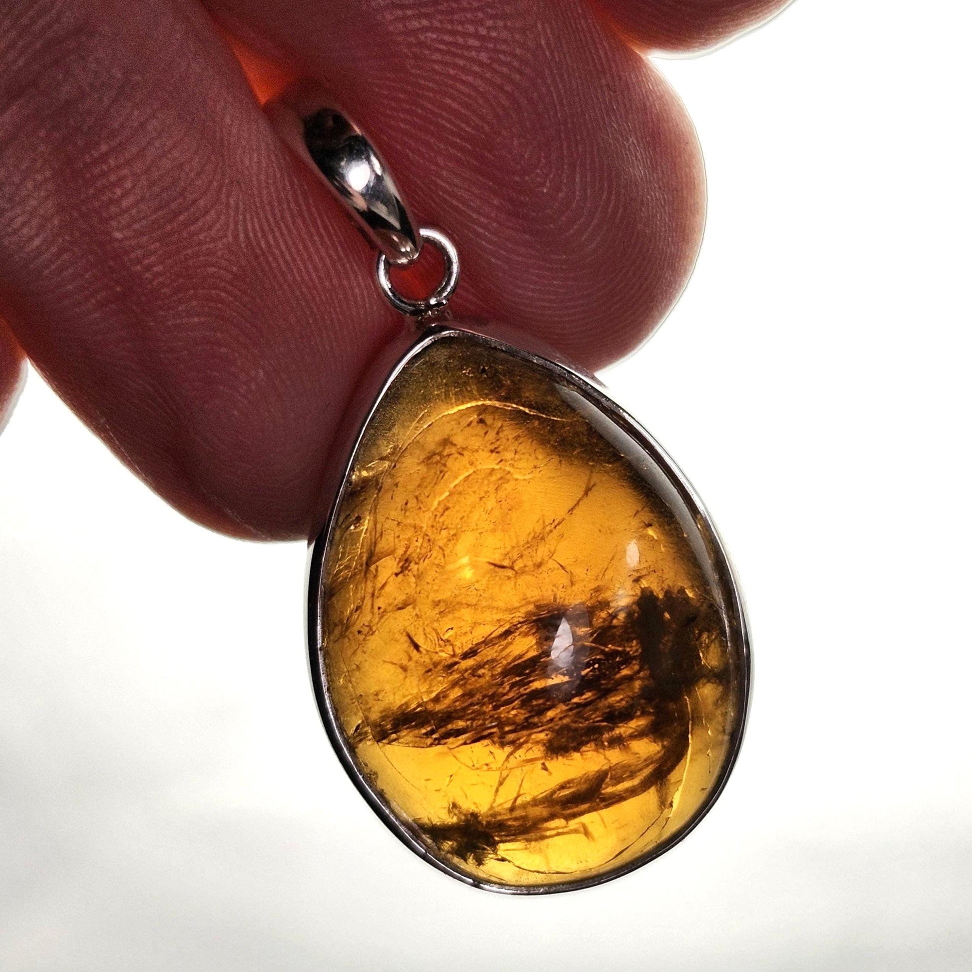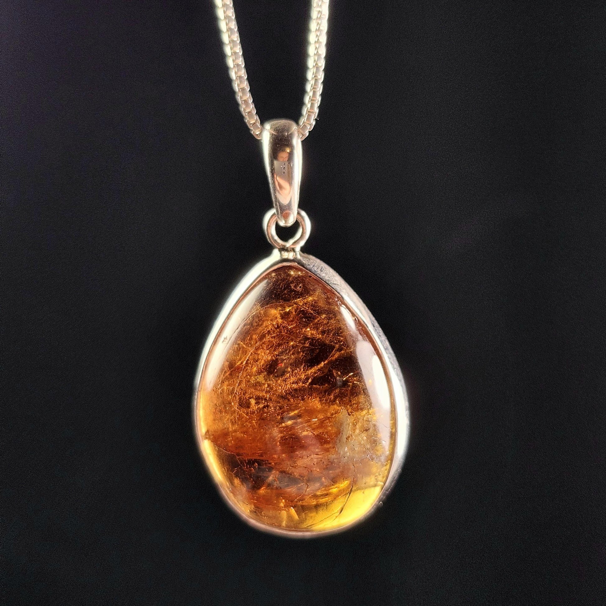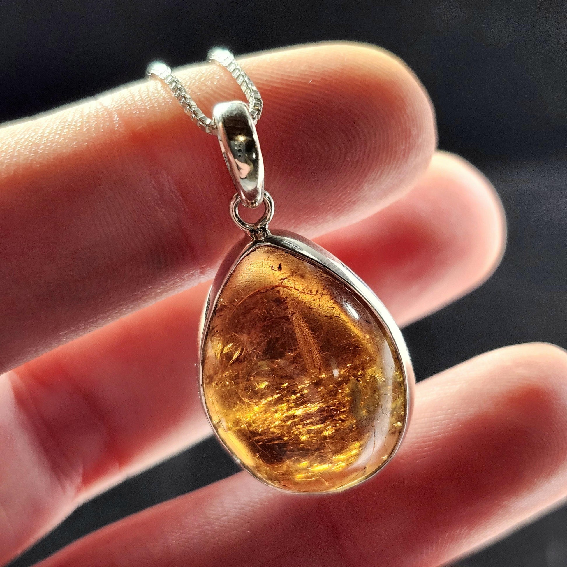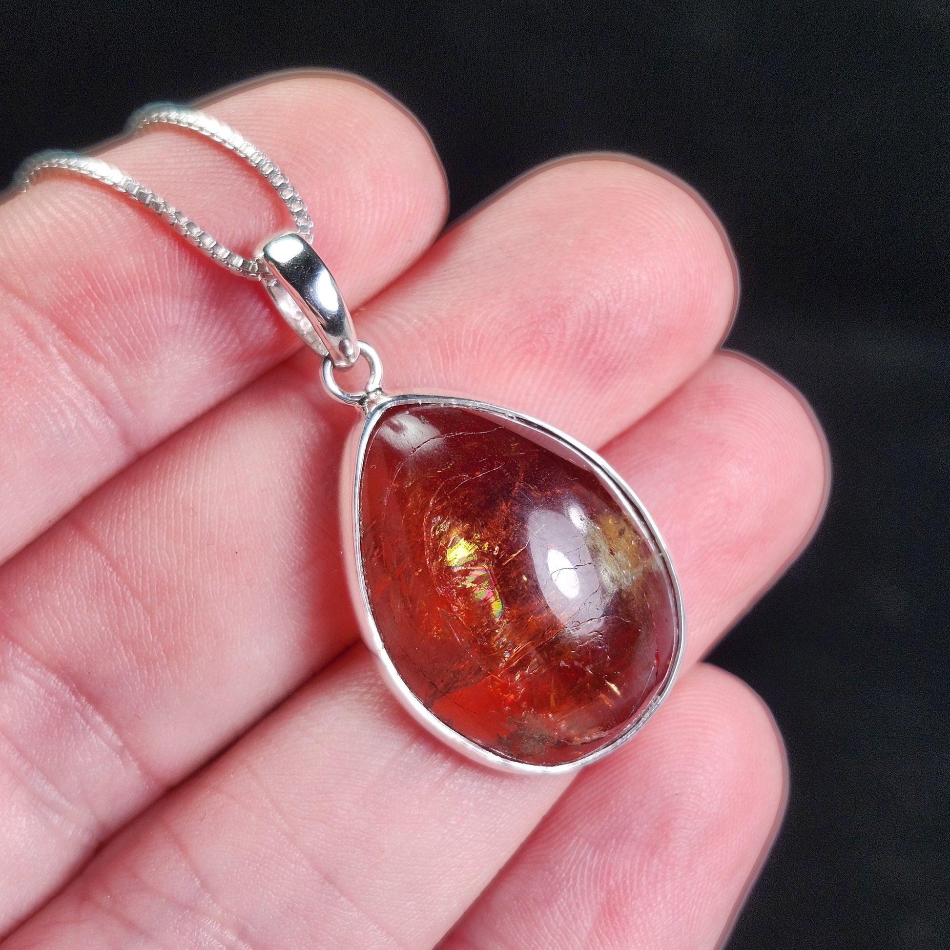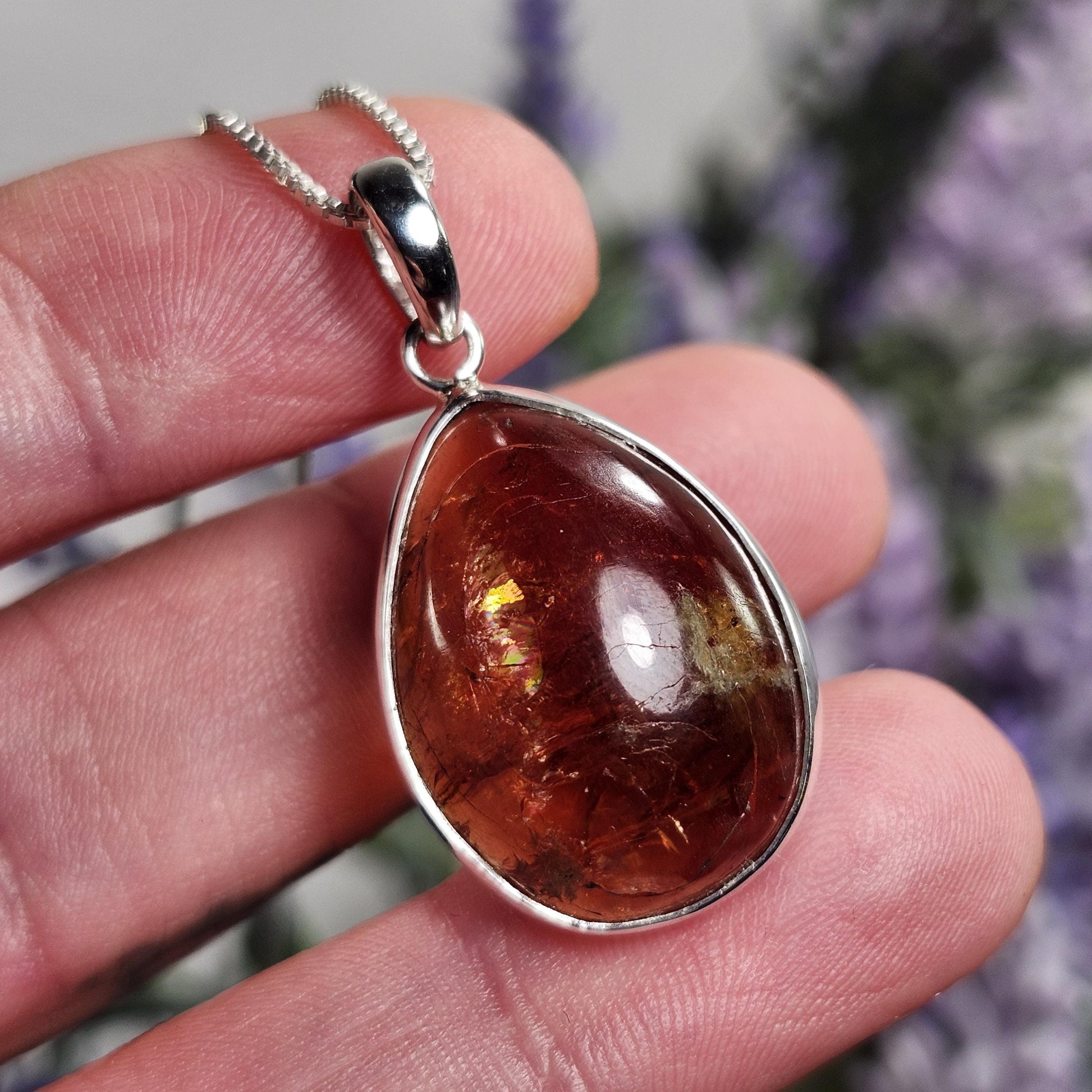 This Garnet crystal has a deep orange translucence and has been polished to a high sheen. This crystal has been custom created into a sturdy piece of jewelry using .925 Sterling Silver. This pendant measures approximately 30mm by 17mm. The silver chain used in the photos is to help envision how this pendant will look while adorned but is not included in the listing.