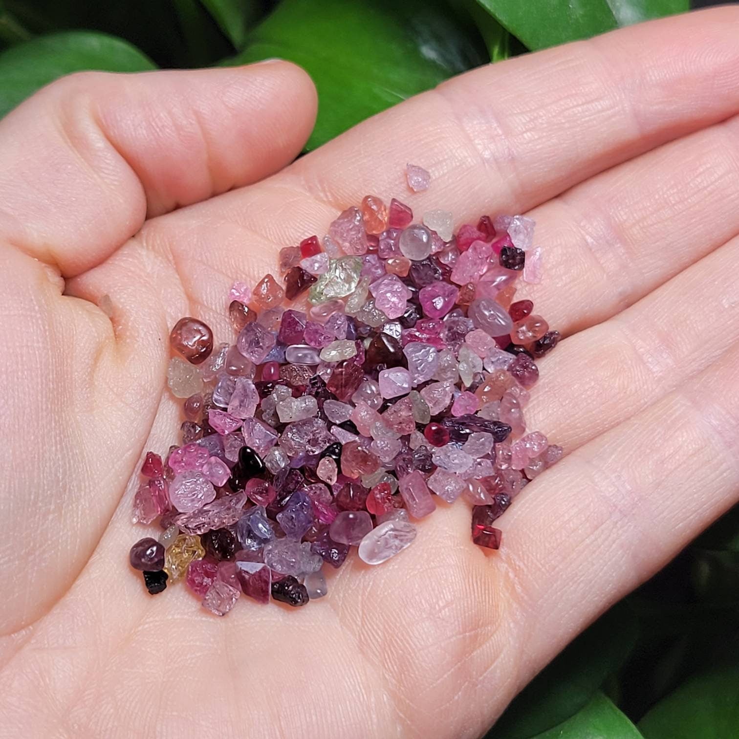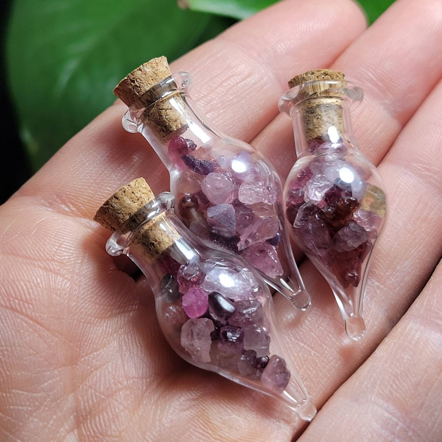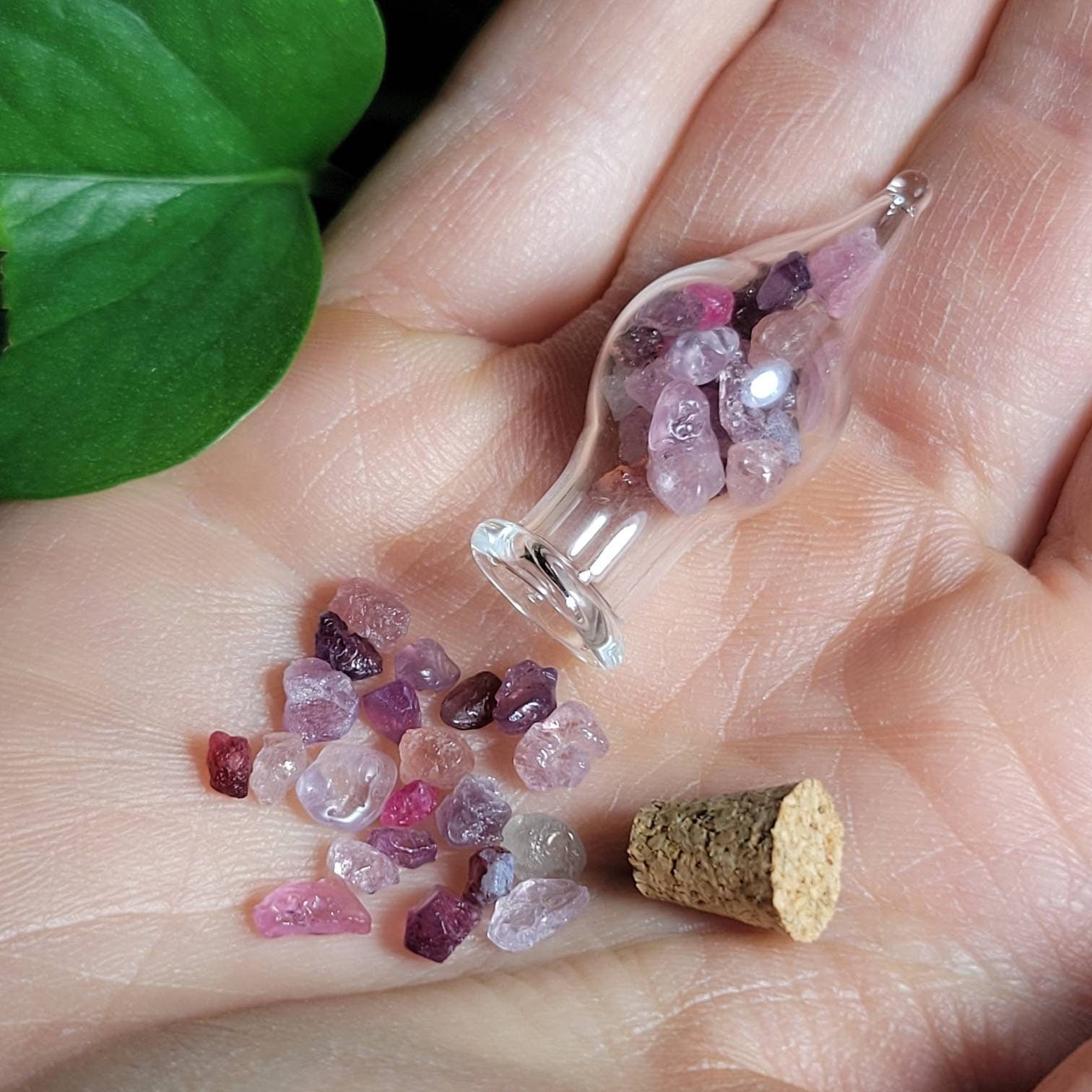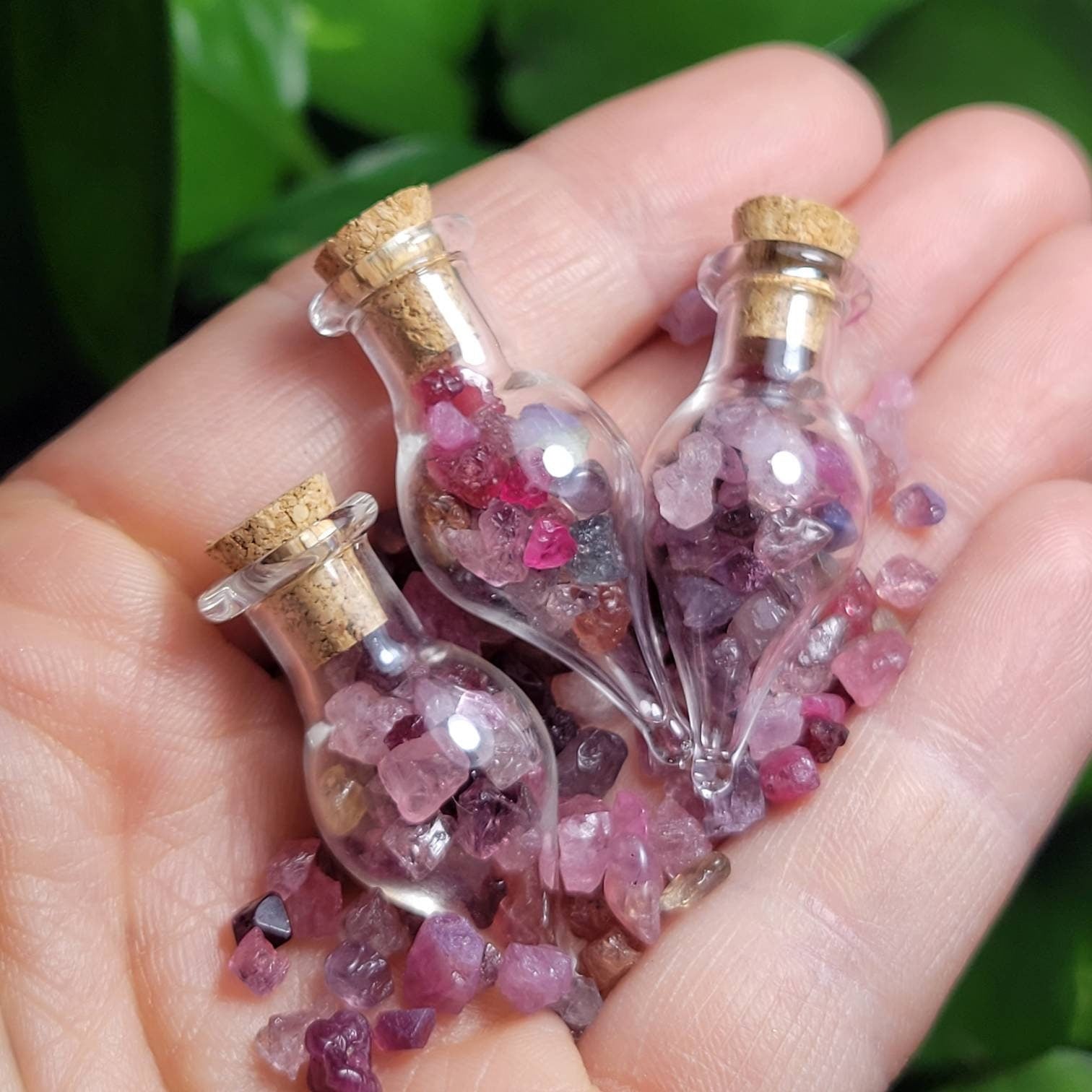 This listing is for ONE (1) Glass Jar with Spinel crystals. These Spinel crystals are raw and range in color from deep burgundy to juicy pink and pale lavender. These gorgeous crystals each measure approximately 1mm to 3mm. These authentic crystals are set into a glass jar and secured with a cork top. The teardrop shaped jars are made of blown glass with a small cork that can be removed to have access to the chips. Each jar measures approximately 30mm by 15mm. *The glass jars are fragile and should be handled with care!