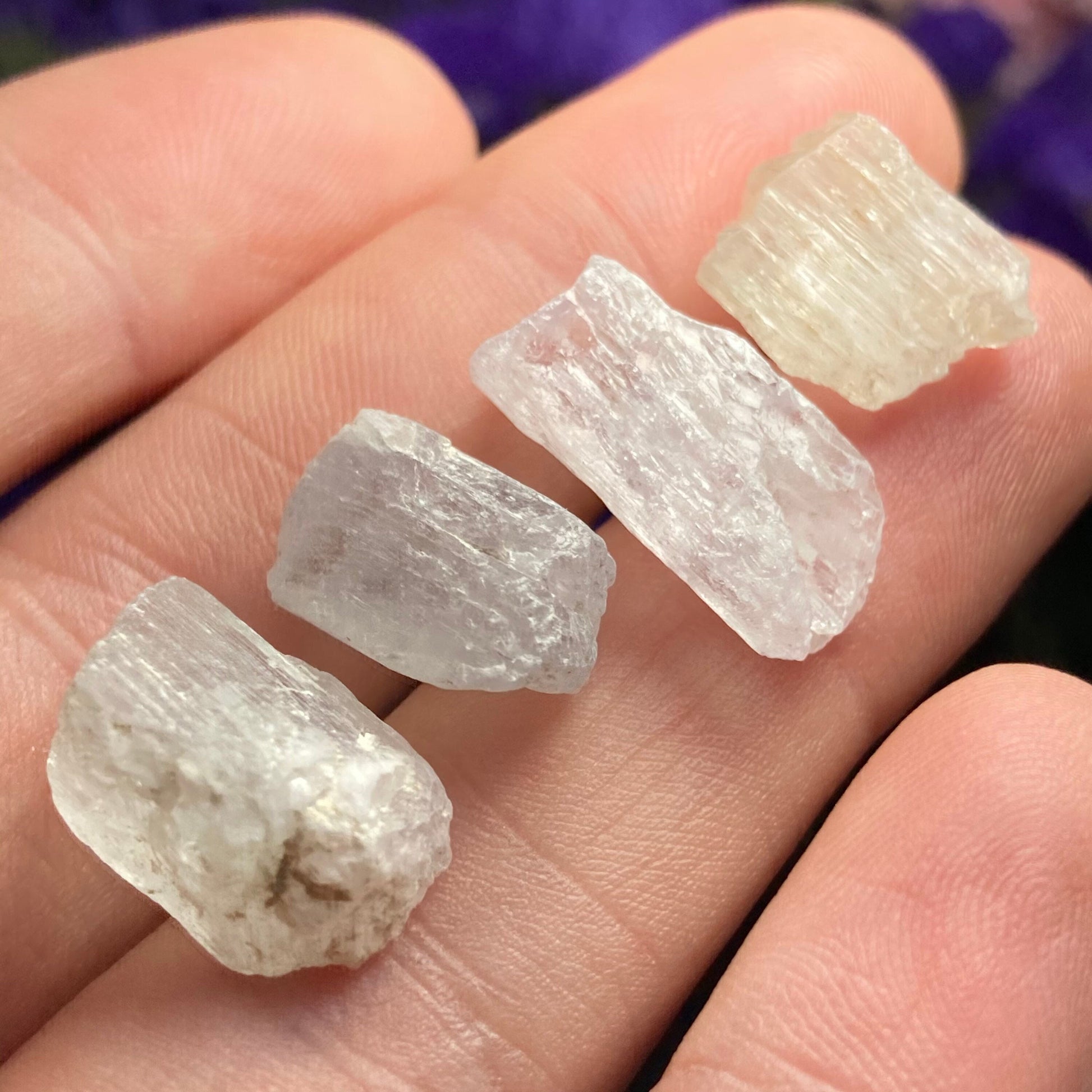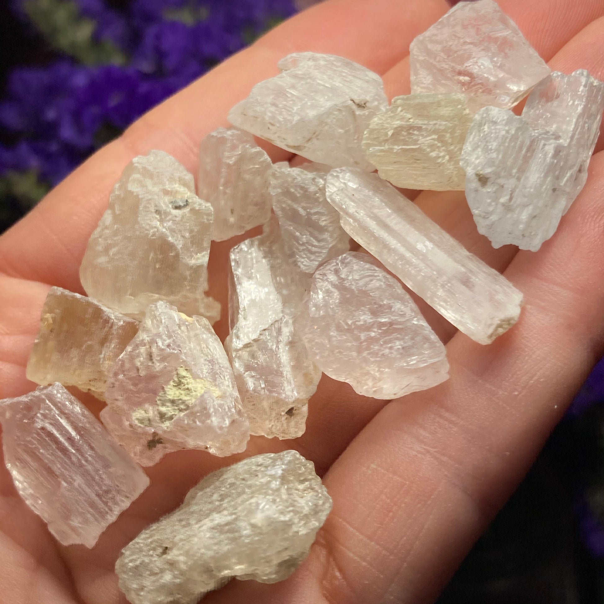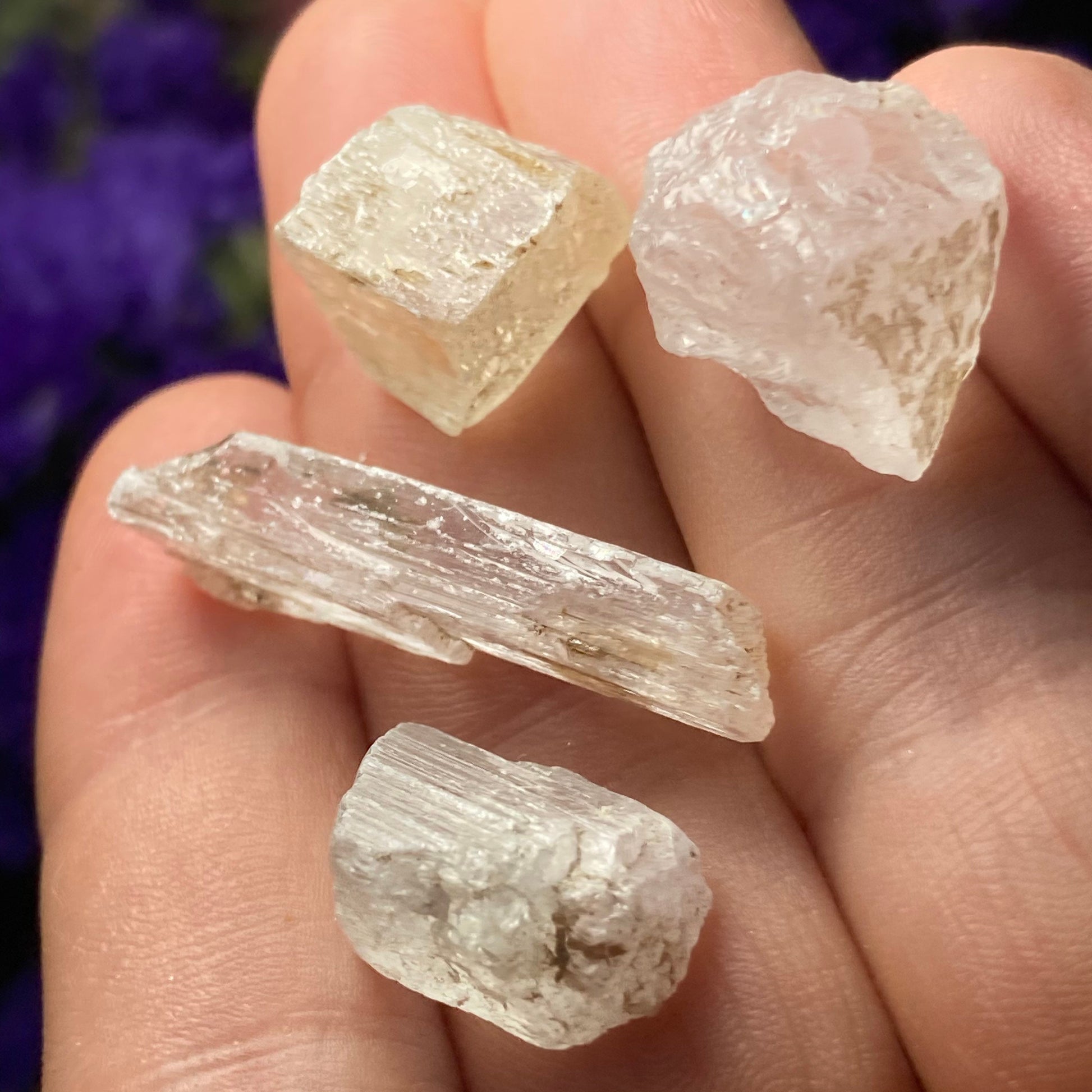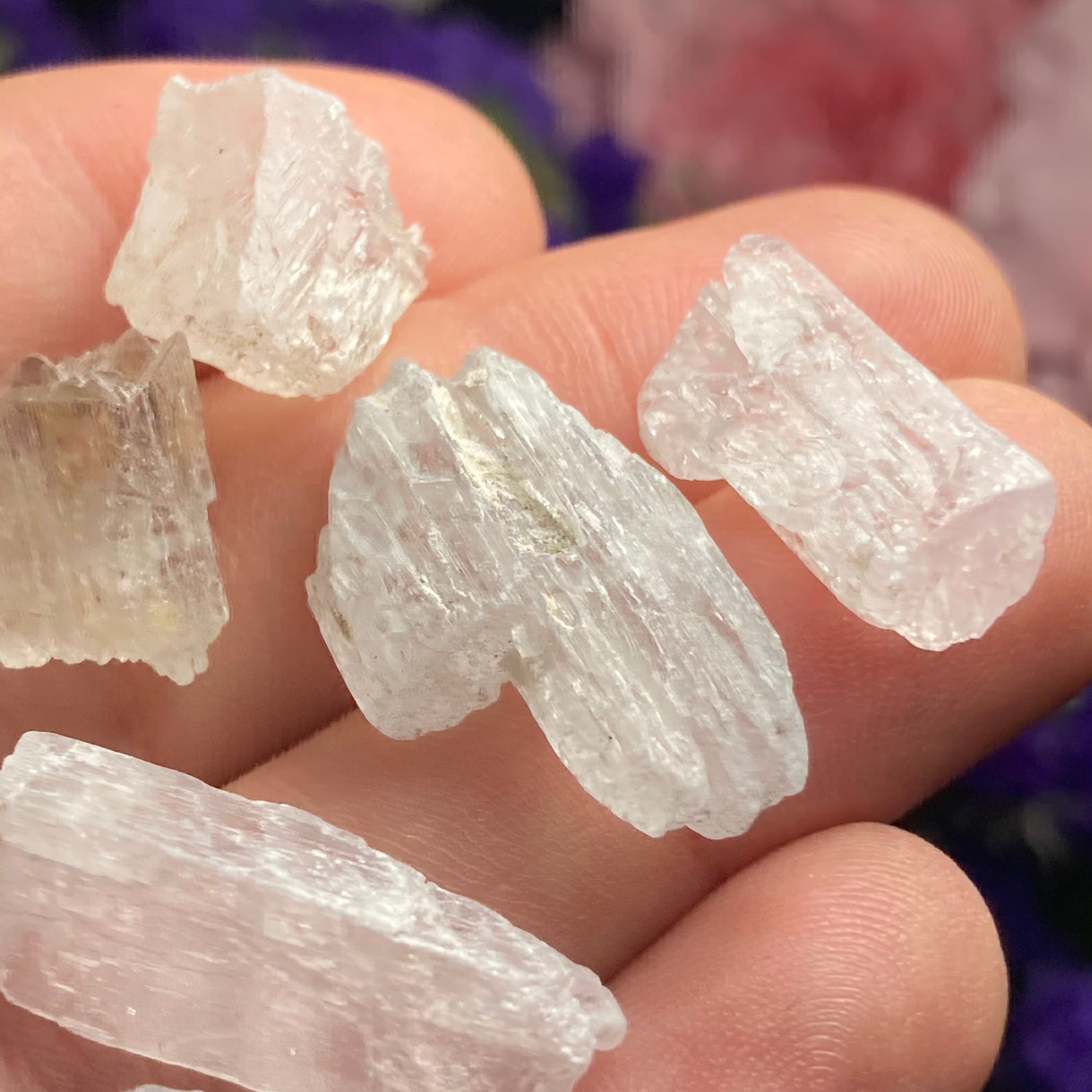These raw Spodumene crystals exhibit shining striations, glowing translucence, and some termination. They display a range of colorless to faint, pastel hues including pinks, greens, and blues - also known as Kunzite and Hiddenite!