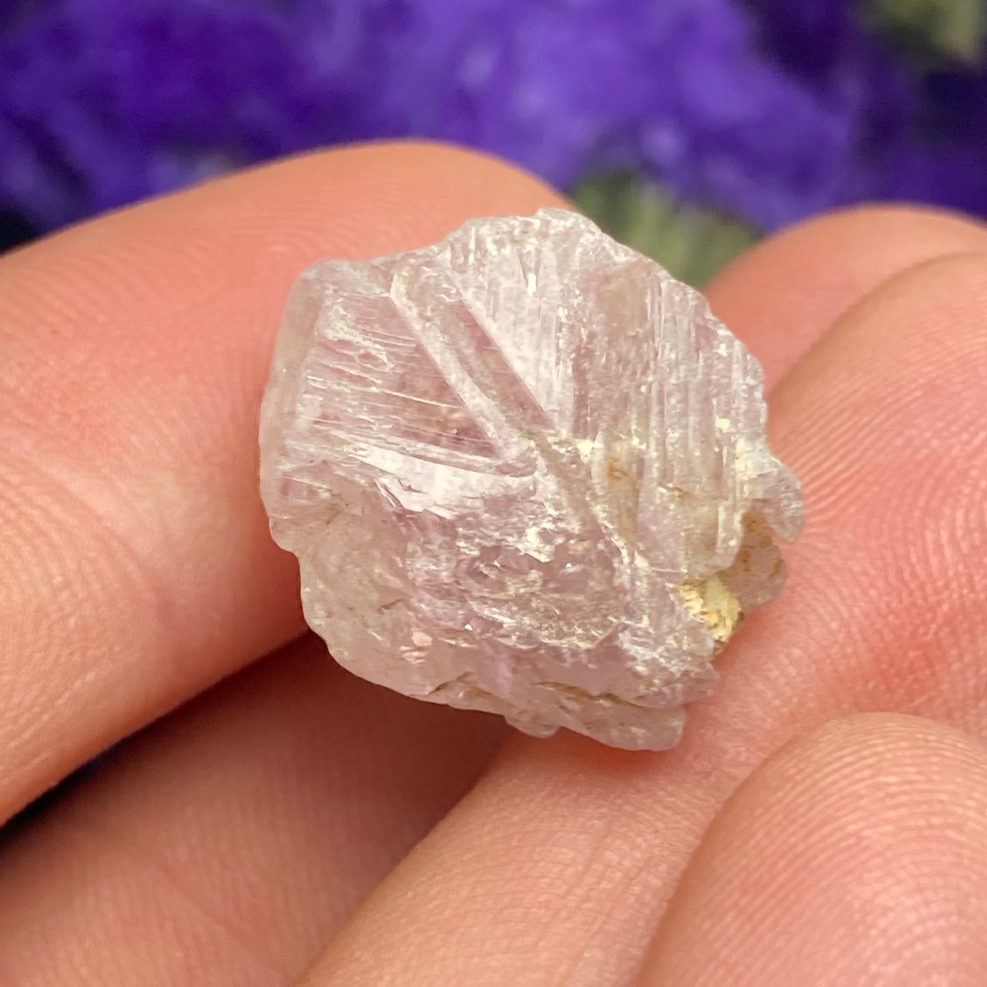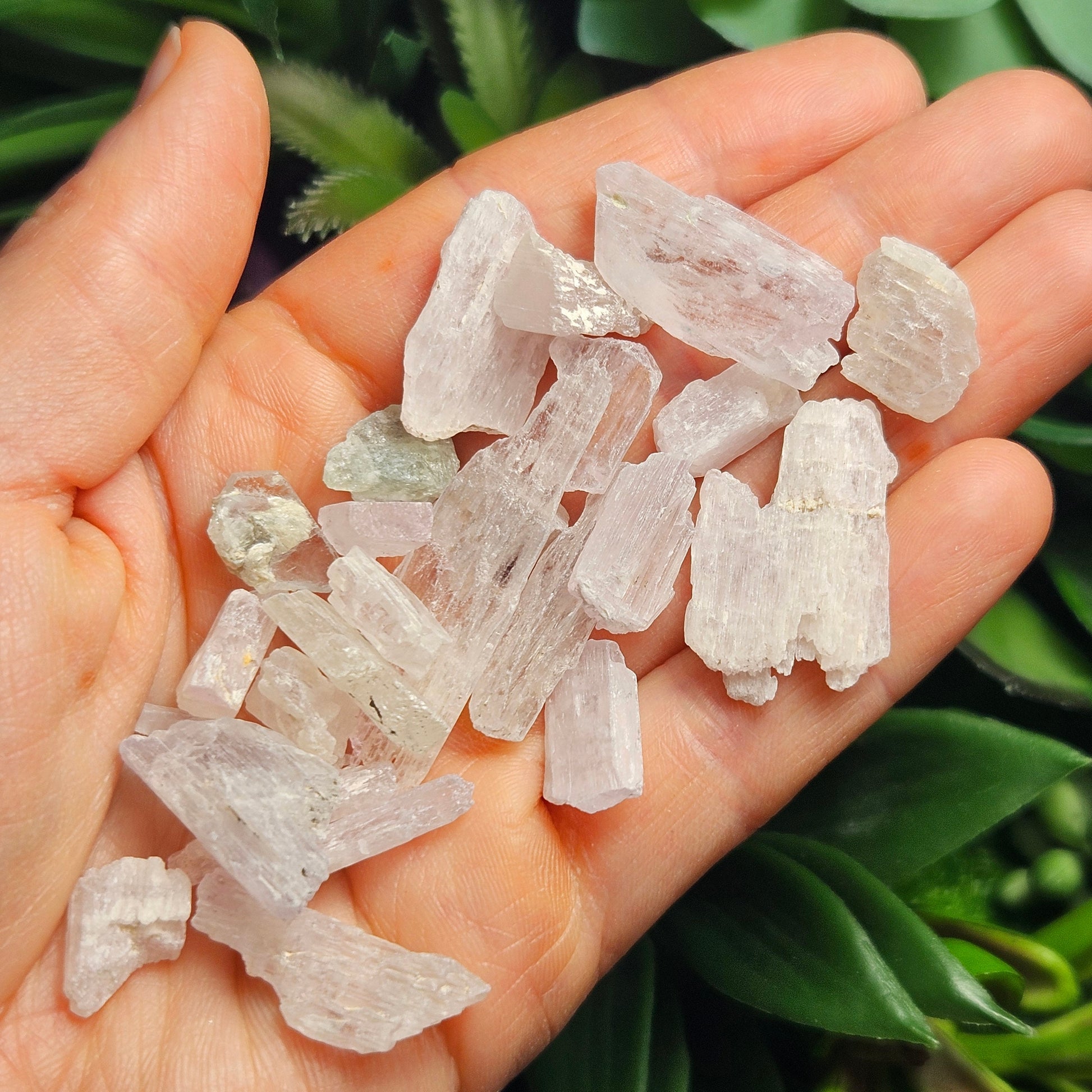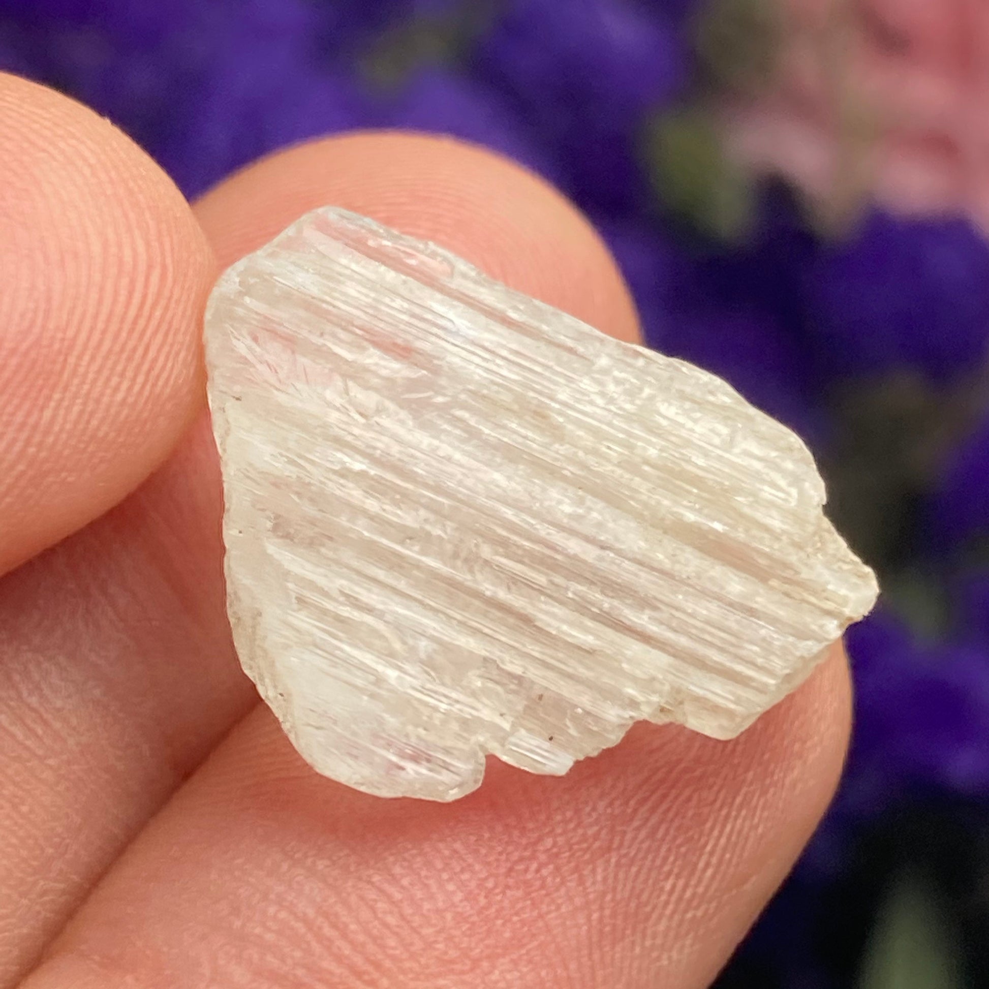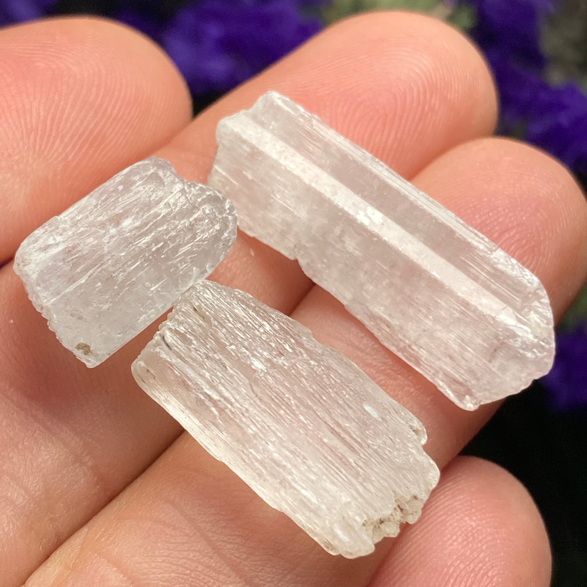 These raw Spodumene crystals exhibit shining striations, glowing translucence, and some termination. They display a range of colorless to faint, pastel hues including pinks, greens, and blues - also known as Kunzite and Hiddenite!