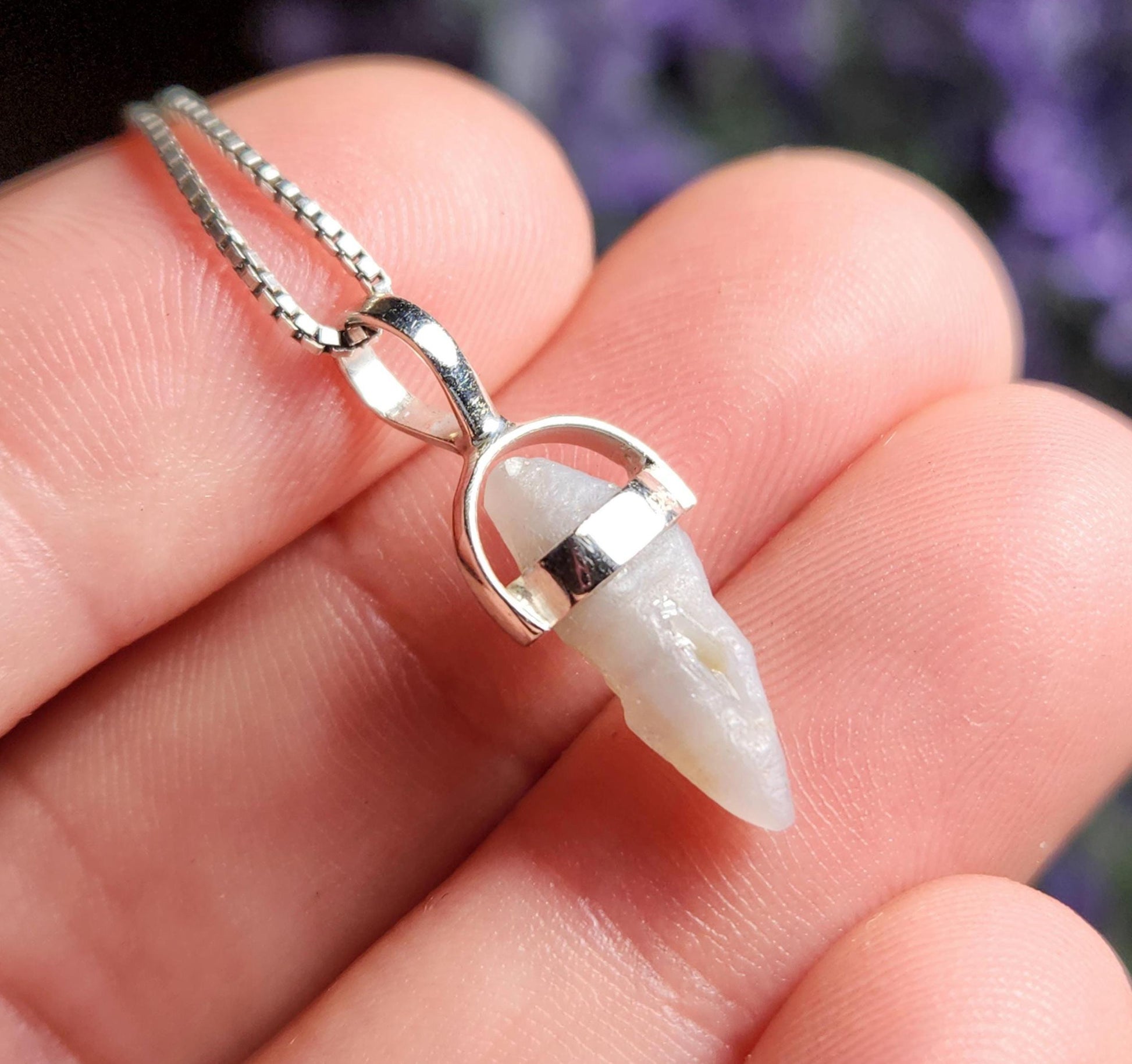 This raw, terminated Sapphire from Sri Lanka exhibits a light blue translucence. This gem is from an older find in the 90's, recently released from a private collection! This crystal has been handpicked and processed into a sturdy piece of jewelry using .925 Sterling Silver. This pendant measures approximately 22mm by 8mm. The silver chain used in the photos is to help envision how this pendant will look while adorned but is not included in the listing.
