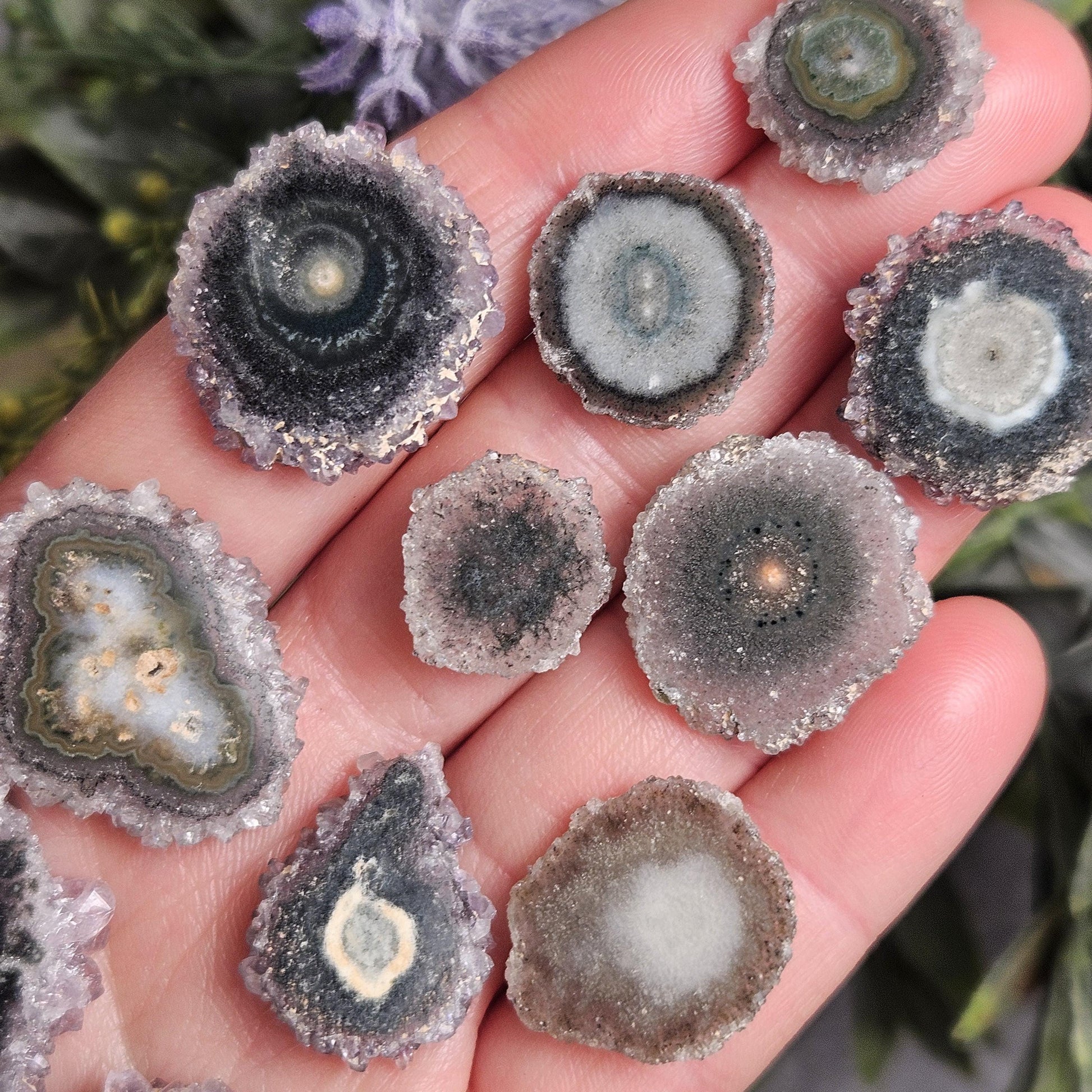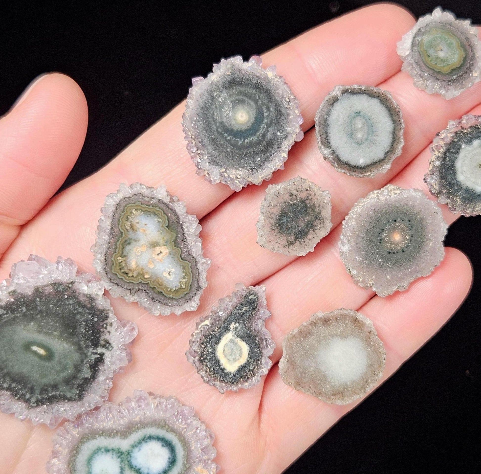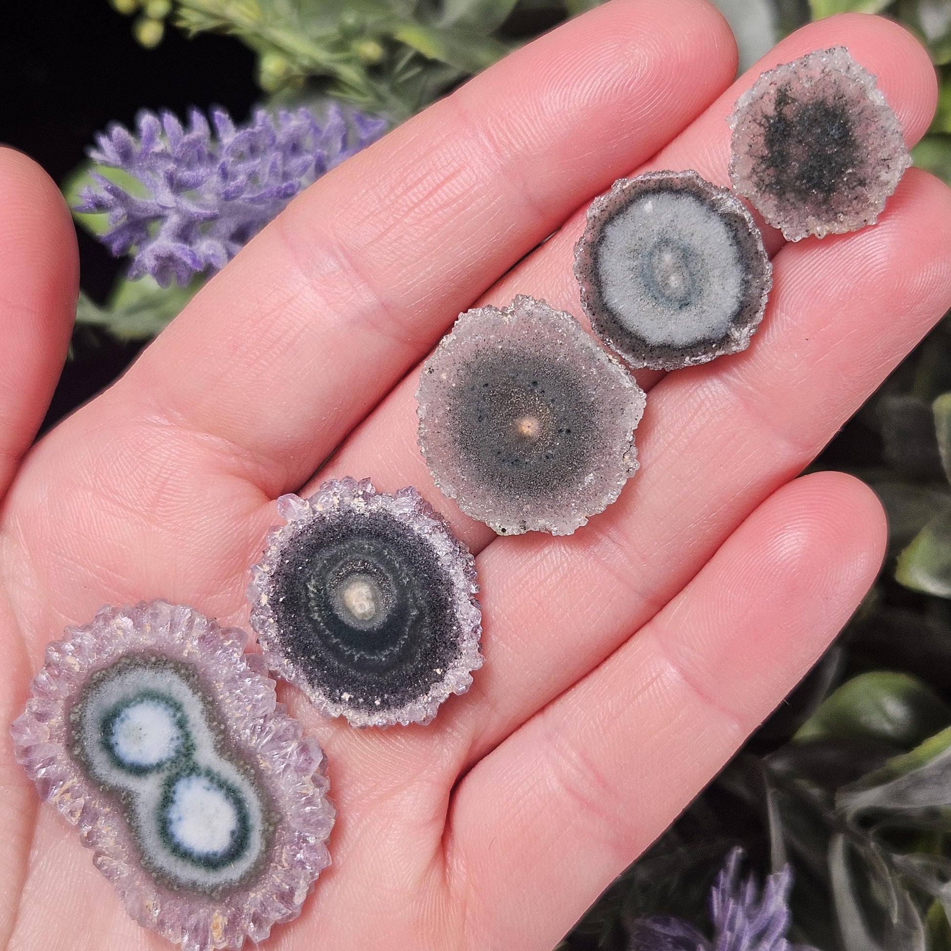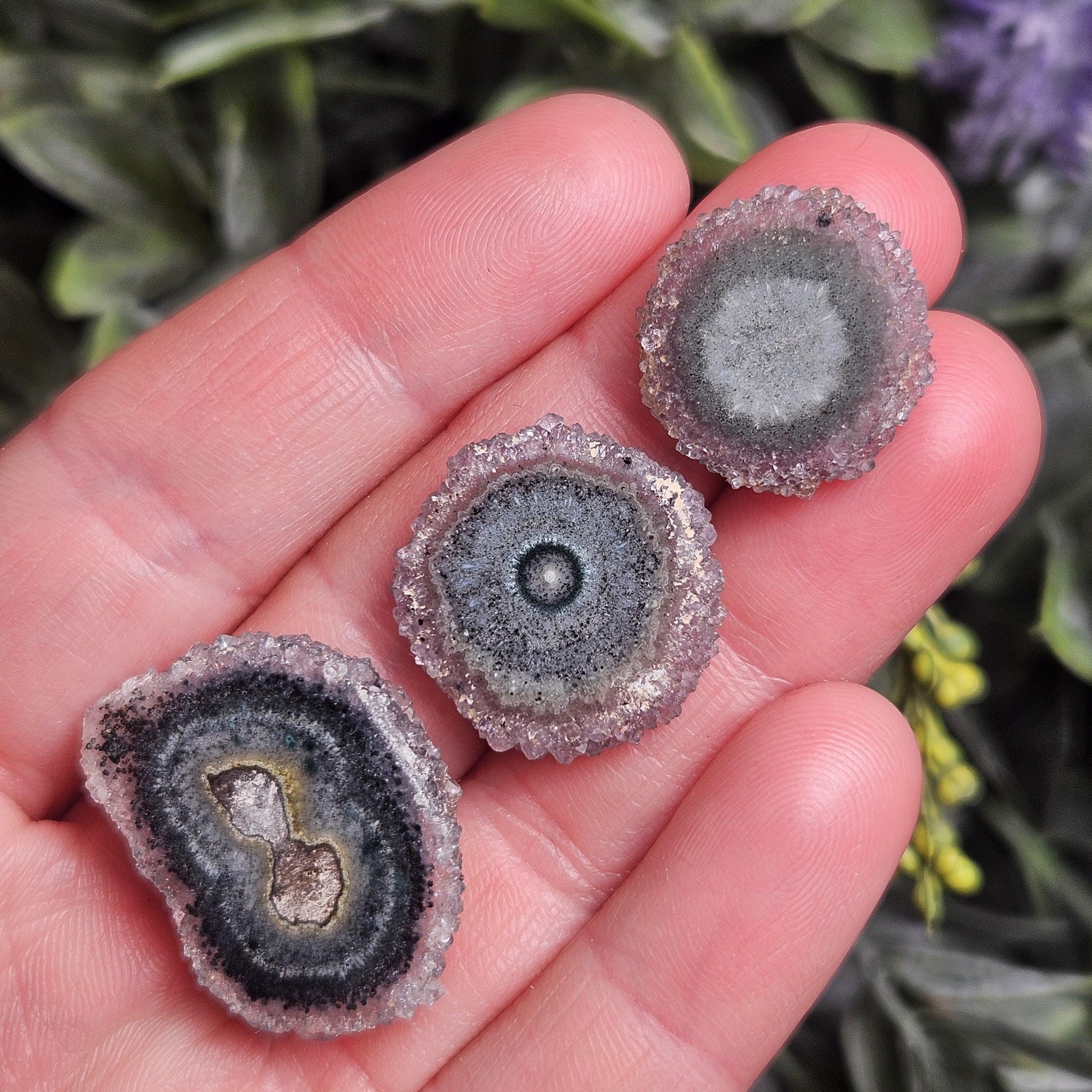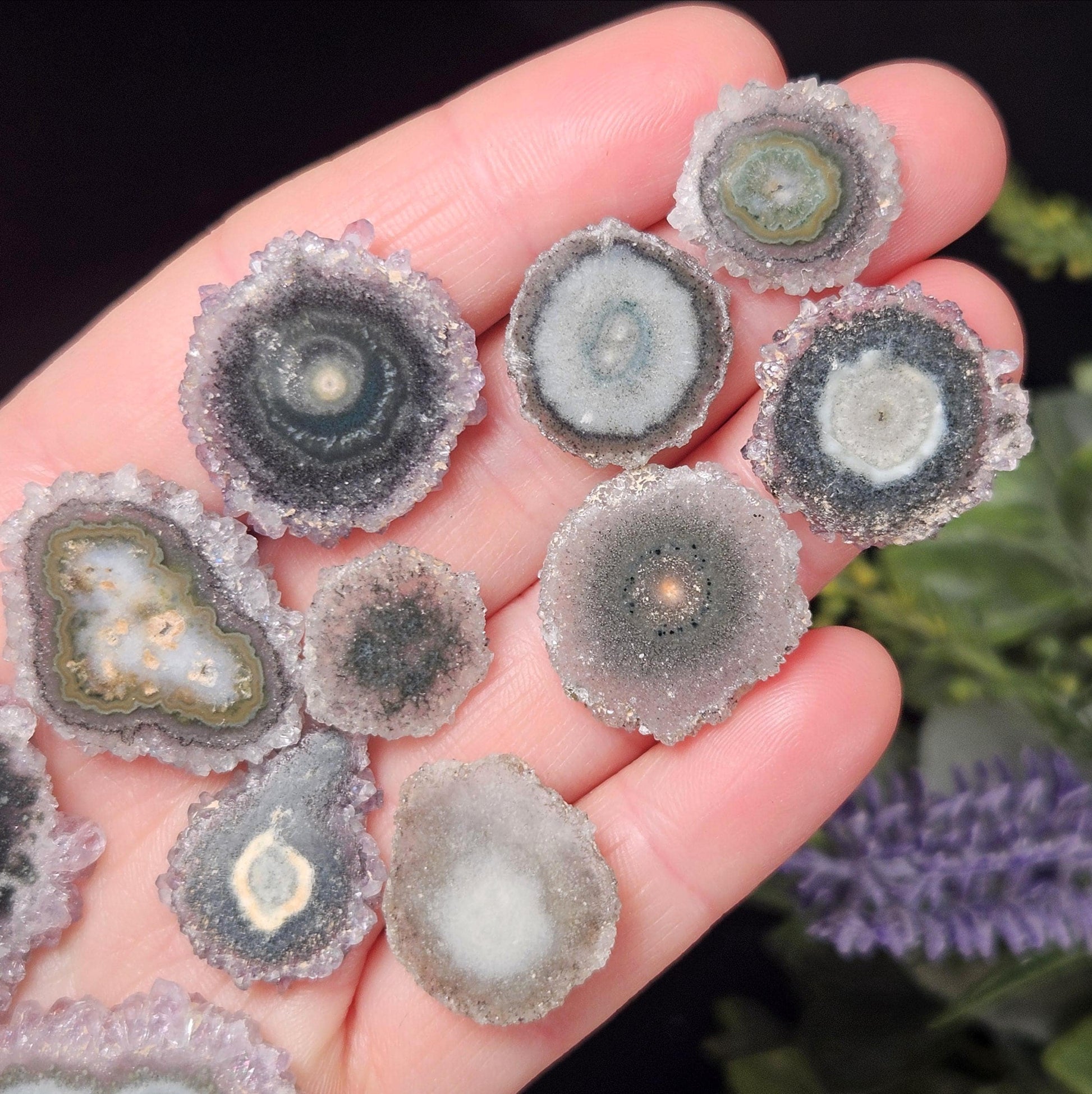 These unique Stalactite Slices have been polished to a high sheen and exhibit raw edges of crystallization. With a range of patterns and concentric lines, each unique specimen has its own charm. Some of these have grey-purple tones, some have bright blue or green cores, and each is a unique individual.