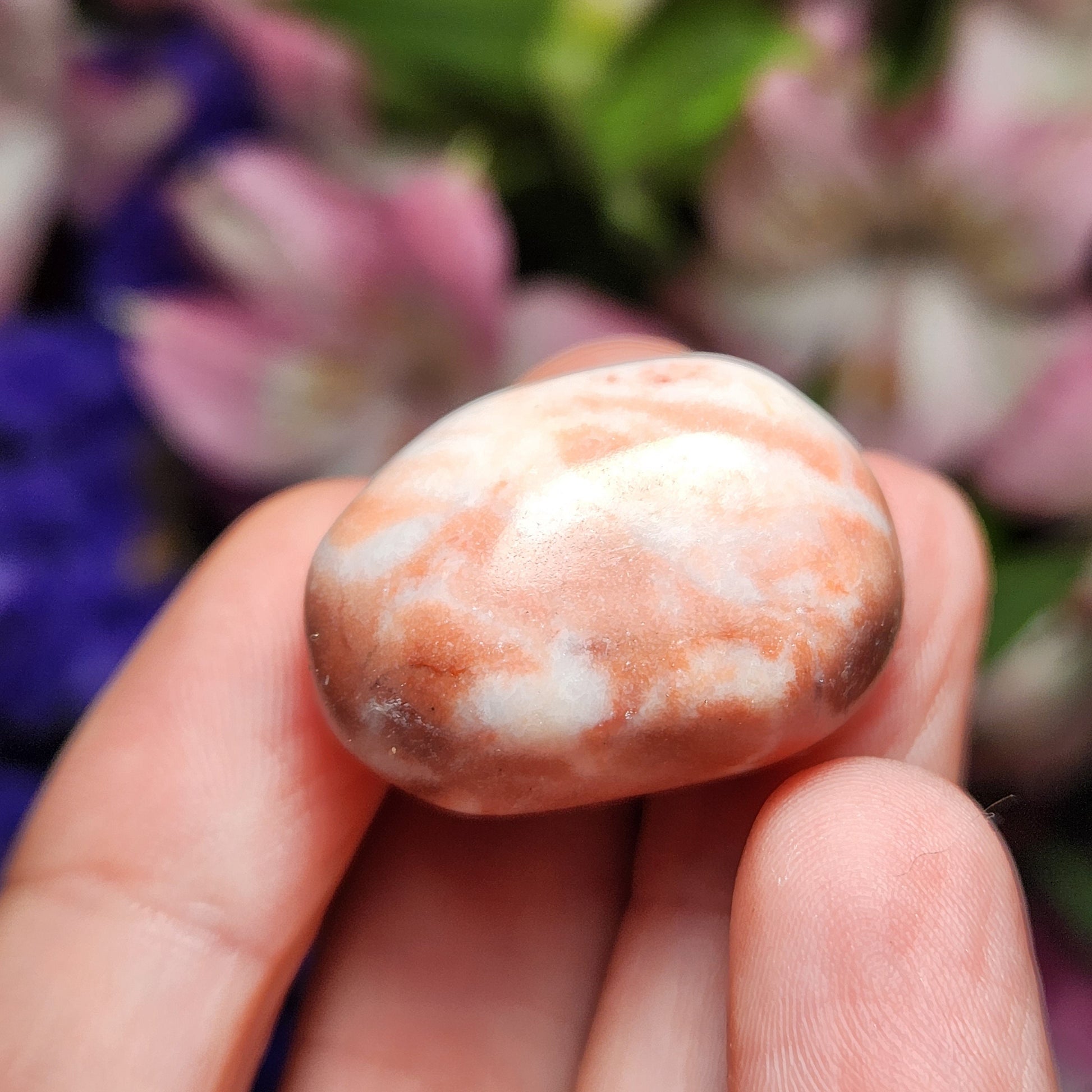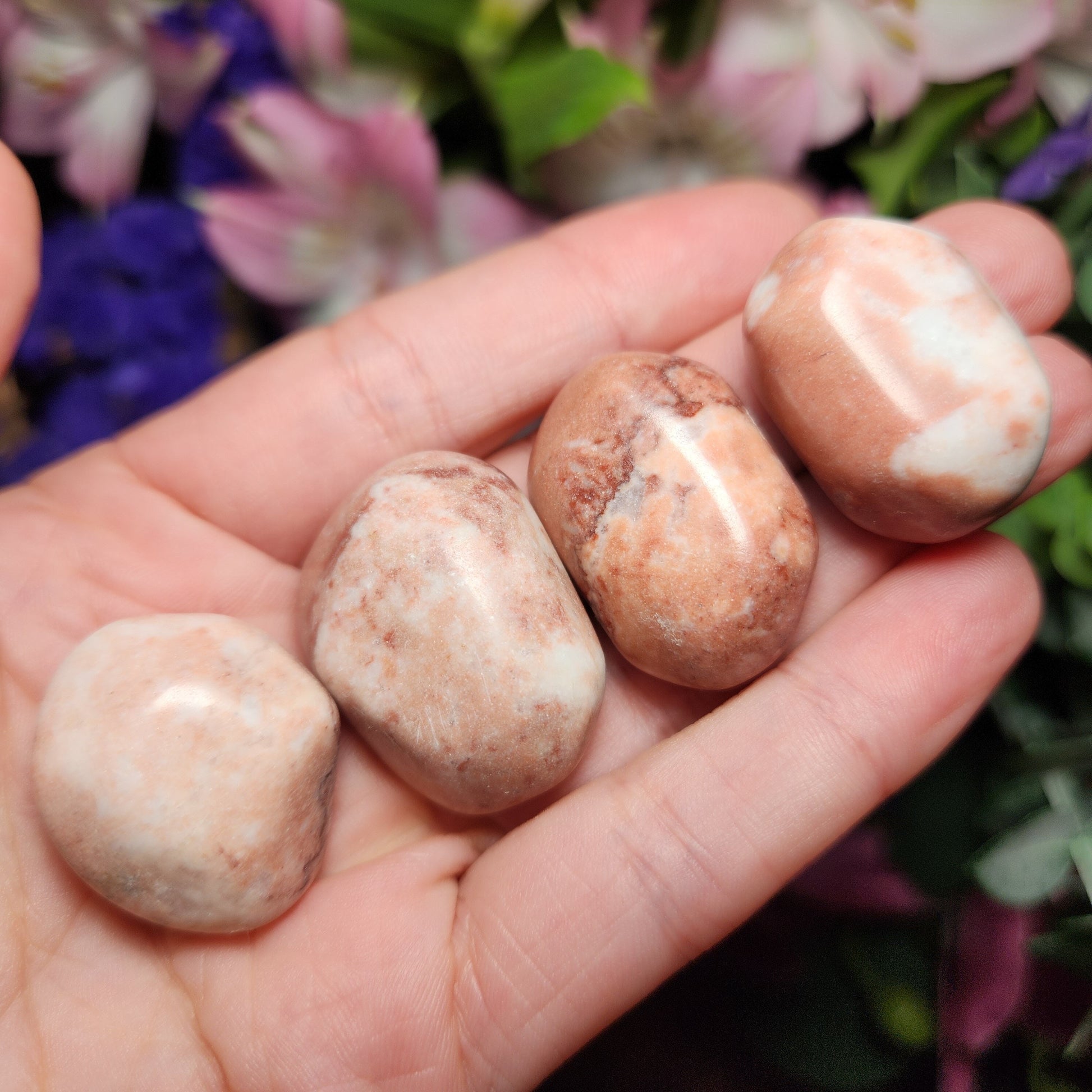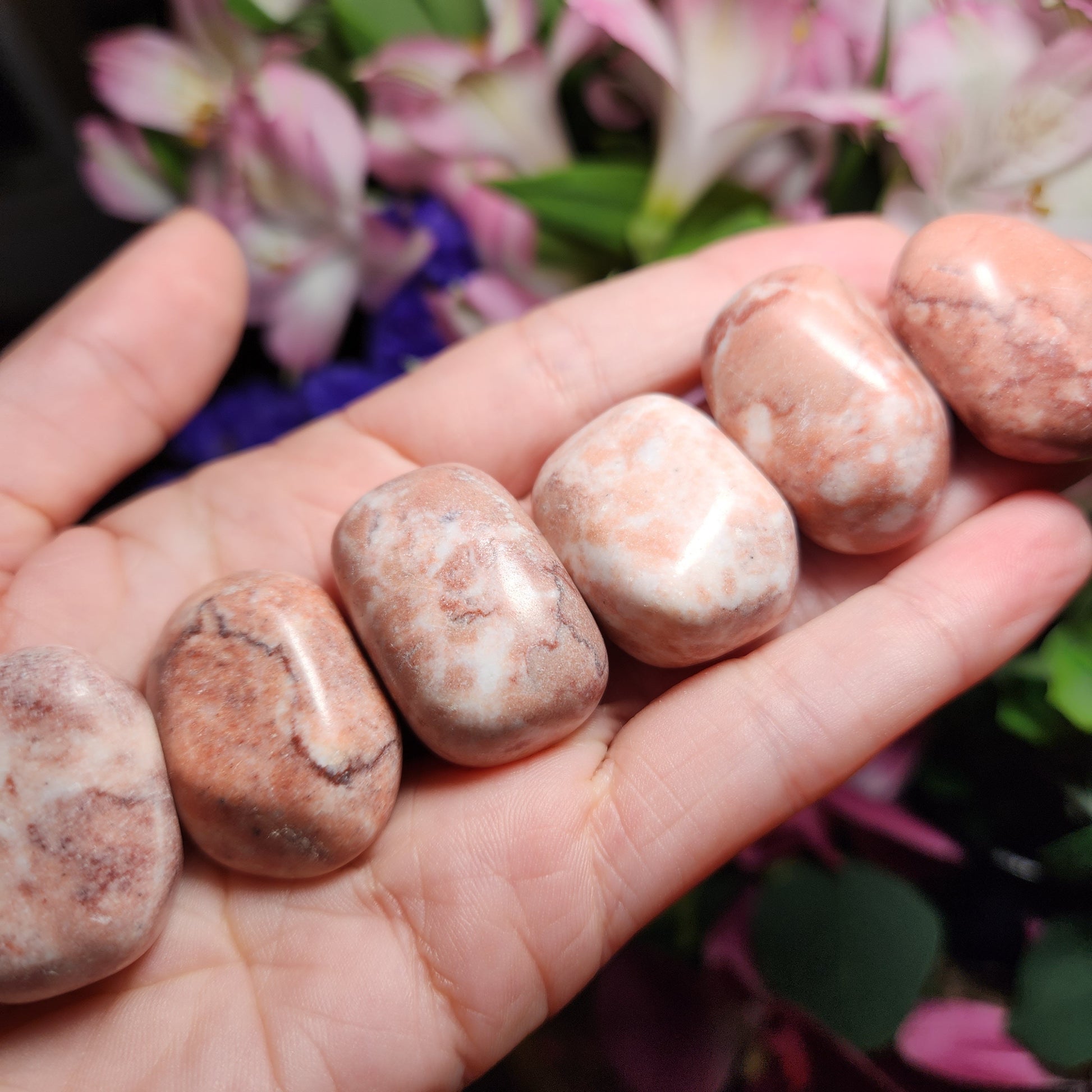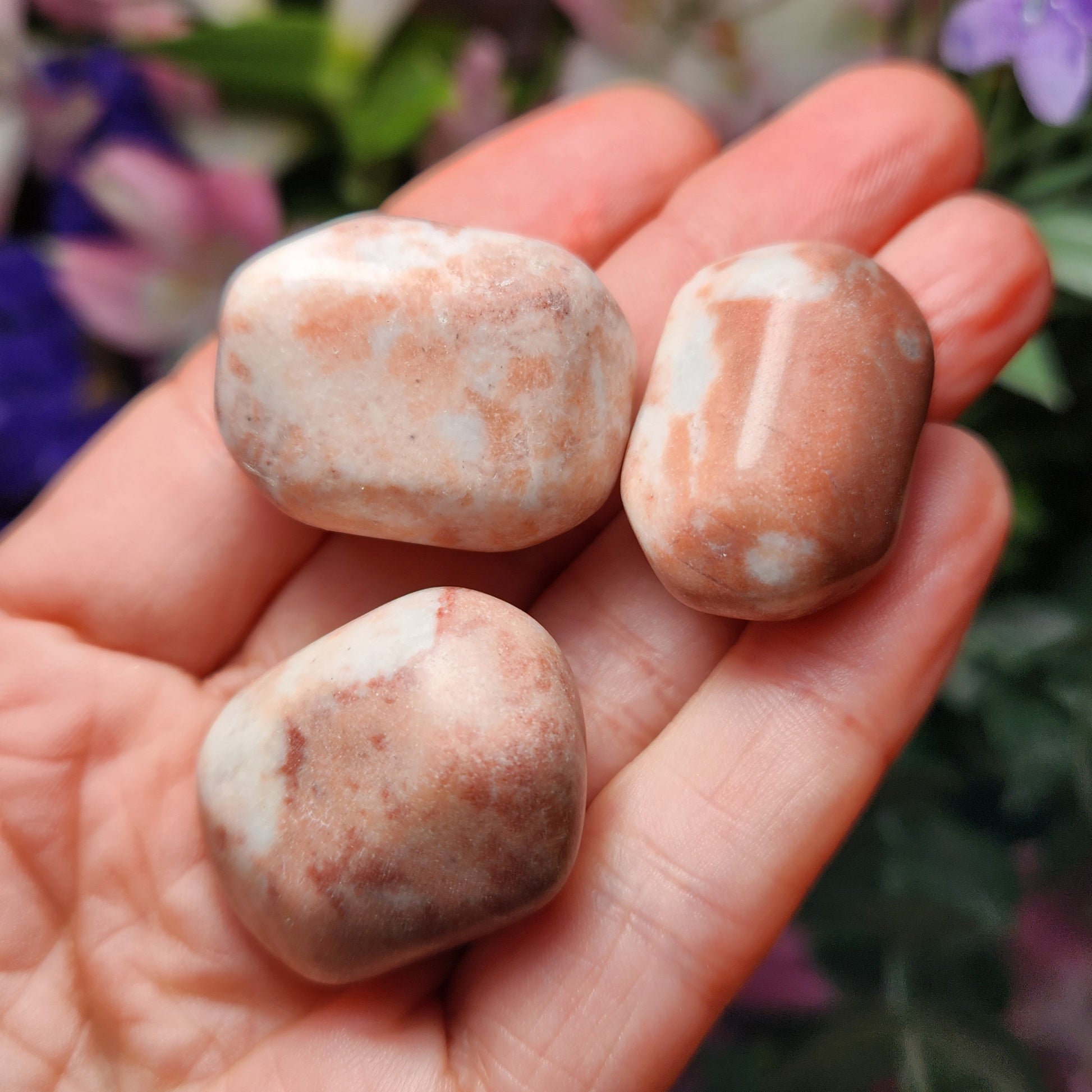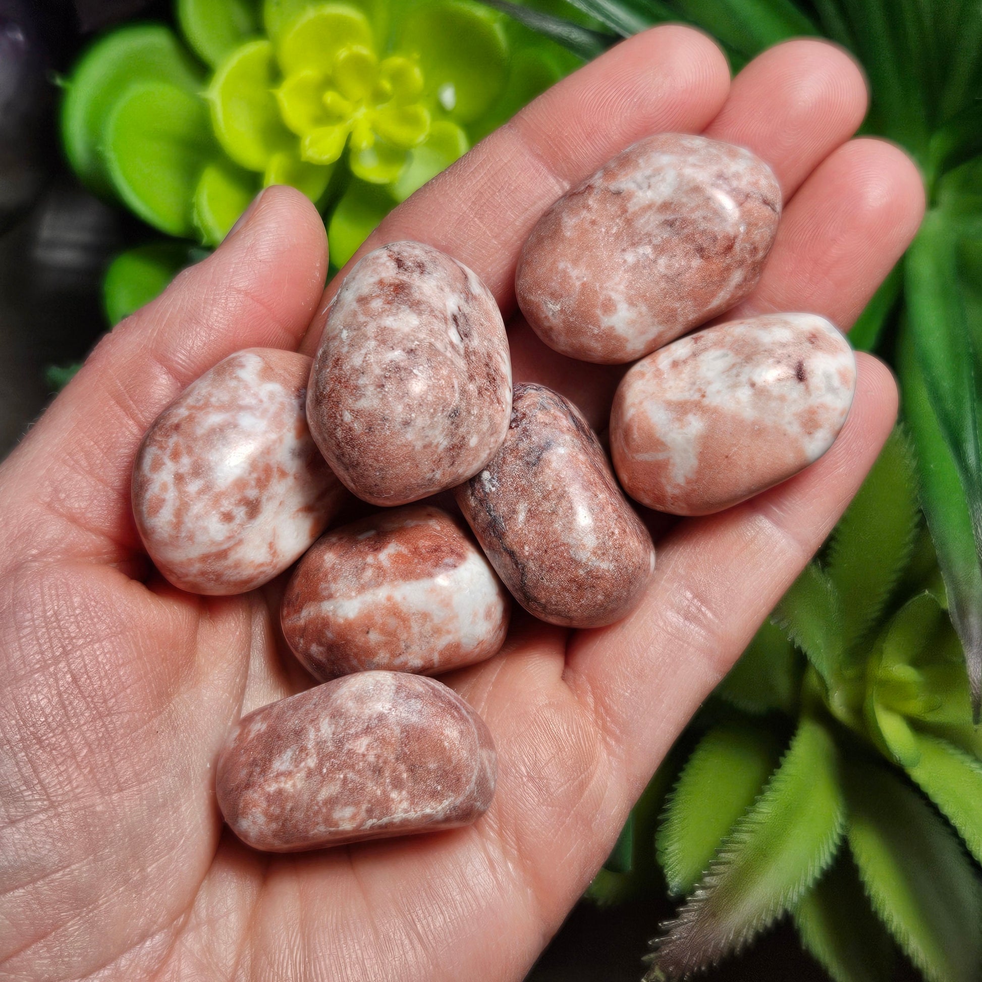 These Strawberry Onyx crystals have been tumbled to a high polish. They exhibit a salmon pink coloring mottled with white. Each specimen measures approximately 3/4 of an inch and up.
