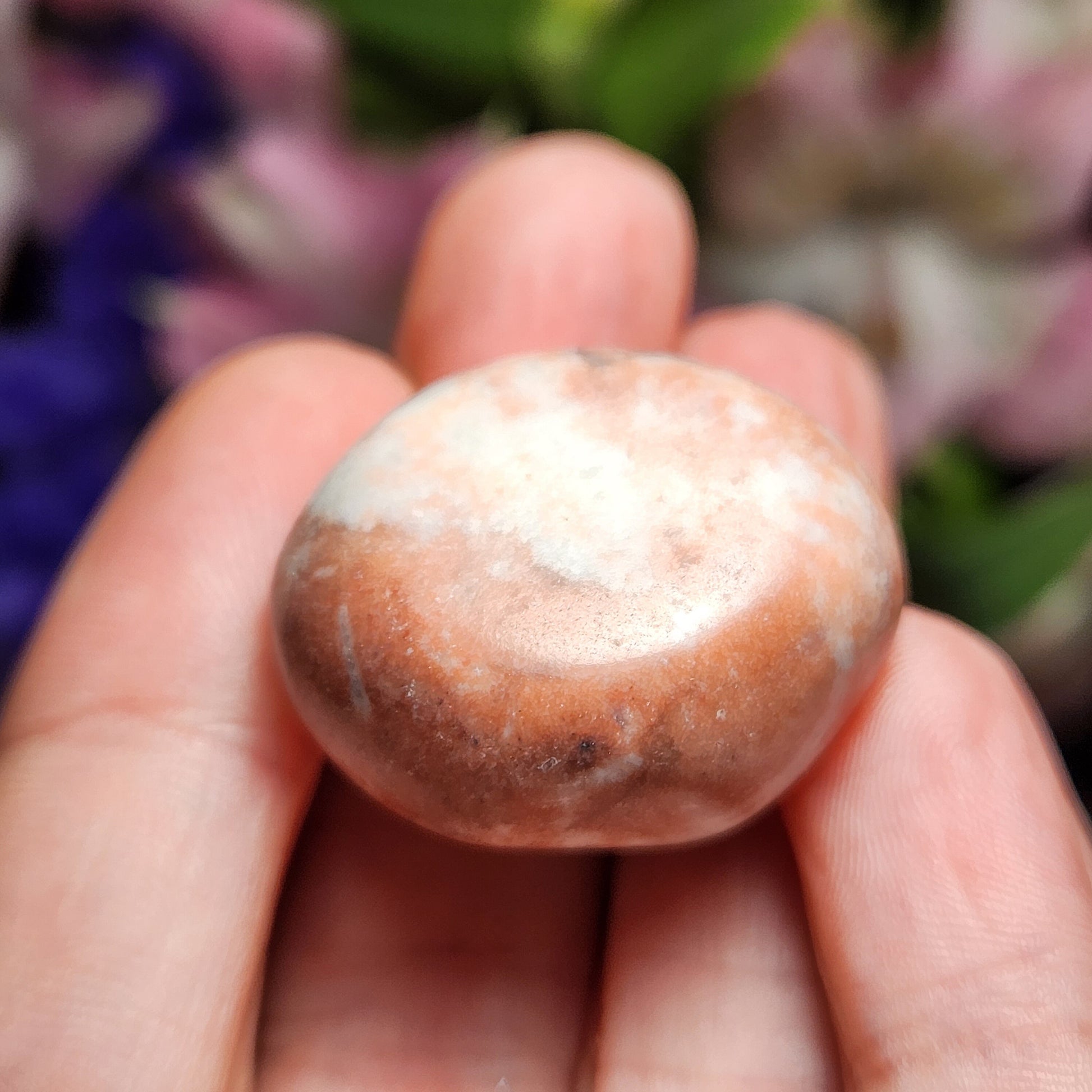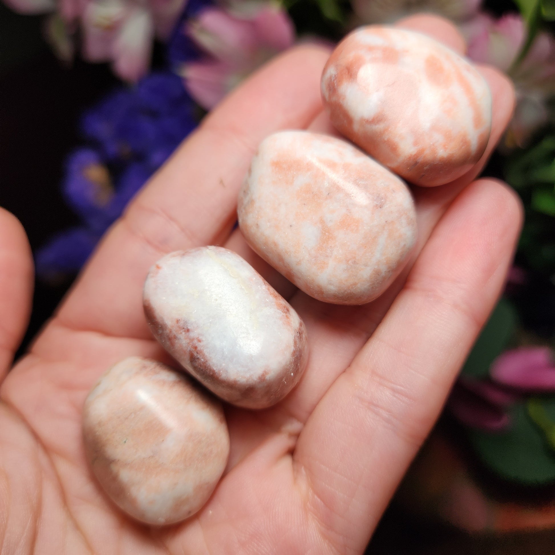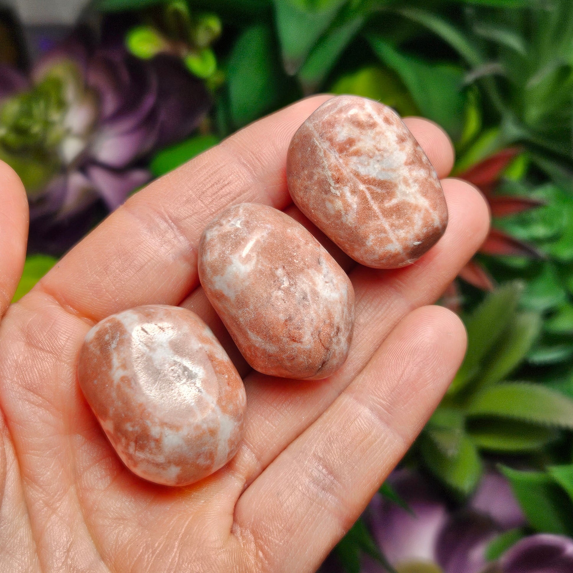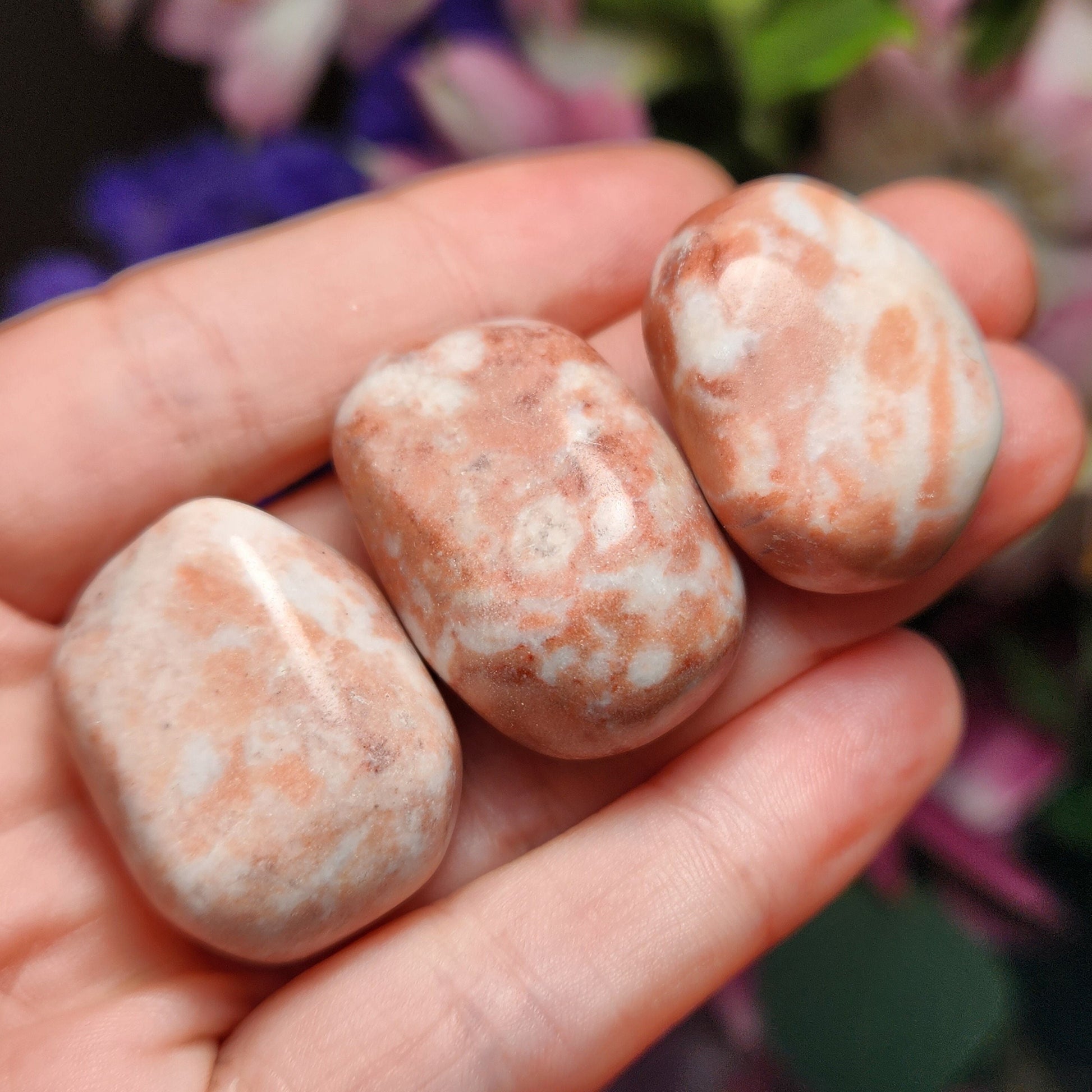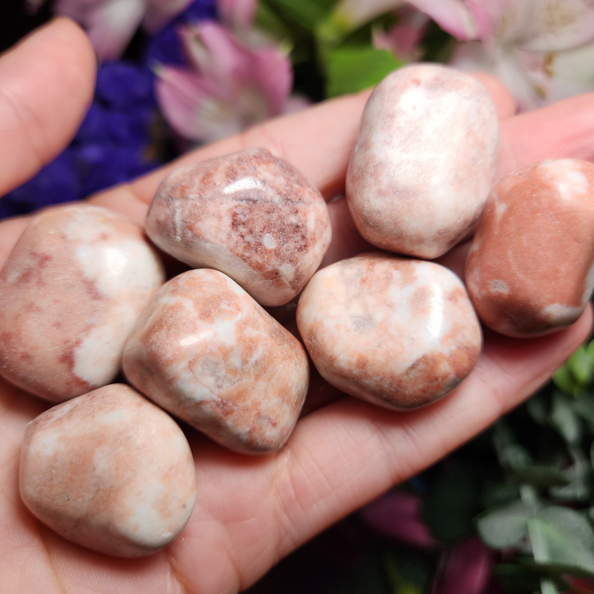 These Strawberry Onyx crystals have been tumbled to a high polish. They exhibit a salmon pink coloring mottled with white. Each specimen measures approximately 3/4 of an inch and up.