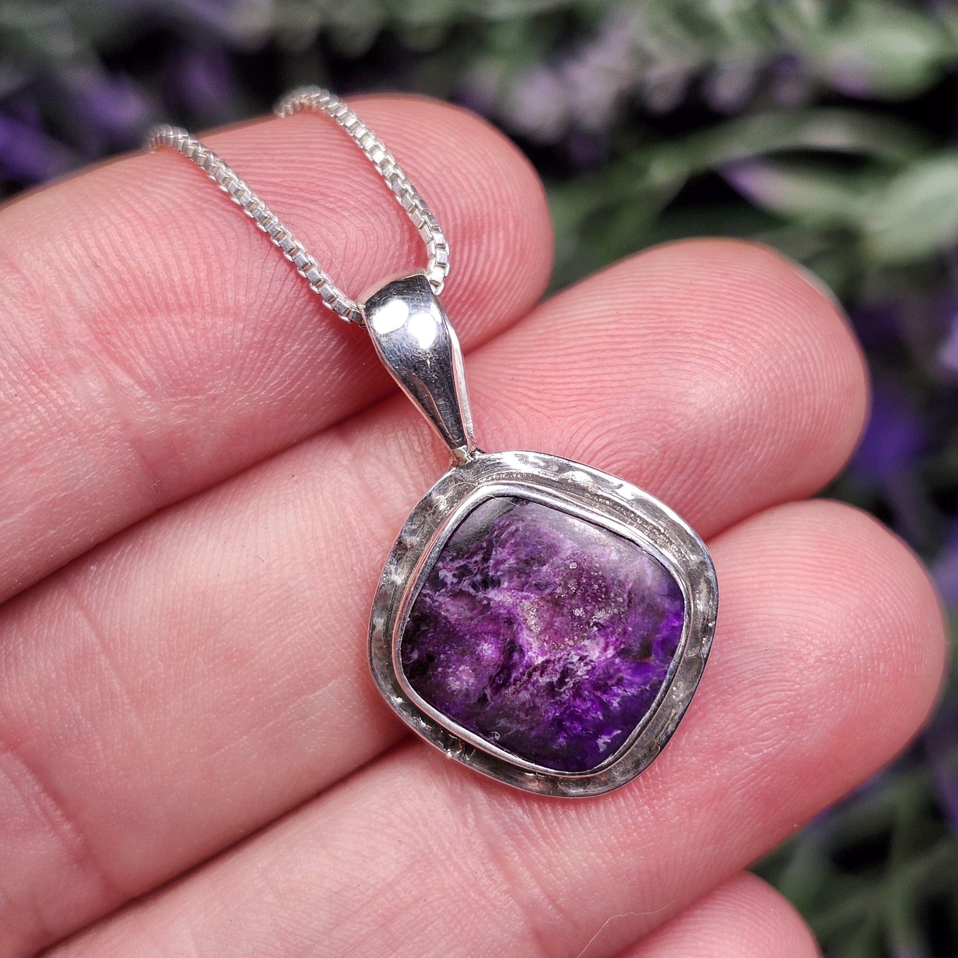 This Fibrous Sugilite stone has a smooth polish and exhibits saturated, bright purple coloring. This crystal has been custom created into a sturdy piece of jewelry using .925 Sterling Silver. This pendant measures approximately 24mm by 15mm. The silver chain used in the photos is to help envision how this pendant will look while adorned but is not included in the listing.