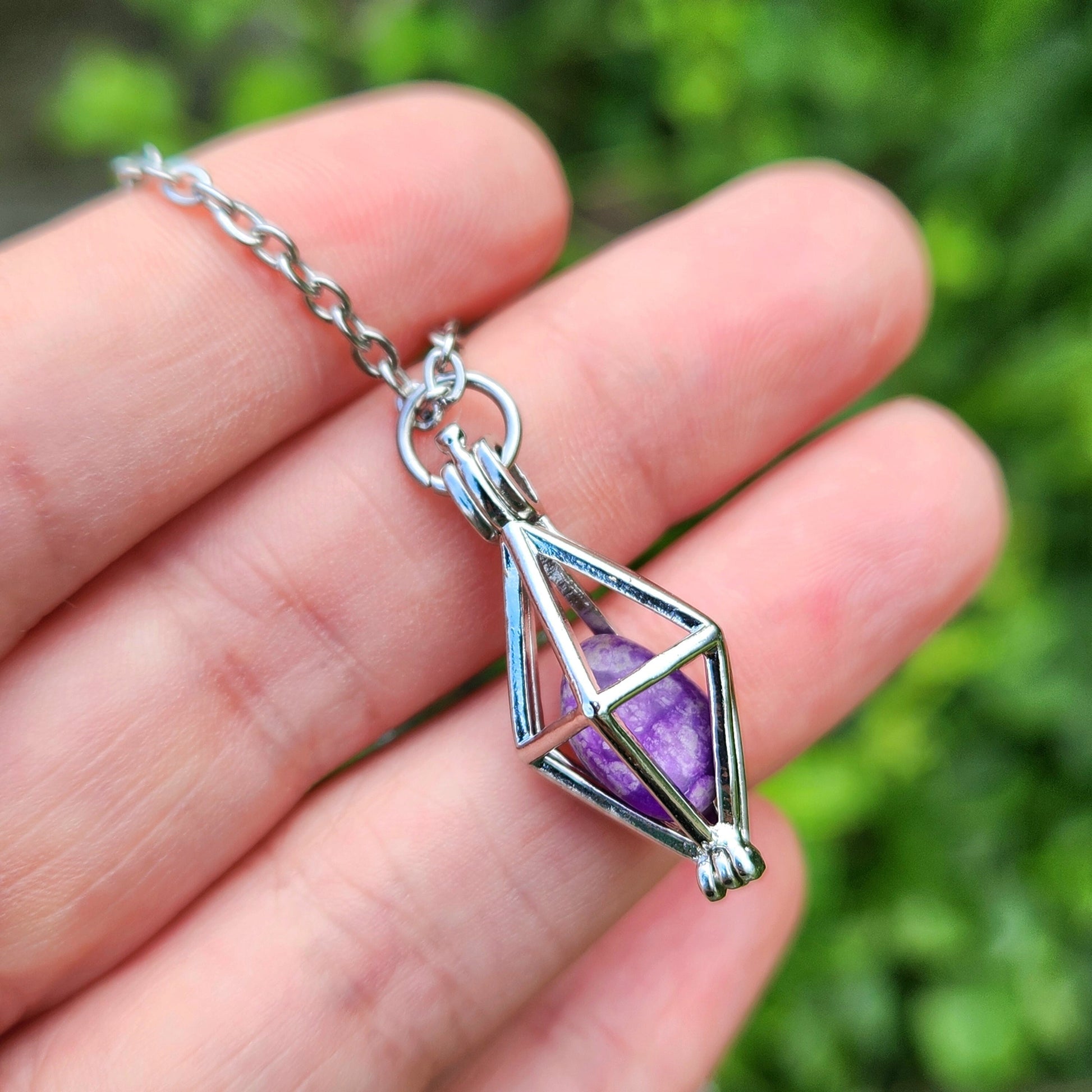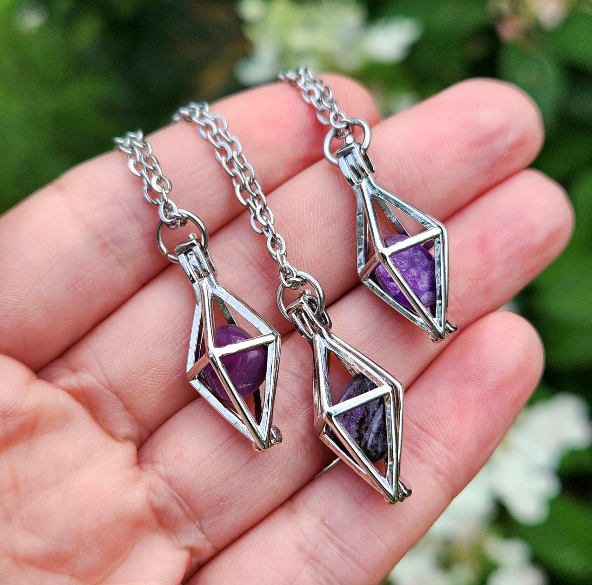 These Sugilite crystals have a smooth polish and exhibit a variety of shades of purple coloring. I will hand select one or multiple crystals and nestle them inside of a silver plated cage. Our plated cages are custom made for us and finished with a Rhodium like plating that extends the longevity of the piece. Like with any plated piece of jewelry, the finish on this piece can fade over time, and we recommend taking this pendant off for showering and sleeping. These pendants are securely closed and cannot be opened to have access to the stone inside. Each pendant measures approximately 30mm by 12mm. We offer an approximately 19 inch stainless steel chain that pairs perfectly with these pendants.